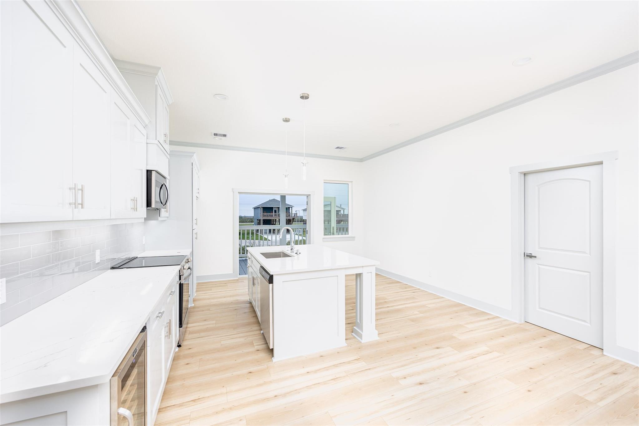 Walking distance from the beach, this elevated coastal home offers front and rear balconies and generous covered space beneath the house for parking and outdoor living. Inside, vinyl plank flooring runs throughout for easy maintenance. The kitchen features Corian countertops, 42-inch cabinets, stainless steel appliances, and a wine cooler with double doors opening to the rear balcony for effortless indoor-outdoor flow. Natural light fills the living areas, and high ceilings keep the space open and airy. The primary suite features an upgraded bath and walk-in closet, and all three full bathrooms are finished with quality touches, including a floor-to-ceiling tiled shower in the third bath. Comfortable, well-built, and a short walk to the sand.