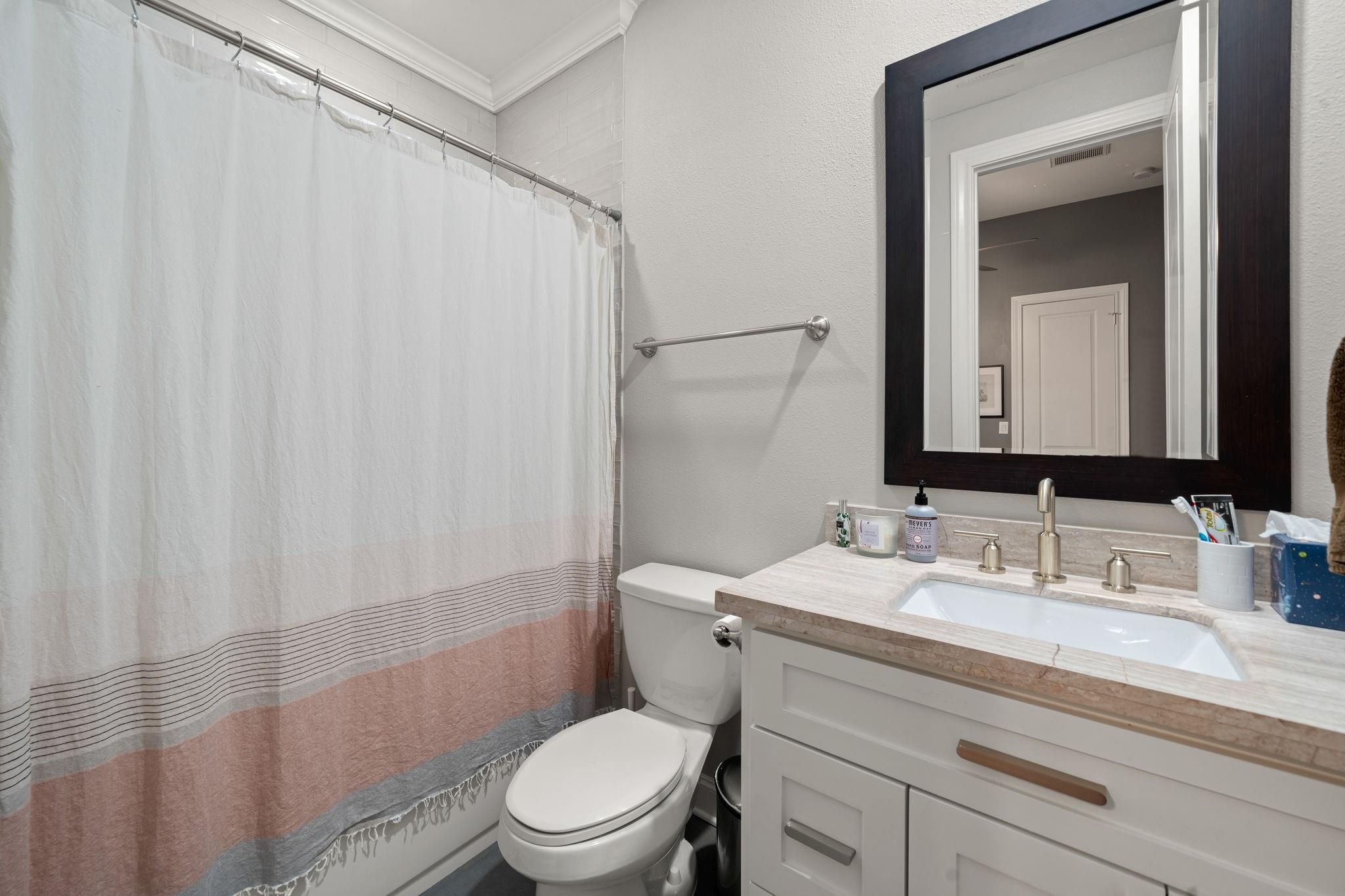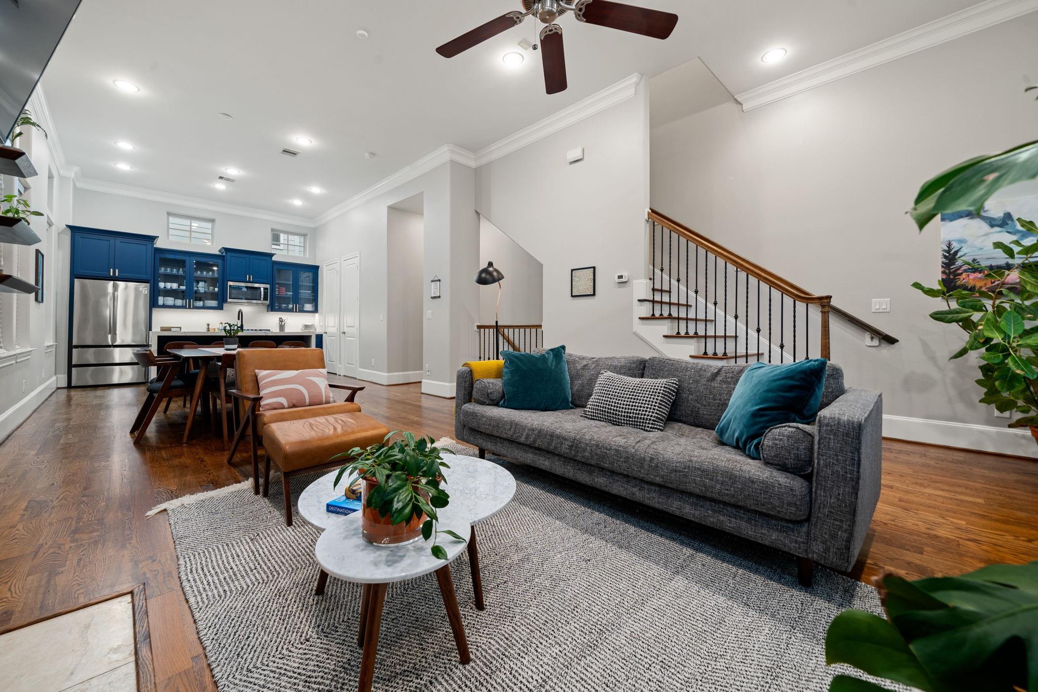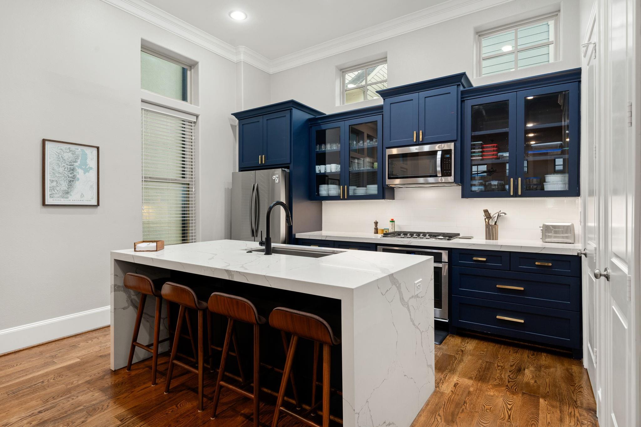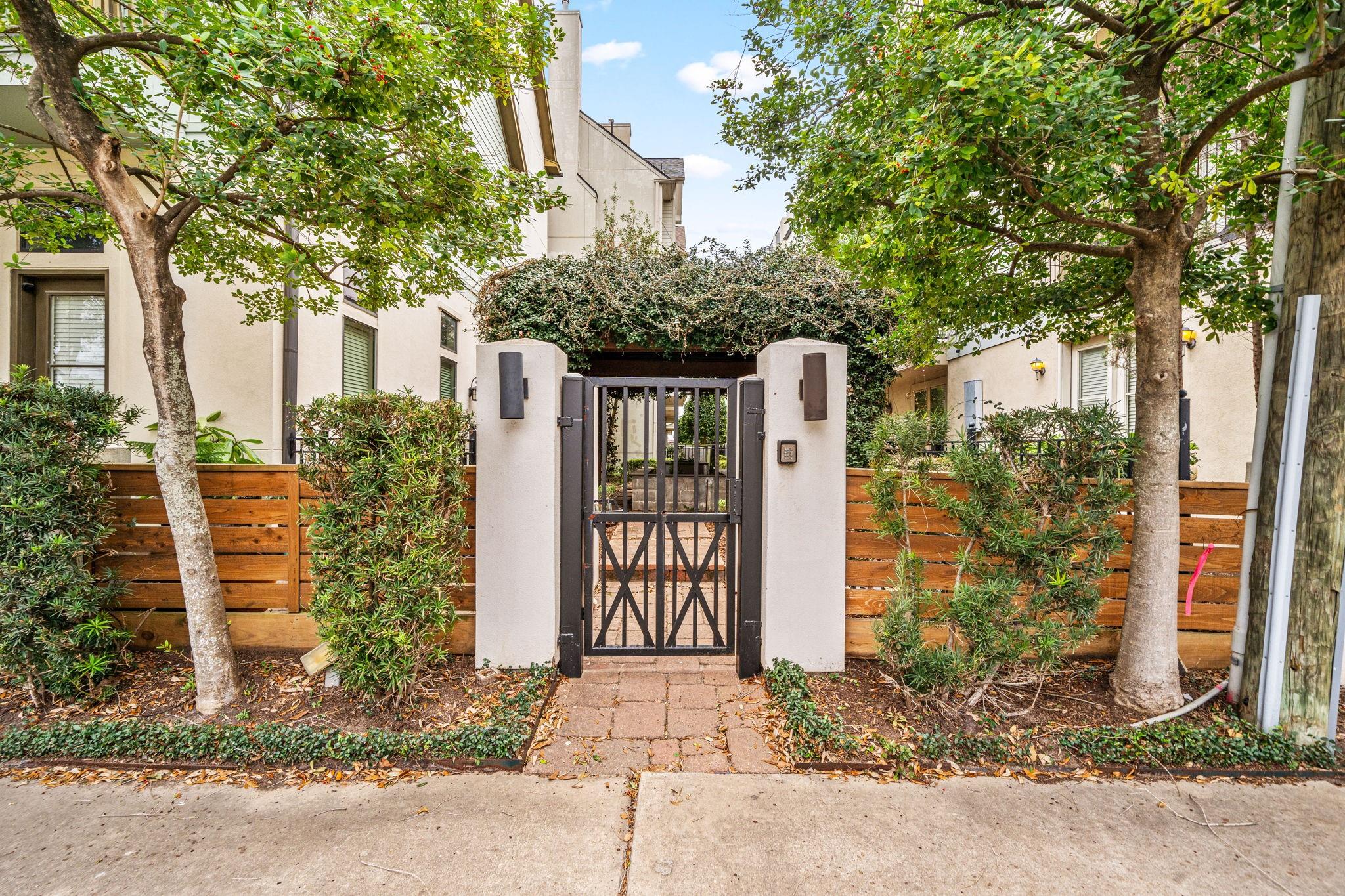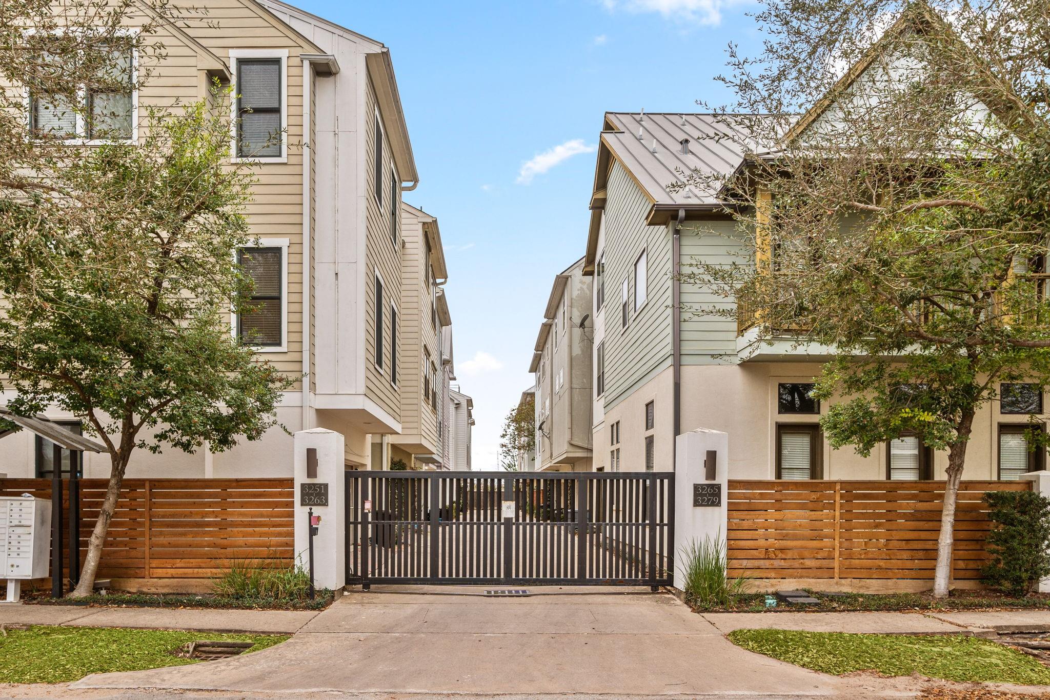 Experience refined inside-the-loop living in this gated patio home, just minutes from Downtown and The Heights. The three-story layout offers a versatile first-floor bedroom ideal for a home office, guest room, or flex space. The second level is designed for comfort and entertaining with soaring ceilings, a gas fireplace, and an open-concept flow connecting the living, dining, and renovated kitchen. Updated in 2021, the kitchen features quartz waterfall countertops, custom cabinetry, designer hardware, an updated cooktop & new refrigerator. The third floor hosts the primary & a secondary bedroom, both with ensuite baths. The primary retreat includes high ceilings, dual vanities, a separate soaking tub and shower, and ample closet space. Additional highlights include a new architectural-shingle roof (2025), abundant natural light, and no carpet—hardwood floors on the upper levels, engineered wood on the first floor, and tile in baths and entry—for a polished, low-maintenance lifesty