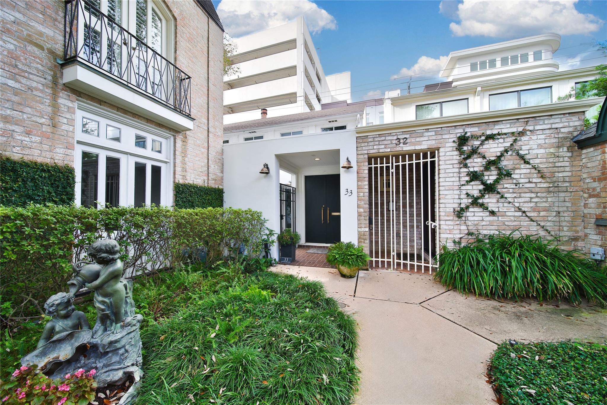 Stunning townhome nestled in the private, gated community of River Hollow, complete with 24-hour guard service. The spacious primary suite offers room for a cozy sitting area and overlooks a private courtyard. Enjoy a luxurious ensuite bath with dual vanities and two generous walk-in closets. The wet bar flows into the kitchen, featuring marble countertops, a gas cooktop, double ovens, wine fridge, and built-in refrigerator. The open-concept dining and grand living area with gas log fireplace and floor-to-ceiling bookshelves. This property features newly refinished flooring. This smart home is fully equipped with a complete AV system, including Control 4 automation, security cameras, motorized blinds, and four mounted TVs. Upstairs, a full bath with dual vanities connects a large second bedroom to a versatile bonus room—ideal as a game room, office, or third bedroom. All of this just minutes from world-class dining and shopping at The Galleria, Uptown Park, and River Oaks District.