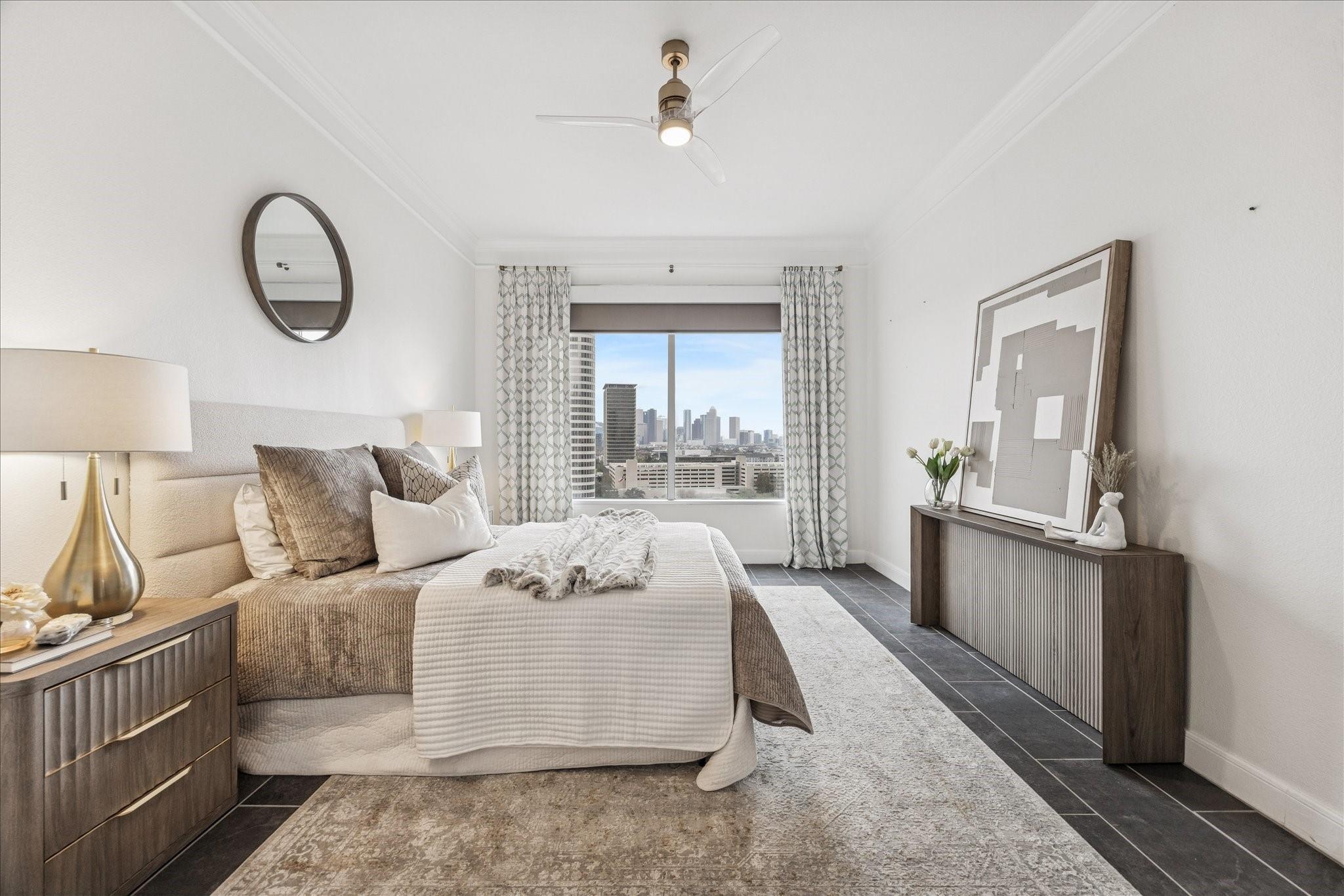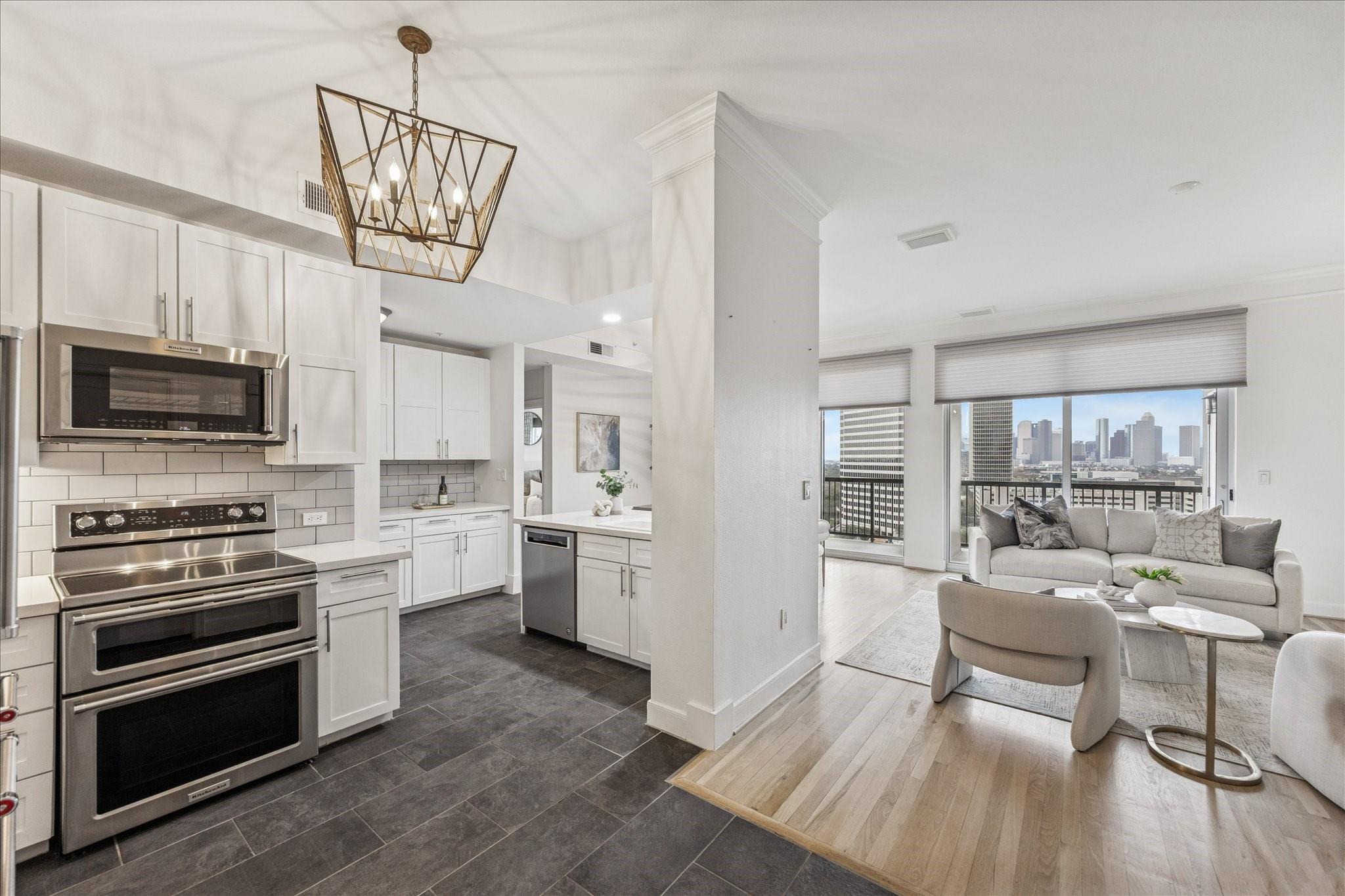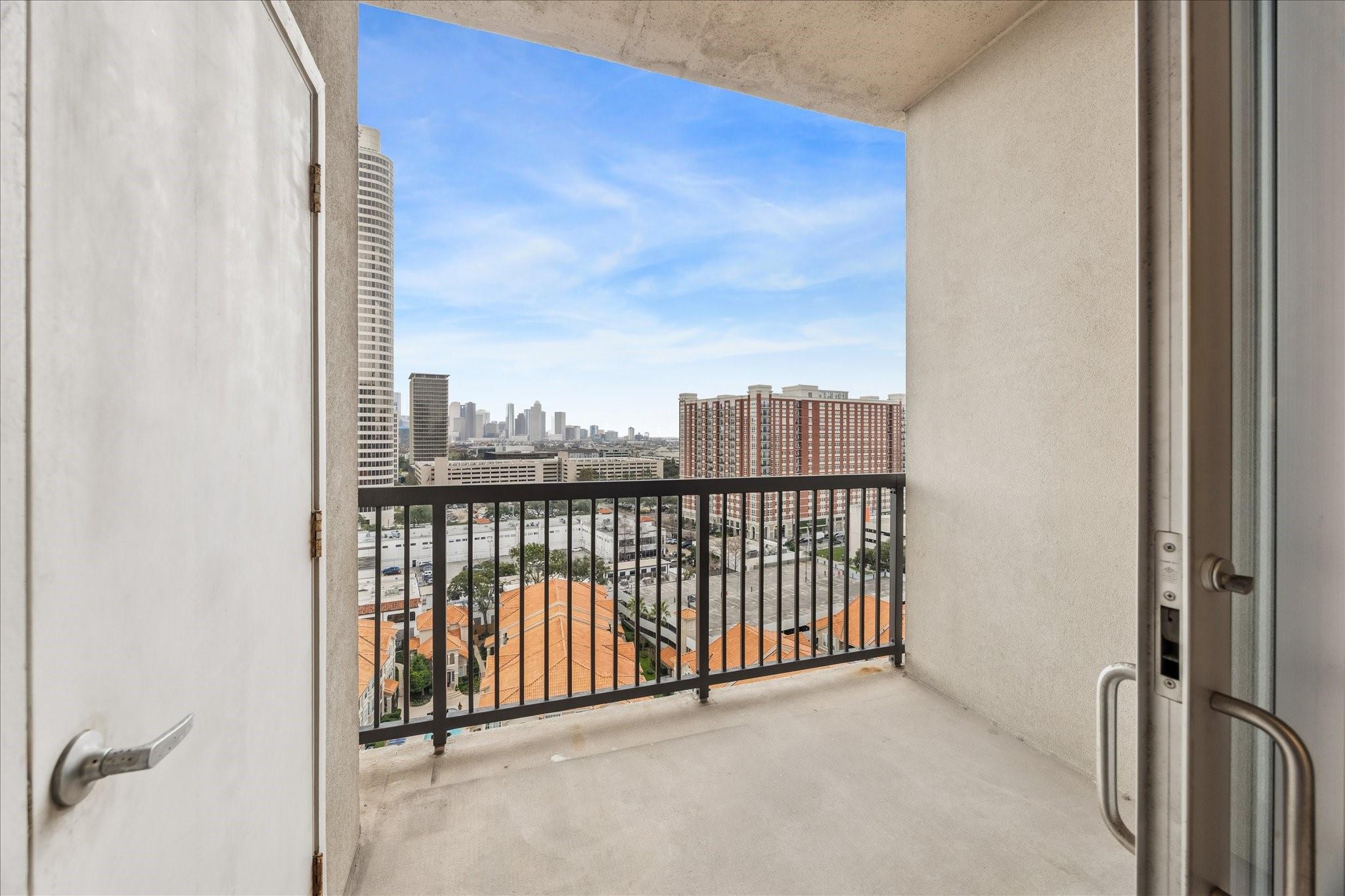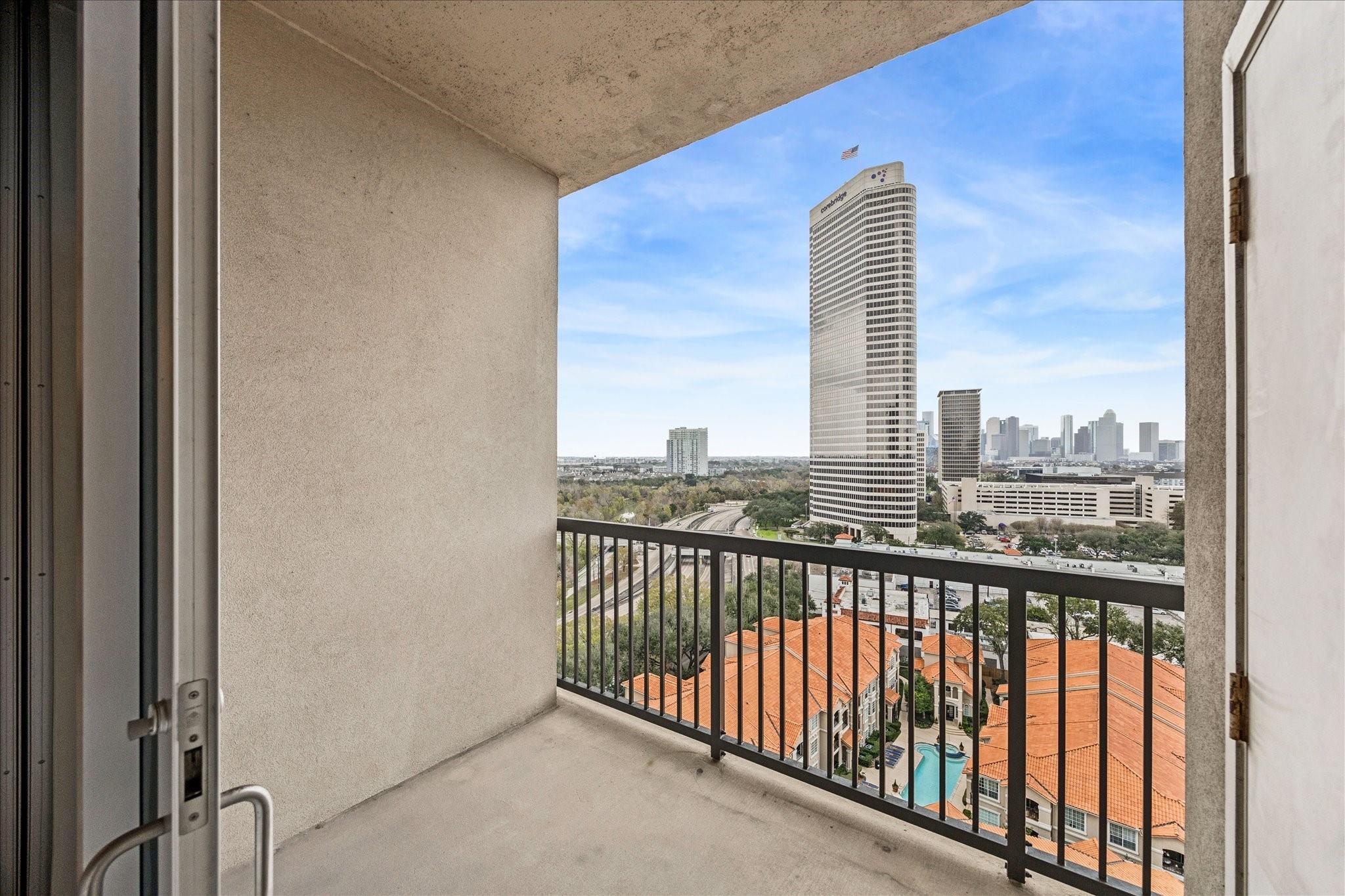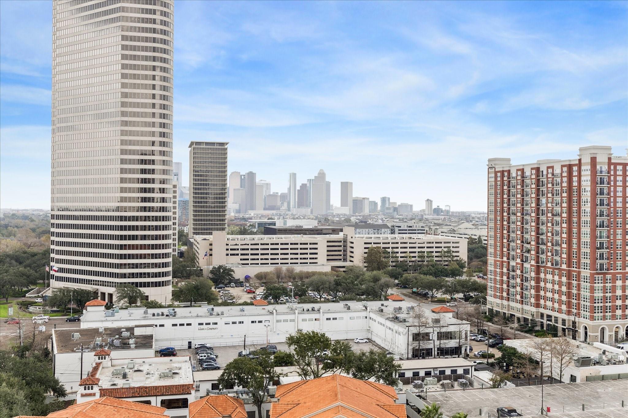 STUNNING downtown views! Rare, updated, large 1-bedroom + 1.5 bath condo with limited inventory in the building. Light and bright finishes, custom closet system, motorized shades, and premium KitchenAid appliances make this the perfect lock-and-leave lifestyle. One reserved parking space included. Residents enjoy 24-hour concierge, valet, a state-of-the-art fitness center, pool and spa, coffee bar, ballroom with catering kitchen, conference rooms, business center, guest suites, theater, dog park, and beautifully designed common spaces. Ideally located near Houston’s premier shopping and dining. Walk to Buffalo Bayou Park, Whole Foods, Memorial Park & much more!