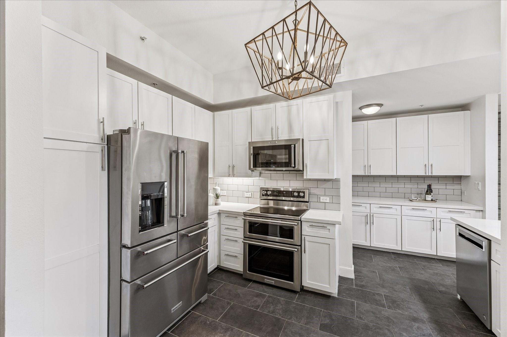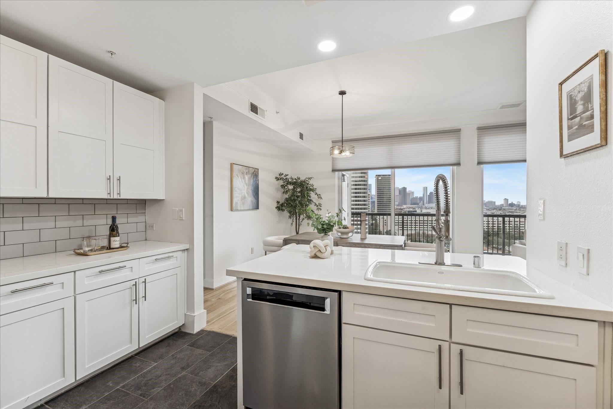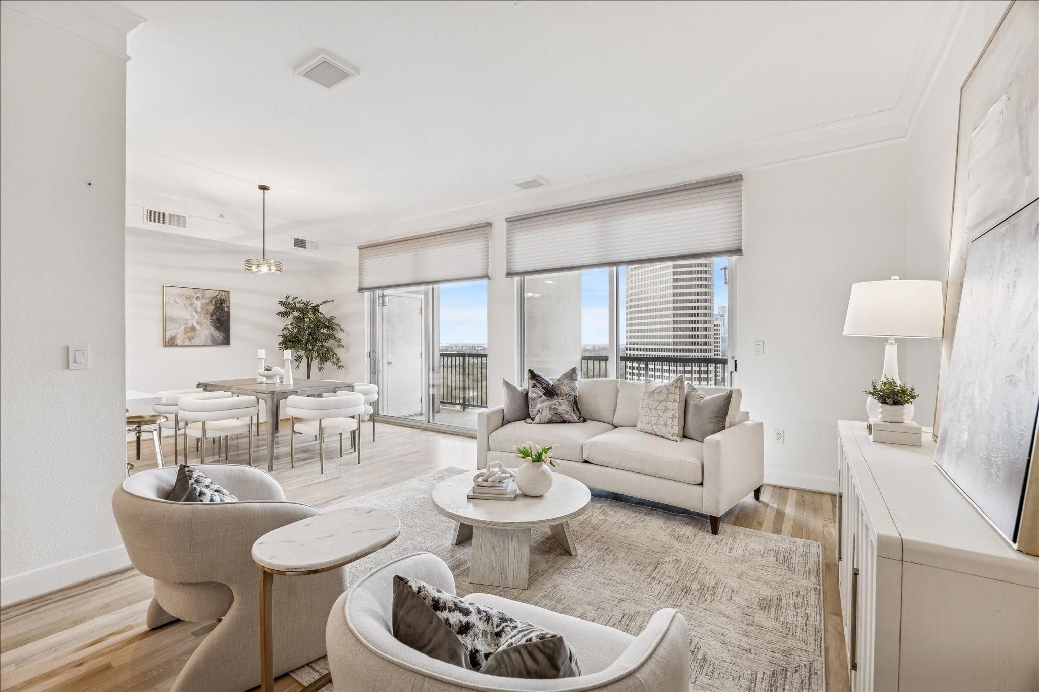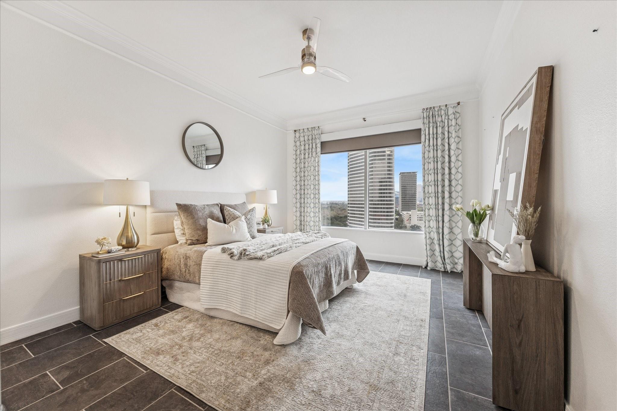 STUNNING downtown views! Rare, updated, large 1-bedroom + 1.5 bath condo with limited inventory in the building. Light and bright finishes, custom closet system, motorized shades, and premium KitchenAid appliances make this the perfect lock-and-leave lifestyle. One reserved parking space included. Residents enjoy 24-hour concierge, valet, a state-of-the-art fitness center, pool and spa, coffee bar, ballroom with catering kitchen, conference rooms, business center, guest suites, theater, dog park, and beautifully designed common spaces. Ideally located near Houston’s premier shopping and dining. Walk to Buffalo Bayou Park, Whole Foods, Memorial Park & much more!