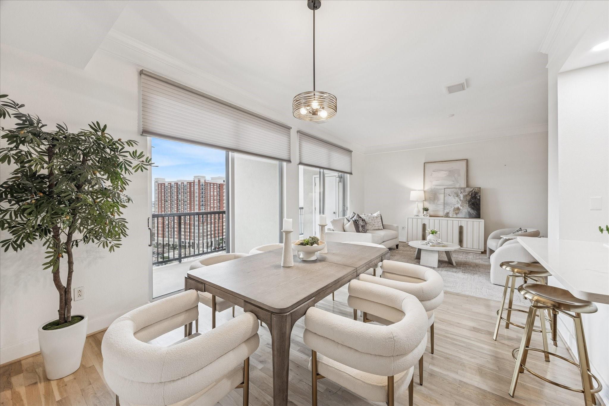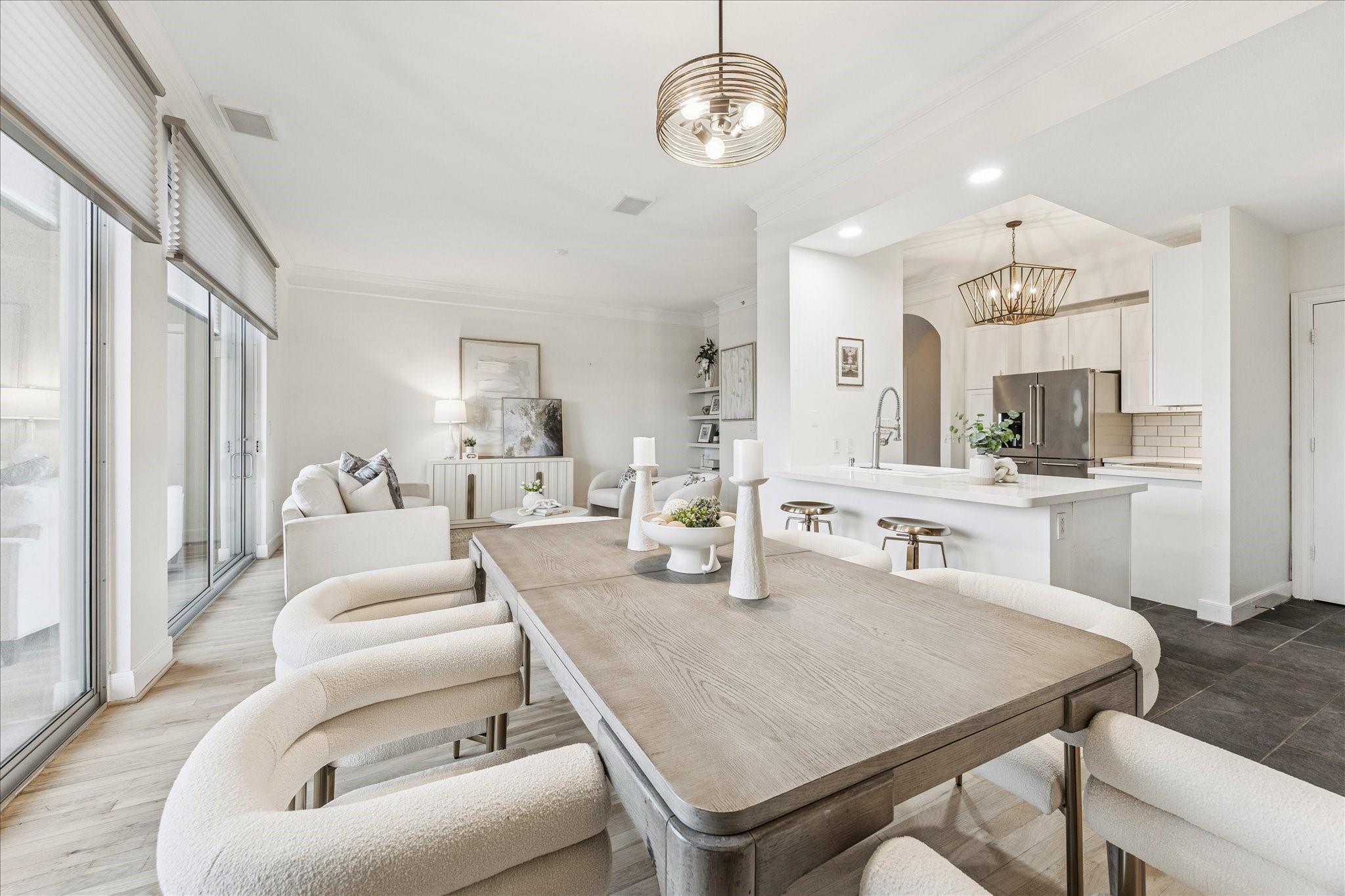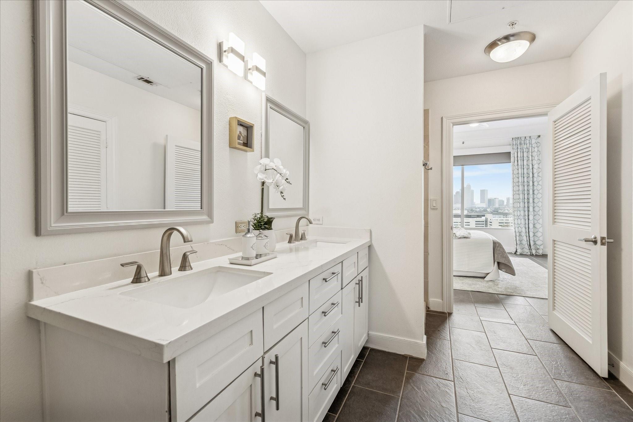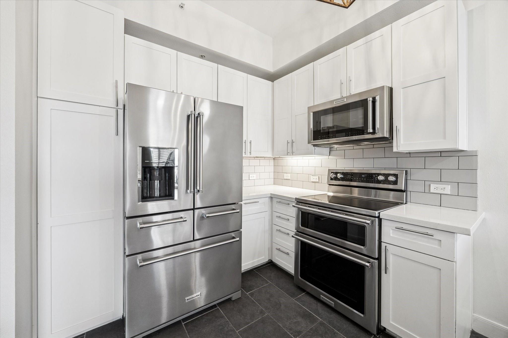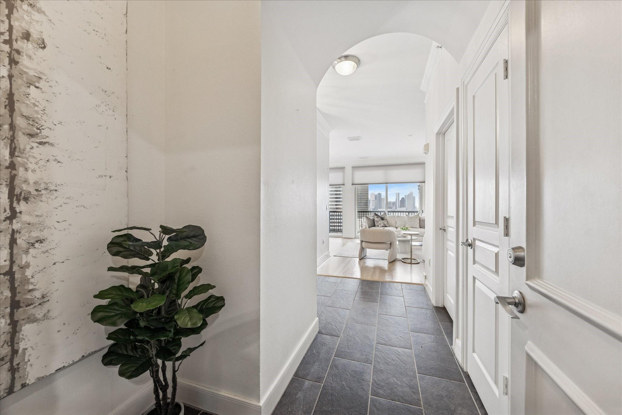 STUNNING downtown views! Rare, updated, large 1-bedroom + 1.5 bath condo with limited inventory in the building. Light and bright finishes, custom closet system, motorized shades, and premium KitchenAid appliances make this the perfect lock-and-leave lifestyle. One reserved parking space included. Residents enjoy 24-hour concierge, valet, a state-of-the-art fitness center, pool and spa, coffee bar, ballroom with catering kitchen, conference rooms, business center, guest suites, theater, dog park, and beautifully designed common spaces. Ideally located near Houston’s premier shopping and dining. Walk to Buffalo Bayou Park, Whole Foods, Memorial Park & much more!