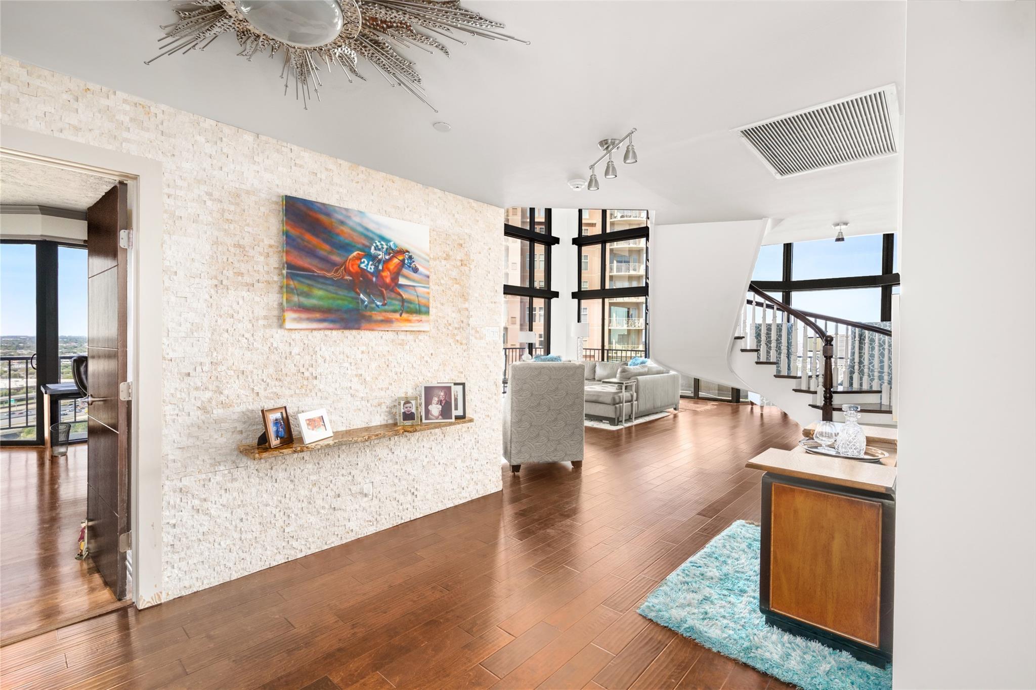 Enjoy elevated high-rise living in this impressive two-story penthouse located on the 24th and 25th floors of The Bristol. Floor-to-ceiling windows and generous wraparound balconies—accessible from every room—provide stunning sunset views and sparkling city skyline vistas. The main level features a spacious living and entertaining area, formal dining room, and a classic Pullman-style kitchen with breakfast area. A secondary bedroom on the first floor, currently used as a media room and office, offers flexible living options. A striking spiral staircase leads to the expansive primary suite with custom built-in storage, a spa-inspired bath with steam sauna, a walk-in closet, and private balcony access. This quiet, full-service building offers exceptional amenities including 24-hour concierge, valet service, fitness center, resident lounge, heated pool, dog park, and rooftop tennis and pickleball courts. Four assigned parking spaces and storage room included.