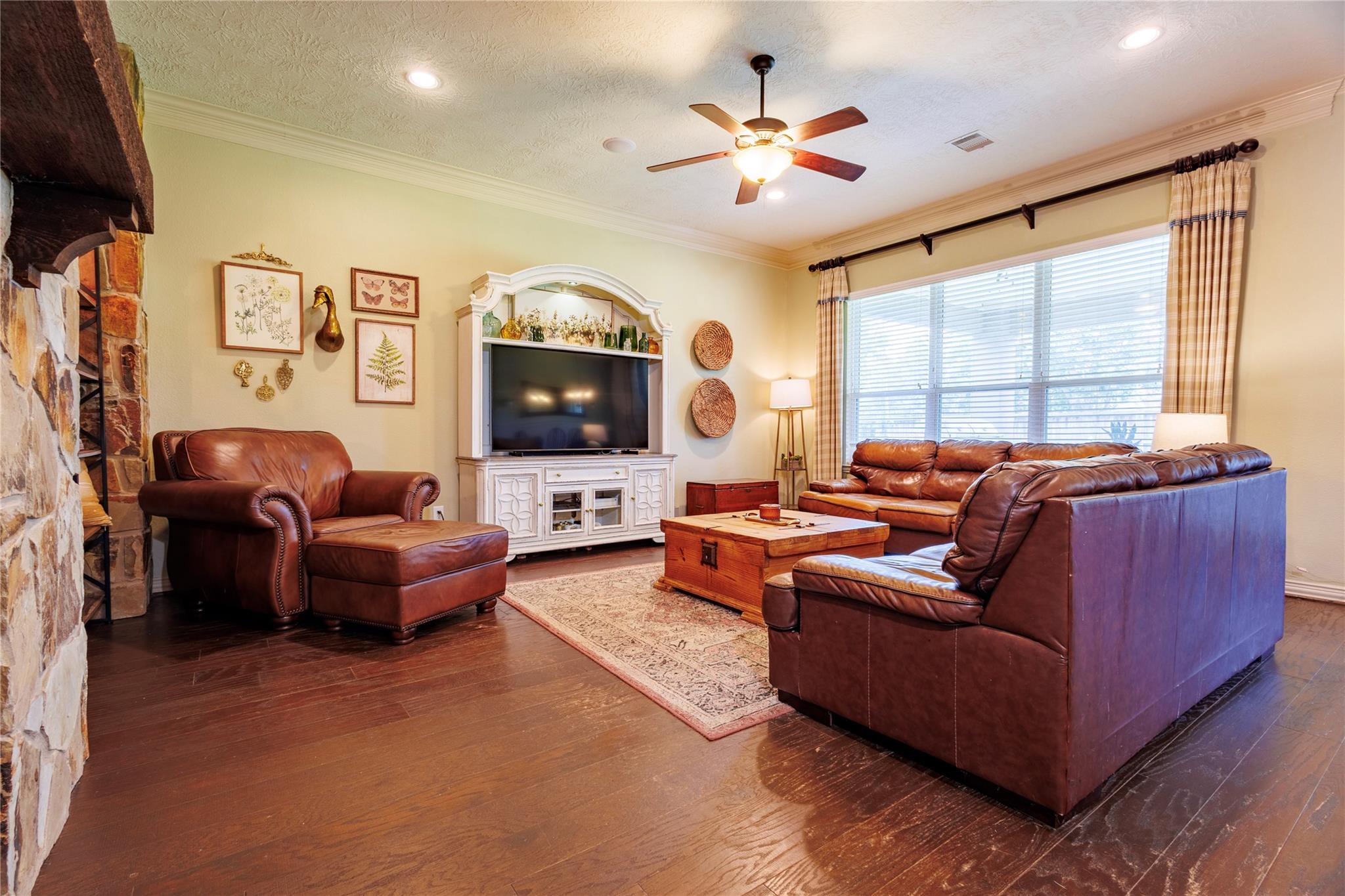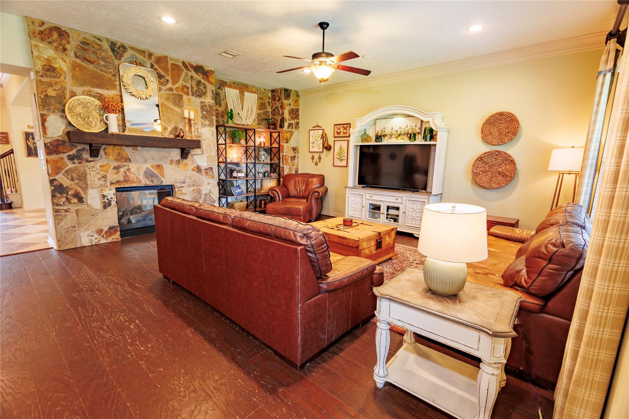 InteriorFireplace:2/Gaslog FireplaceFloors:Carpet,Tile,Travertine,WoodCountertop:GRANITEBathroom Description:Half Bath,Primary Bath: Double Sinks,Primary Bath: Jetted TubBedroom Desc:2 Bedrooms Down,Primary Bed - 1st Floor,Walk-In ClosetKitchen Desc:Breakfast Bar,Island w/o Cooktop,Kitchen open to Family Room,Pantry,Reverse Osmosis,Walk-in PantryRoom Description:1 Living Area,Breakfast Room,Den,Formal Dining,Gameroom Up,Home Office/Study,Living Area - 1st Floor,Utility Room in HouseHeating:Central Gas,ZonedCooling:Central Electric,ZonedConnections:Electric Dryer Connections,Gas Dryer Connections,Washer ConnectionsDishwasher:YesDisposal:YesMicrowave:YesRange:Gas RangeOven:Double Oven,Electric OvenEnergy Feature:Attic Vents,Ceiling Fans,Digital Program Thermostat,High-Efficiency HVAC,Insulated/Low-E windows,Radiant Attic Barrier,Solar Panel - Leased,Tankless/On-Demand H2O HeaterInterior:Alarm System - Owned,Crown Molding,Dryer Included,Fire/Smoke Alarm,Refrigerator Included,Washer Included,Water Softener - Owned,Window Coverings