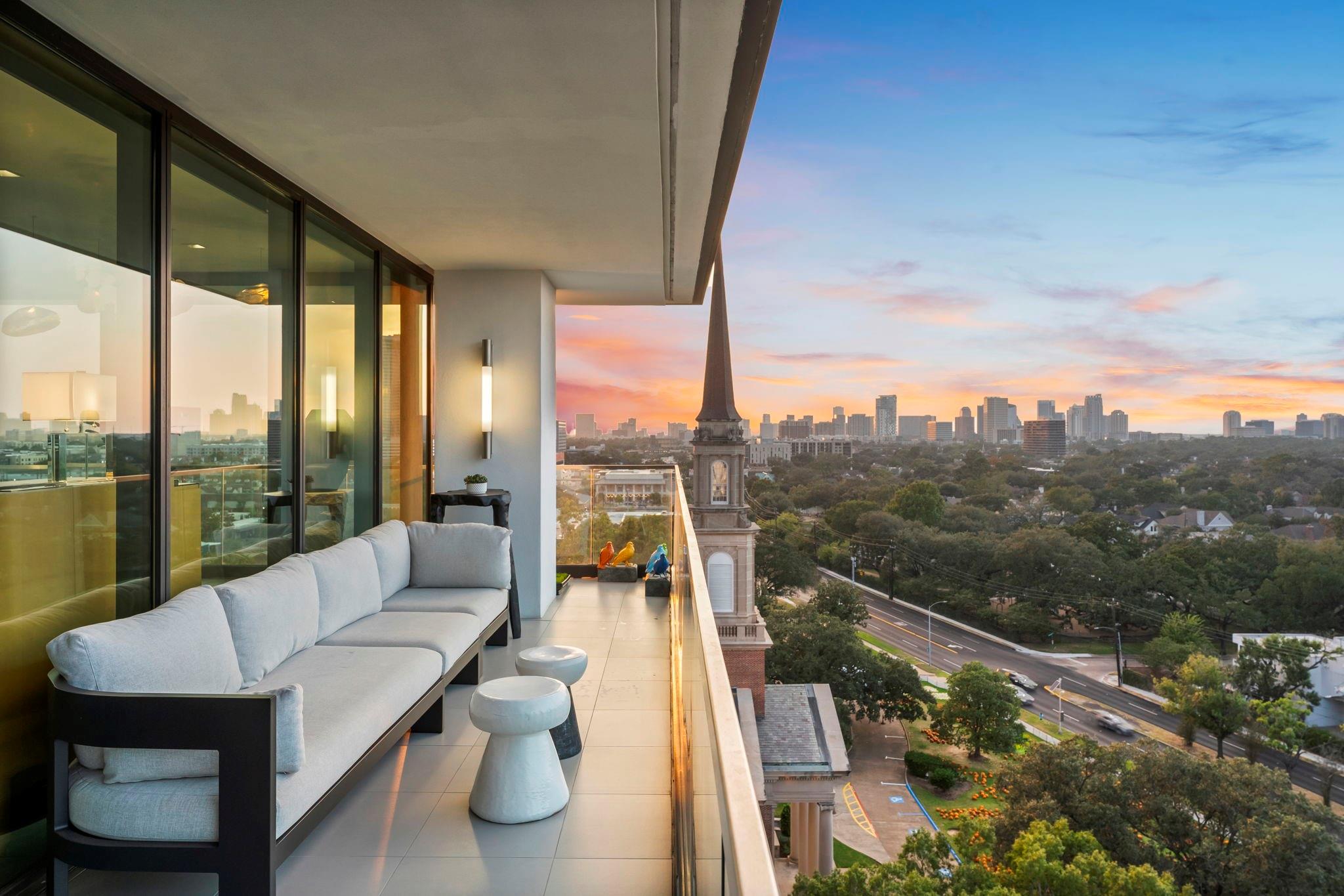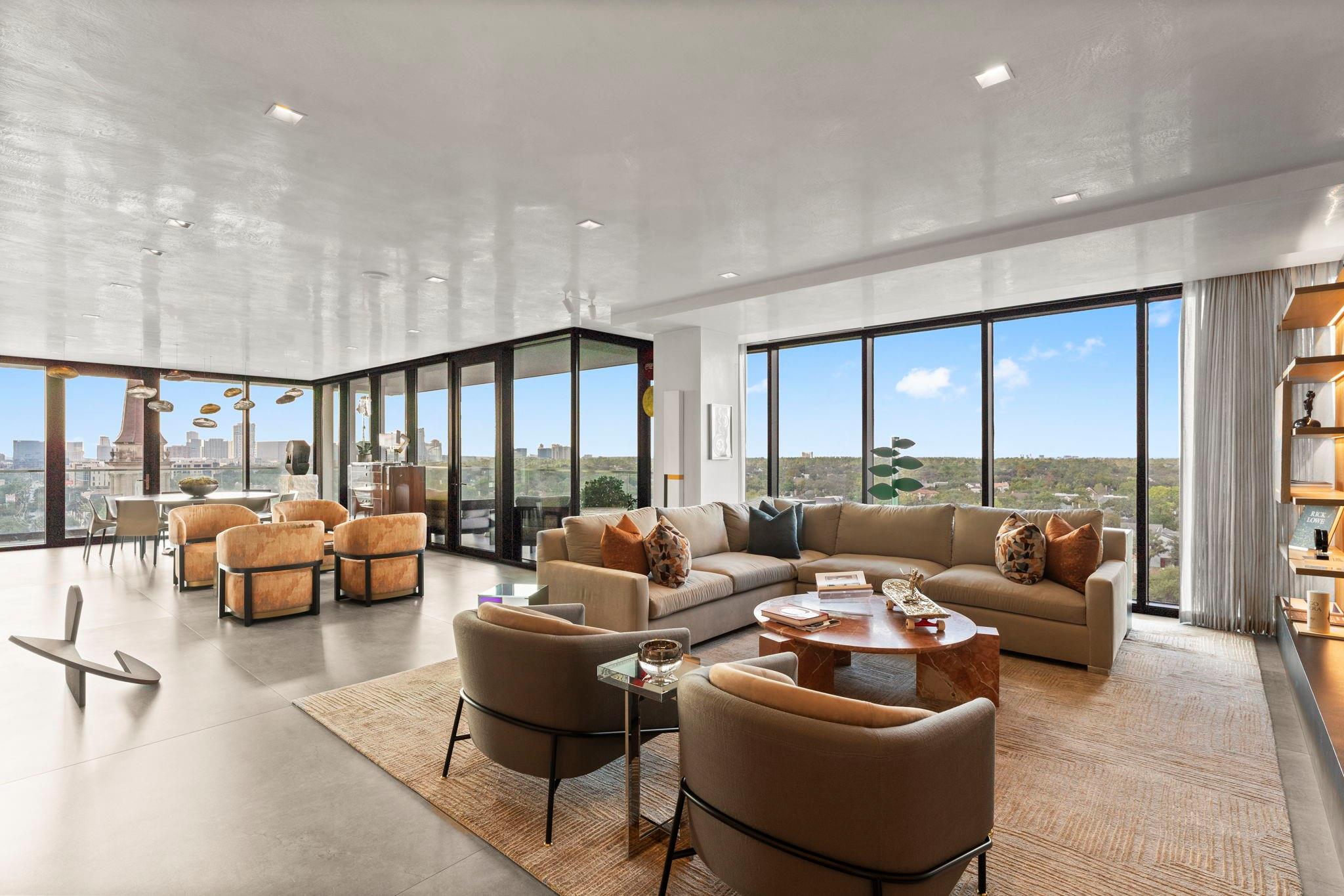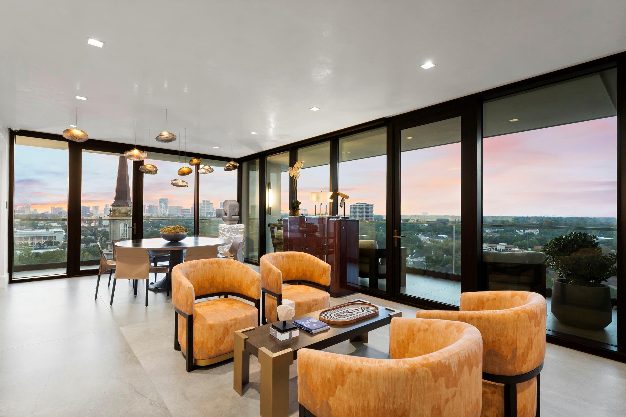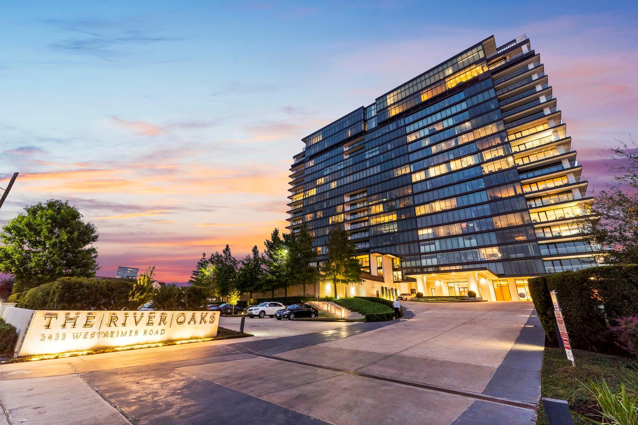 Experience unparalleled luxury in this extensively renovated residence at The River Oaks. Coveted NW corner offers sweeping views over River Oaks treetops, Galleria & Downtown, with soft indirect north light, sunset skies, and a 303sf balcony that seamlessly extends your living space. Inside: Segreto plaster, fumed white-oak millwork, brass inlay, Dekton floors/counters, Poggenpohl cabinetry, Gaggenau appliances, Galley workstation, quartzite bar with wine cooler. Lutron HomeWorks, Palladiom keypads/shades, art lighting, designer hardware. Primary suite with sitting area, boutique closets, spa bath. Full-service building includes valet, concierge, pool, gym, outdoor kitchens, yoga/Pilates, pet spa, dog park. Dedicated guest suites on site allow you to comfortably host family or visitors whenever needed.