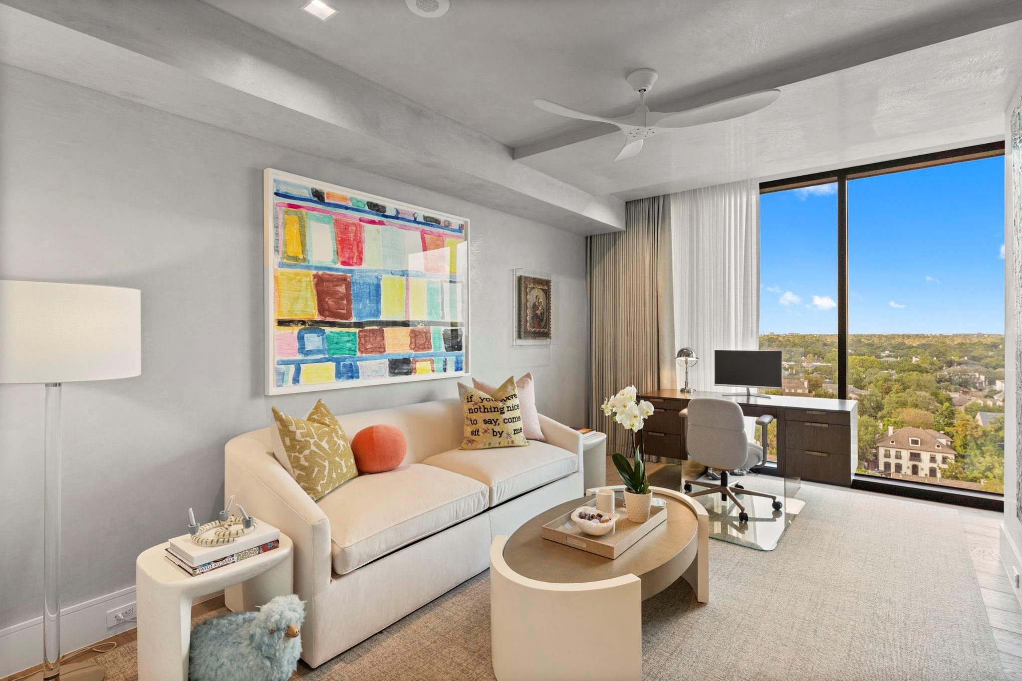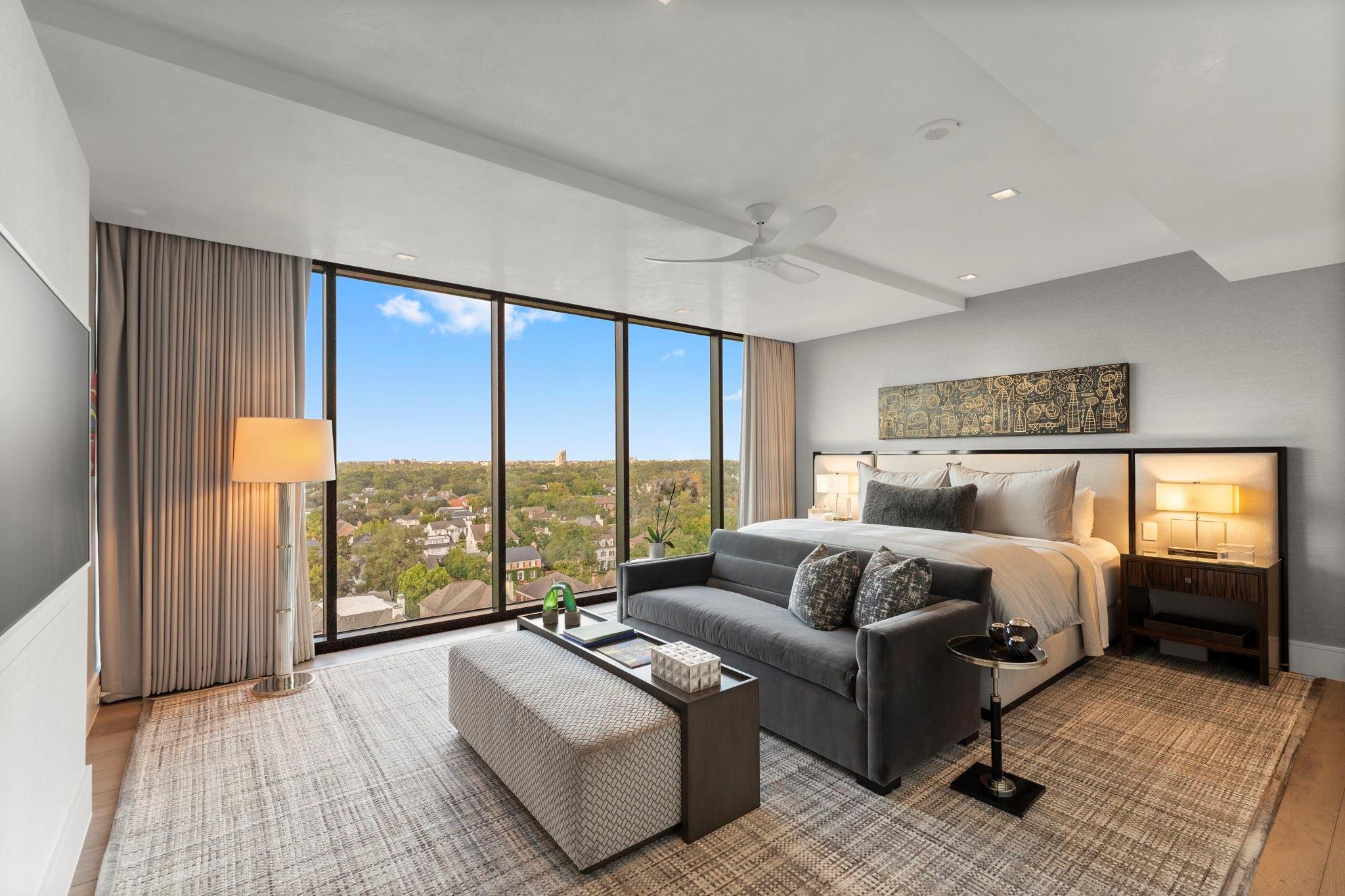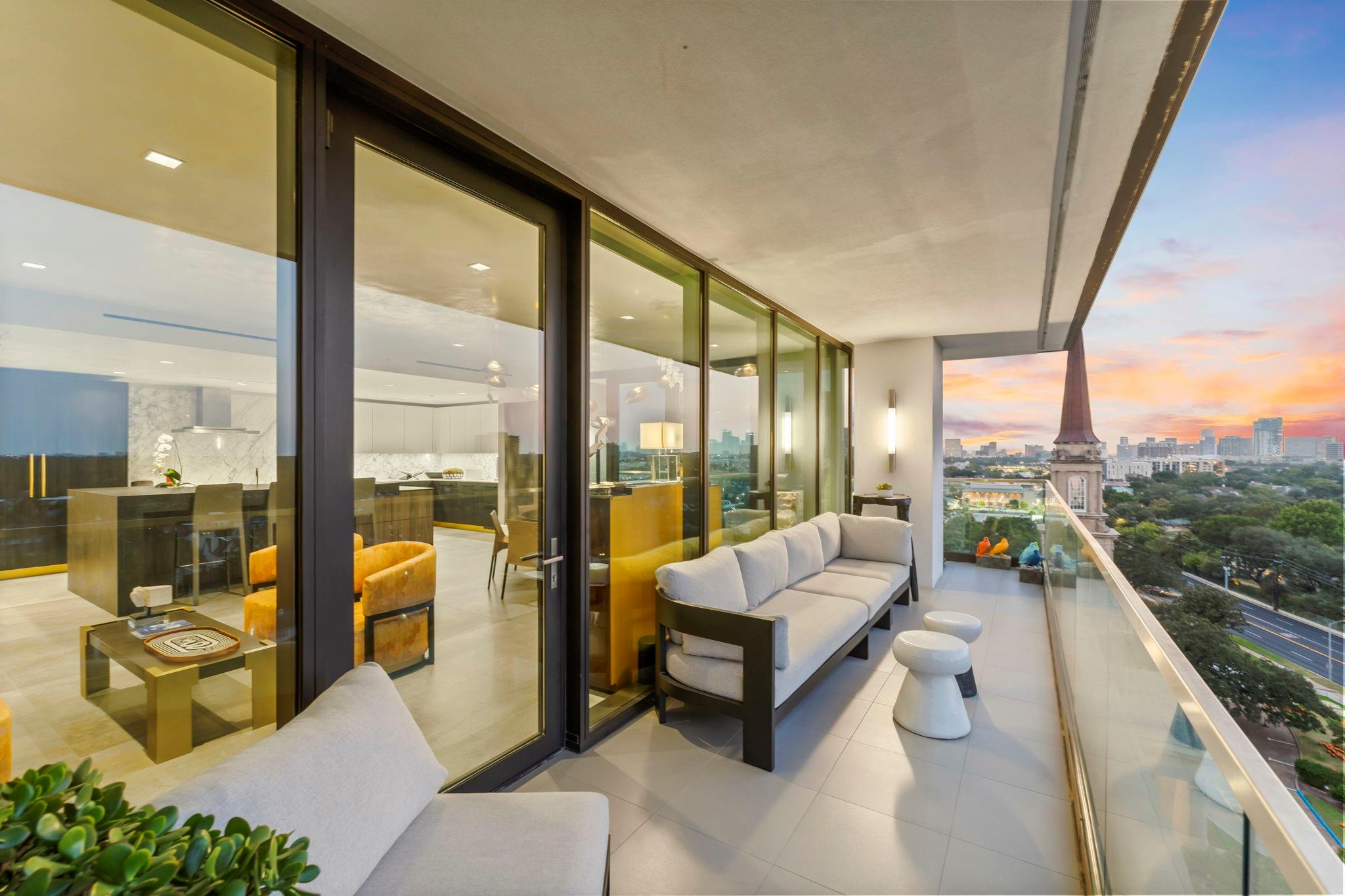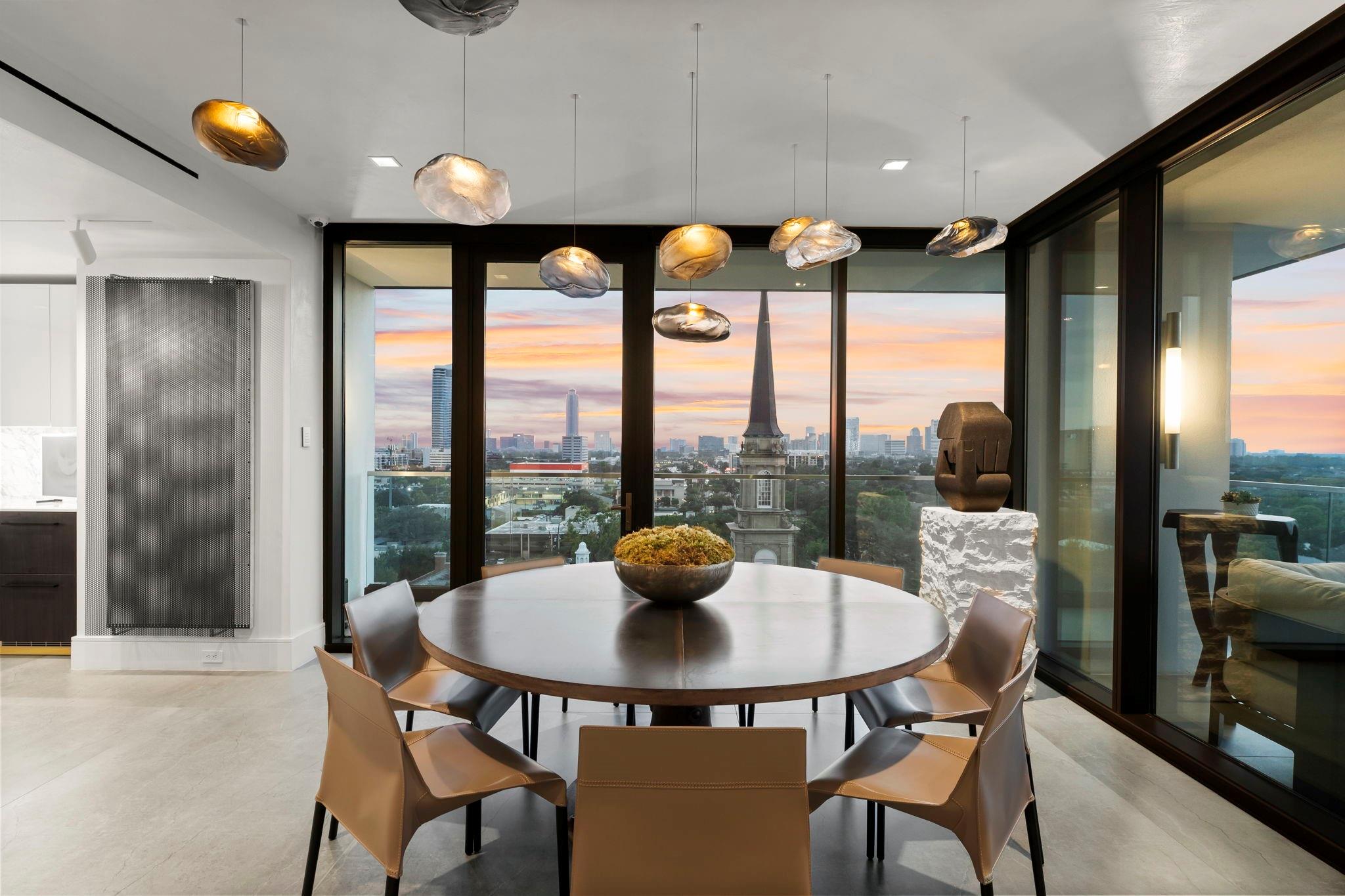 Experience unparalleled luxury in this extensively renovated residence at The River Oaks. Coveted NW corner offers sweeping views over River Oaks treetops, Galleria & Downtown, with soft indirect north light, sunset skies, and a 303sf balcony that seamlessly extends your living space. Inside: Segreto plaster, fumed white-oak millwork, brass inlay, Dekton floors/counters, Poggenpohl cabinetry, Gaggenau appliances, Galley workstation, quartzite bar with wine cooler. Lutron HomeWorks, Palladiom keypads/shades, art lighting, designer hardware. Primary suite with sitting area, boutique closets, spa bath. Full-service building includes valet, concierge, pool, gym, outdoor kitchens, yoga/Pilates, pet spa, dog park. Dedicated guest suites on site allow you to comfortably host family or visitors whenever needed.