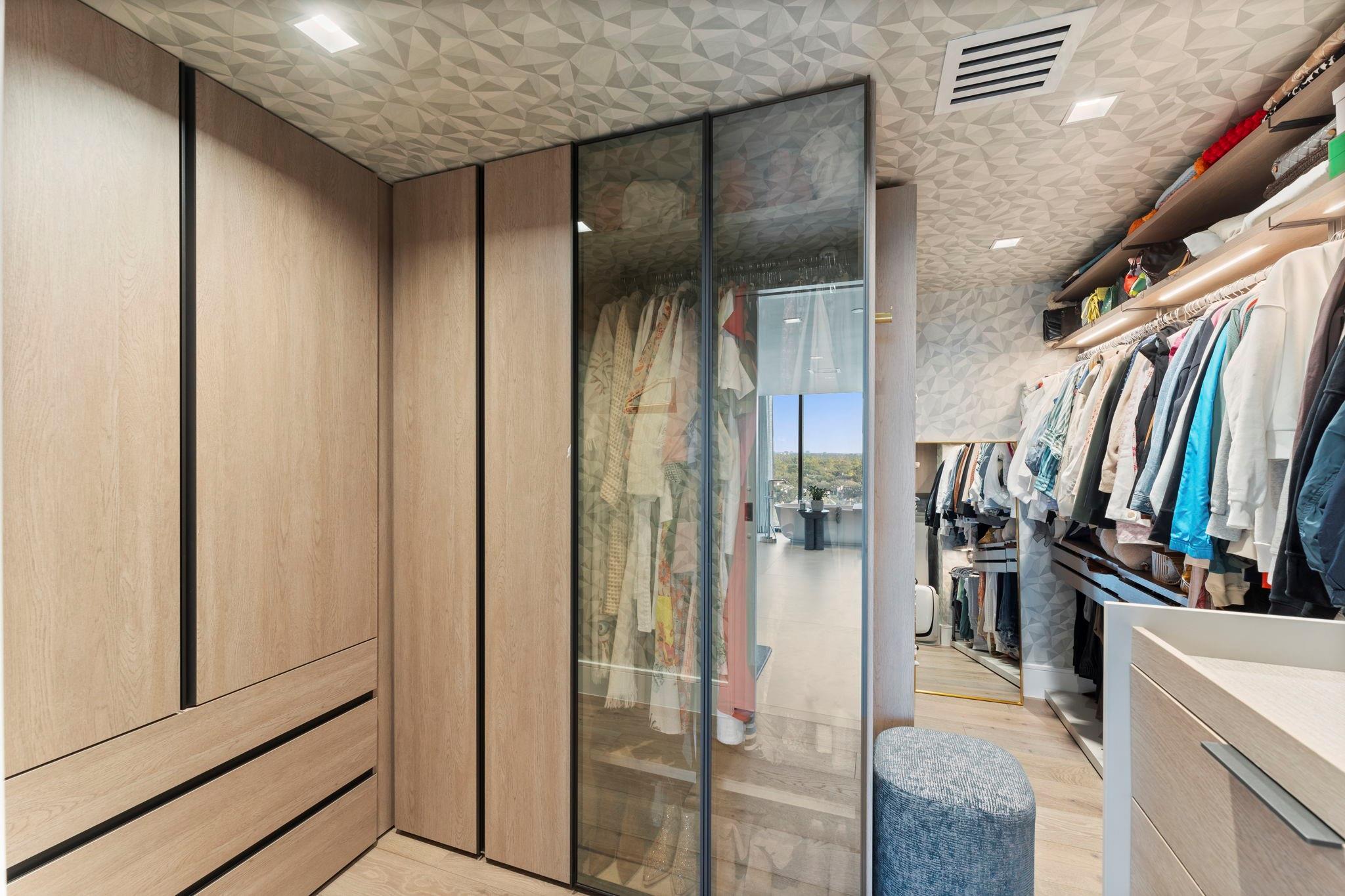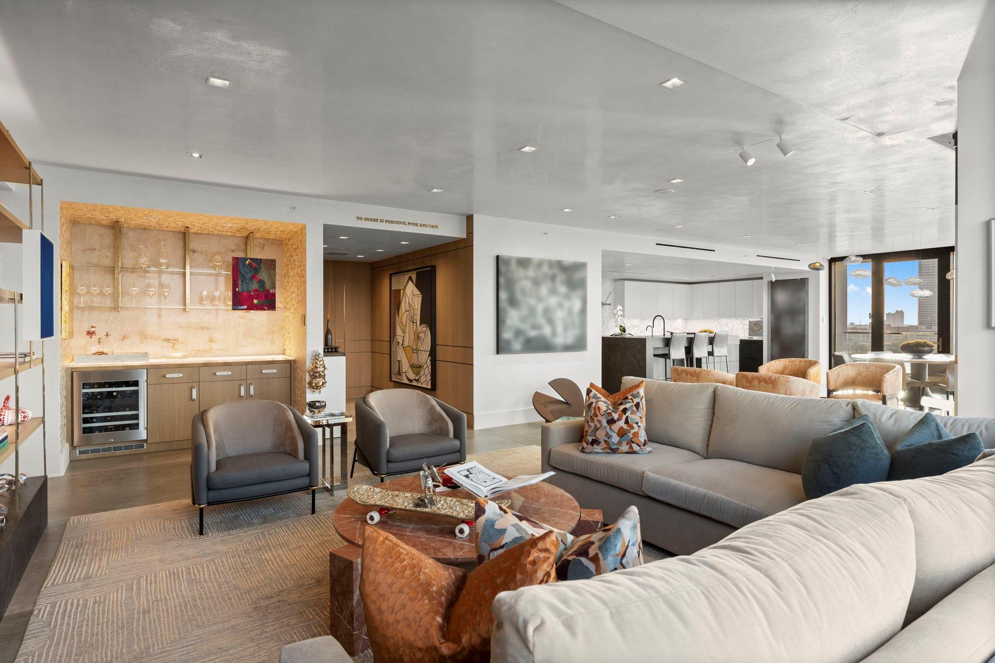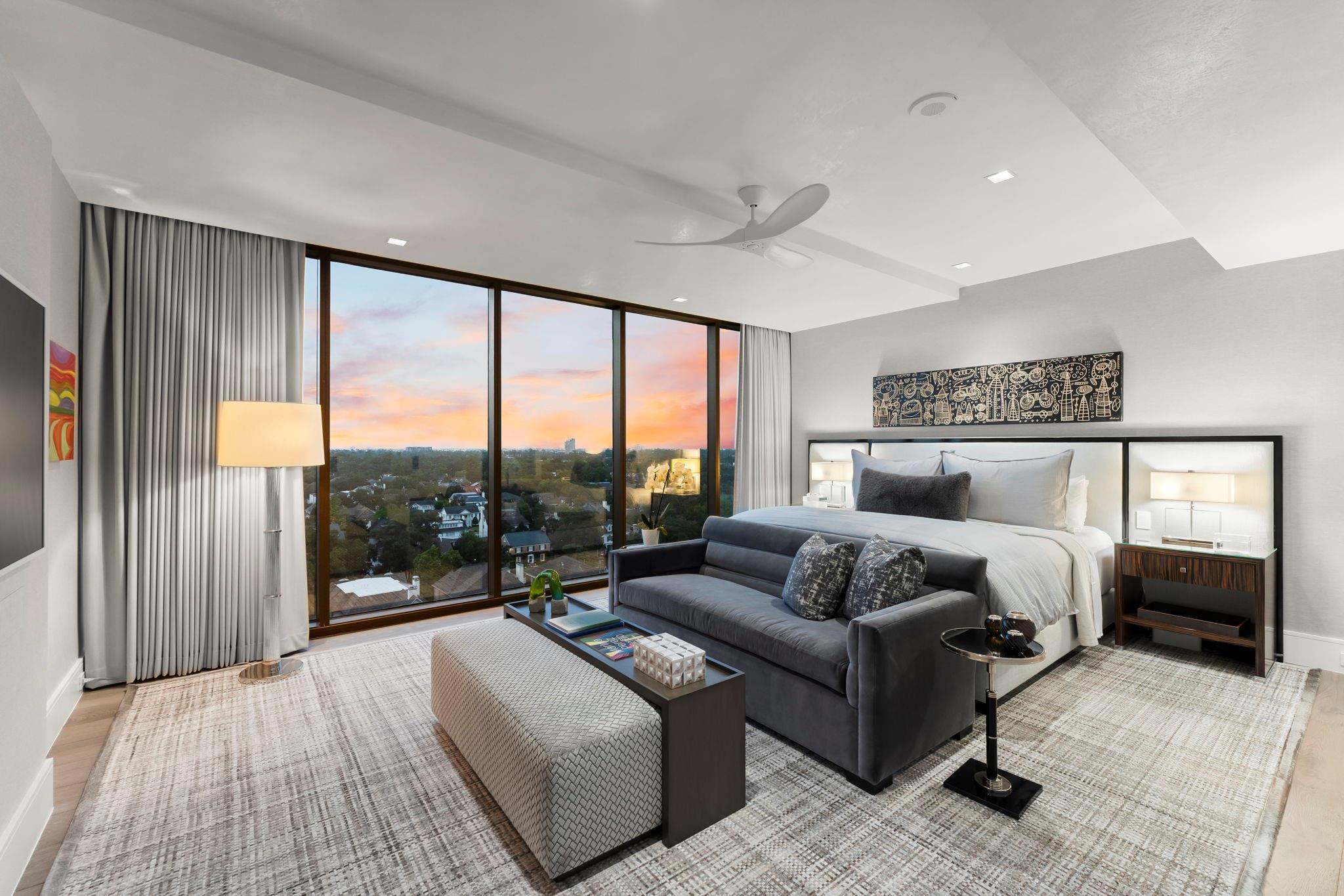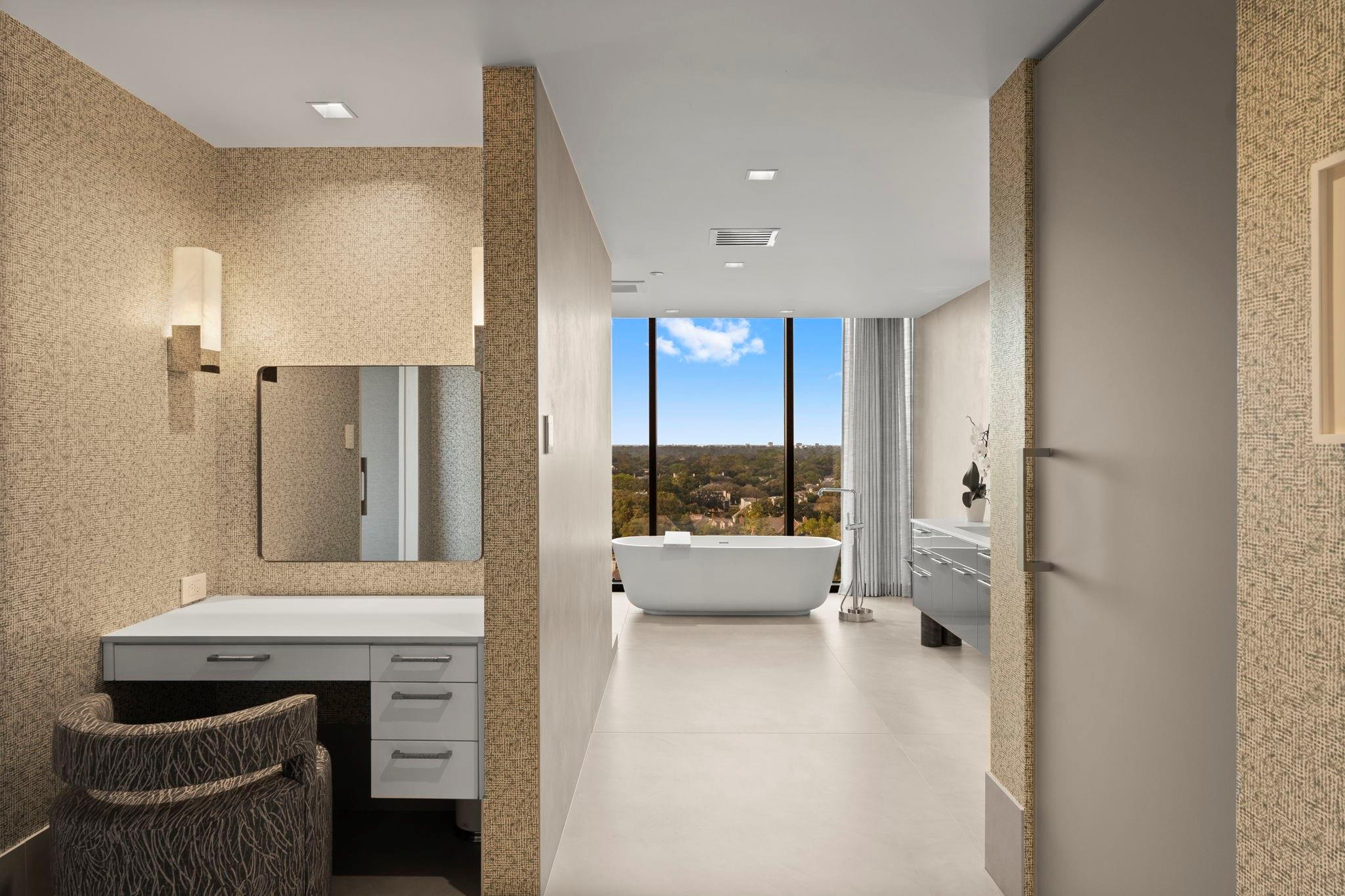 Experience unparalleled luxury in this extensively renovated residence at The River Oaks. Coveted NW corner offers sweeping views over River Oaks treetops, Galleria & Downtown, with soft indirect north light, sunset skies, and a 303sf balcony that seamlessly extends your living space. Inside: Segreto plaster, fumed white-oak millwork, brass inlay, Dekton floors/counters, Poggenpohl cabinetry, Gaggenau appliances, Galley workstation, quartzite bar with wine cooler. Lutron HomeWorks, Palladiom keypads/shades, art lighting, designer hardware. Primary suite with sitting area, boutique closets, spa bath. Full-service building includes valet, concierge, pool, gym, outdoor kitchens, yoga/Pilates, pet spa, dog park. Dedicated guest suites on site allow you to comfortably host family or visitors whenever needed.