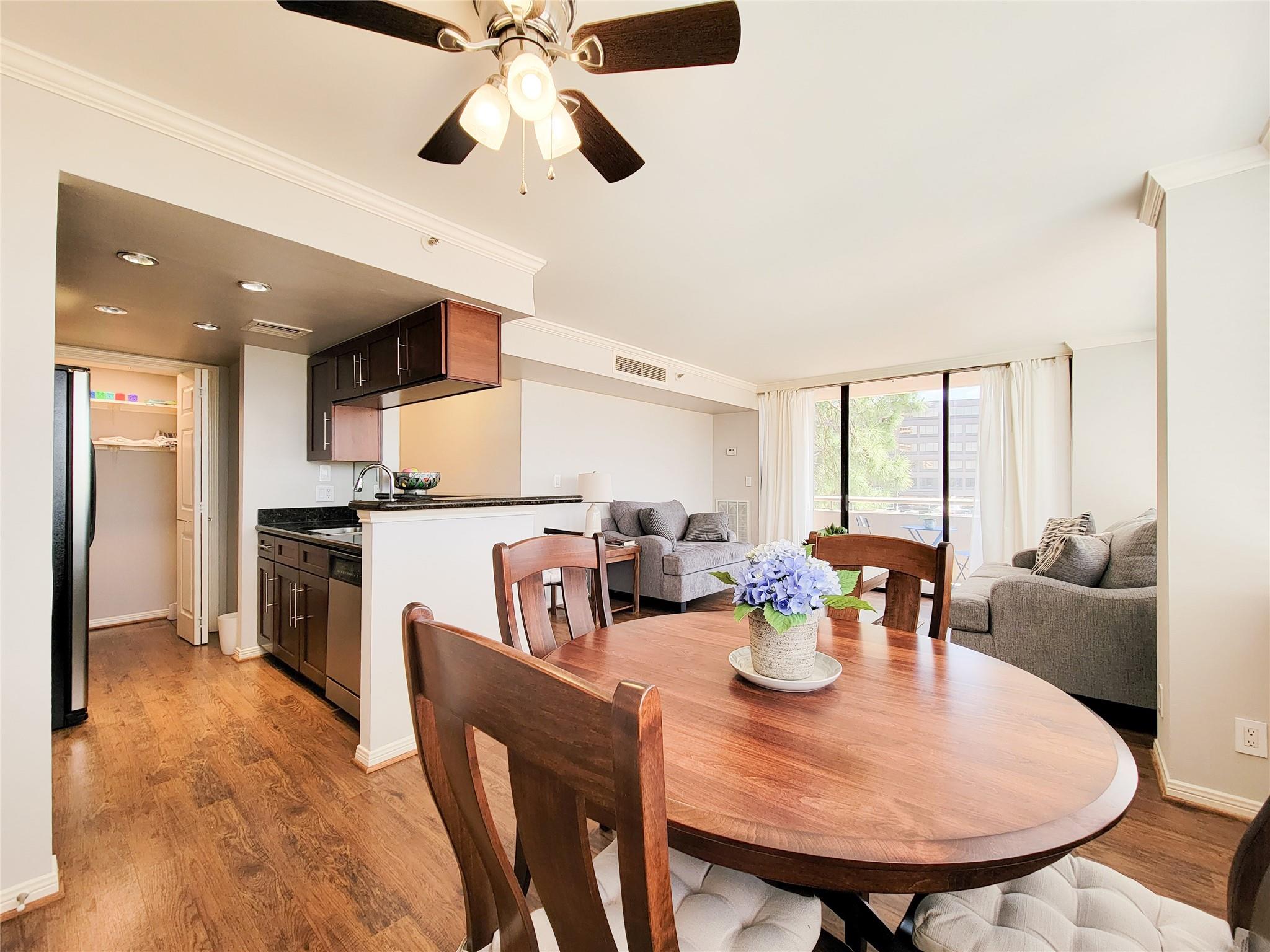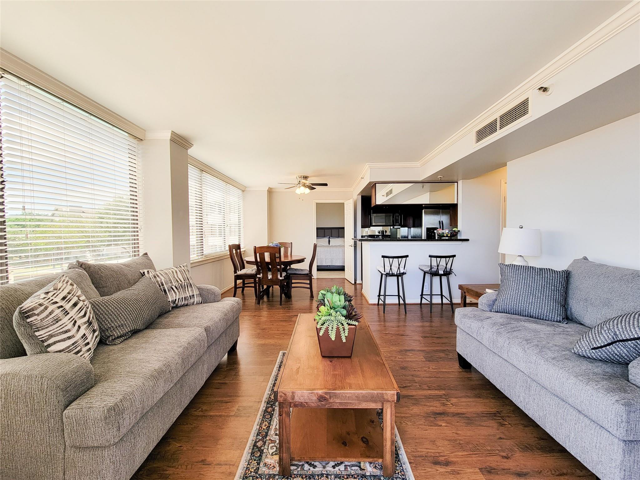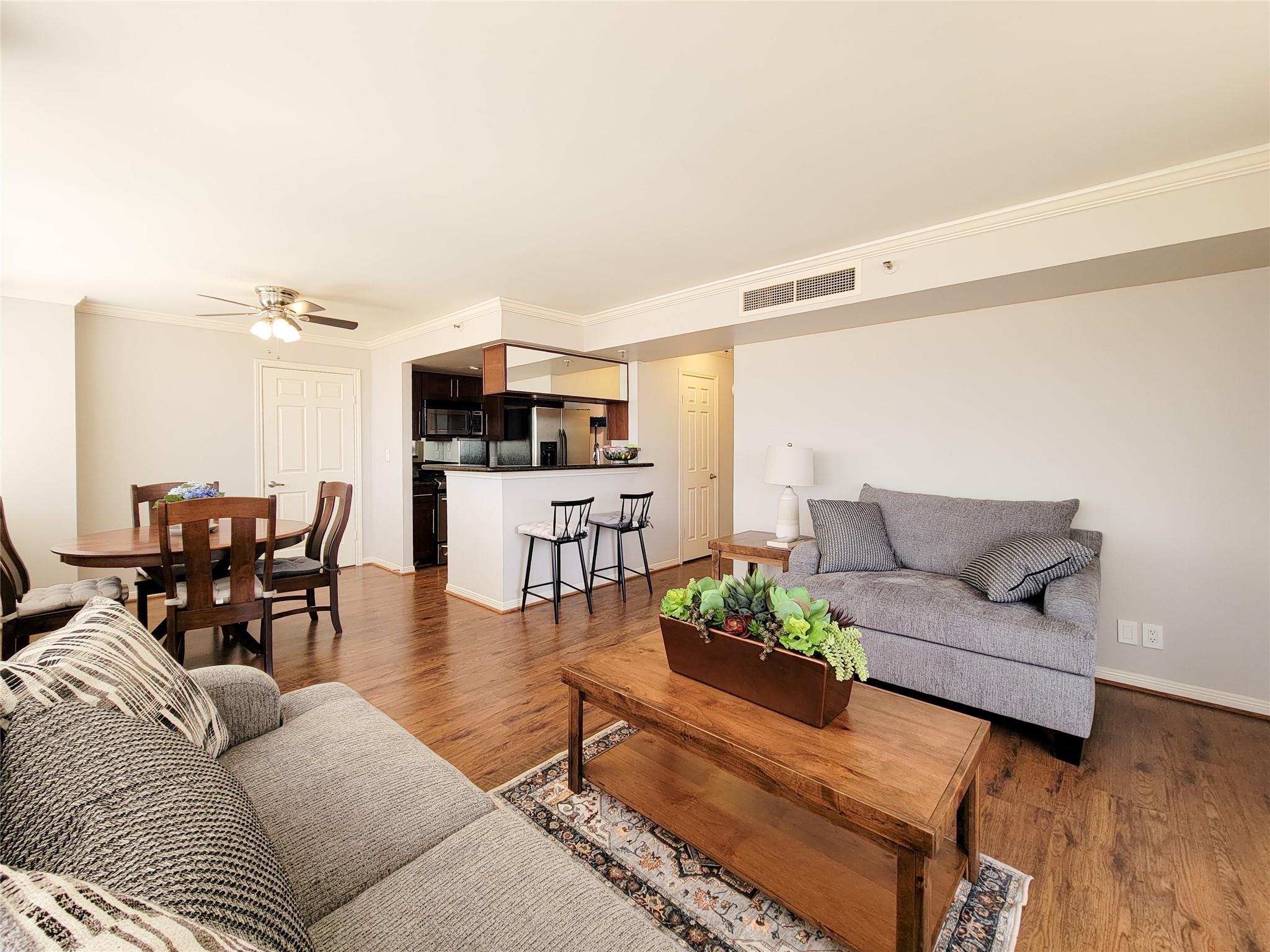 Galleria Area Condo! Luxurious 2nd Floor Unit! Exceptional location - just minutes away from the Galleria with easy access to 59 and 610! Elegant lobby with grand piano & the mezzanine offers cozy seating. This is true city living! Enjoy 24-hour Concierge service, Fitness center, Resort style pool with Jacuzzi & Outdoor Kitchen, Club room for gathering and parties and free Wi-Fi in the common areas. Security is a top priority in this building: Elevators with lobby access only, cameras in all areas. This spacious 2 bedroom, 2 bath condo, touts laminate and tile flooring, granite countertops, stainless steel appliances, and washer/dryer/refrigerator. The second bedroom has easy access to the 2nd bath. The A/C unit was replaced in 2024, sliding doors added to both baths, fresh paint and window coverings. The furnishings are like new and go with the unit. Must see to appreciate!