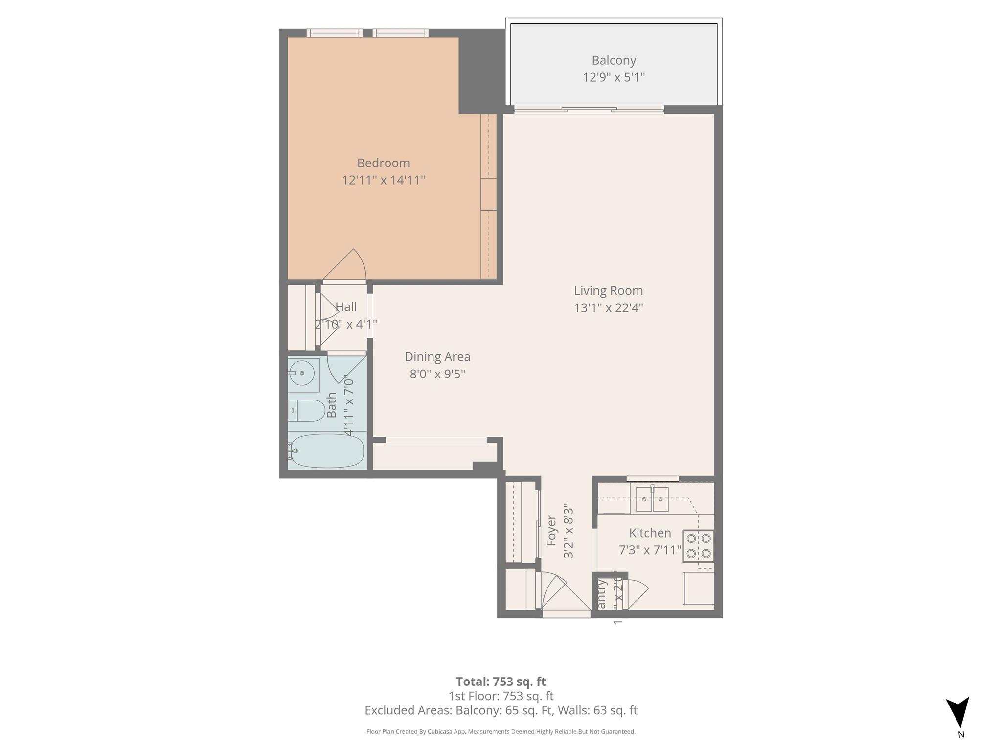 First FloorLiving:13x22Dining:8x9.5Kitchen:7x8Bedroom:13x15Bath:5x7Exterior Porch/Balcony:5x13