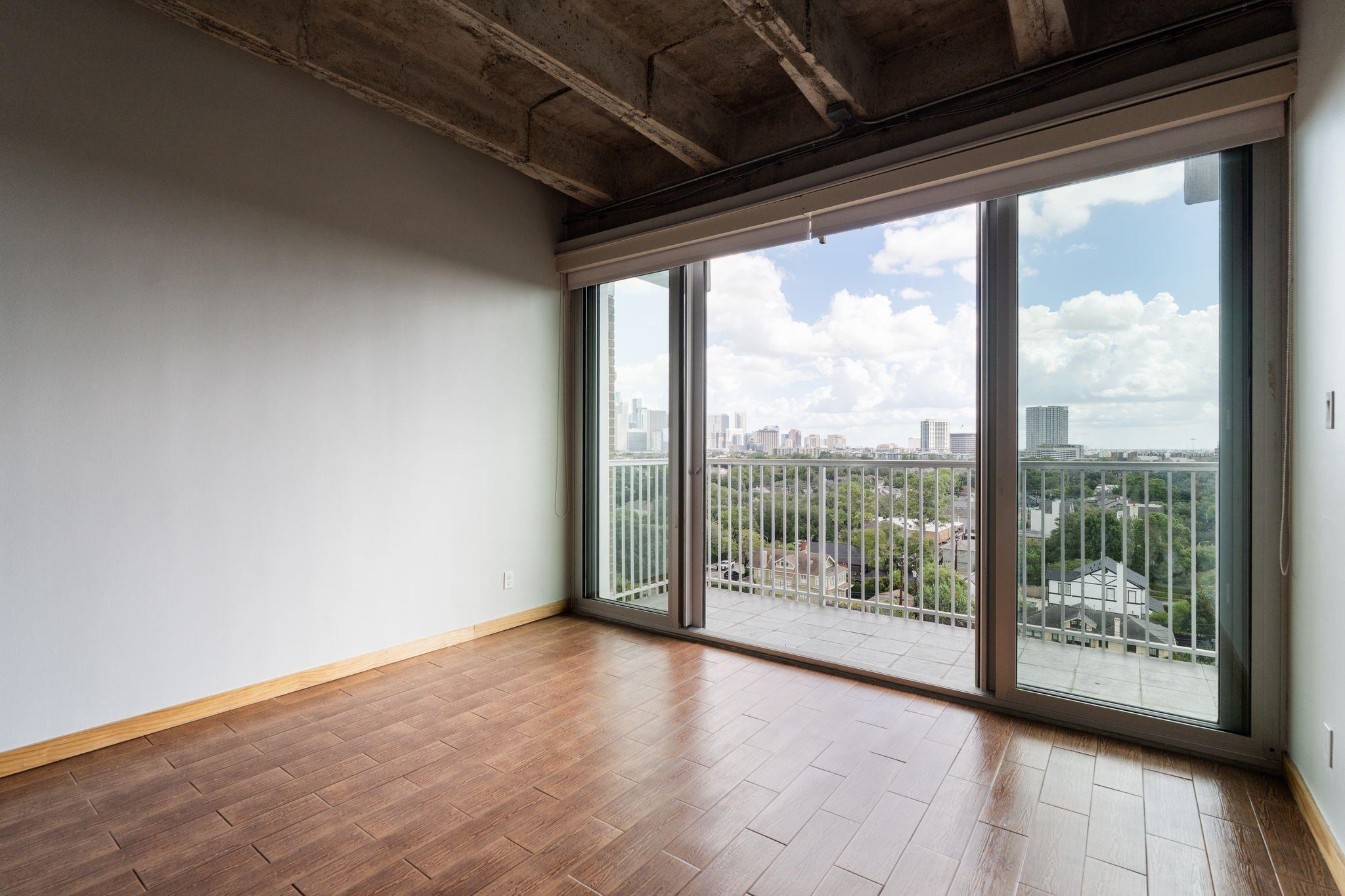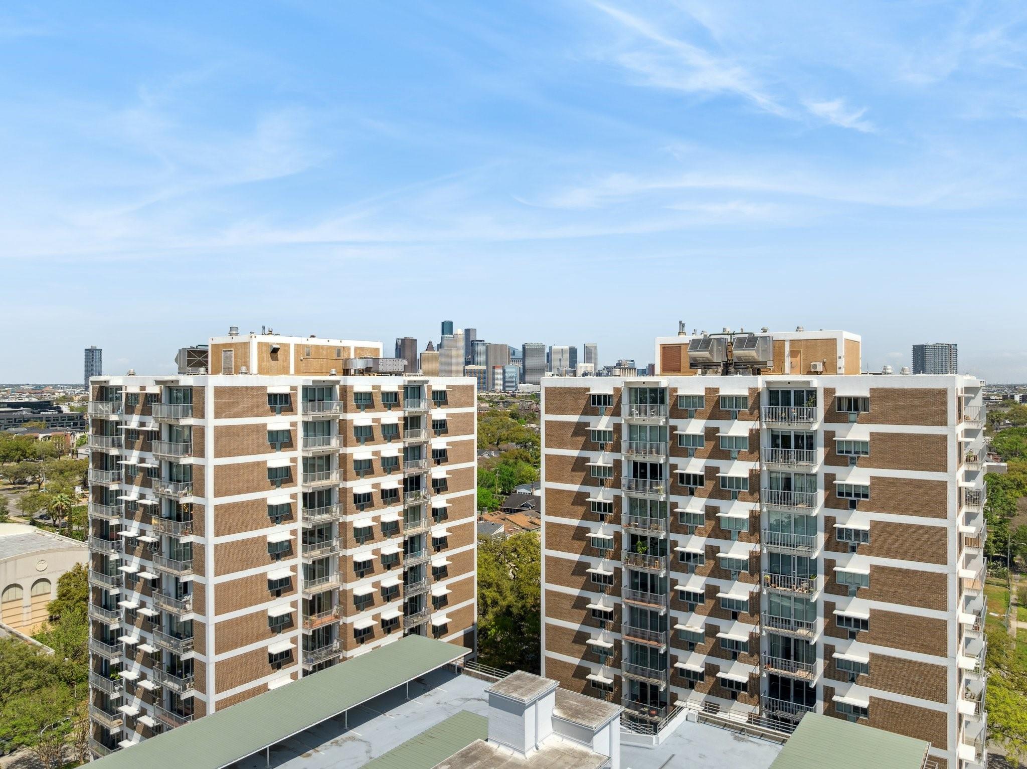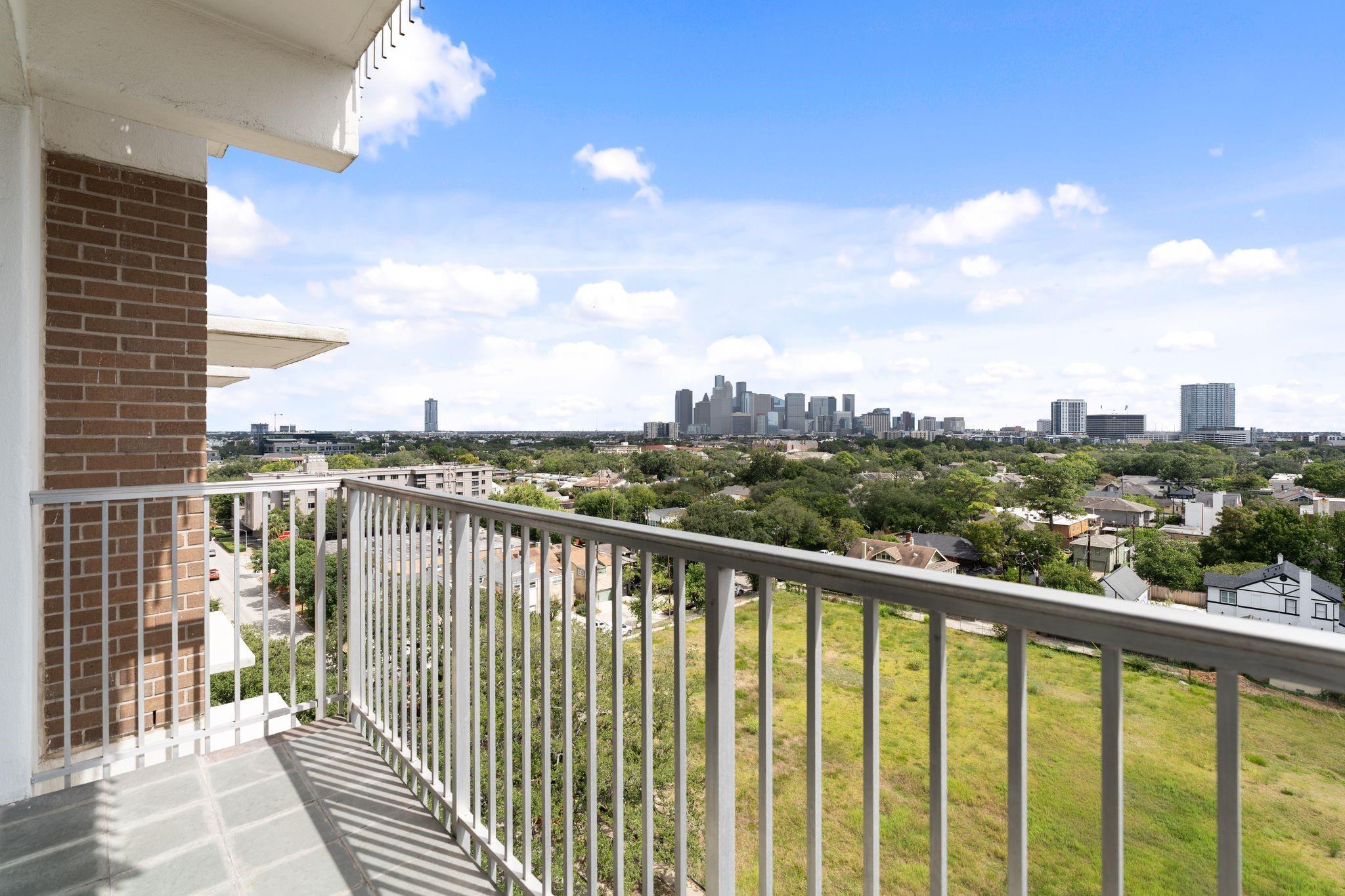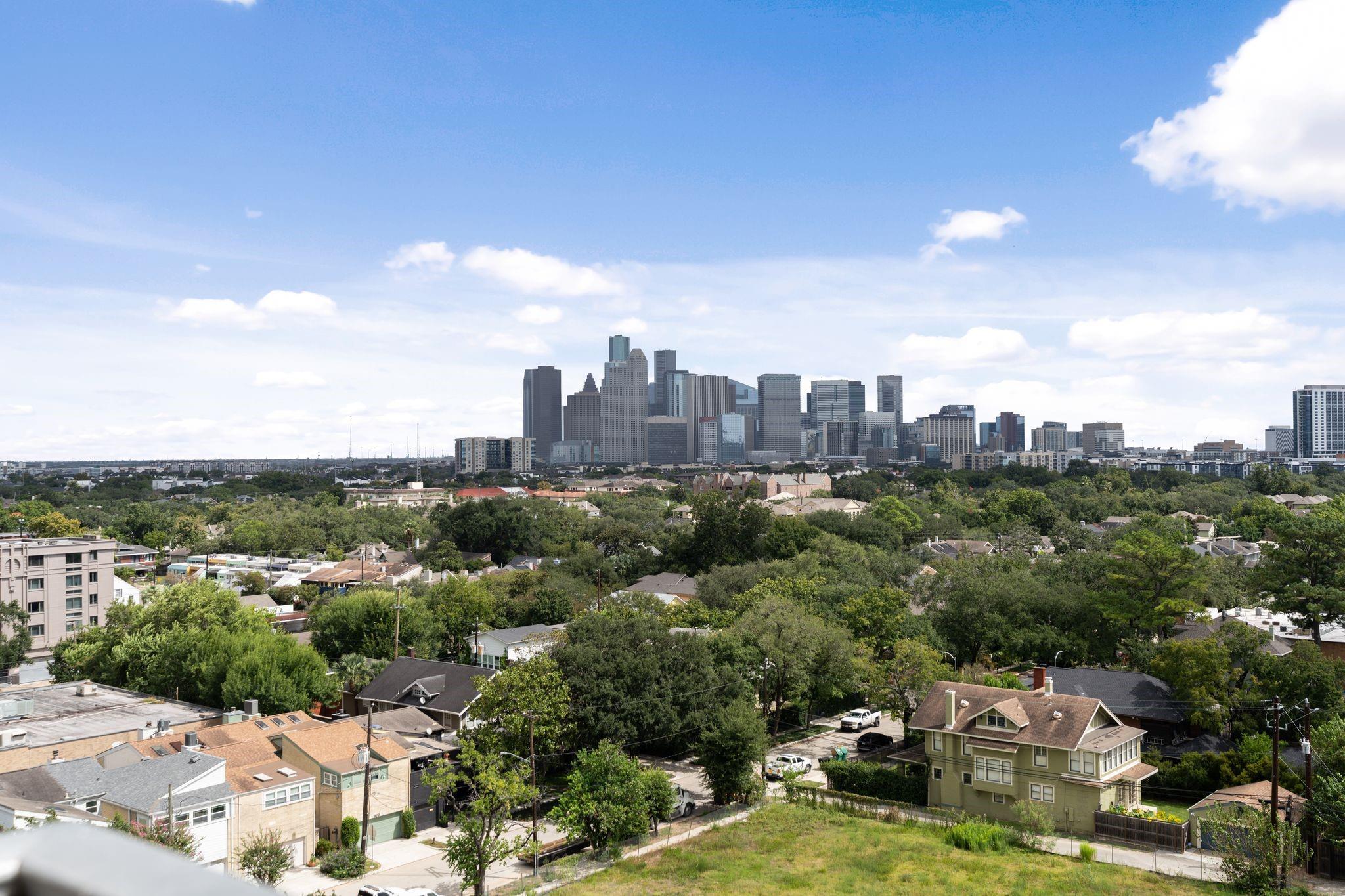 Set on the 9th floor of Parc IV, this 1 bed, 1 bath condo offers expansive downtown views and eastern exposure from both the living room and bedroom. A private balcony extends off the living area, and the unit features loft style ceilings that enhance the sense of space. The open kitchen overlooks the living and dining areas and includes a bar height counter for seating. Built ins add versatility for a home office, bar, or display space. The bedroom features a wall length closet, and the bathroom has a clean, updated look. The unit has been thoughtfully improved and is move in ready. HOA dues include all utilities except Wi Fi. Up to two parking spaces are available, dependent on the number of driver occupants. A new backup generator is slated to be operational soon, adding extra peace of mind. Residents enjoy a pool, gym, lounge, secure entry, and a central Montrose location just minutes from downtown, the Museum District, and the Medical Center.