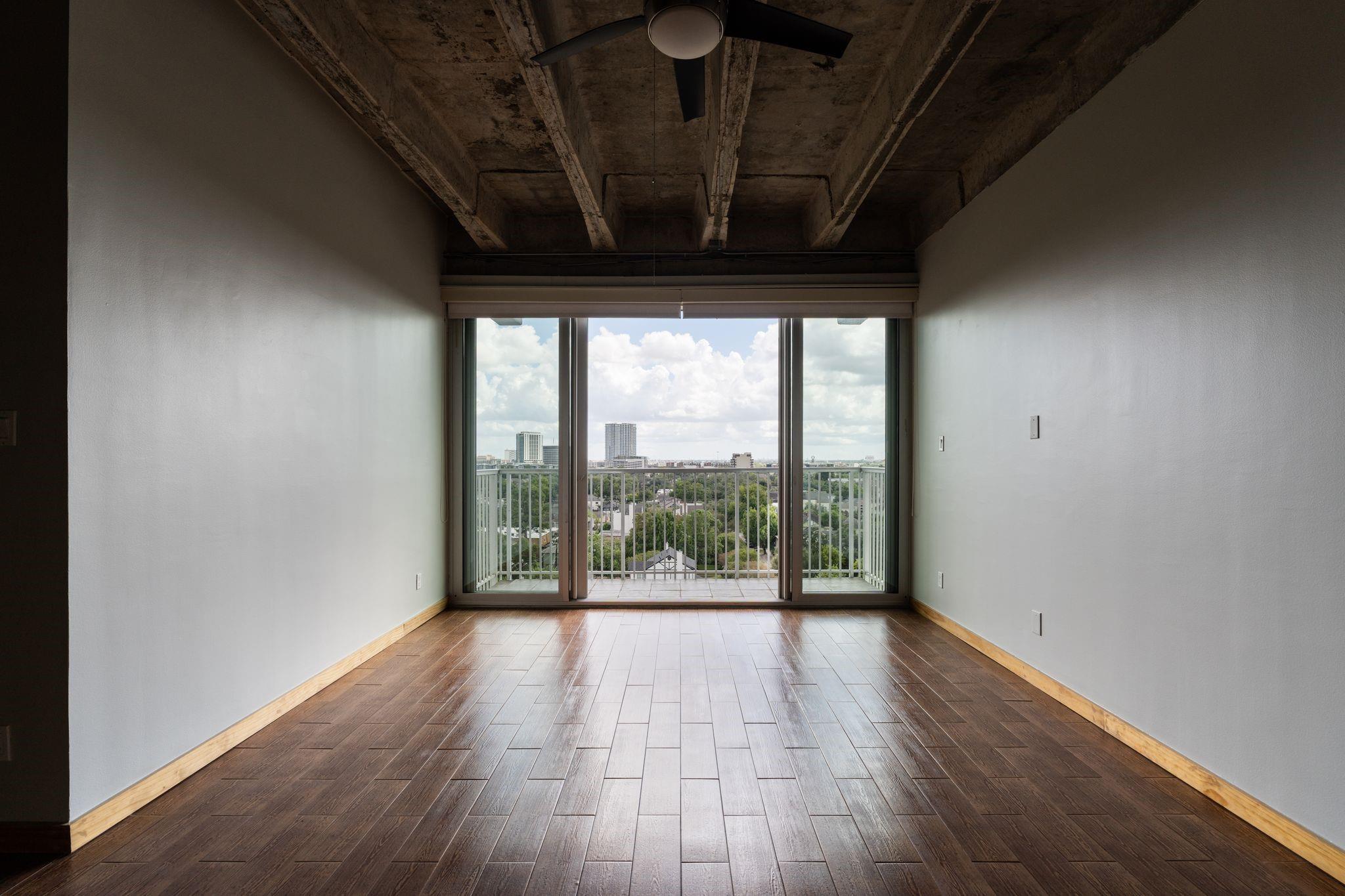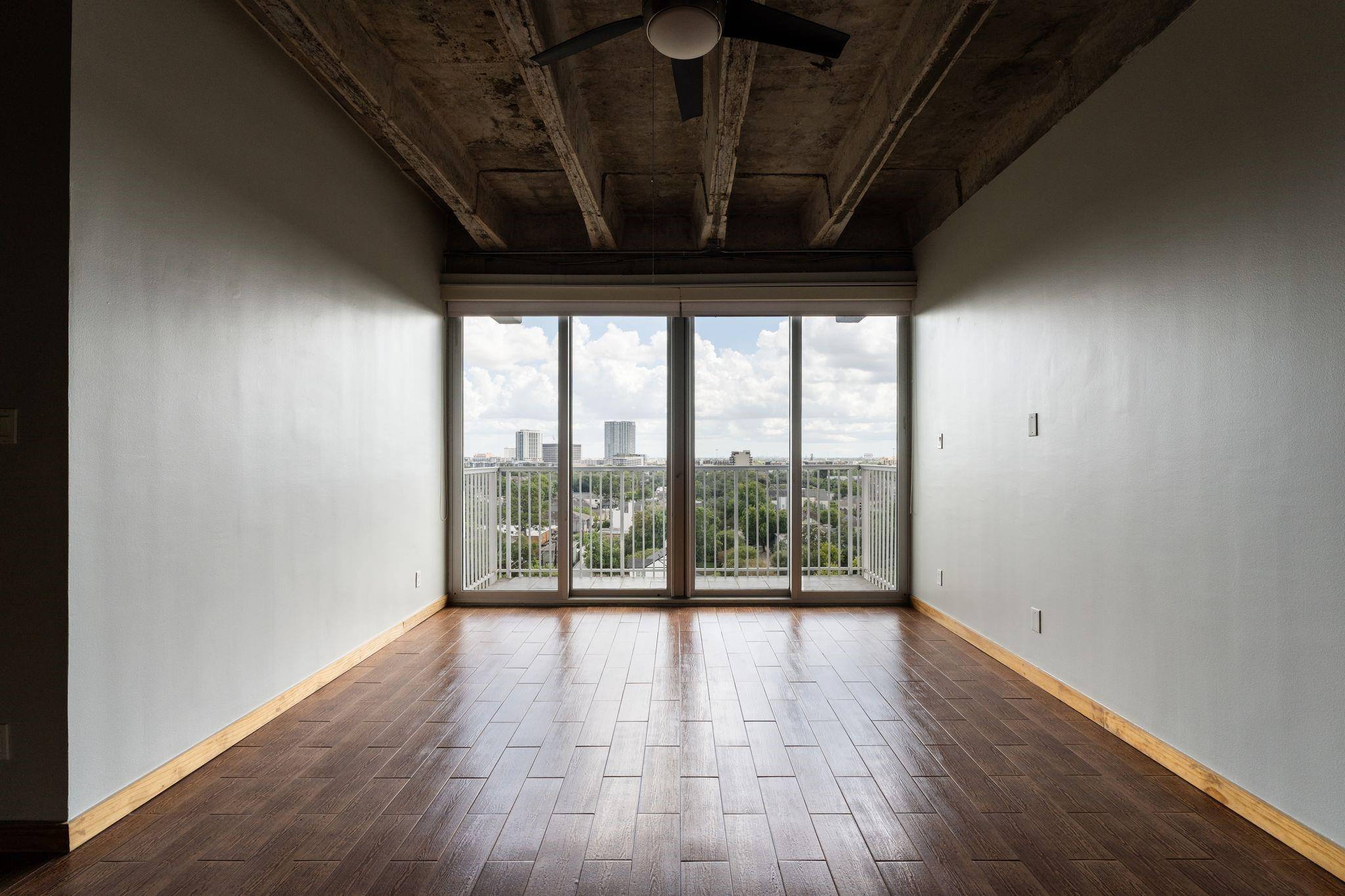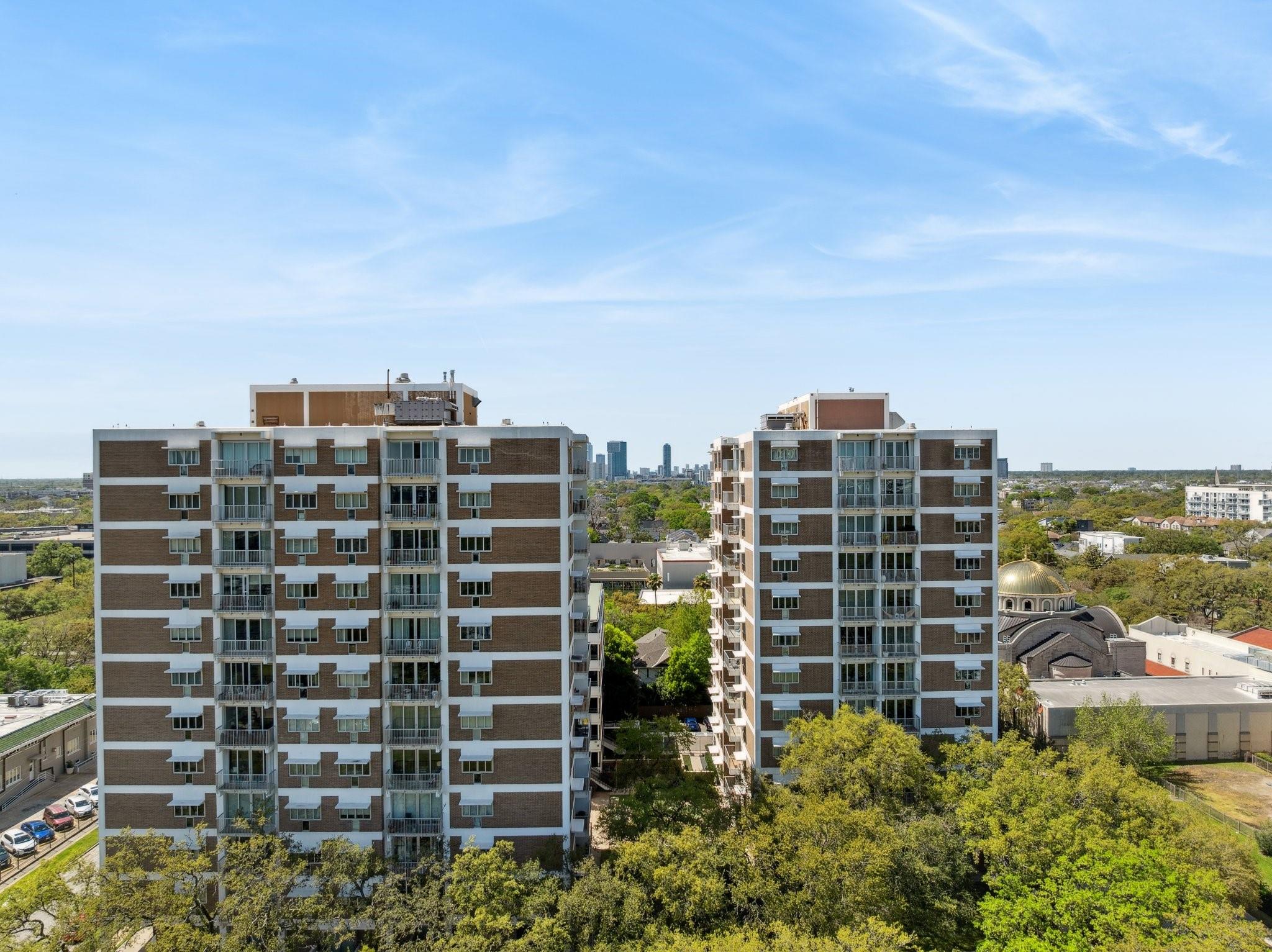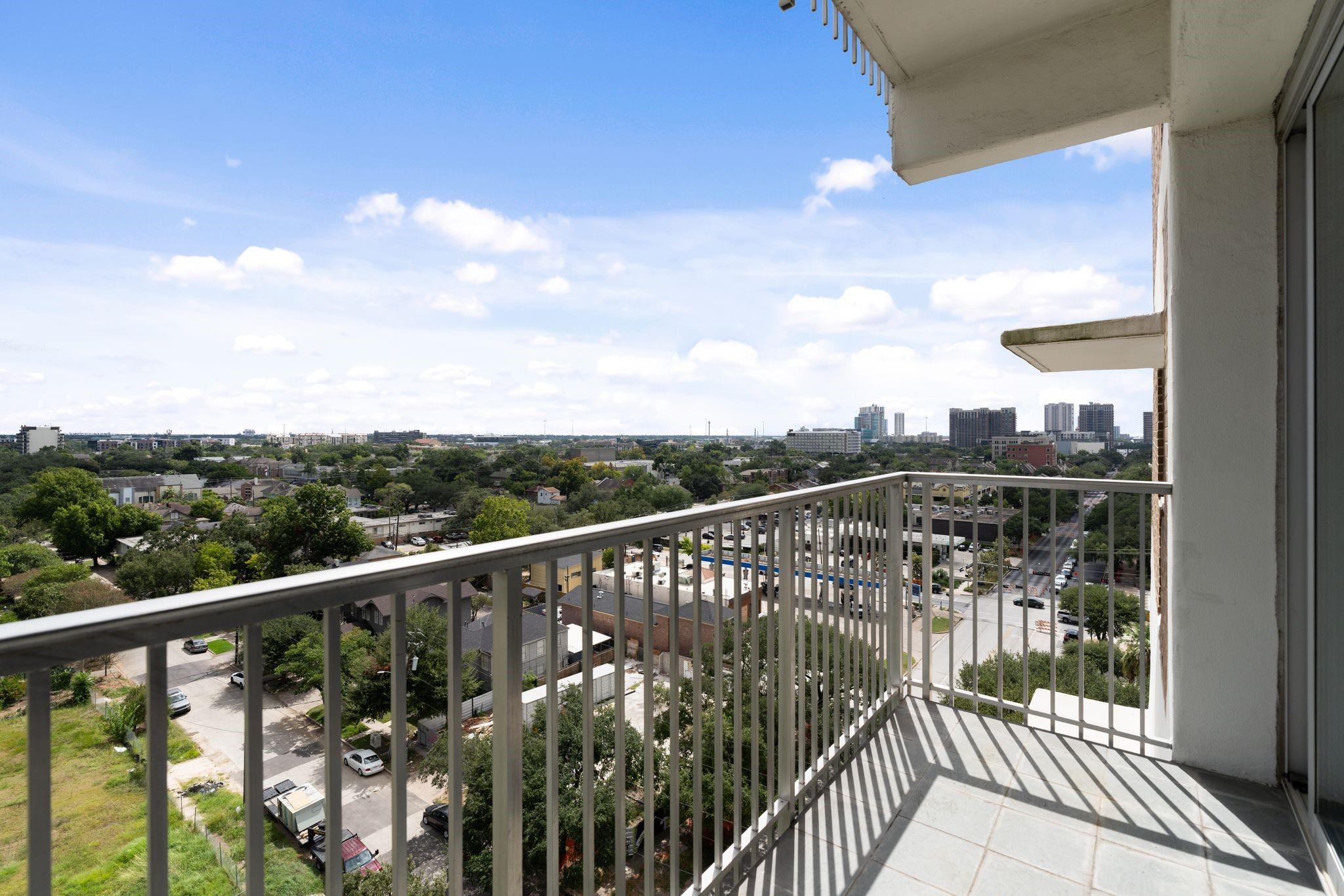 Set on the 9th floor of Parc IV, this 1 bed, 1 bath condo offers expansive downtown views and eastern exposure from both the living room and bedroom. A private balcony extends off the living area, and the unit features loft style ceilings that enhance the sense of space. The open kitchen overlooks the living and dining areas and includes a bar height counter for seating. Built ins add versatility for a home office, bar, or display space. The bedroom features a wall length closet, and the bathroom has a clean, updated look. The unit has been thoughtfully improved and is move in ready. HOA dues include all utilities except Wi Fi. Up to two parking spaces are available, dependent on the number of driver occupants. A new backup generator is slated to be operational soon, adding extra peace of mind. Residents enjoy a pool, gym, lounge, secure entry, and a central Montrose location just minutes from downtown, the Museum District, and the Medical Center.