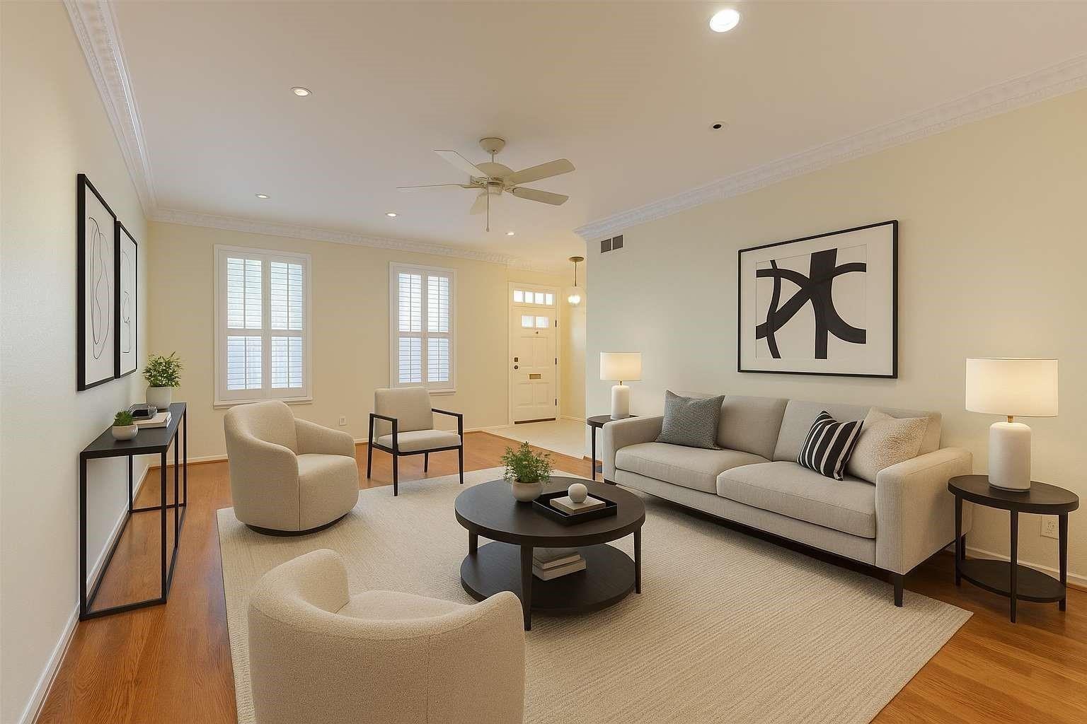 Located in the sought after Madison Place, this two-story townhome boasts engineered wood floors on the first level and tile in the kitchen and breakfast area. The cozy family room features a brick fireplace and built-in bookshelves, the large windows flood the home with natural light. Upstairs, two spacious carpeted bedrooms each have their own bathroom. The spacious back patio has a sprinkler system for easy maintenance. Washer, dryer and refrigerator are included. Enjoy the community pool and nearby Levy Park, ideal for those seeking convenient in-town living in a desirable area.