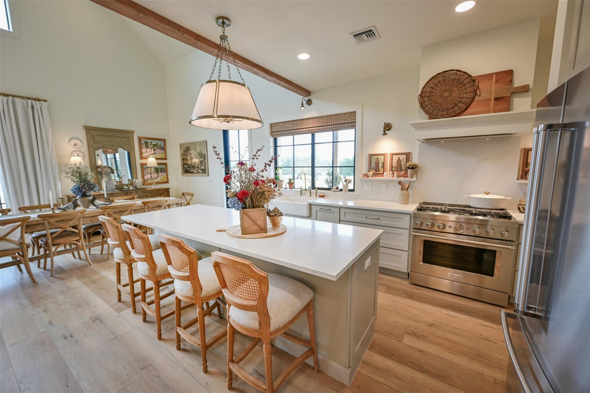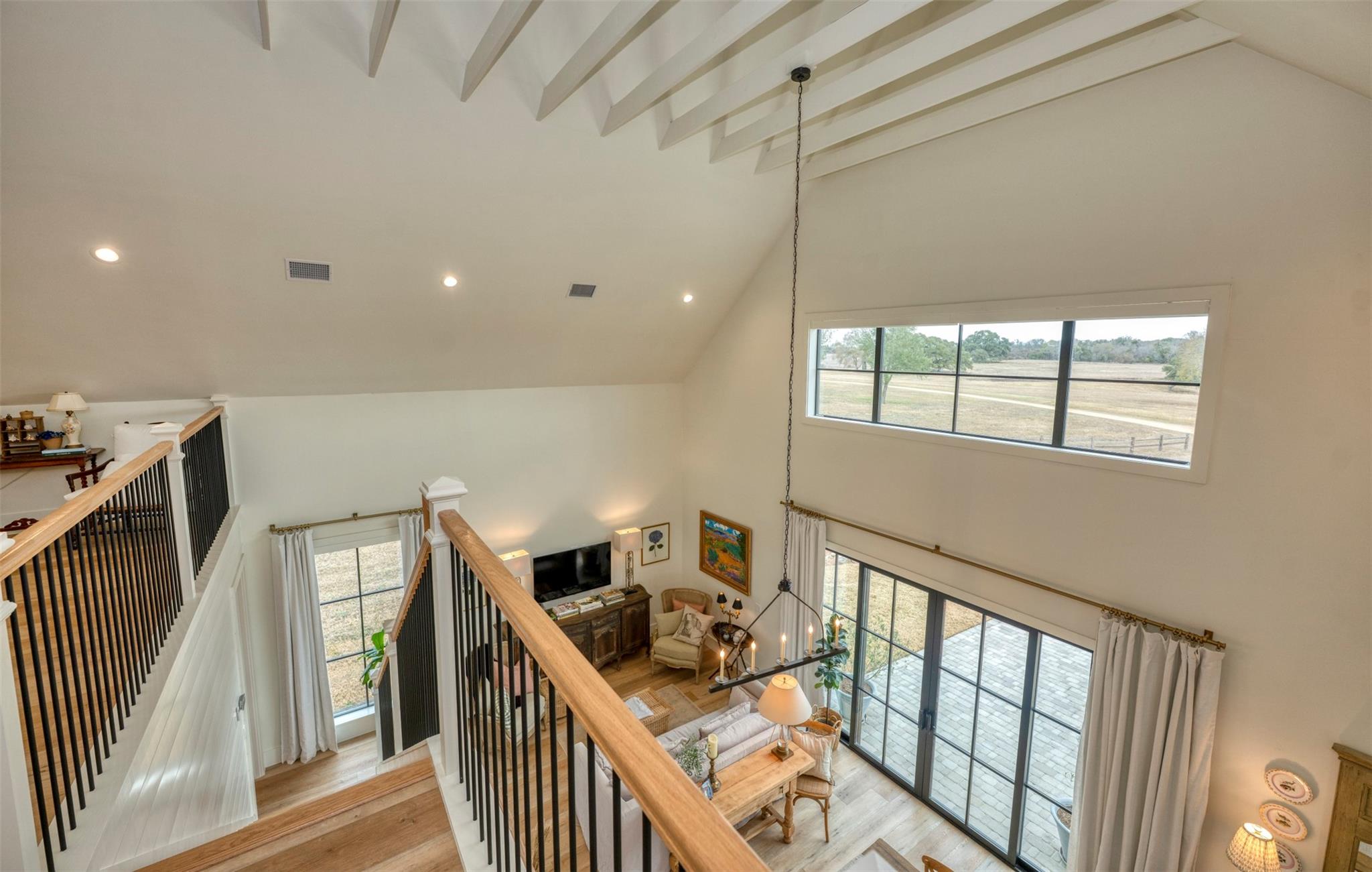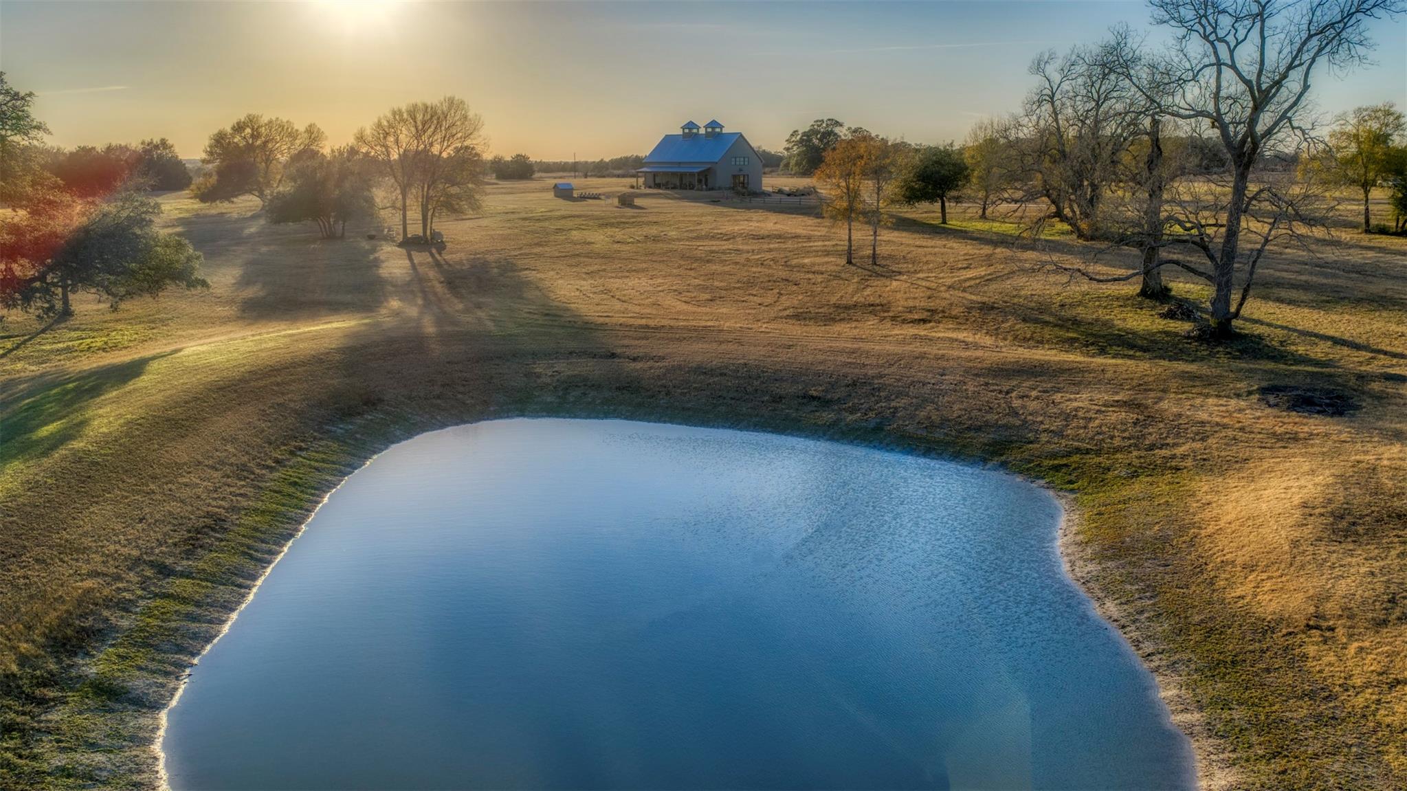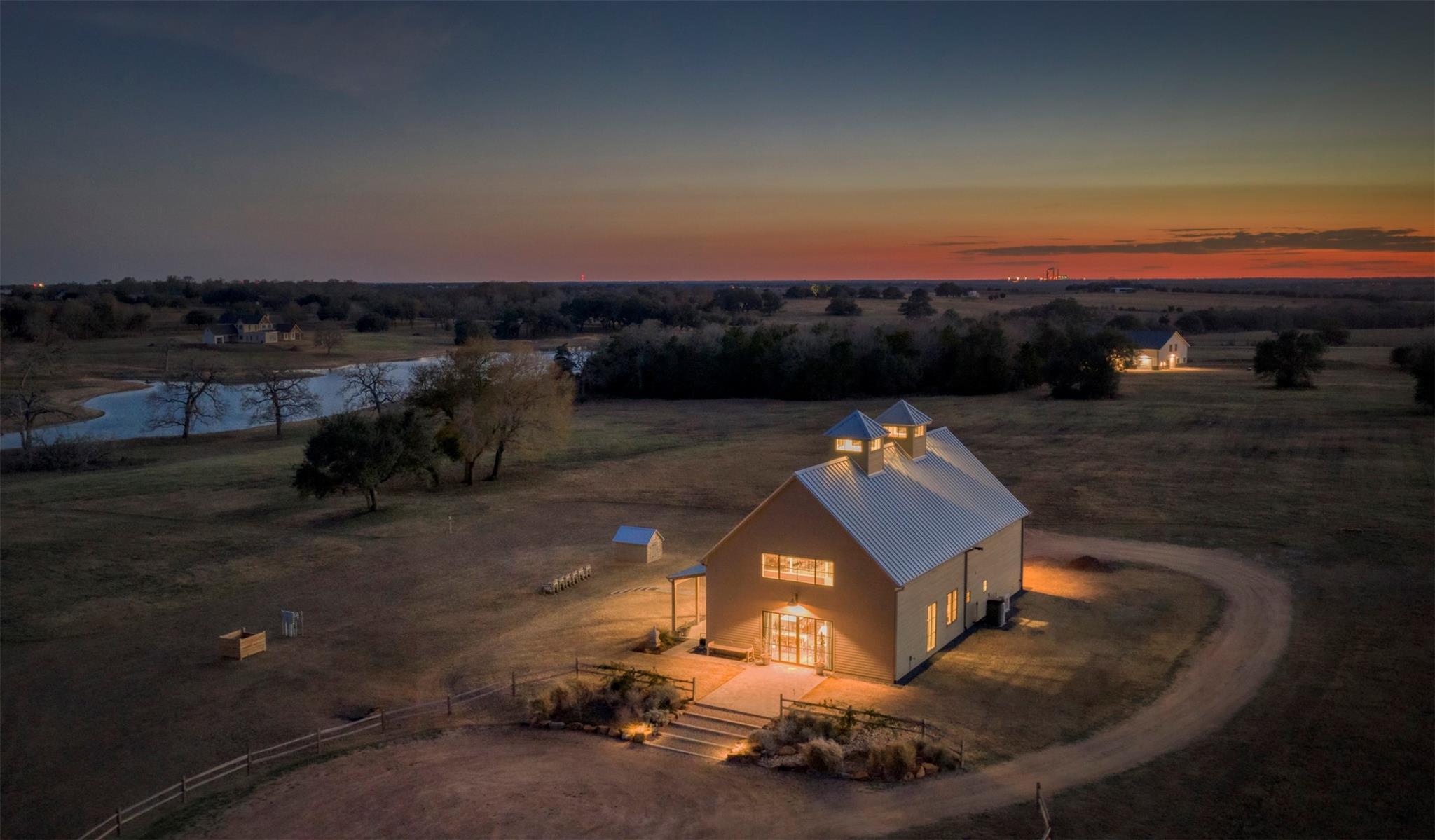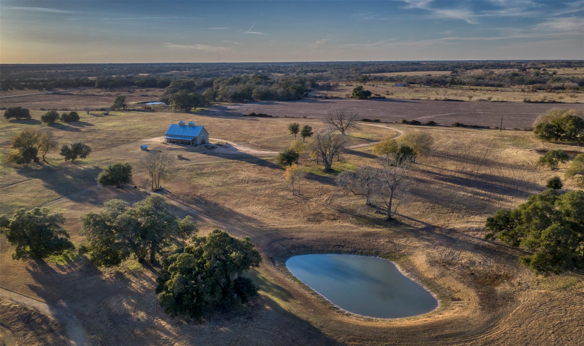 Perched on a high hilltop with sweeping views overlooking the lake, these ±15.907 acres offer the perfect blend of beauty, privacy, and convenience. Gently rolling hay meadows create a picturesque setting ideal for country living. Enjoy your own private, stocked pond and wide-open spaces while being just minutes from downtown Round Top. Complementing the setting is a custom barndominium with large kitchen perfect for gathering and entertaining, flowing seamlessly into an open living area with a loft. There is a downstairs bedroom and additional sleeping quarters in the loft. There is also a climate-controlled workshop and storage area, ideal for hobbies, projects, or protecting valuable equipment. An ideal building site still awaits—ready for you to design and create a custom home that fits your vision, allowing the existing improvement to become a wonderful space for guests. Experience elevated views, open skies, and the charm of Round Top living at its finest.