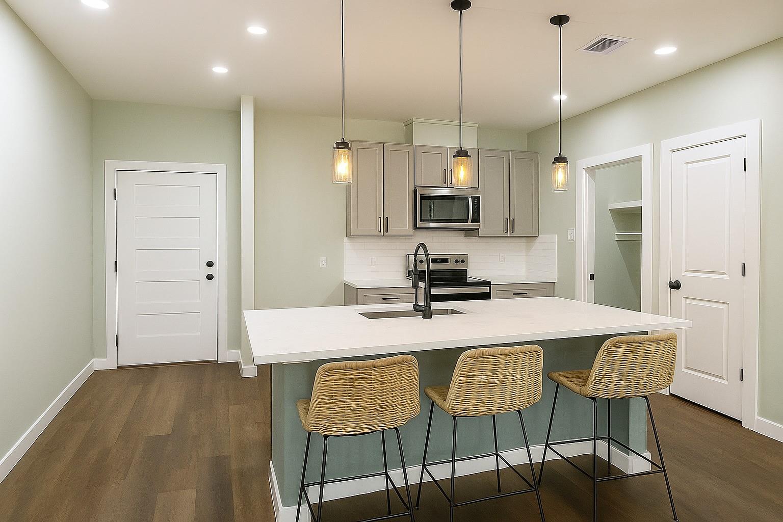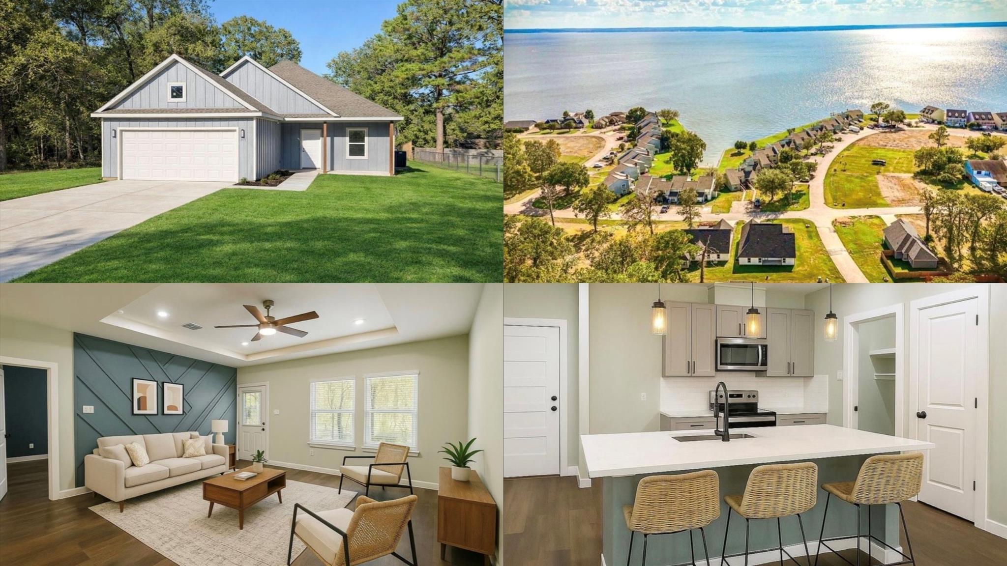 Discover this brand-new home in Memorial Point, a quiet gated waterfront community on beautiful Lake Livingston. Enjoy modern, low-maintenance living with smart siding, 9’ ceilings, custom cabinetry, and quartz countertops. The open layout features luxury vinyl plank and tile flooring, plus a stylish accent wall that adds a designer touch. The primary suite offers a spa-like retreat with dual sinks, a walk-in shower, and a huge closet. Each bedroom includes its own walk-in closet. Relax on the covered back porch overlooking the fenced yard—perfect for morning coffee or weekend cookouts. Community amenities include controlled access, a park, covered pavilion, community pool, clubhouse, and boat ramp for easy lake access. Experience the perfect mix of comfort, convenience, and lakeside living—schedule your showing today!