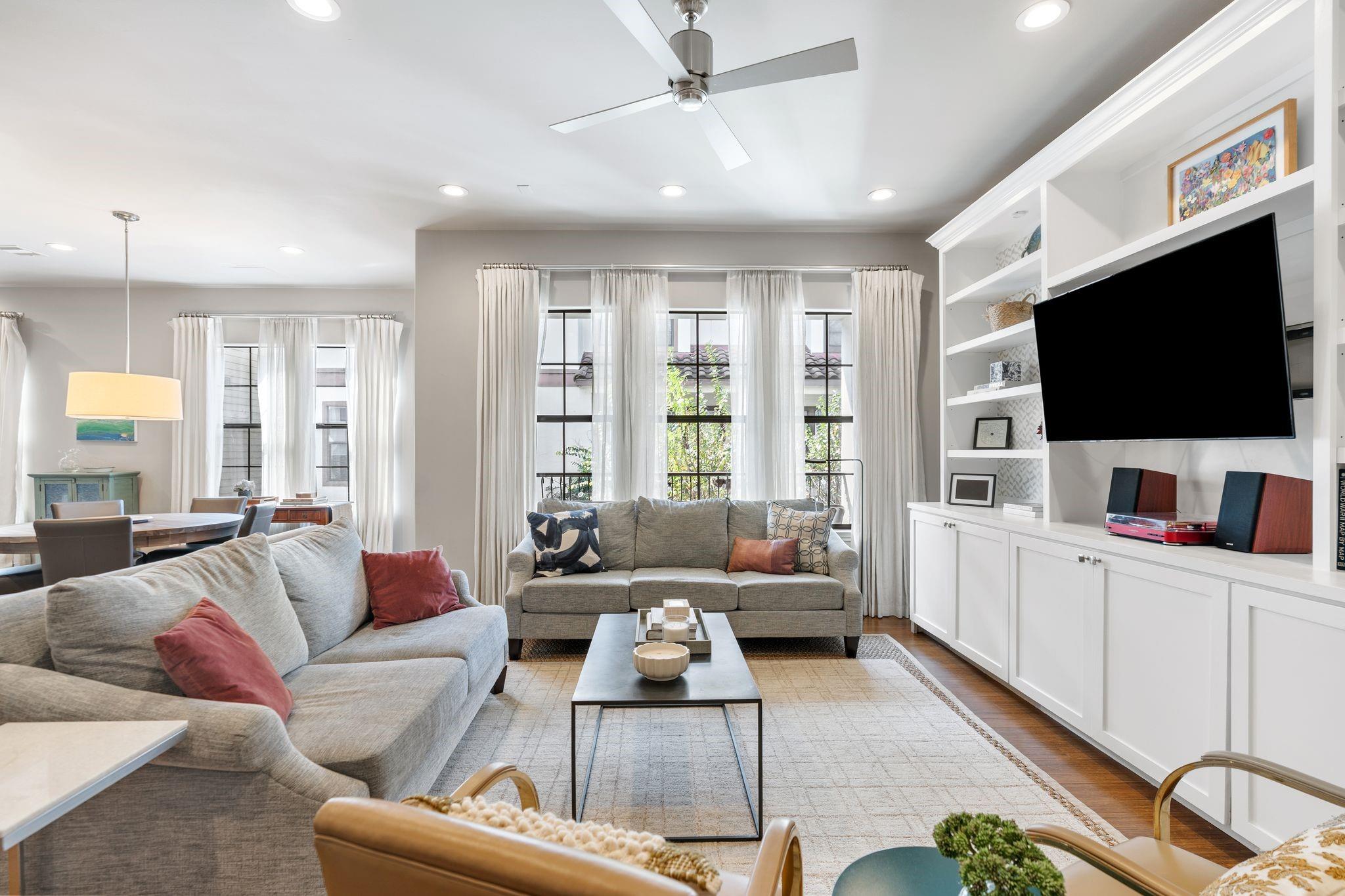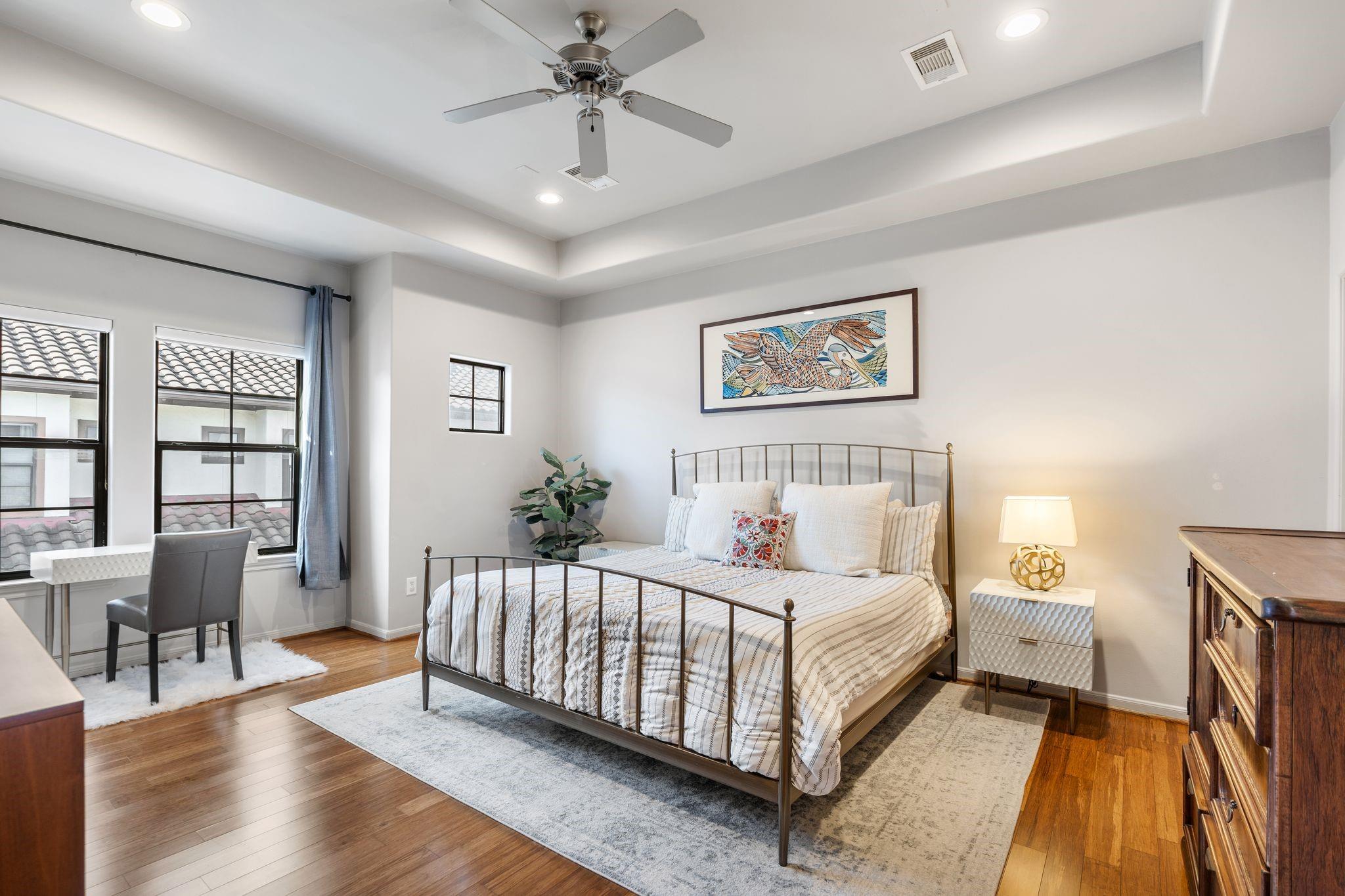 Rare 4 bed home w/open floorplan & modern finishes. Custom built-ins, art niches, & clean architectural touches w/ bamboo hardwood floors throughout home—no carpet. NEW HVAC 2024! Updated modern kitchen w/large waterfall island w/quartz counters,modern wood cabinetry & SS appliances, opening seamlessly to the dining w/ statement light fixture & spacious family rm w/custom media center.Flex space off kitchen offers spot for breakfast, playroom, or home office. Updated powder rm.Primary suite on 3rd fl w/2 walk in closets, Spa-like bath w/dual sinks, walk in shower & soaking tub.Guest suite w/updated en-suite bath also on 3rd fl, along w/utility rm. On 1st fl find guest bed #3 w/massive walk in closet & ensuite bath. Rare 4th bed on 1st fl! Enjoy outdoors w/private fenced in front yard & covered 2nd fl balcony. Attached 2 car garage. Guest parking on extra wide Feagan. Never lost power!Prime location w/easy access to Memorial, Allen Parkway, & I-10.Buffalo Bayou Park is at backdoor!