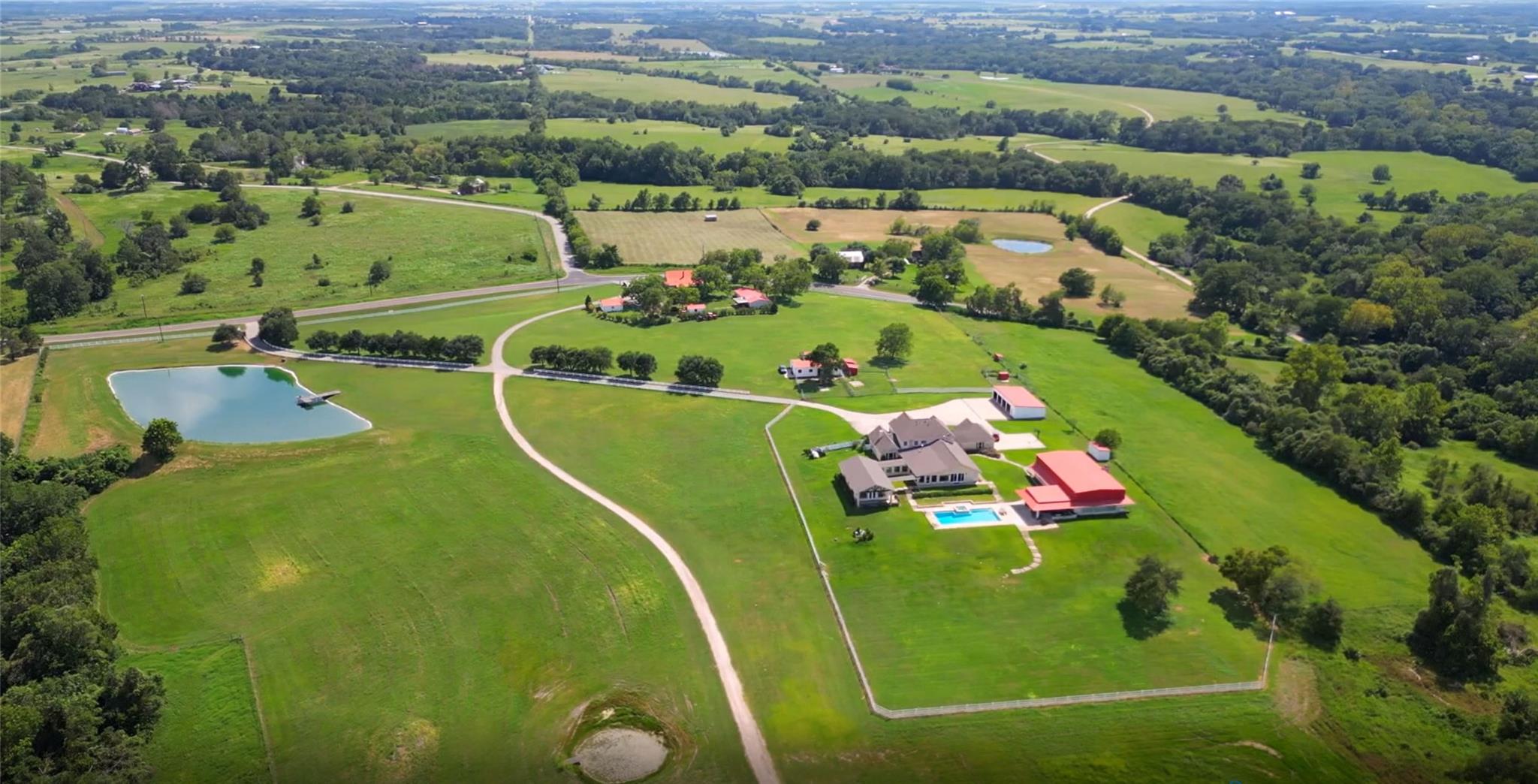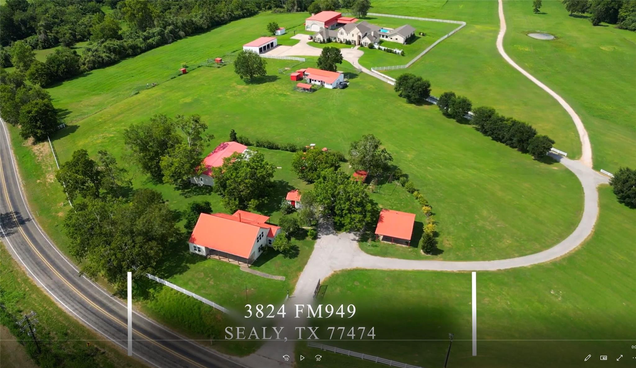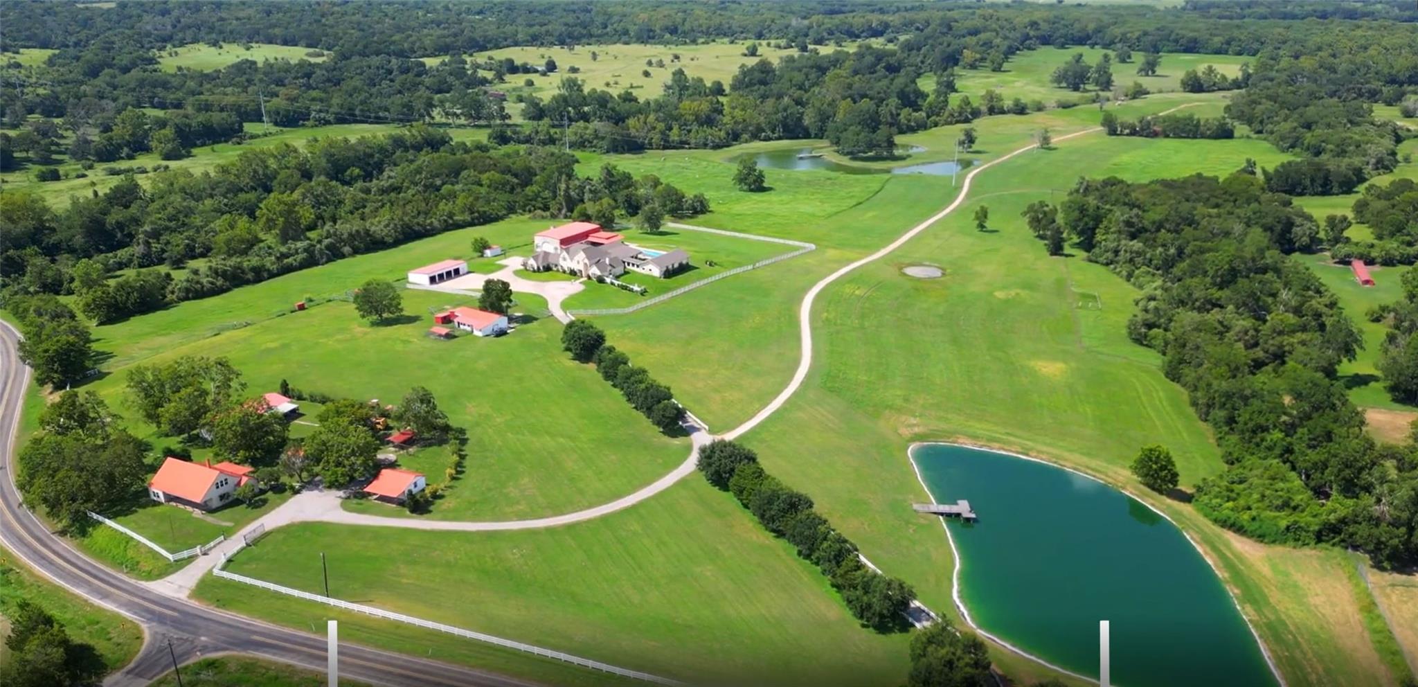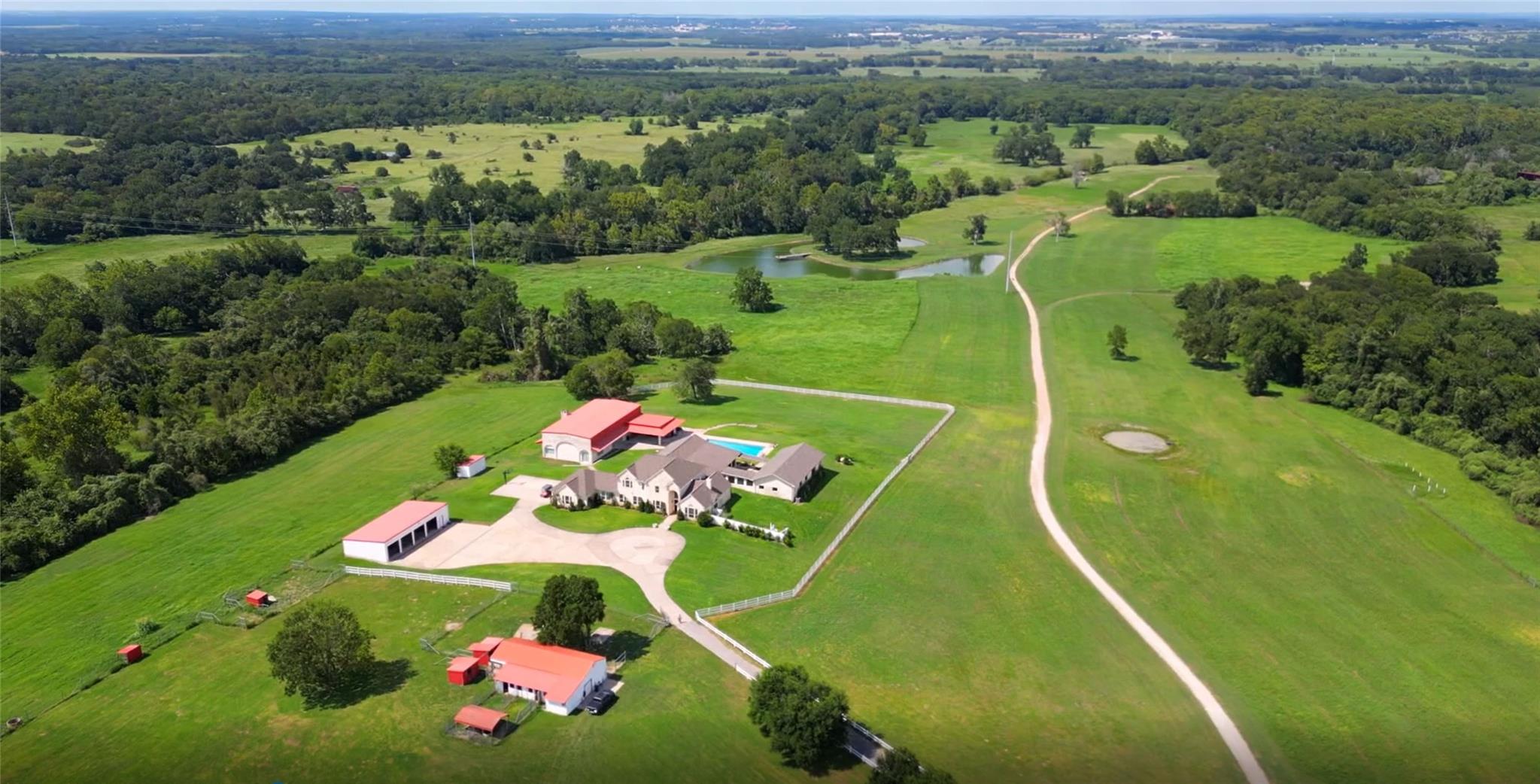 Perched atop the rolling hills of Austin County, this exceptional 430-acre ranch embodies the essence of Texas living. A gated entrance and winding drive reveal native pastures, mature trees, and scenic ponds, creating a private retreat. The 8,900+ sq ft residence blends timeless design with modern comfort, featuring a chef’s kitchen, open living spaces, wet bar, soaring ceilings, and French doors leading to expansive verandas with sweeping views. The private primary wing includes a luxurious bath, while 5 additional bedrooms and 5.5 baths offer ample space for guests. Outdoor amenities include a pool, spa, kitchen, and shaded entertaining areas, plus a detached event facility. The land showcases rolling terrain, multiple ponds, Mill Creek frontage, 5 water wells, barns, outbuildings, and a historic home that is ideal for ranch staff. Sidewalks connect the estate's improvements for seamless access.