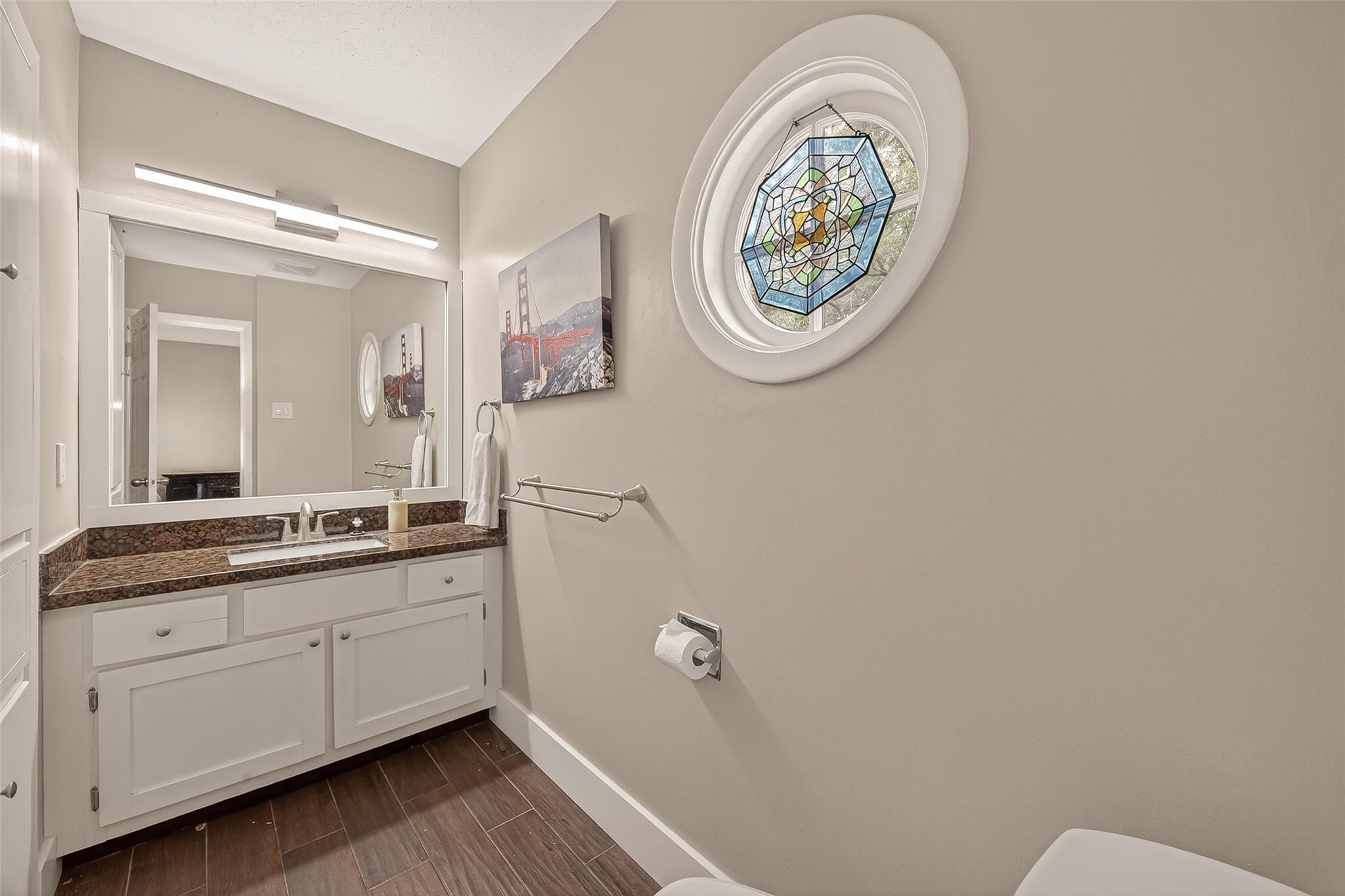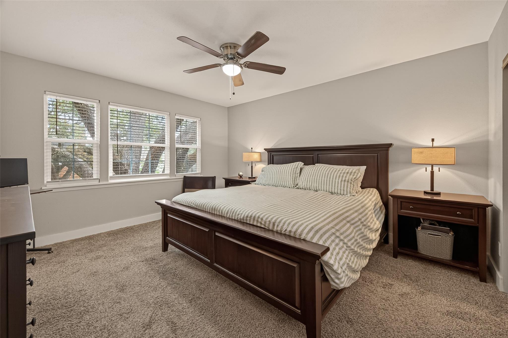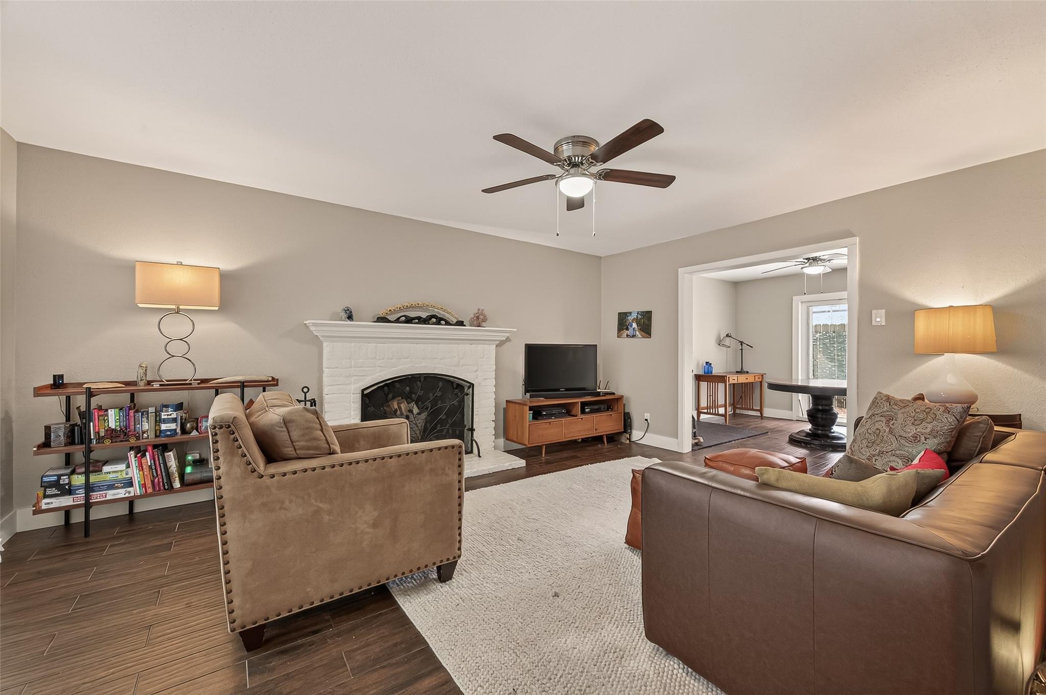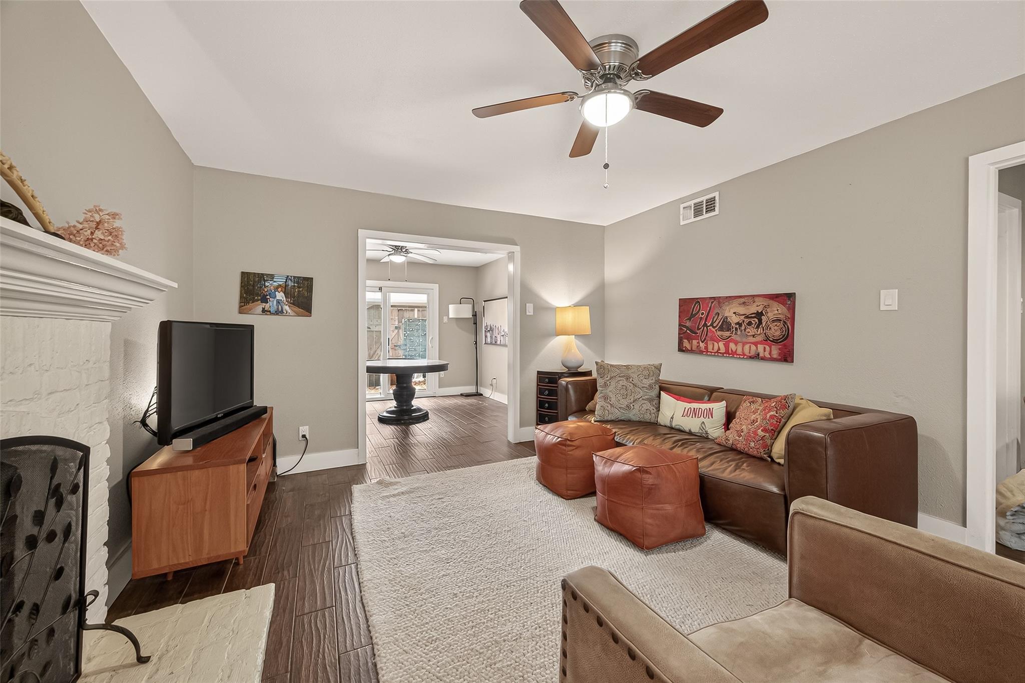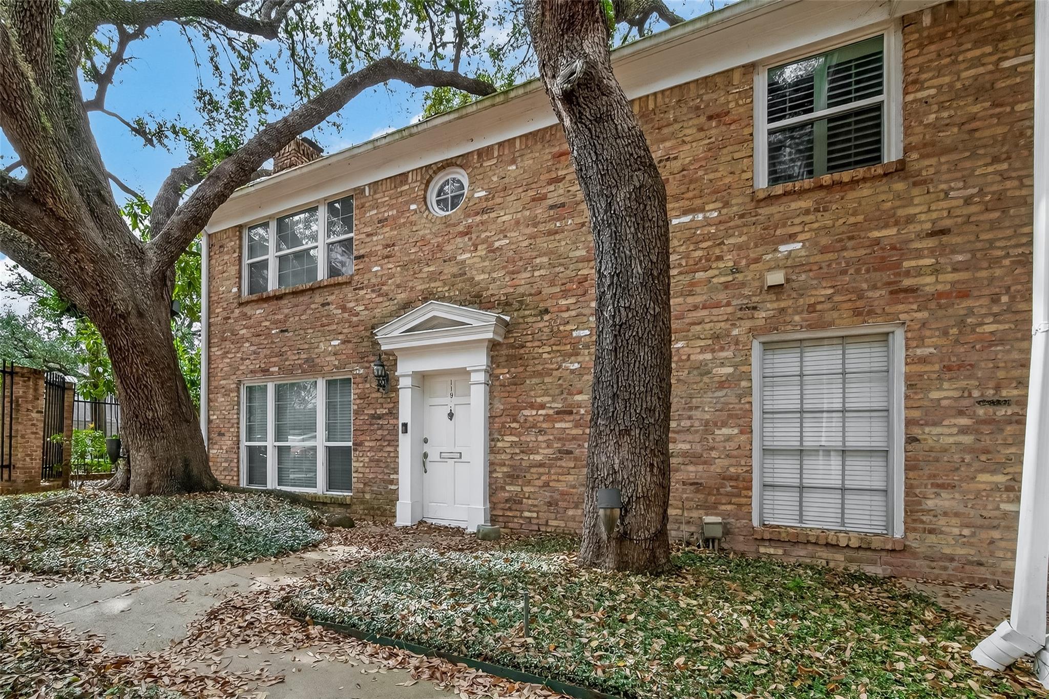 Welcome to 4040 San Felipe Street, Unit 119, a sophisticated English-style brick condominium in the heart of Houston's prestigious River Oaks area. Located within a secure, manned-gated community, this residence is framed by majestic mature oak trees and offers ground-level convenience. The 1,380 sq ft interior features an open-concept living area with rich wood flooring and a classic wood-burning fireplace. The updated kitchen boasts granite countertops and stainless steel appliances, flowing into the dining area and out to a private, fenced brick patio. Upstairs, both bedrooms serve as quiet retreats with private en-suite baths; the secondary bedroom includes a private balcony. This property is zoned to top-tier schools including River Oaks Elementary, Lanier Middle, and Lamar High. Complete with two assigned, covered parking spaces, this home combines timeless charm with an unbeatable location. Experience refined living near Houston’s finest dining and shopping.