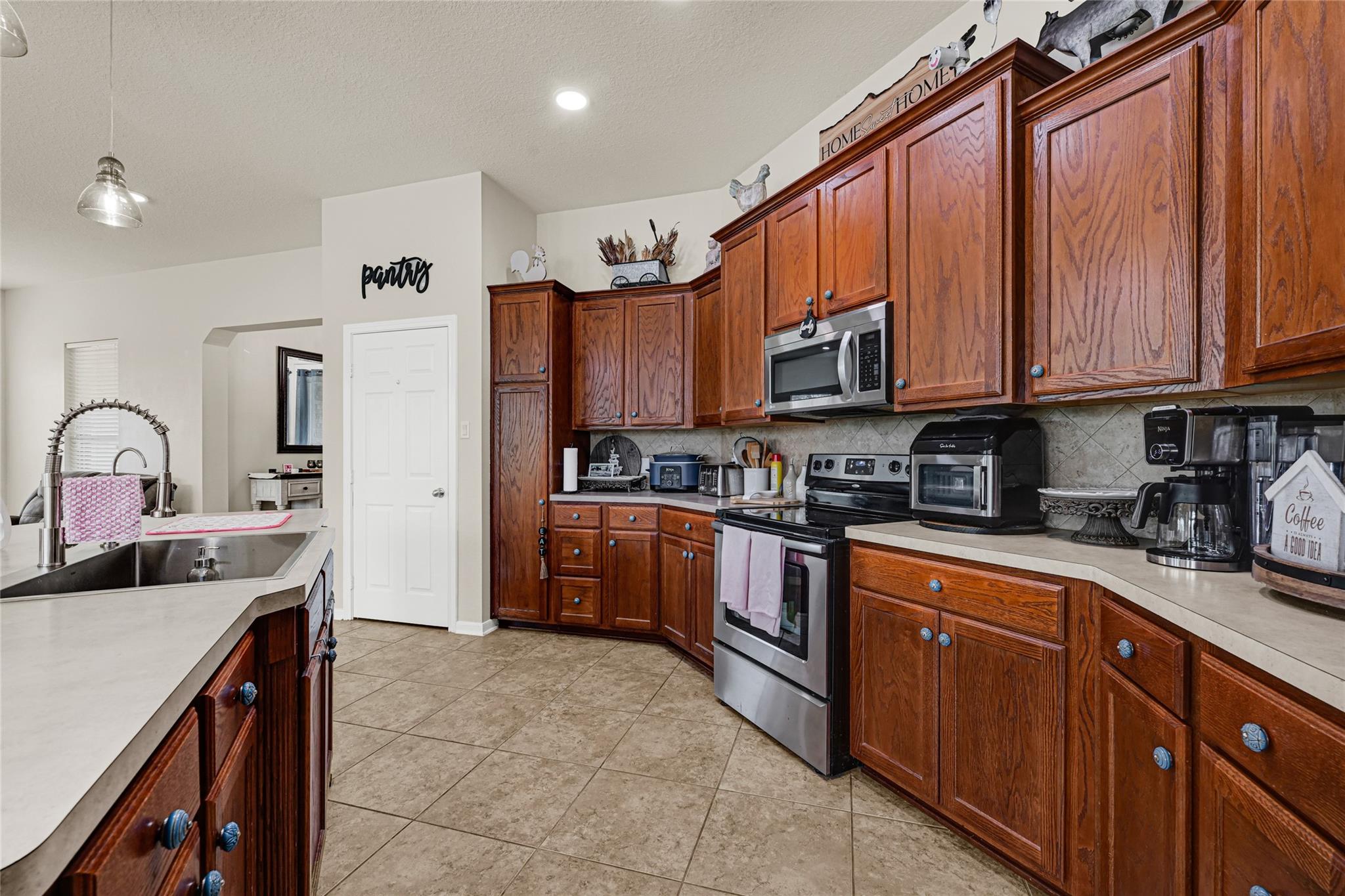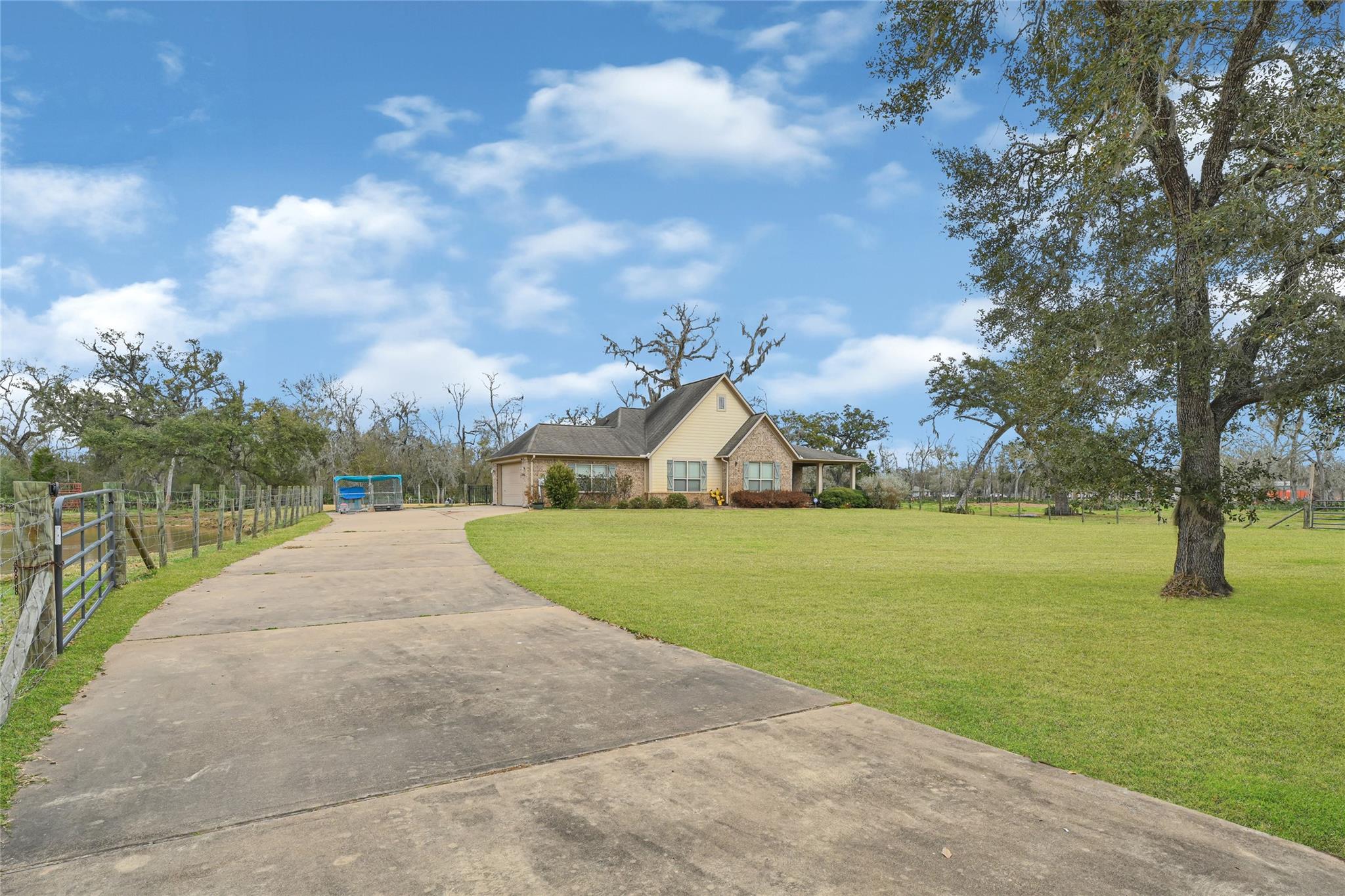 Welcome to your custom-built home, perfectly situated on 8.45 mostly cleared acres with mature trees, a stocked fishing pond, and a fully enclosed 30x60 pole barn — ideal for an RV or workshop. Located in Wild Peach, conveniently between Brazoria and West Columbia. Step onto the large covered front patio and enter an open-concept living space flooded with natural light from oversized windows with a wooded outdoor view. The living room flows seamlessly into the tiled kitchen and breakfast nook, featuring a spacious island, stainless steel appliances, and abundant cabinet space. The primary suite offers a generously sized bedroom, dual-sink vanity, separate tub and shower, and a large walk-in closet. This home combines comfort, functionality, and country charm, making it the perfect retreat for everyday living and entertaining. 30x60 pole barn with concrete floor included. Buyer to verify room measurements, taxes, and schools.
