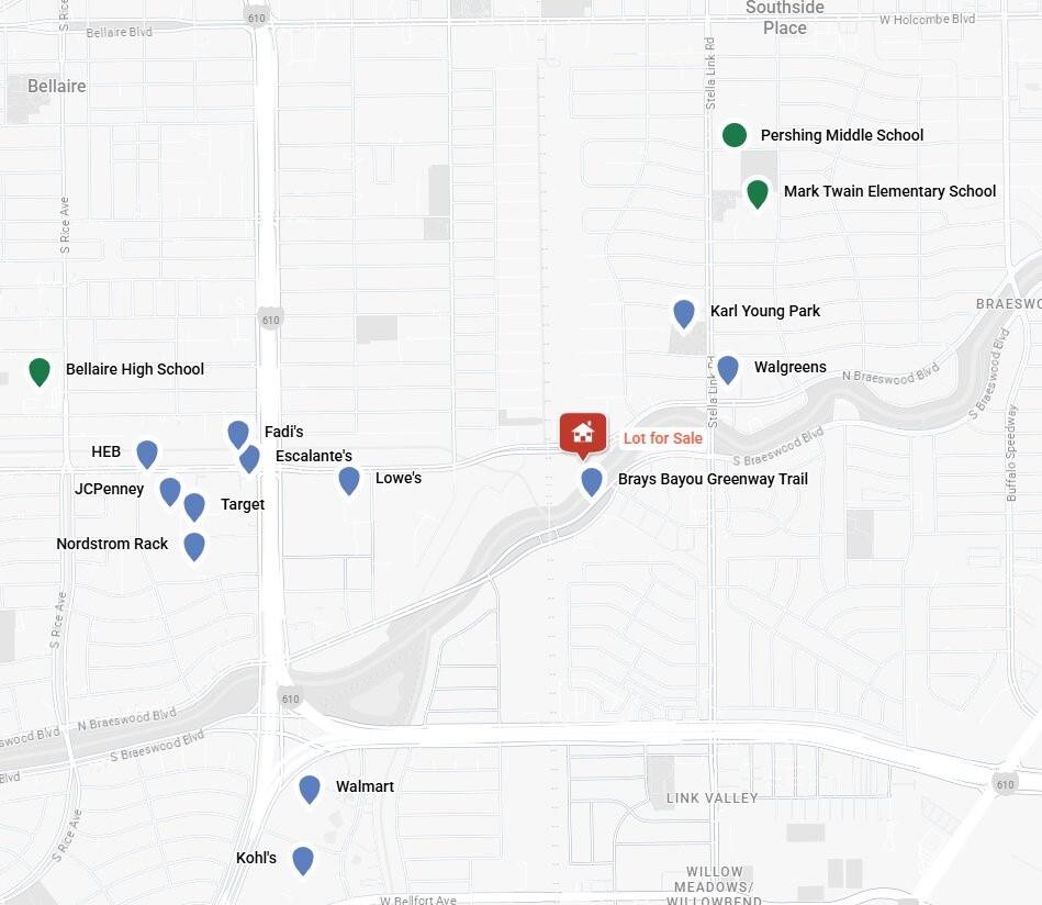 0.29 acre (12,640 sqft) cleared, rough graded lot in coveted Braeswood Place inside the loop! Existing structure was professionally demolished. Bring your architect and builder and break ground immediately!!! LOCATION HIGHLIGHTS: Easy commute to Texas Medical Center, Rice University, Downtown, Galleria, NRG Stadium and more! Direct access to Brays Bayou hike & bike trail. Minutes from retail shopping, restaurants, HEB, Walmart, Lowe's, Walgreens and more! SCHOOL ASSIGNMENTS: Mark Twain International Baccalaureate (IB) Elementary School. Pershing Middle School. Bellaire High School.