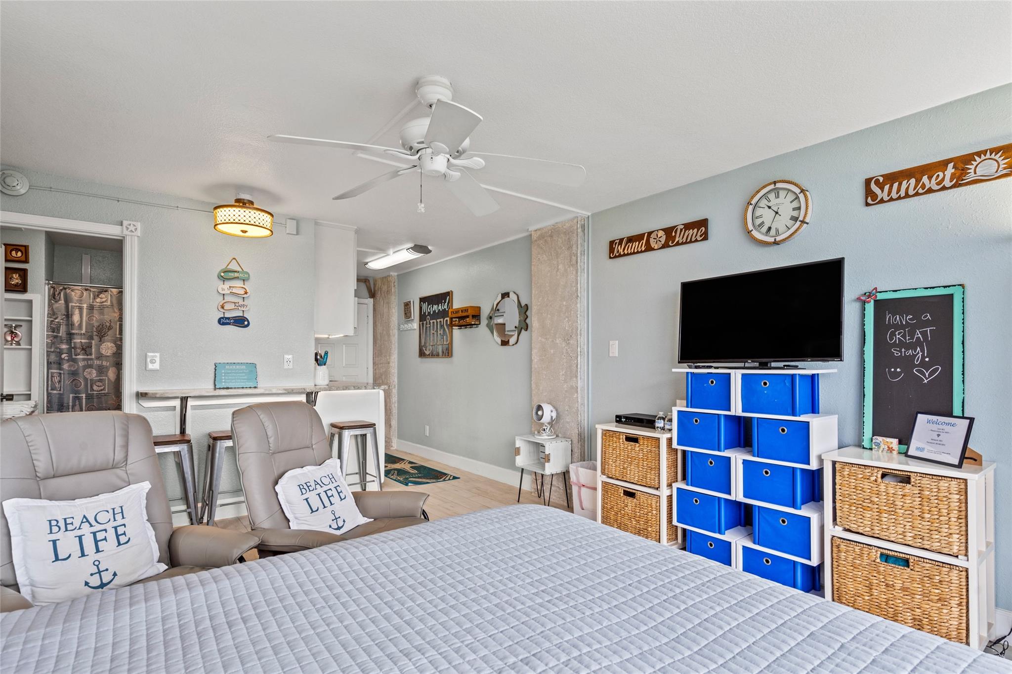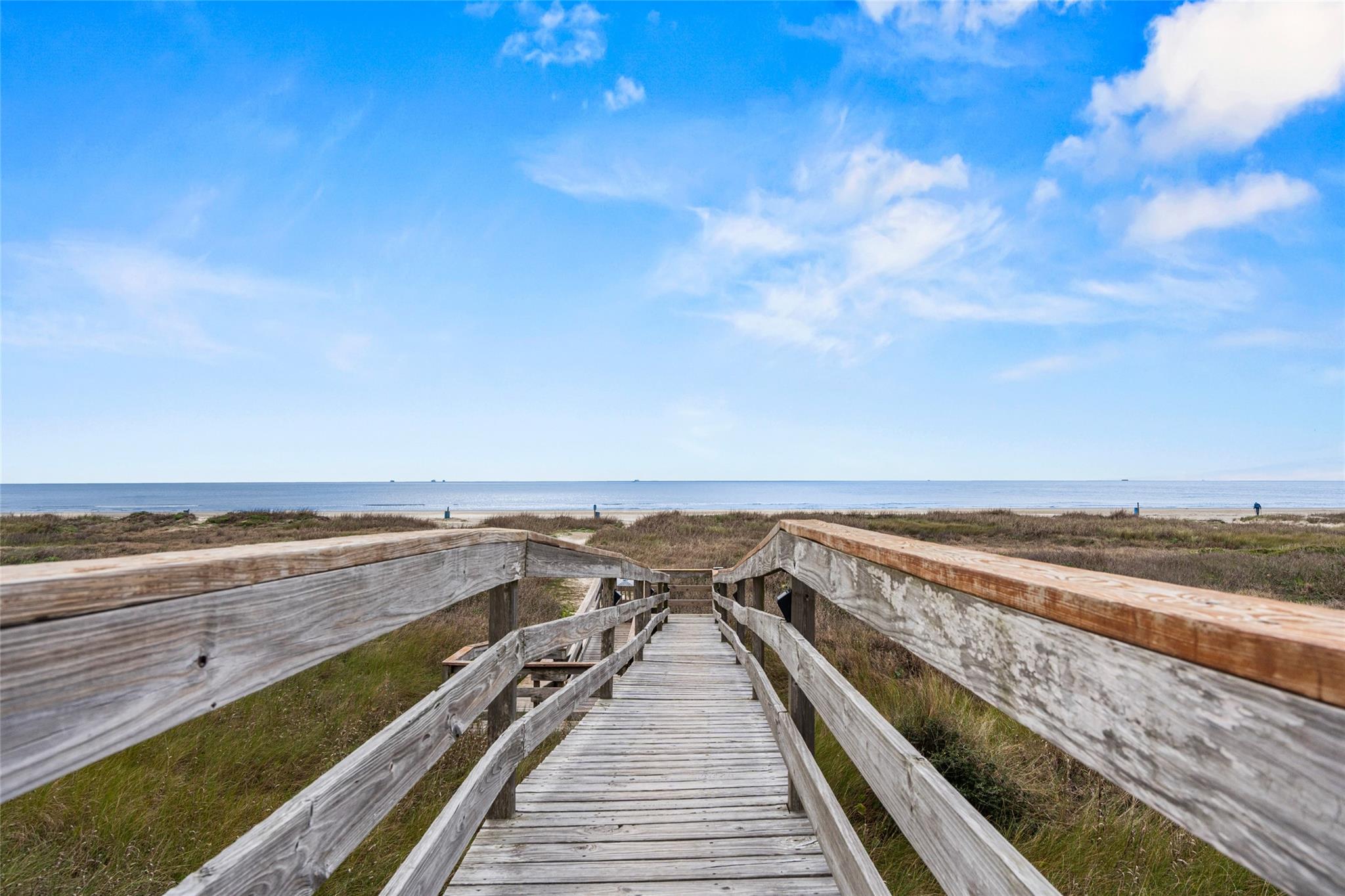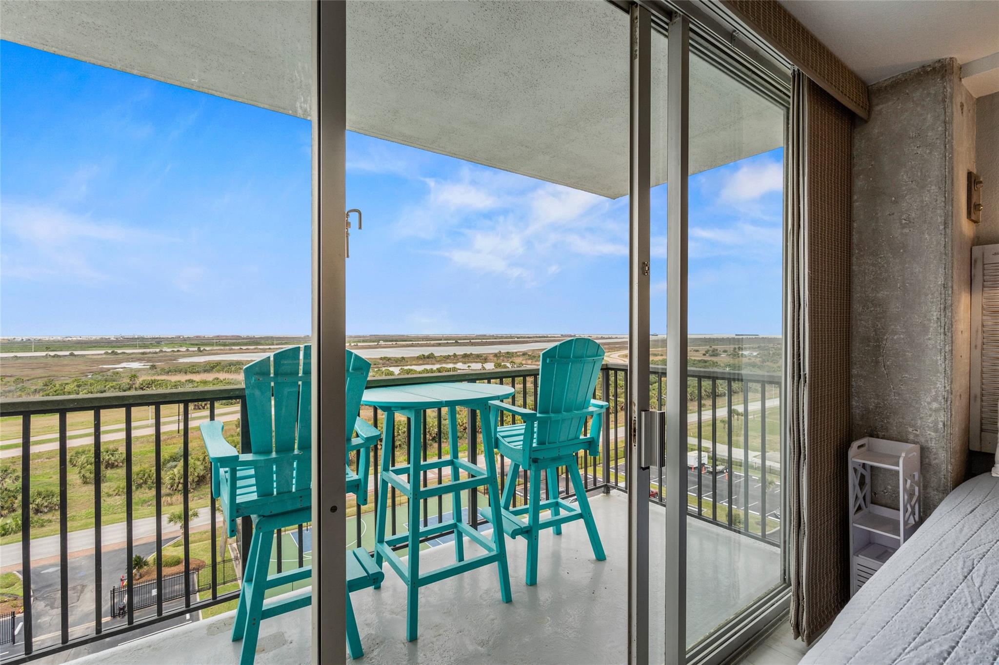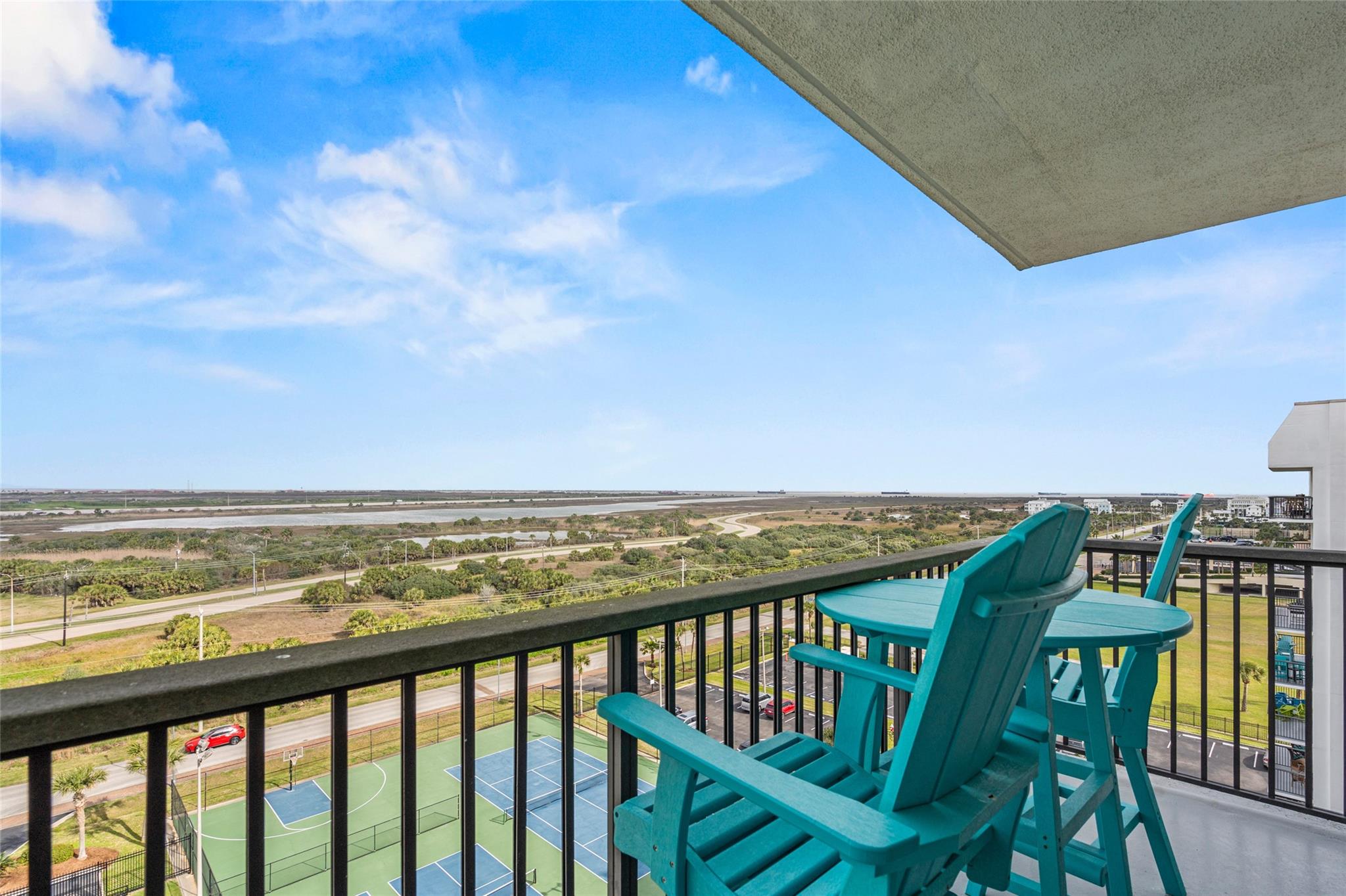 Experience stunning bay views from this 8th-floor bayside condo! Fully remodeled, it features great natural light, exposed concrete columns, as well as upgraded flooring & fixtures. The modern kitchen has a wraparound granite countertop with seating for 4, undercabinet & undercounter accent lighting, & USB outlets. Relax in the comfy swivel recliners or queen-size bed, with custom sun-blocking sliding window shades for privacy. Islander East is a gated beachfront community with a heated pool, newly renovated sports courts, on-site laundry, vending, grills, & night security. Don't miss out on this fully-furnished coastal gem with stunning views of the East End Lagoon, ship channel, bay, & even a glimpse of the Gulf & Pleasure Pier!