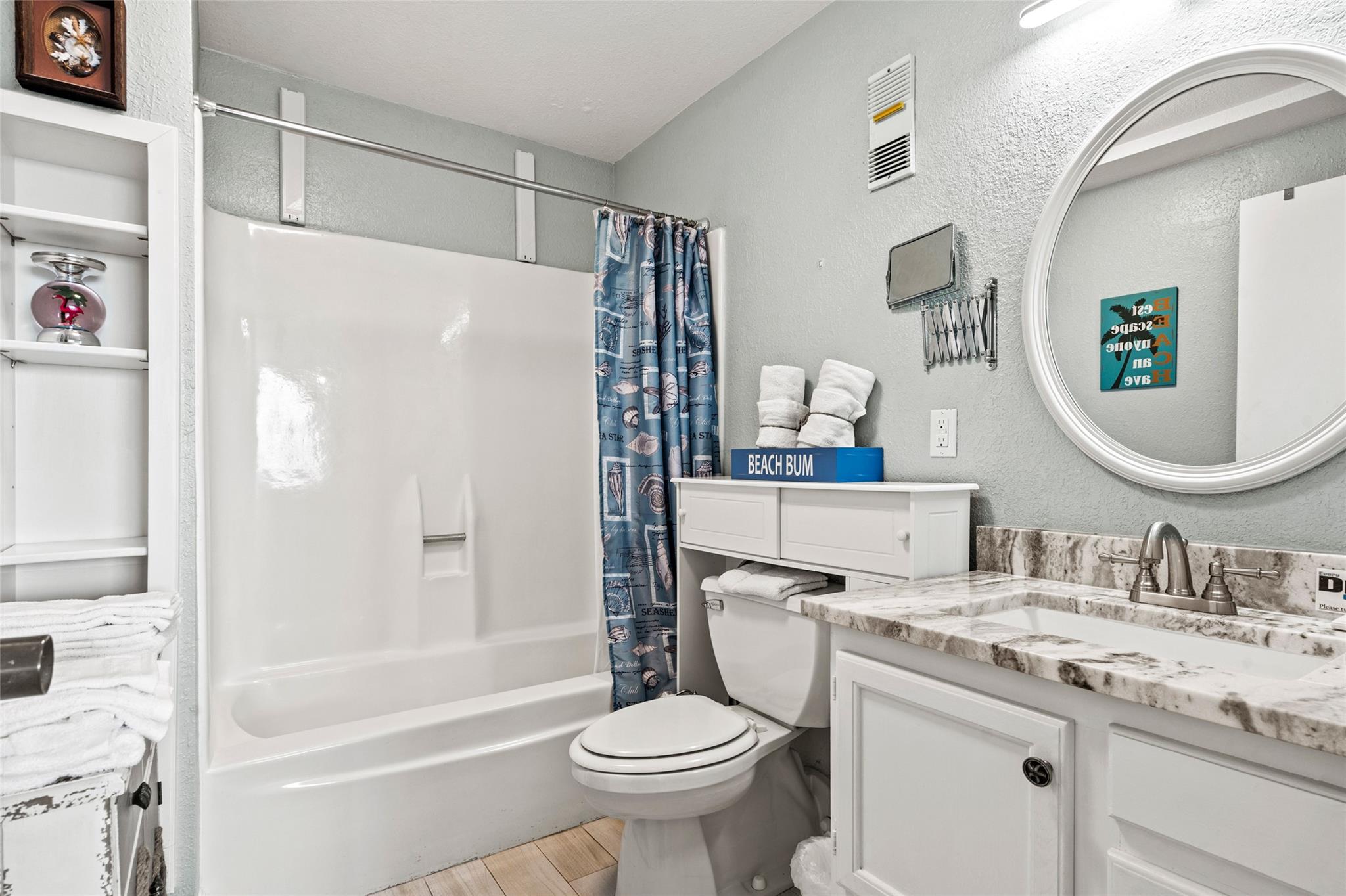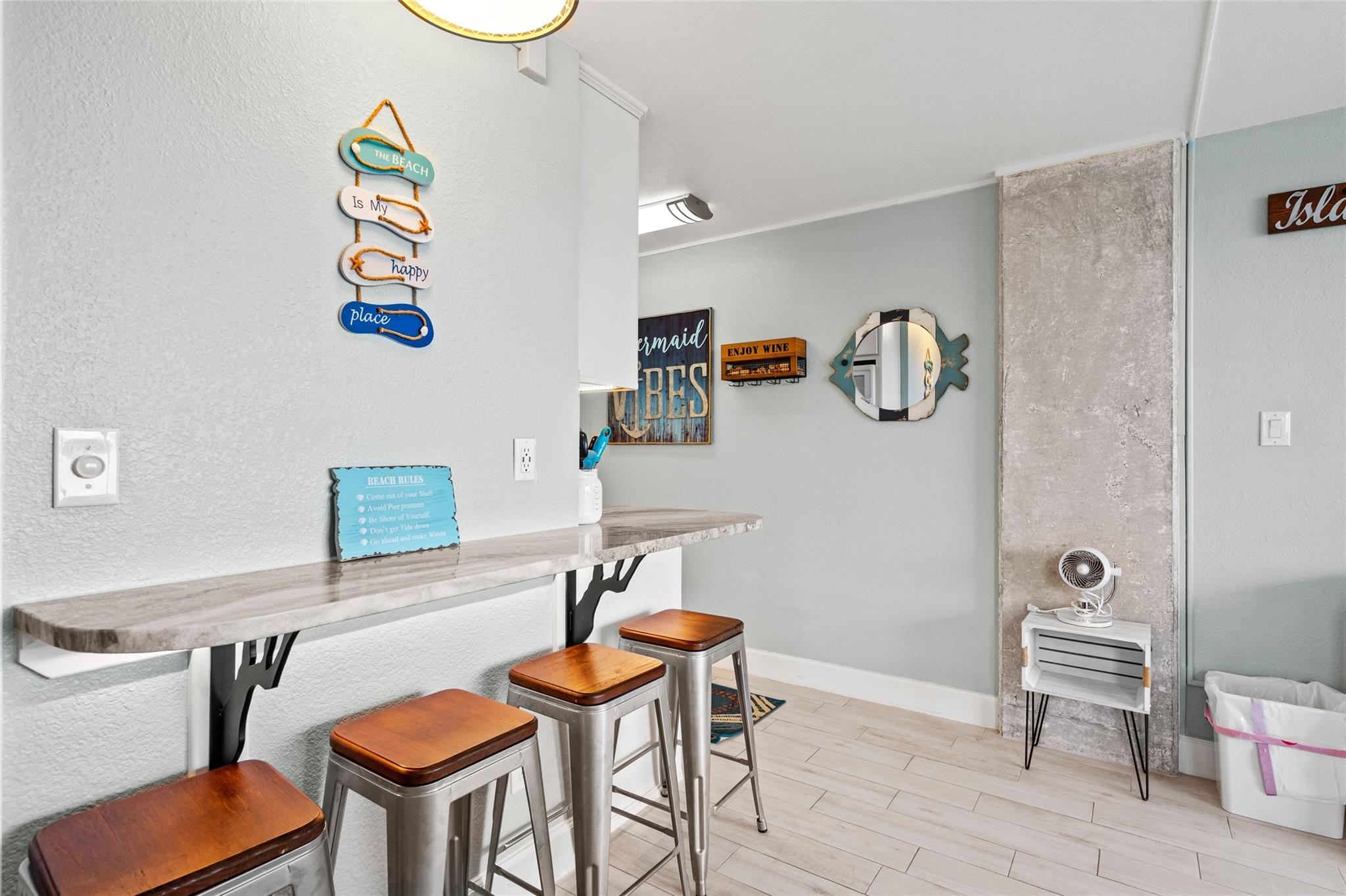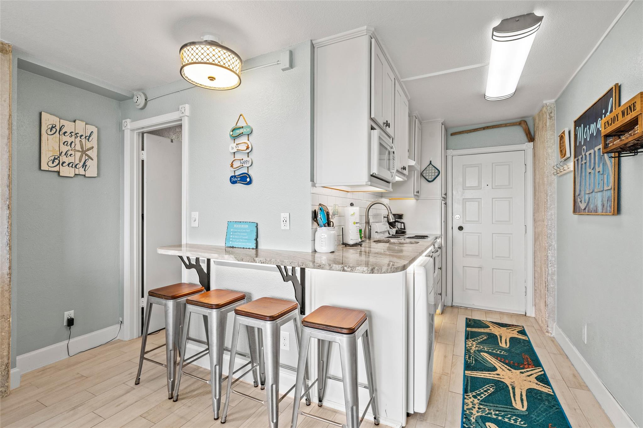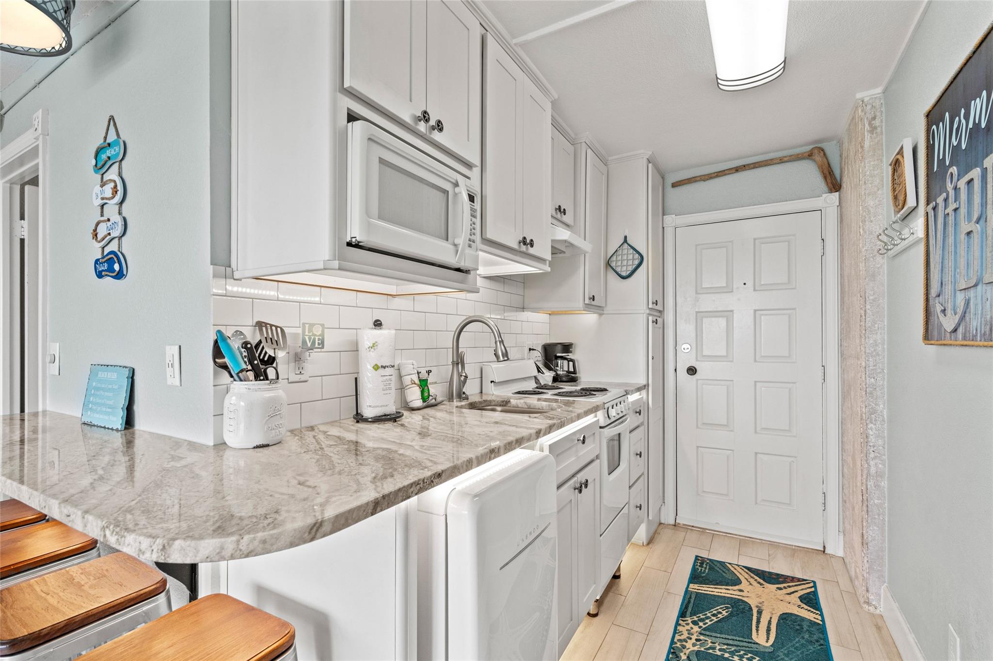 Experience stunning bay views from this 8th-floor bayside condo! Fully remodeled, it features great natural light, exposed concrete columns, as well as upgraded flooring & fixtures. The modern kitchen has a wraparound granite countertop with seating for 4, undercabinet & undercounter accent lighting, & USB outlets. Relax in the comfy swivel recliners or queen-size bed, with custom sun-blocking sliding window shades for privacy. Islander East is a gated beachfront community with a heated pool, newly renovated sports courts, on-site laundry, vending, grills, & night security. Don't miss out on this fully-furnished coastal gem with stunning views of the East End Lagoon, ship channel, bay, & even a glimpse of the Gulf & Pleasure Pier!