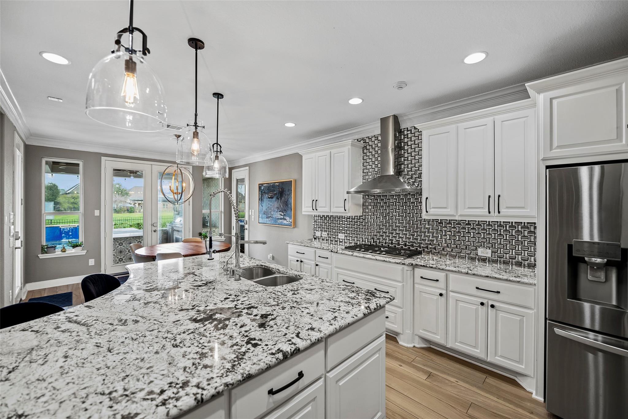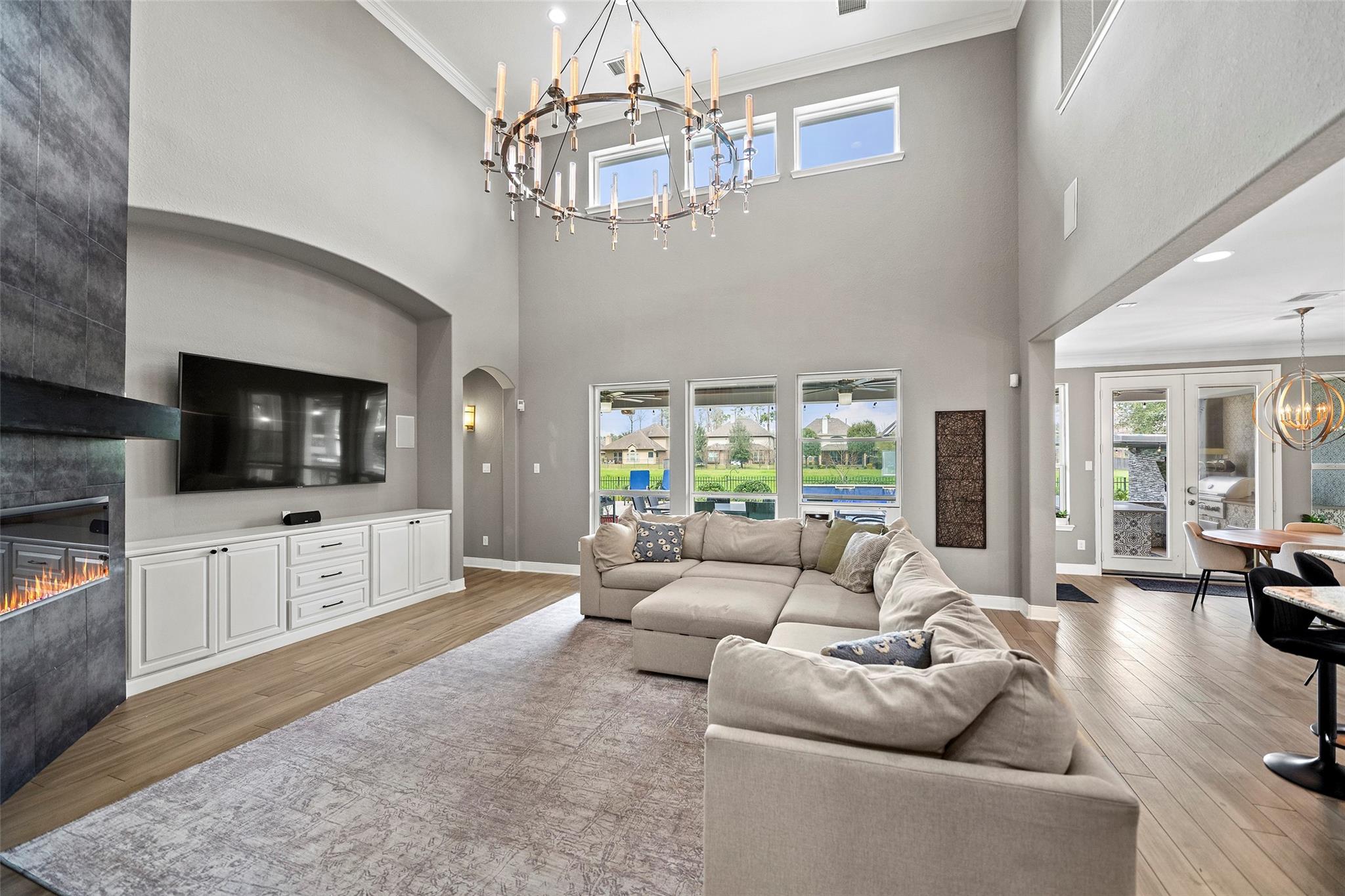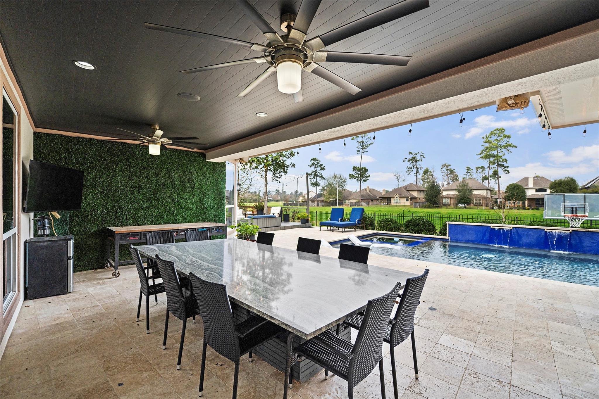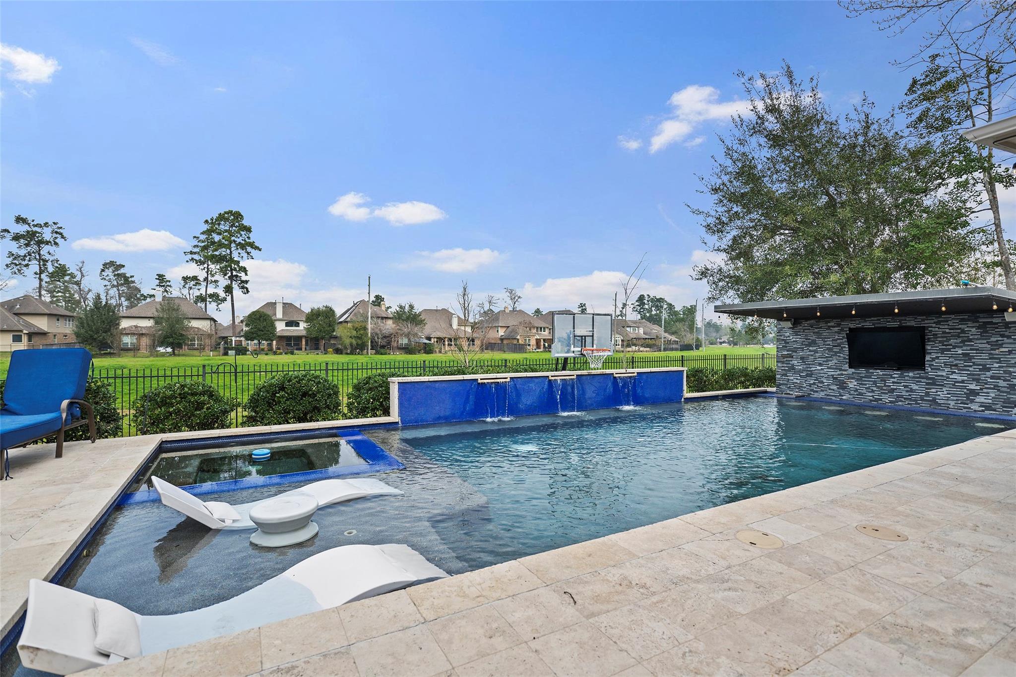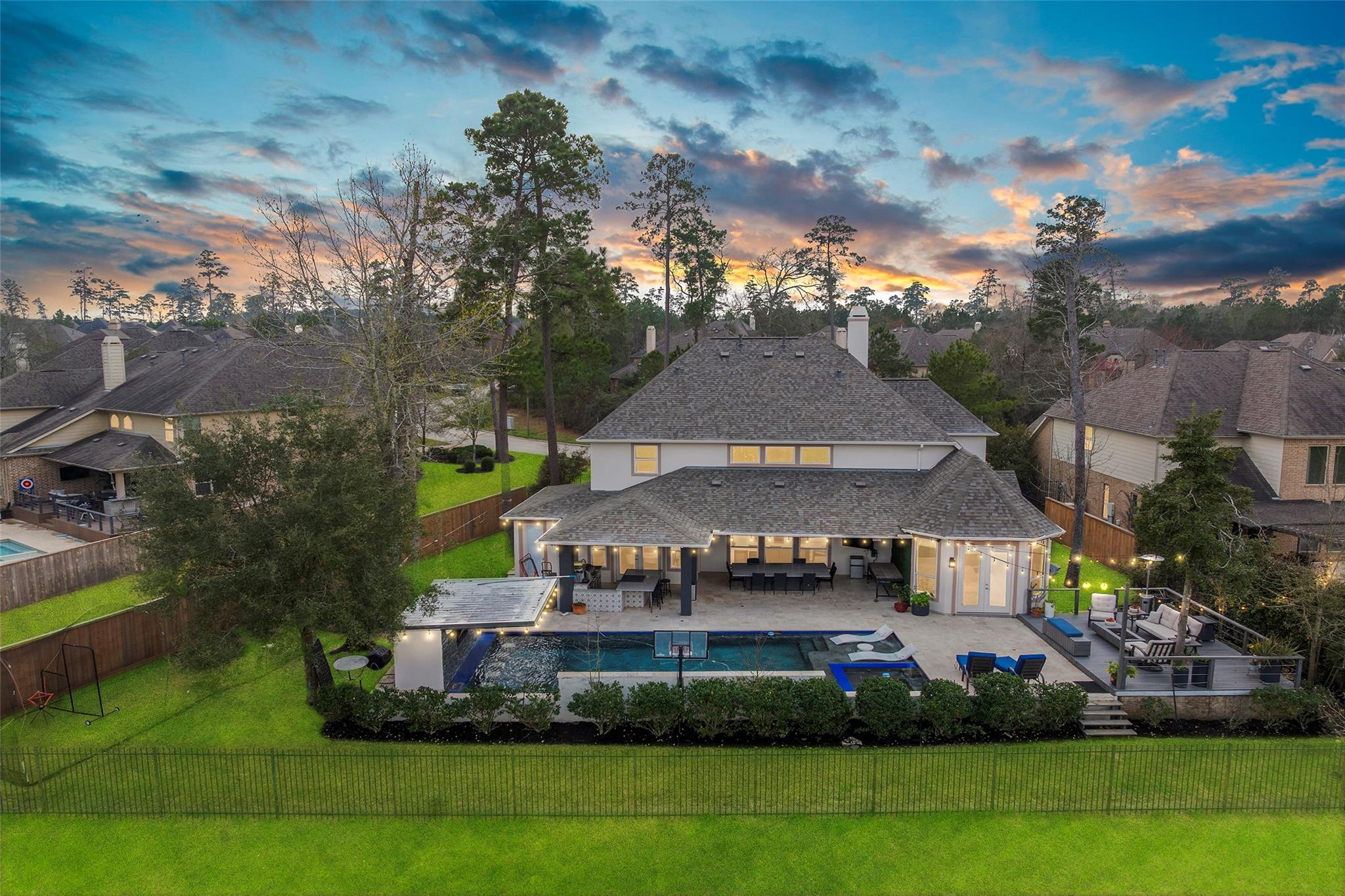 Gorgeous 2-story J. Patrick Home nestled on a greenbelt lot in Creekside West in The Woodlands! A charming gated courtyard welcomes you into a grand two-story entry flanked by a private study and elegant formal dining room. Soaring ceilings, abundant natural light, and crown molding highlight the open, entertainer’s floor plan. The spacious island kitchen features granite countertops, classic white cabinetry, stainless appliances, and flows seamlessly into the main living area. Offering 4–5 bedrooms (2 down), 5 full baths and 1 half bath, this home includes a serene primary suite with vaulted ceiling and spa-like bath with dual vanities, glass-enclosed shower, and freestanding tub. Upstairs boasts secondary bedrooms, media room, and game room, plus a Texas basement for added storage. Backyard retreat w/NO REAR NEIGHBORS features a covered patio with outdoor kitchen, raised deck, sparkling pool and spa, outdoor fireplace, and 340 sq ft guest quarters over the 3-car garage.