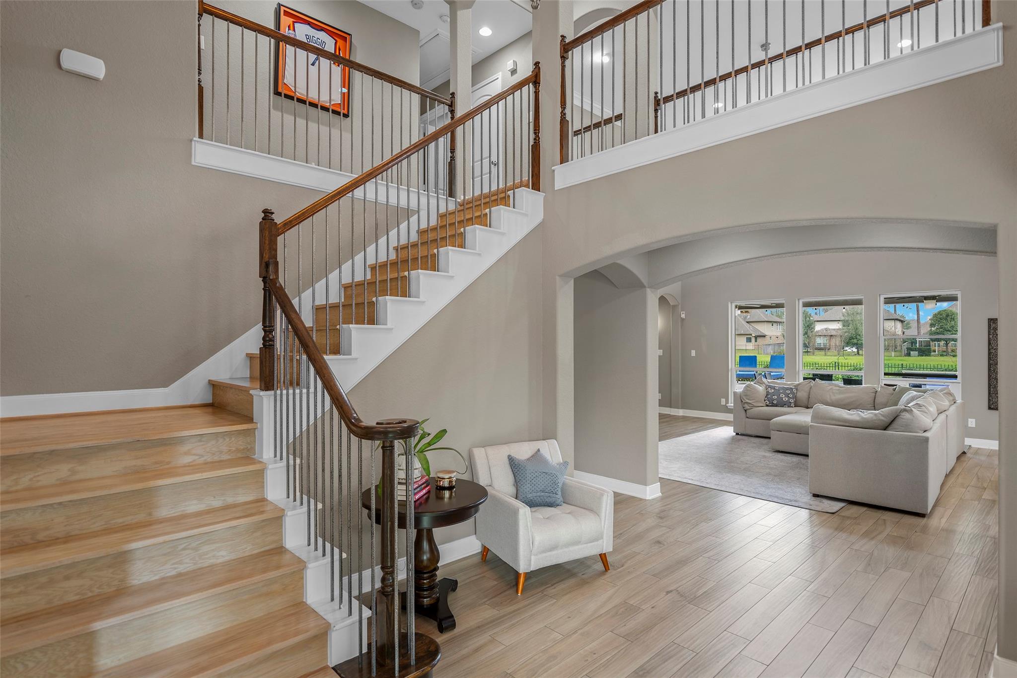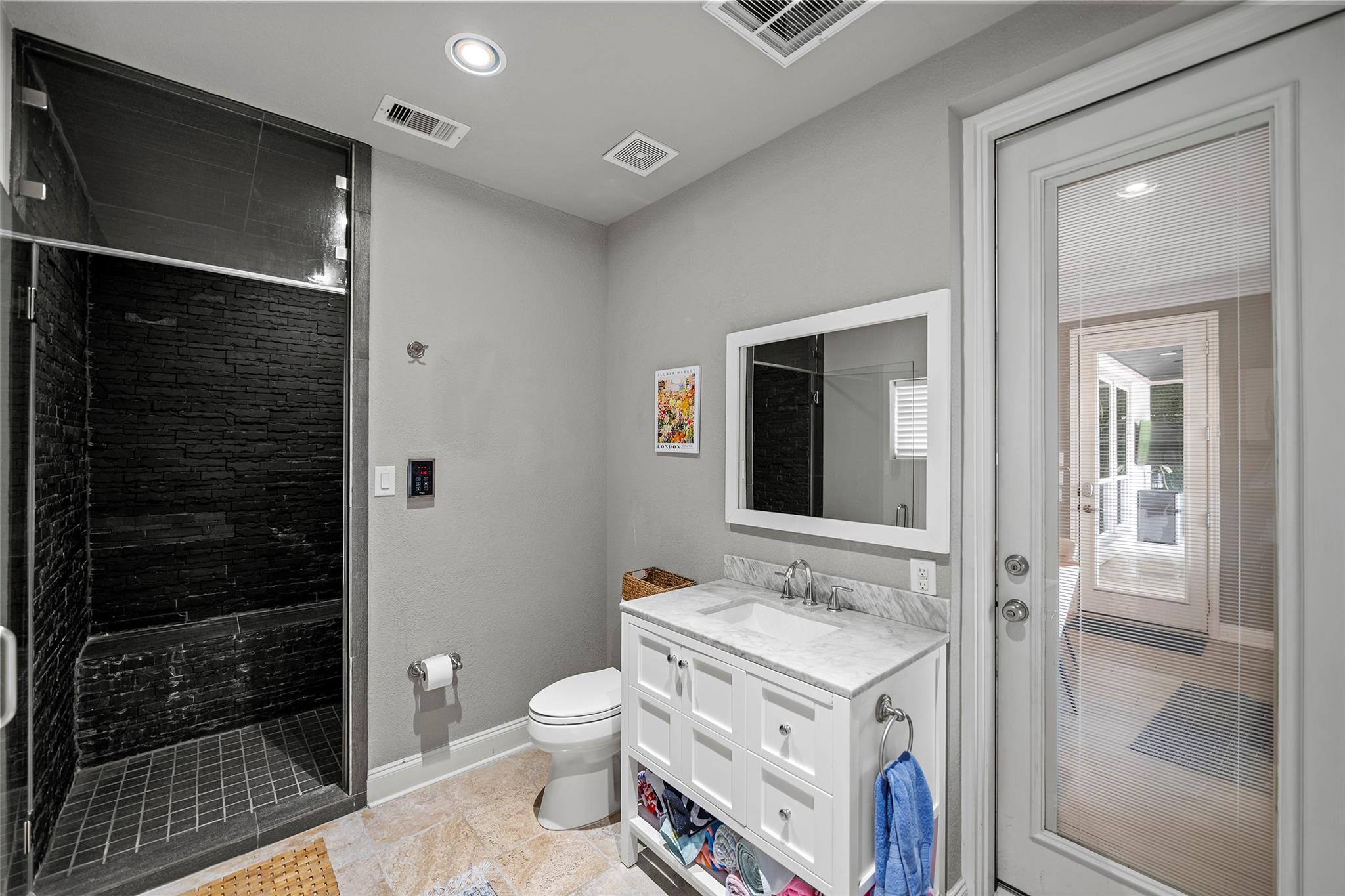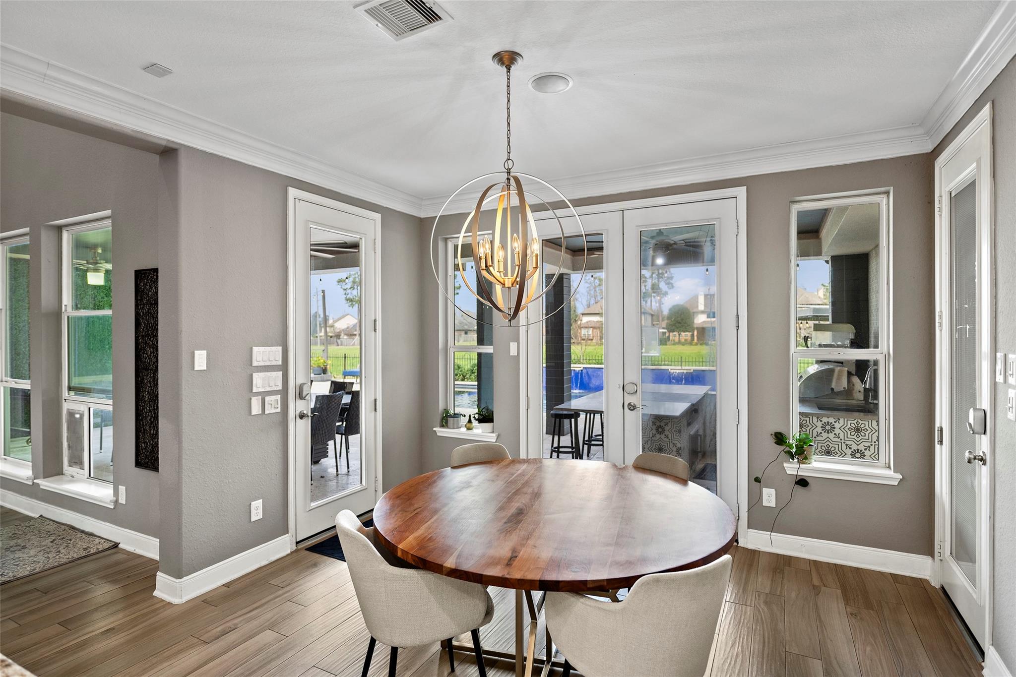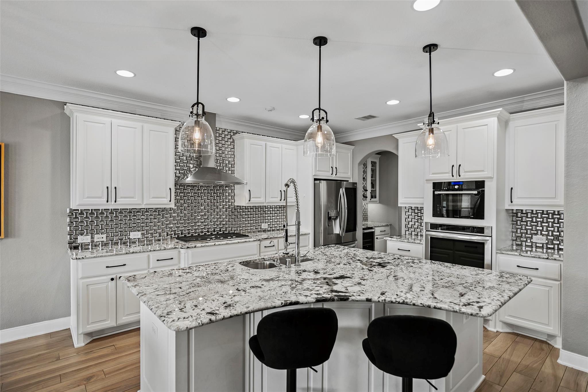 Gorgeous 2-story J. Patrick Home nestled on a greenbelt lot in Creekside West in The Woodlands! A charming gated courtyard welcomes you into a grand two-story entry flanked by a private study and elegant formal dining room. Soaring ceilings, abundant natural light, and crown molding highlight the open, entertainer’s floor plan. The spacious island kitchen features granite countertops, classic white cabinetry, stainless appliances, and flows seamlessly into the main living area. Offering 4–5 bedrooms (2 down), 5 full baths and 1 half bath, this home includes a serene primary suite with vaulted ceiling and spa-like bath with dual vanities, glass-enclosed shower, and freestanding tub. Upstairs boasts secondary bedrooms, media room, and game room, plus a Texas basement for added storage. Backyard retreat w/NO REAR NEIGHBORS features a covered patio with outdoor kitchen, raised deck, sparkling pool and spa, outdoor fireplace, and 340 sq ft guest quarters over the 3-car garage.