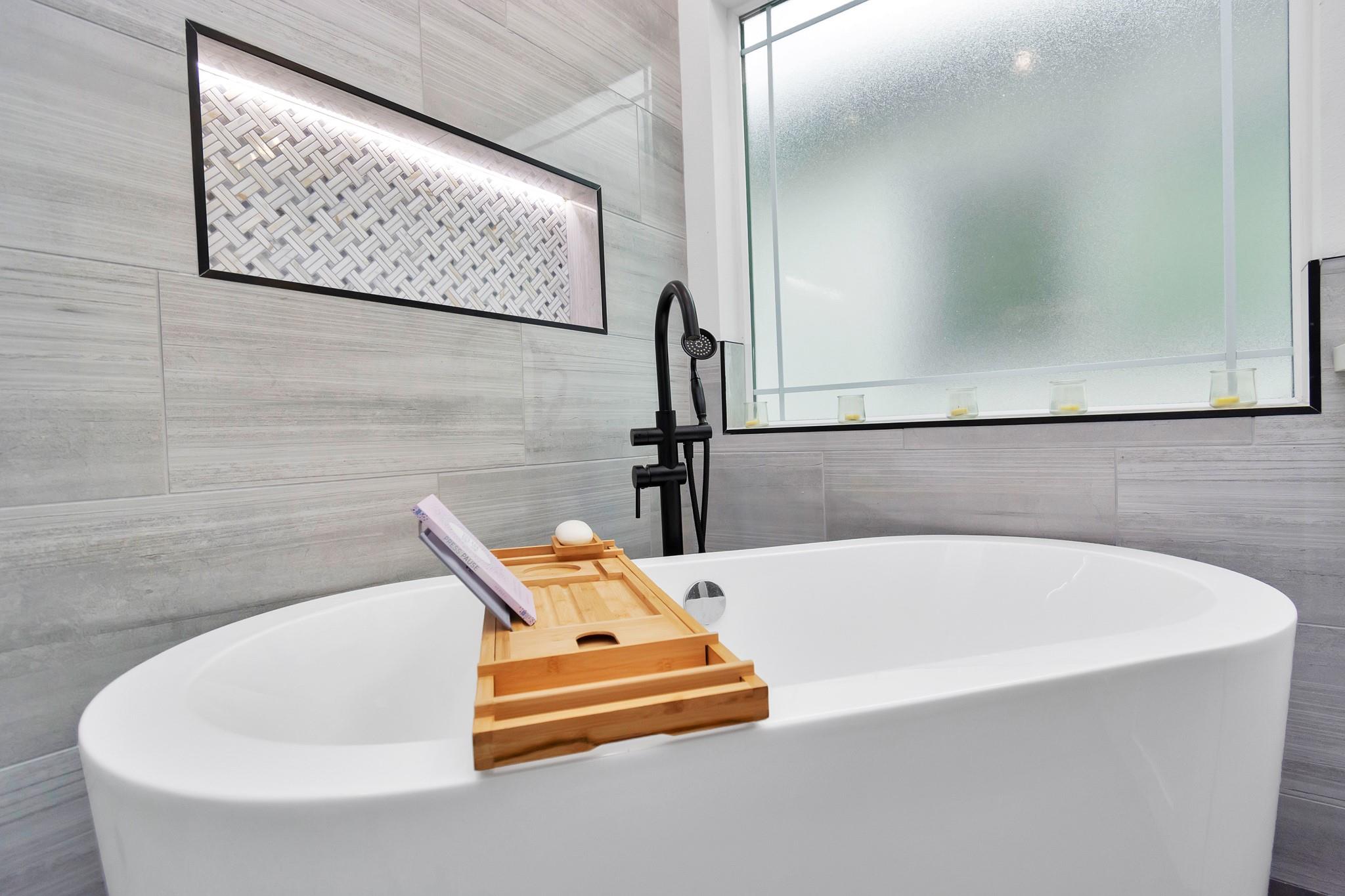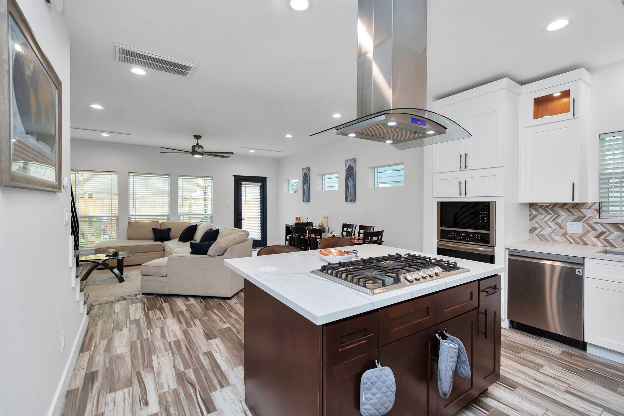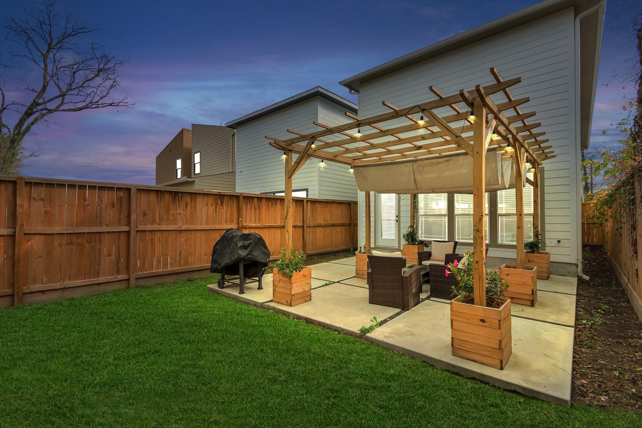 /monthALL APPLIANCES INCLUDED. Ask about monthly rate for FULLY FURNISHED. Modern open-concept living, dining, and kitchen area with quartz countertops, stove on island counter, herringbone backsplash, ample cabinets, and recessed lighting. The primary bedroom features walk-in closets with custom shelves, built-in drawers, and French doors to a private balcony. The primary bath includes a soaking tub, dual vanities, and enclosed shower. Backyard patio offers a wooden pergola, outdoor seating, covered grill, and fenced lawn.