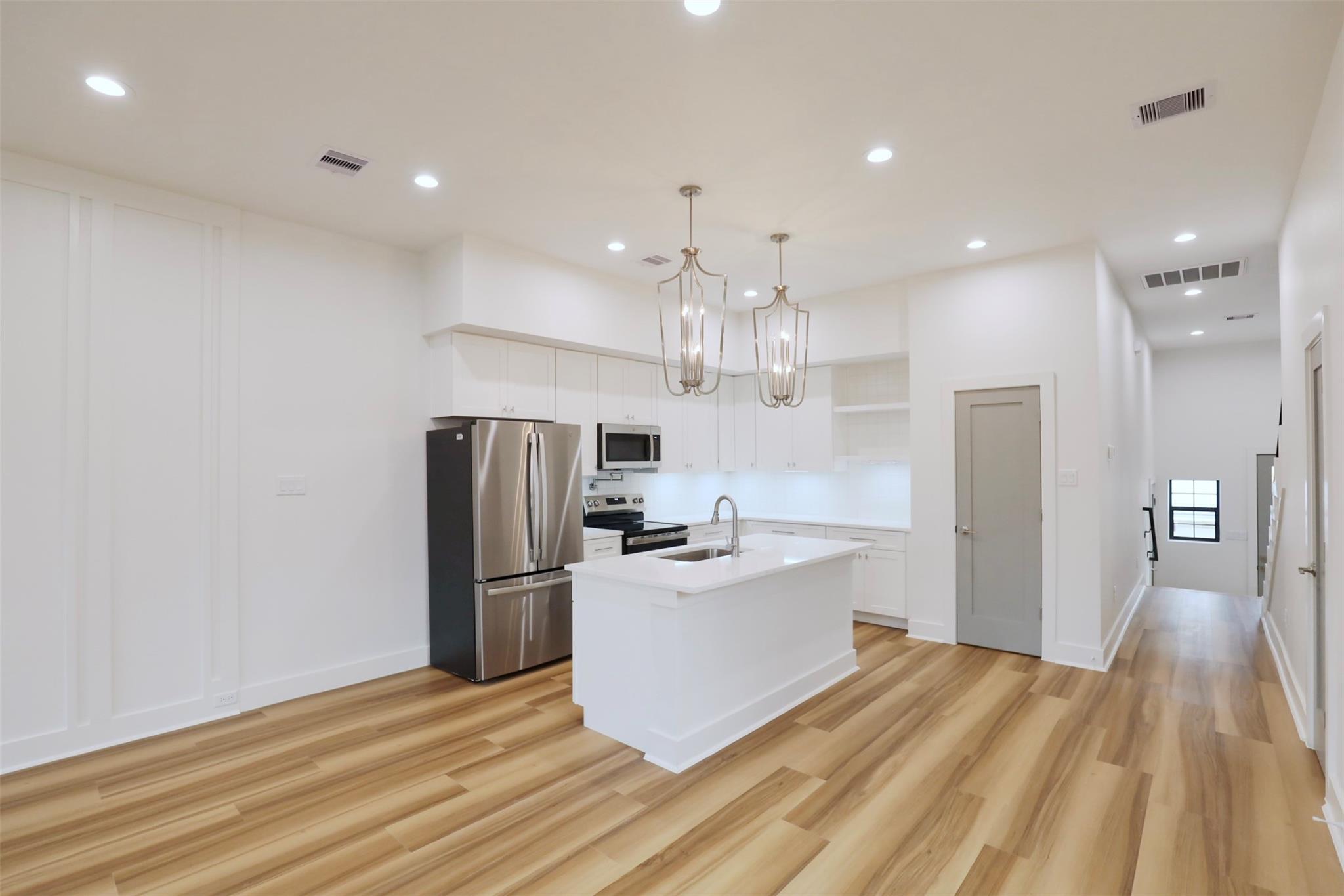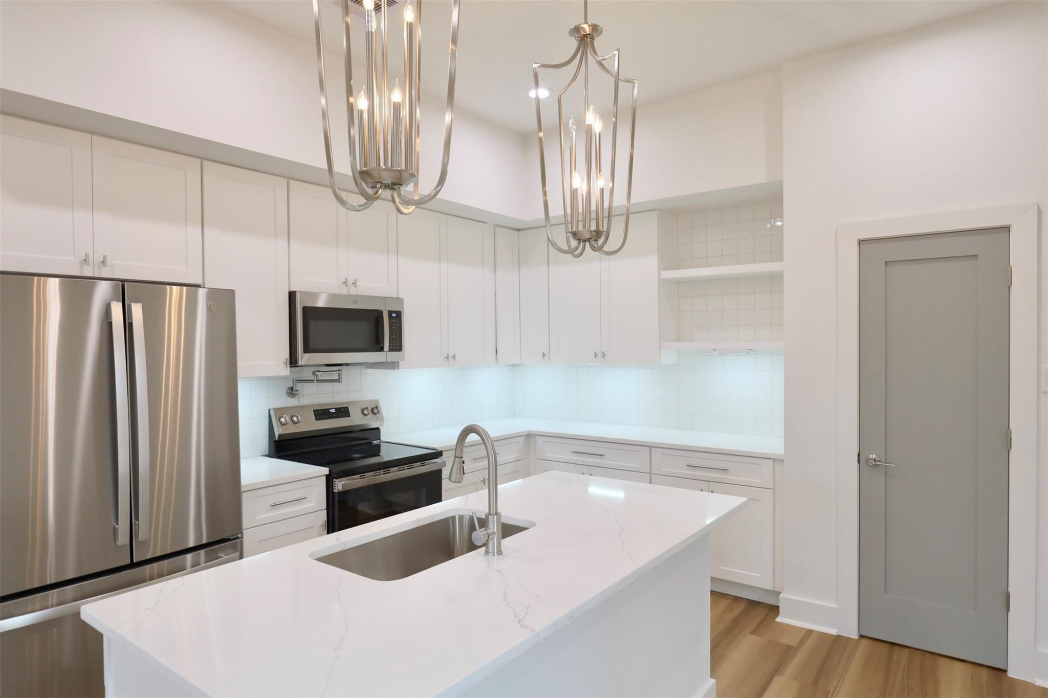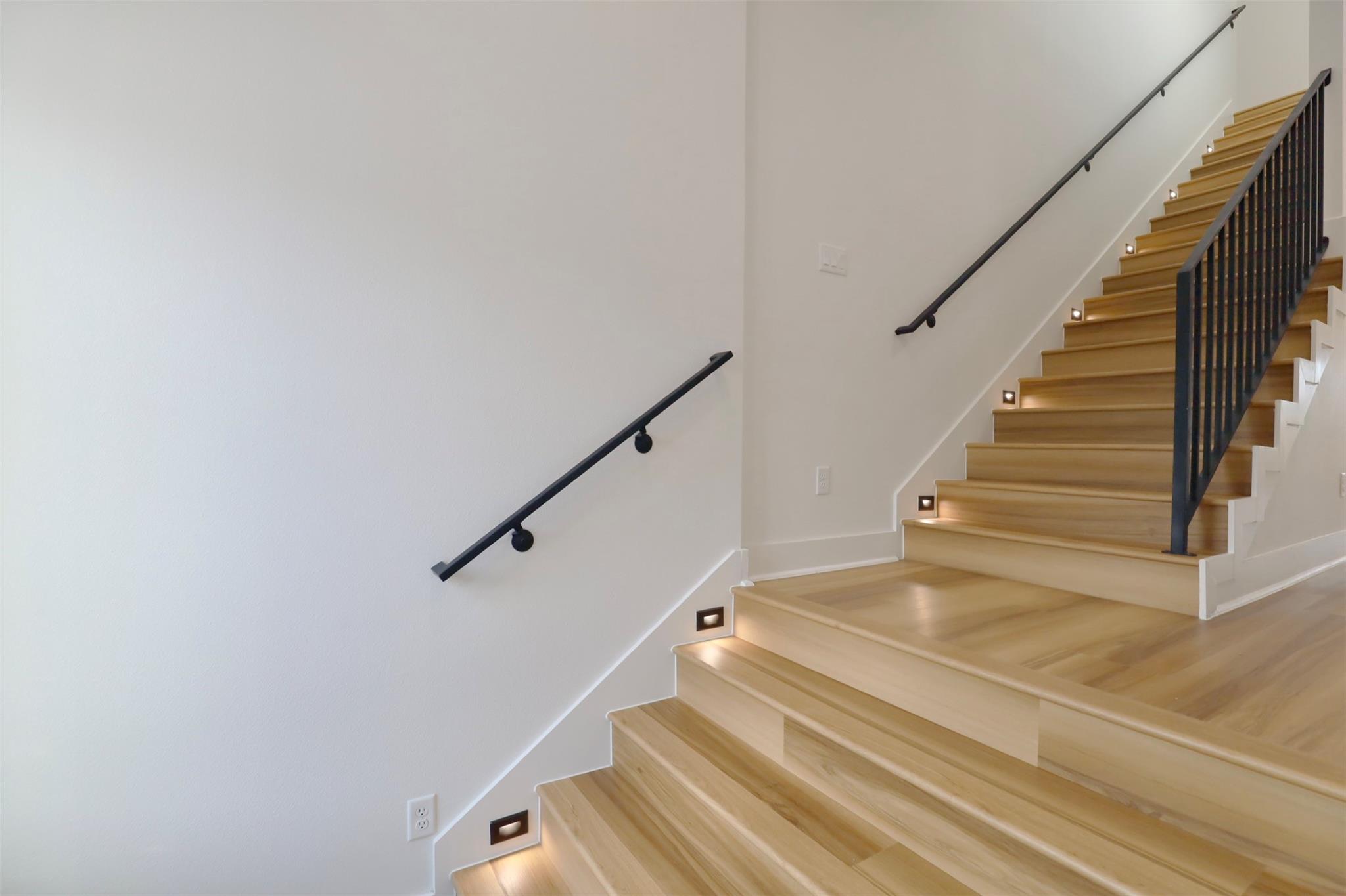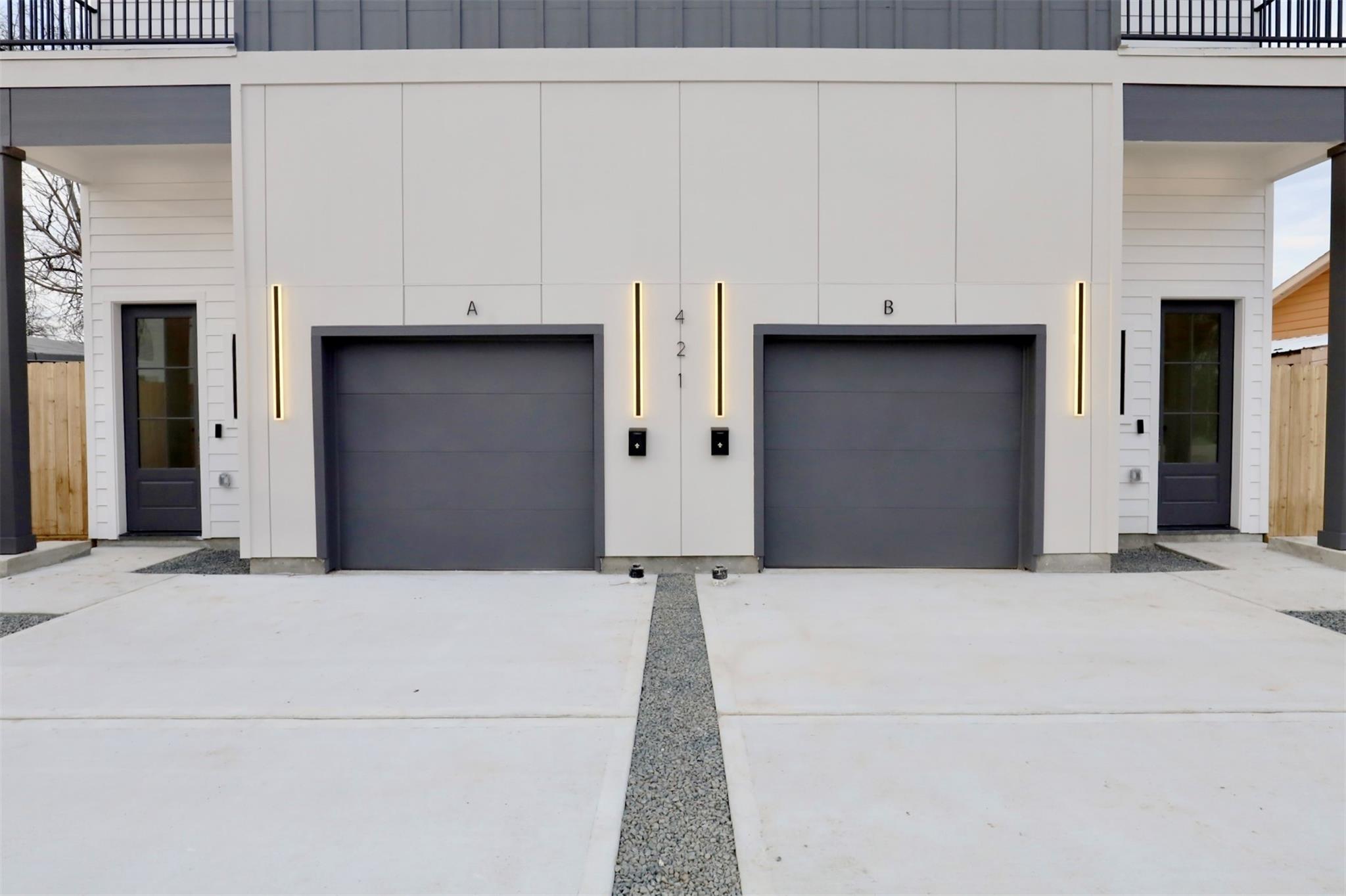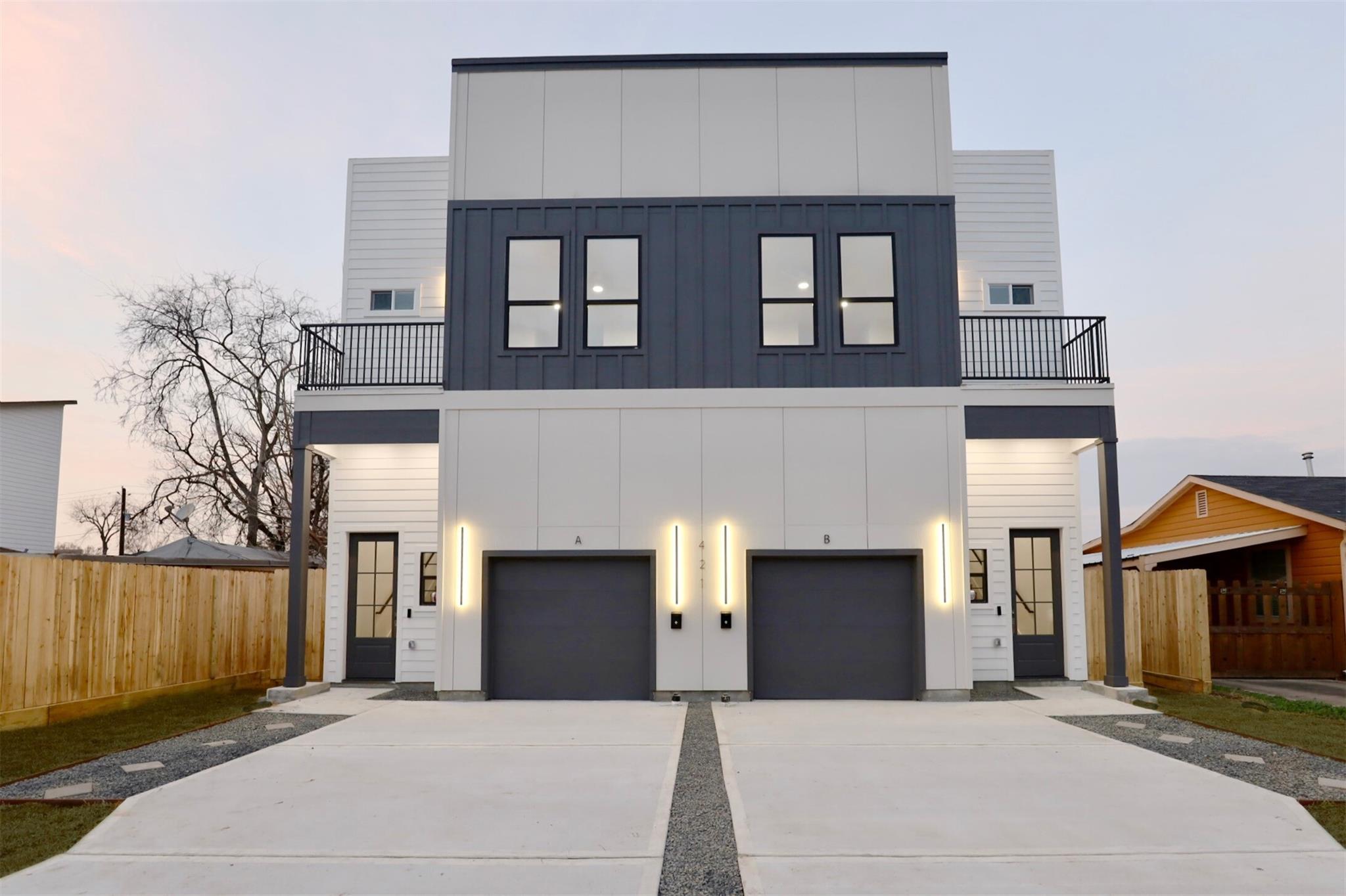 Pannu Homes & Arterno Duplex Collection: Bold modern architecture featuring a refined 3-color exterior palette of crisp white, deep charcoal, and warm accents. Situated on a rapidly developing street, the exterior is highlighted by modern light fixtures with complementary soffit lighting around the perimeter, creating striking curb appeal and functionality. Each home offers a private two-car garage, wide driveway, and elevated design details.Inside, delivers 10-ft ceilings and 8-ft grey satin painted accent doors enhancing the open, airy feel. The kitchen features a pot filler, sleek cabinetry, and dramatic counter-to-ceiling backsplash tile paired with under-cabinet lighting+ outlets.High-efficiency Trane AC providing comfort during Houston summers. Stair-step lighting adds a radiant glow, and a custom accent wall brings elegance to the living area. The primary suite features a private balcony, while the spacious backyard is ideal for entertaining or relaxing.