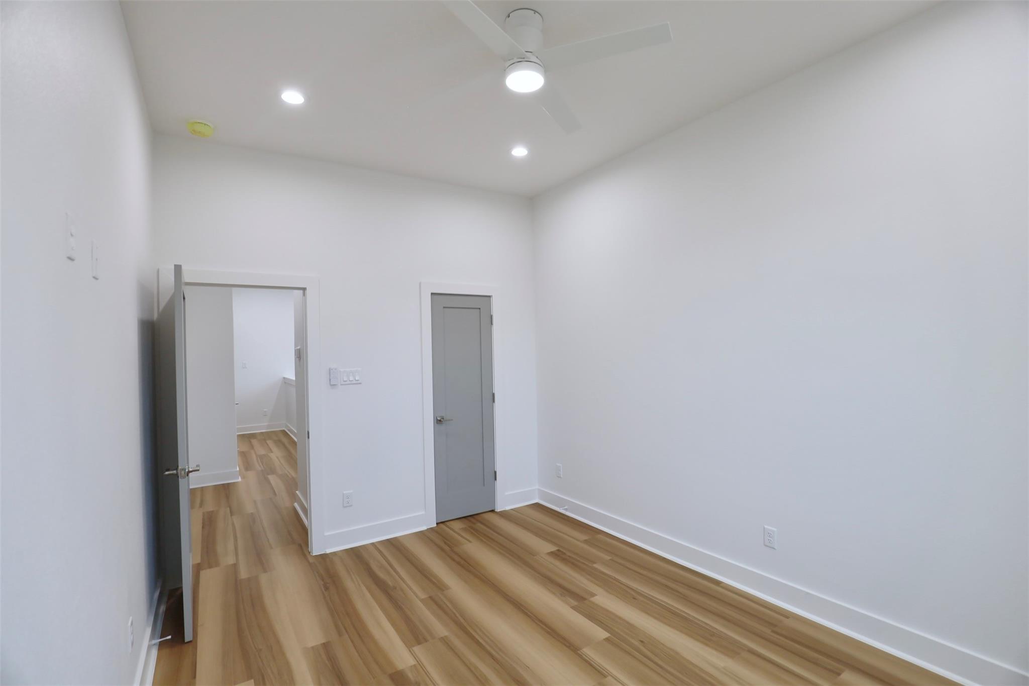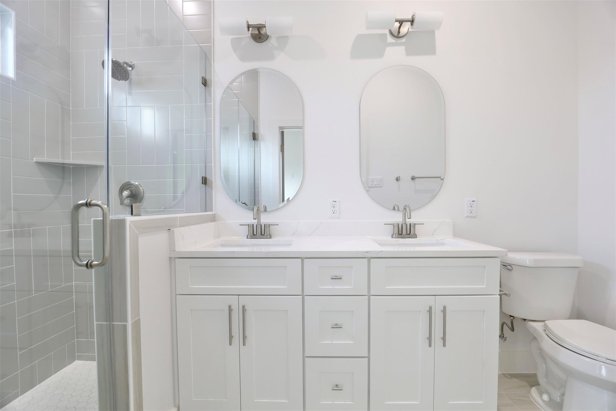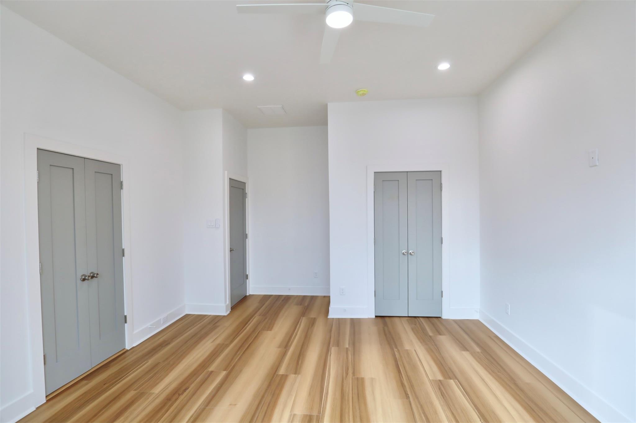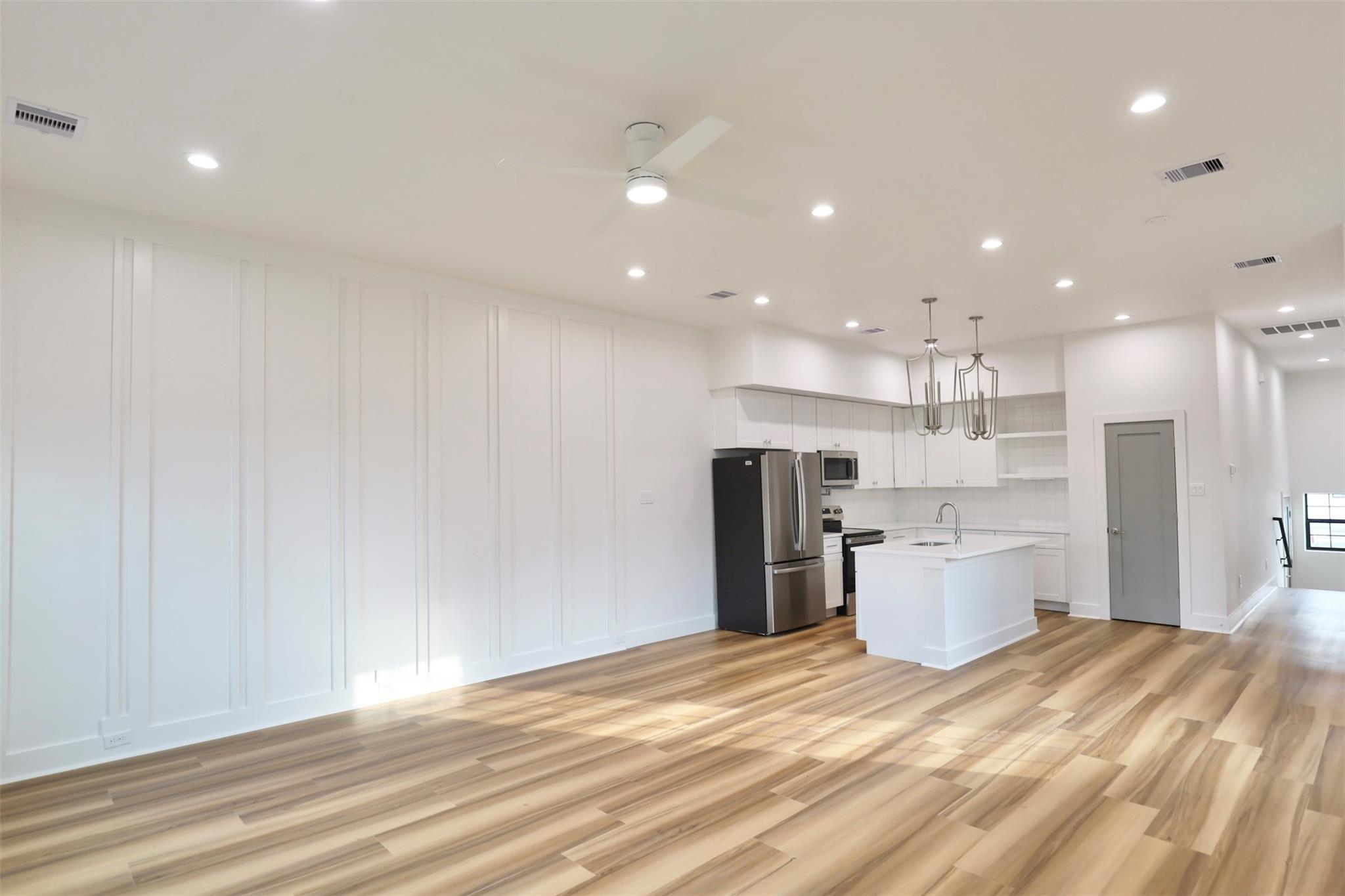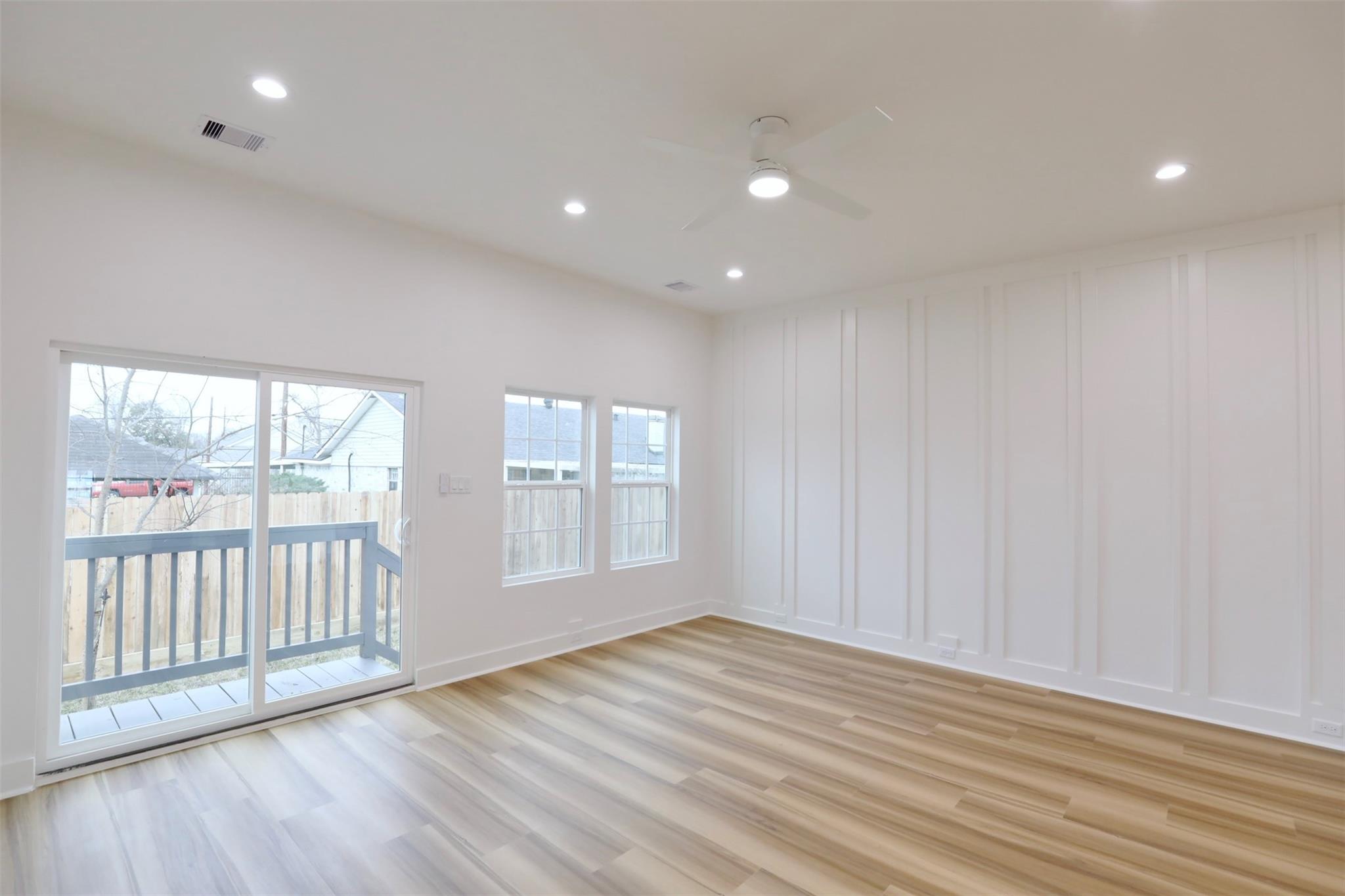 Pannu Homes & Arterno Duplex Collection: Bold modern architecture featuring a refined 3-color exterior palette of crisp white, deep charcoal, and warm accents. Situated on a rapidly developing street, the exterior is highlighted by modern light fixtures with complementary soffit lighting around the perimeter, creating striking curb appeal and functionality. Each home offers a private two-car garage, wide driveway, and elevated design details.Inside, delivers 10-ft ceilings and 8-ft grey satin painted accent doors enhancing the open, airy feel. The kitchen features a pot filler, sleek cabinetry, and dramatic counter-to-ceiling backsplash tile paired with under-cabinet lighting+ outlets.High-efficiency Trane AC providing comfort during Houston summers. Stair-step lighting adds a radiant glow, and a custom accent wall brings elegance to the living area. The primary suite features a private balcony, while the spacious backyard is ideal for entertaining or relaxing.