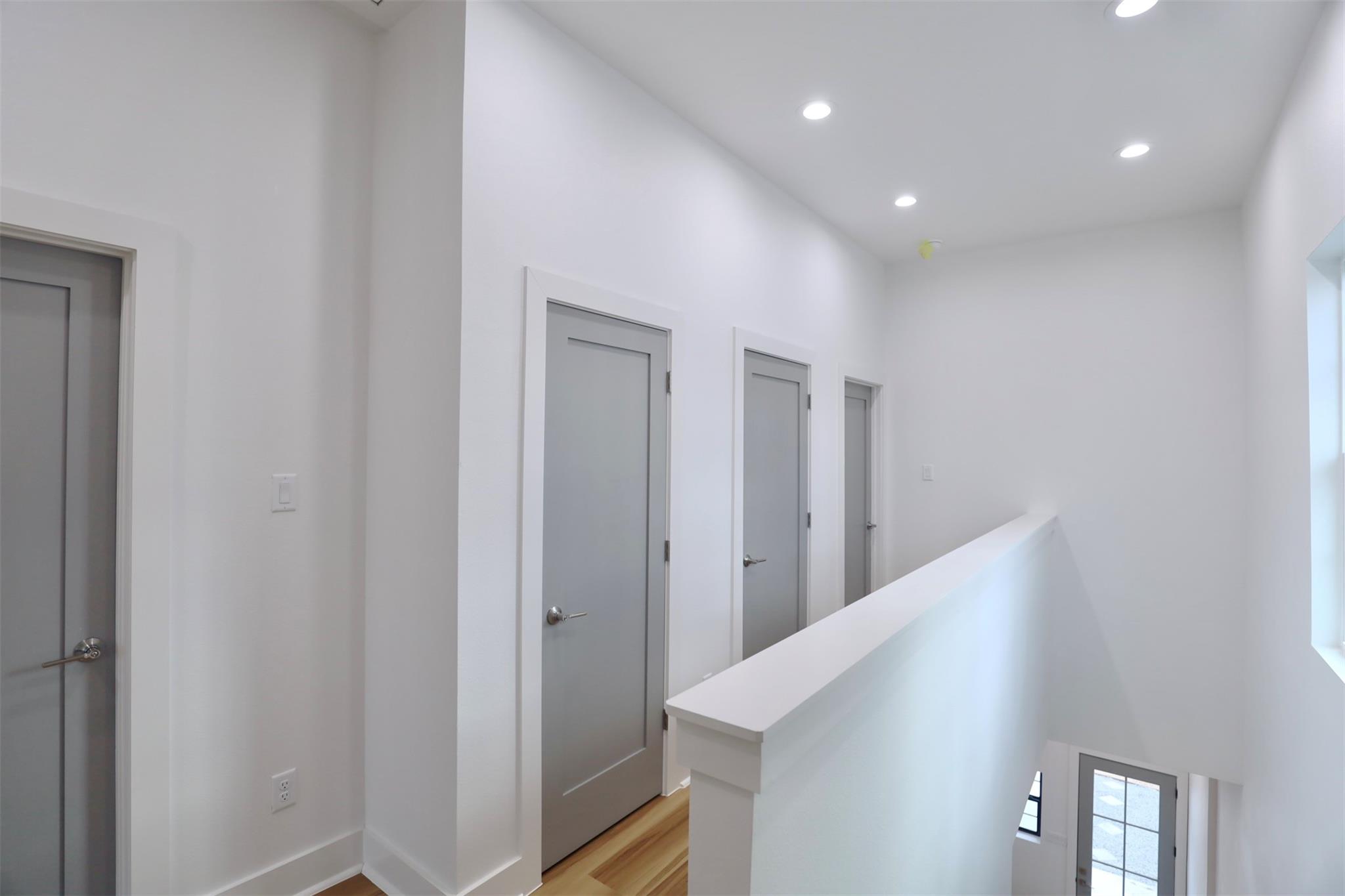 Pannu Homes & Arterno Duplex Collection: Bold modern architecture featuring a refined 3-color exterior palette of crisp white, deep charcoal, and warm accents. Situated on a rapidly developing street, the exterior is highlighted by modern light fixtures with complementary soffit lighting around the perimeter, creating striking curb appeal and functionality. Each home offers a private two-car garage, wide driveway, and elevated design details.Inside, delivers 10-ft ceilings and 8-ft grey satin painted accent doors enhancing the open, airy feel. The kitchen features a pot filler, sleek cabinetry, and dramatic counter-to-ceiling backsplash tile paired with under-cabinet lighting+ outlets.High-efficiency Trane AC providing comfort during Houston summers. Stair-step lighting adds a radiant glow, and a custom accent wall brings elegance to the living area. The primary suite features a private balcony, while the spacious backyard is ideal for entertaining or relaxing.