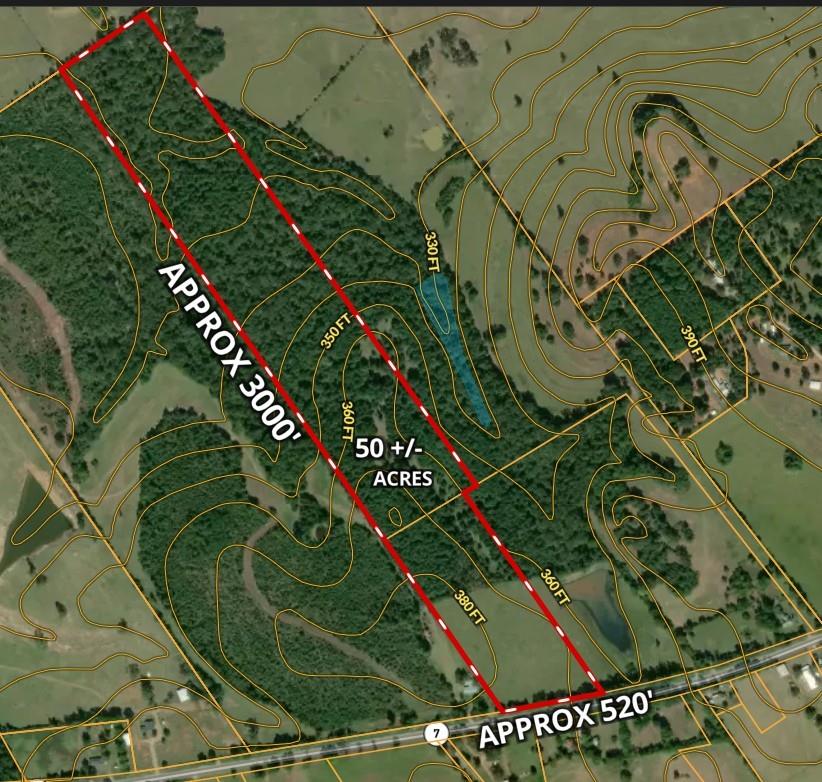 50 +/- unrestricted acres, located 5 minutes west of Crocket. This beautiful property has approx. 520' of frontage along Hwy 7. There's approx. 60' of elevation change with beautiful views and several homesites and development opportunities. Property includes a pretty 8-acre hayfield, a nice ratio of open to wooded acreage, mixed species of timber & sandy loam soils. Unrestricted & Ag exempt opportunity for development, homestead, farming, ranching, wildlife, timber, recreational use or whatever one desires. Community water & electricity available. Great location, 30 min to I-45, 60 min to Huntsville, 2 hours to Houston or Dallas! Texas A&M, Sam Houston & Angelina universities close!