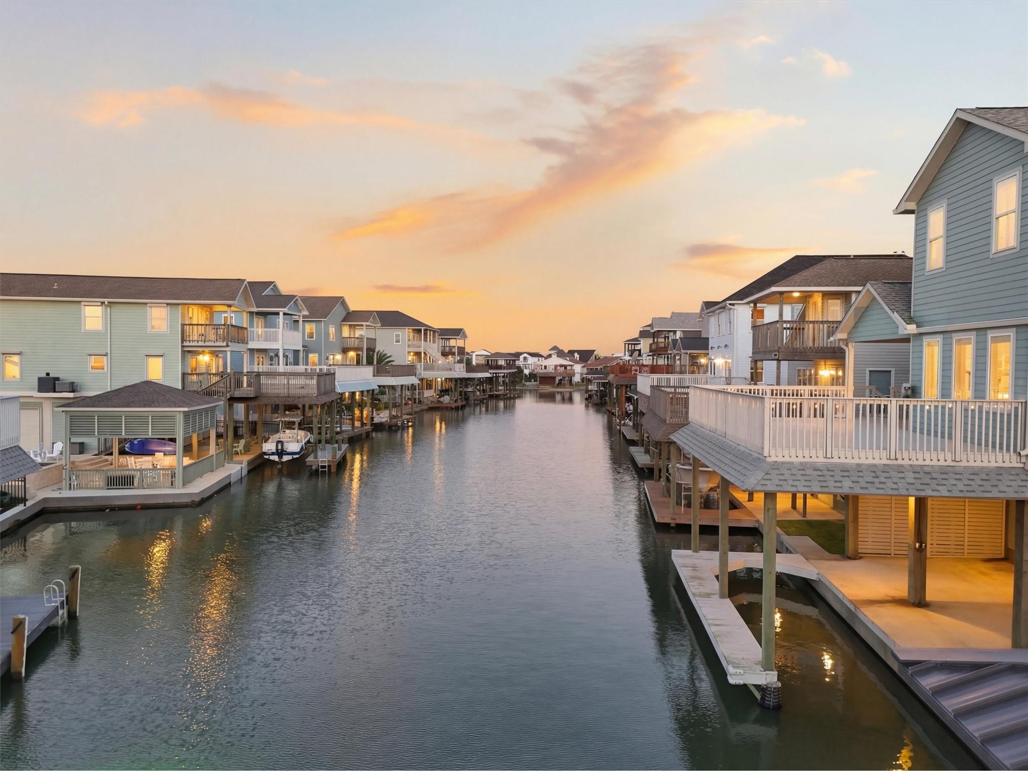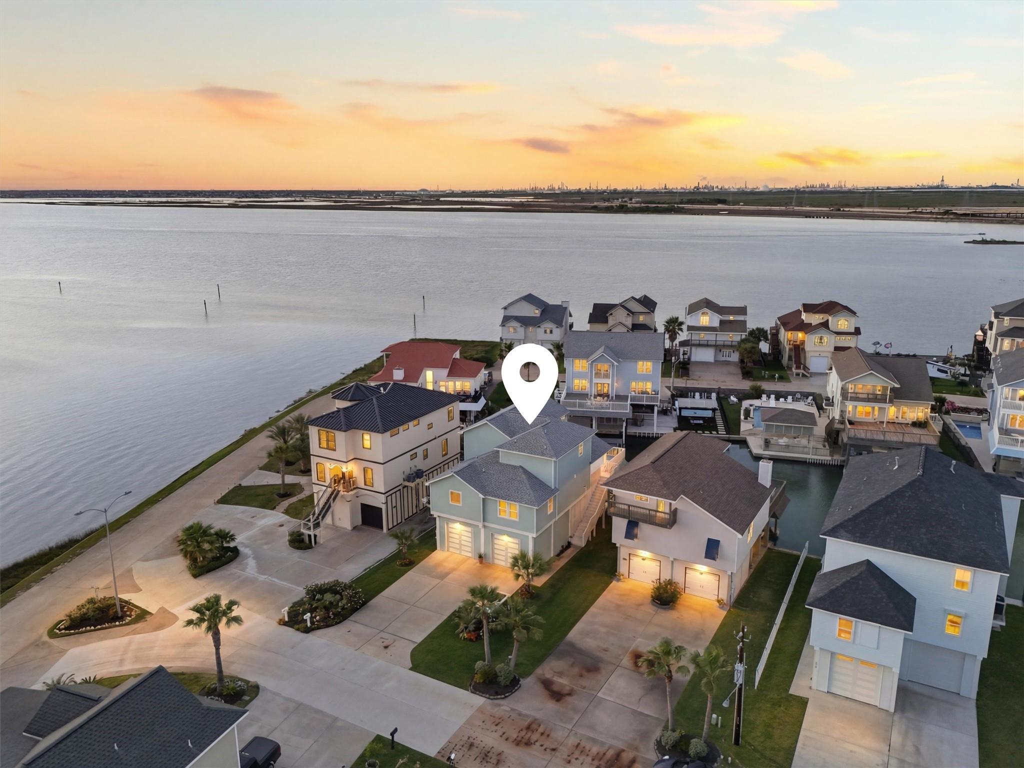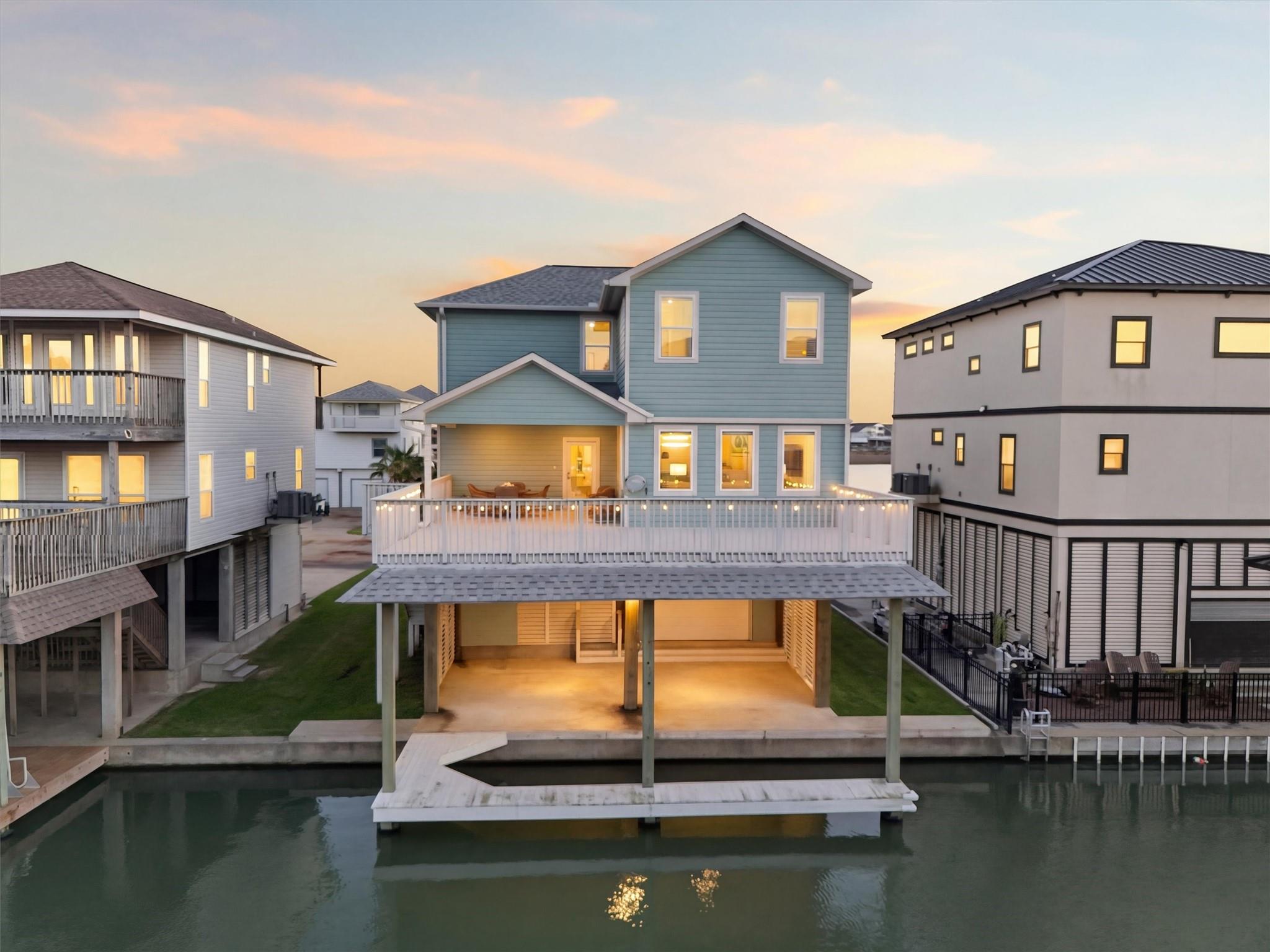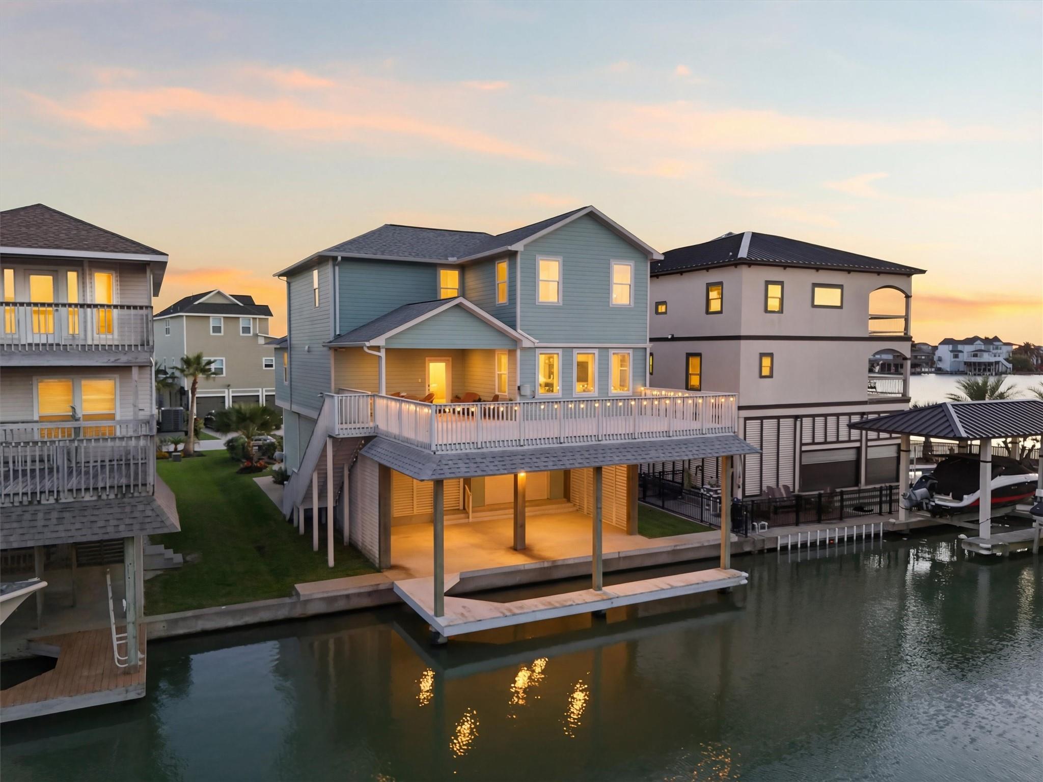 Stunning 2021-built canal-front home on coveted Tiki Island offering direct Jones Bay access and breathtaking sunset views. This impeccably maintained 4-bedroom, 3.5-bath two-story residence features a thoughtfully designed open floor plan with a spacious kitchen island, propane gas range, and stainless steel appliances. The elegant interior showcases an open concept with modern glass fixtures and a striking open-cord stairwell design. The primary suite is conveniently located on the main level, with three bedrooms upstairs. Expansive main level balcony and a ground-level outdoor living area adjacent to the boat dock and slip for seamless waterfront living. The oversized enclosed three-door garage provides exceptional bonus storage or flex entertainment space opening directly onto the boat slip and canal. Whether you're a boating enthusiast or sunset chaser, this waterfront gem delivers luxurious living in one of Galveston coveted communities. NO HOA fee.