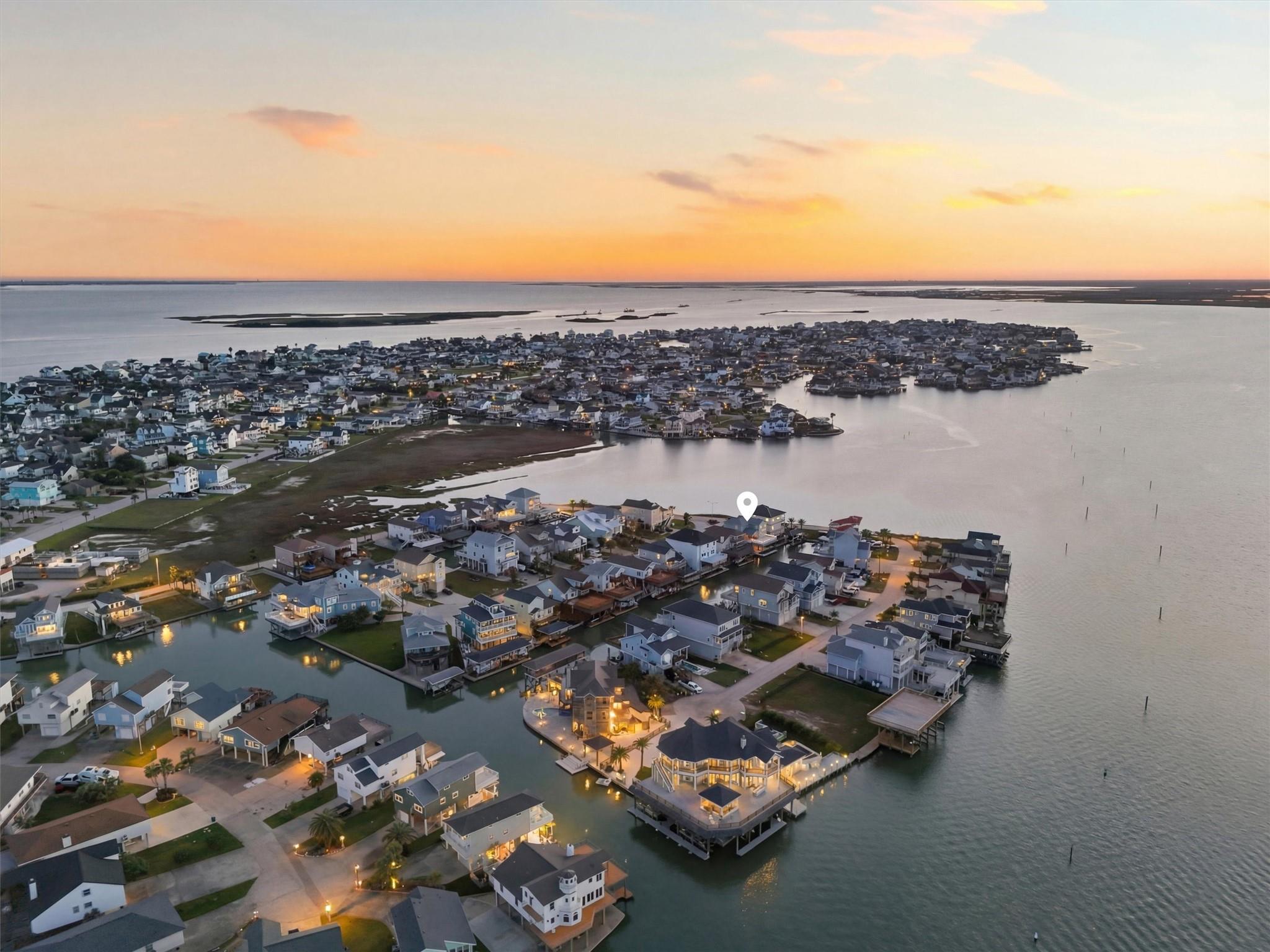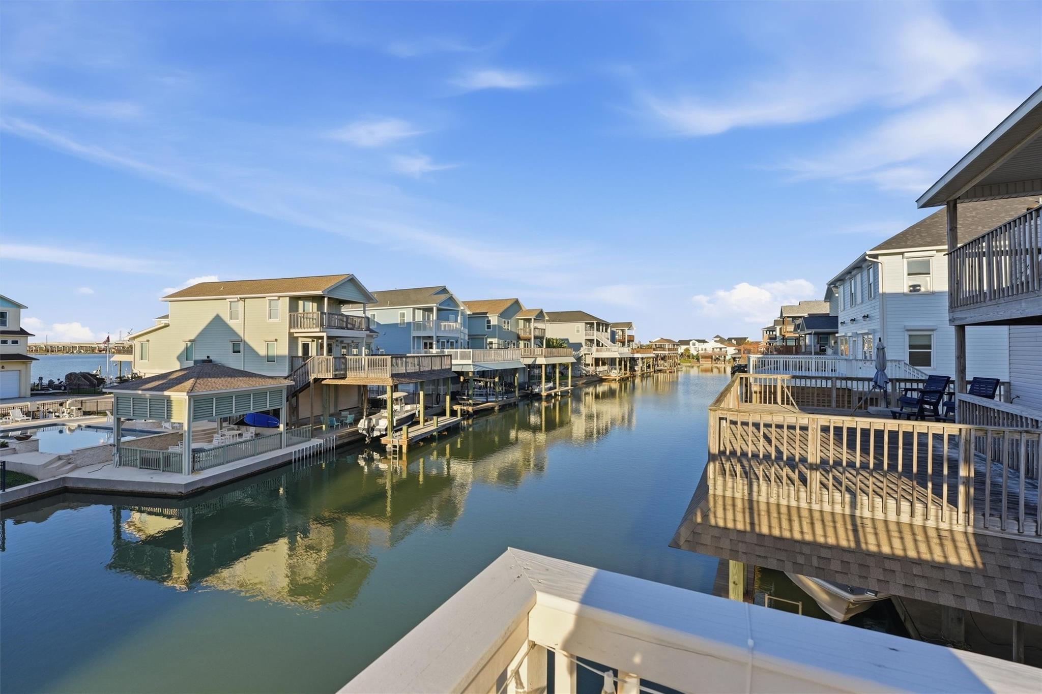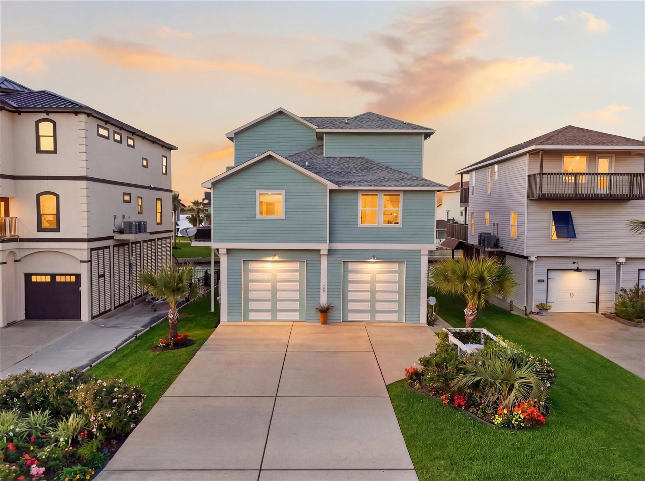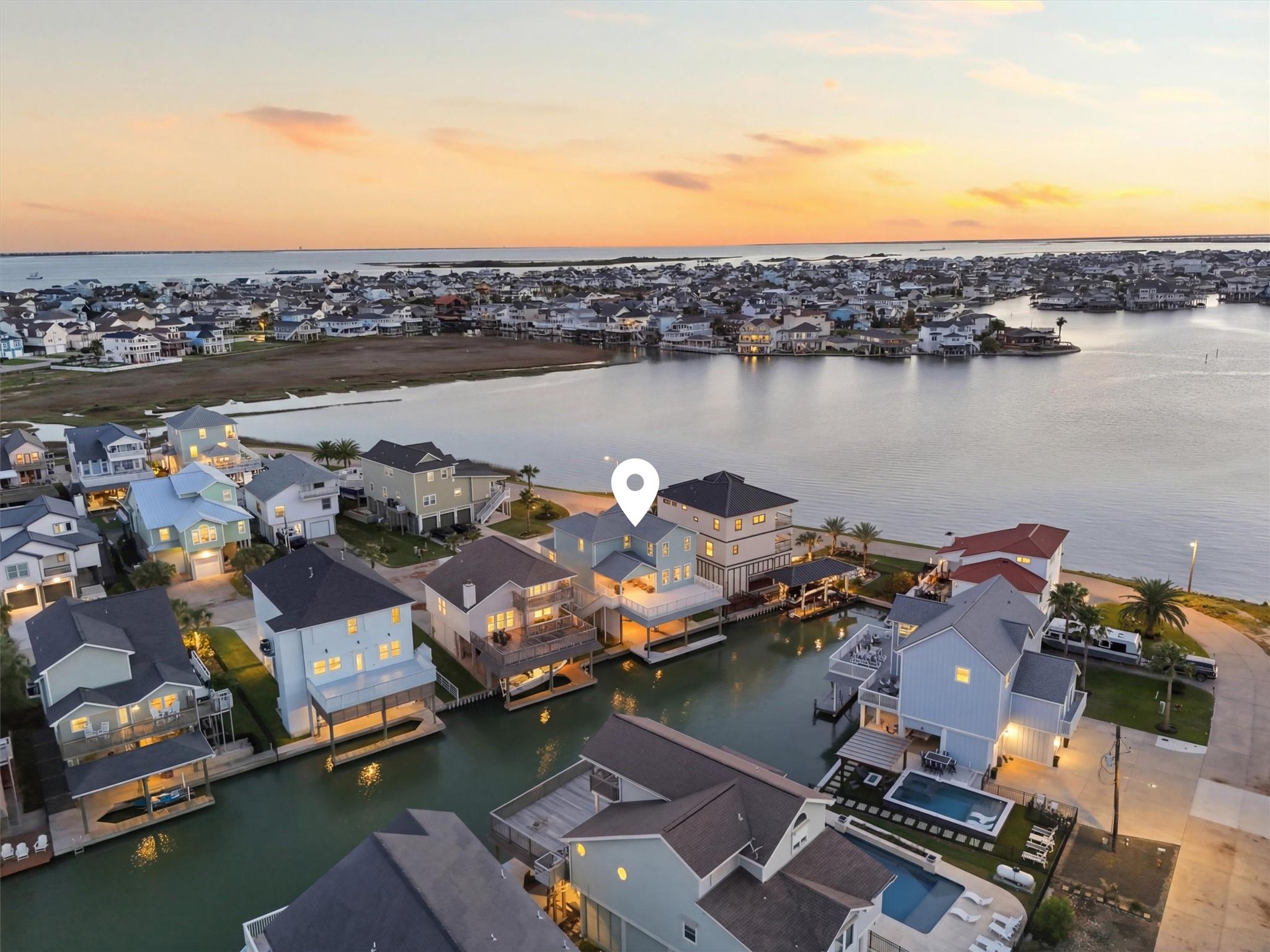 Stunning 2021-built canal-front home on coveted Tiki Island offering direct Jones Bay access and breathtaking sunset views. This impeccably maintained 4-bedroom, 3.5-bath two-story residence features a thoughtfully designed open floor plan with a spacious kitchen island, propane gas range, and stainless steel appliances. The elegant interior showcases an open concept with modern glass fixtures and a striking open-cord stairwell design. The primary suite is conveniently located on the main level, with three bedrooms upstairs. Expansive main level balcony and a ground-level outdoor living area adjacent to the boat dock and slip for seamless waterfront living. The oversized enclosed three-door garage provides exceptional bonus storage or flex entertainment space opening directly onto the boat slip and canal. Whether you're a boating enthusiast or sunset chaser, this waterfront gem delivers luxurious living in one of Galveston coveted communities. NO HOA fee.