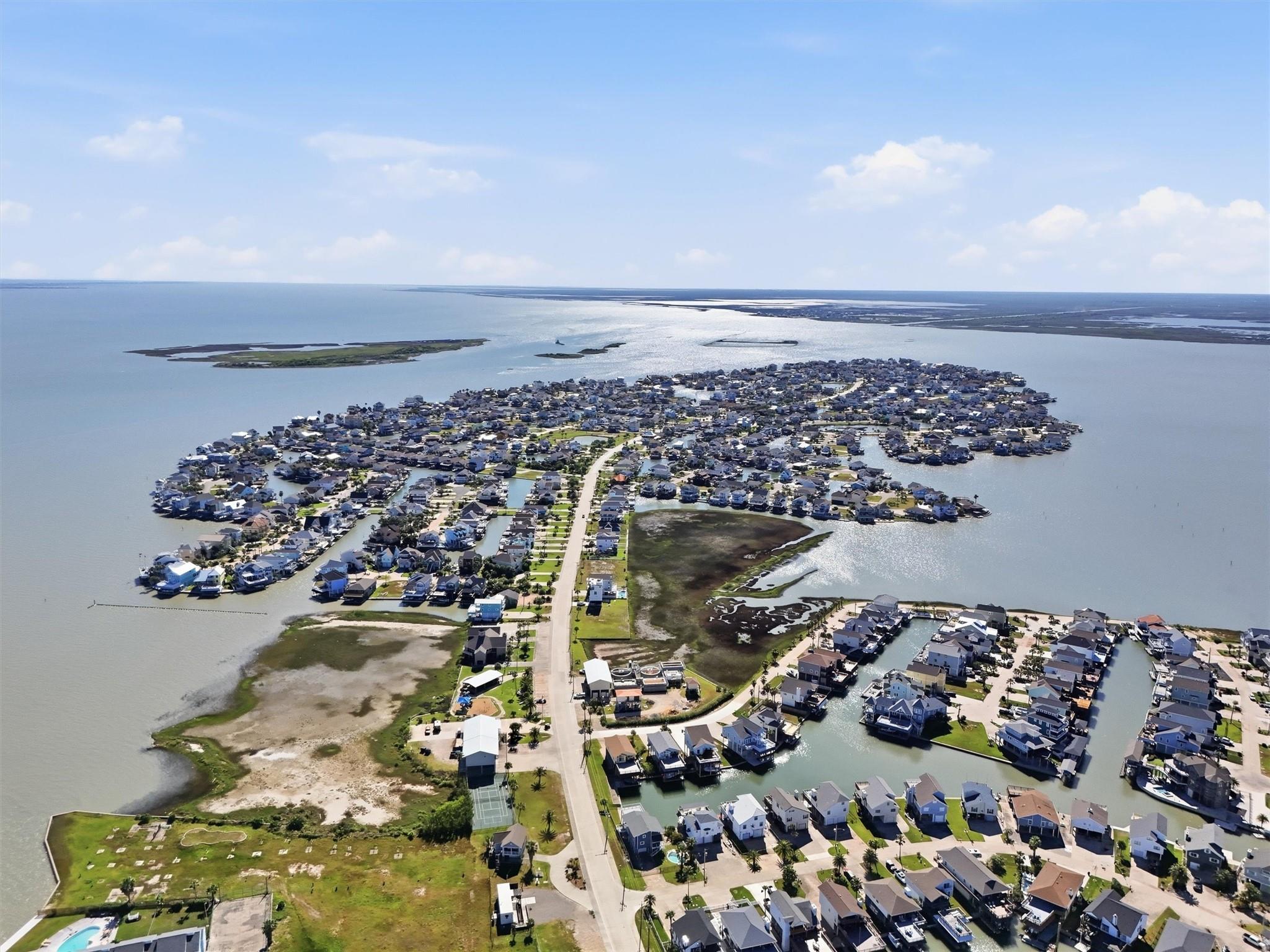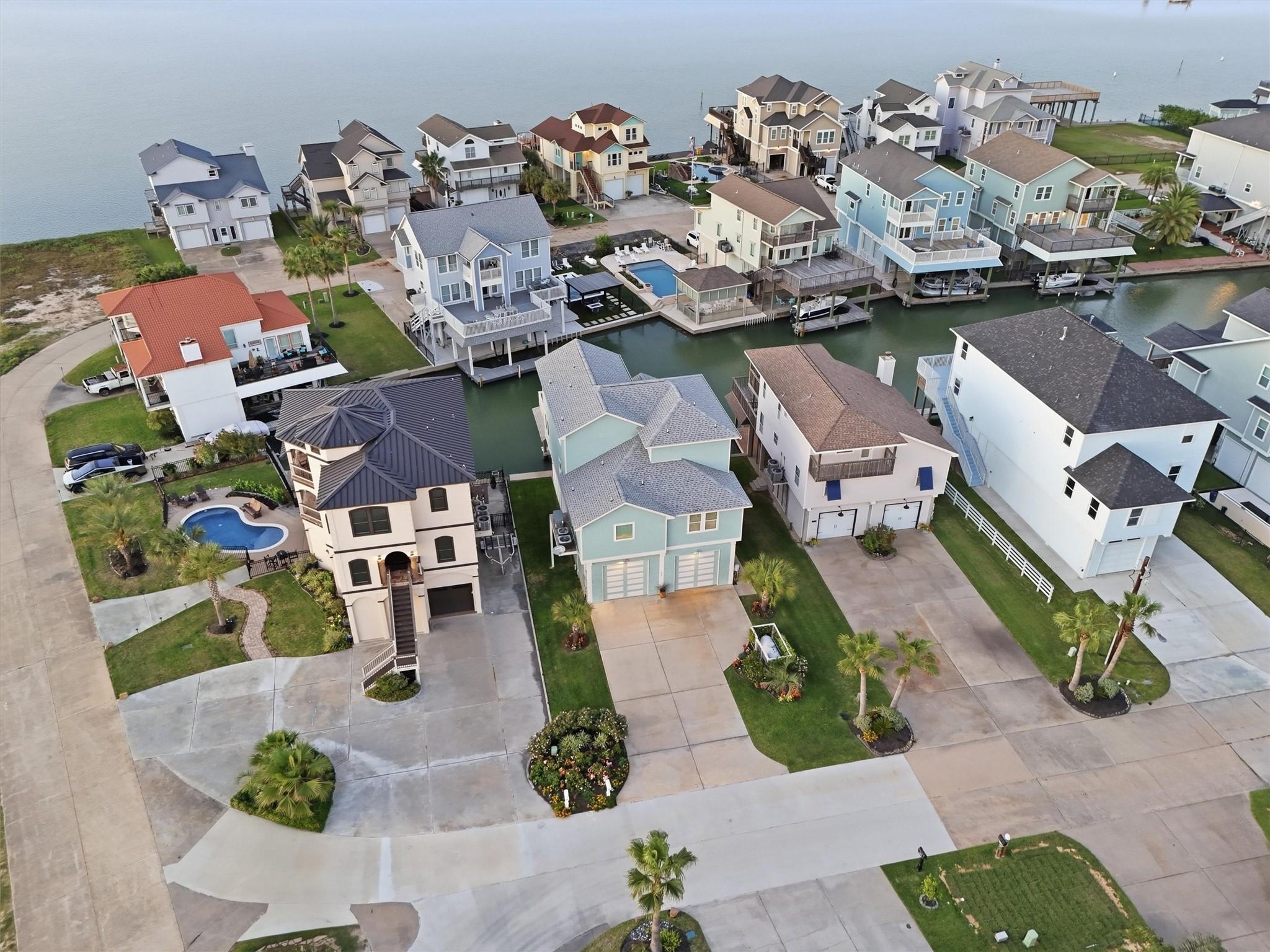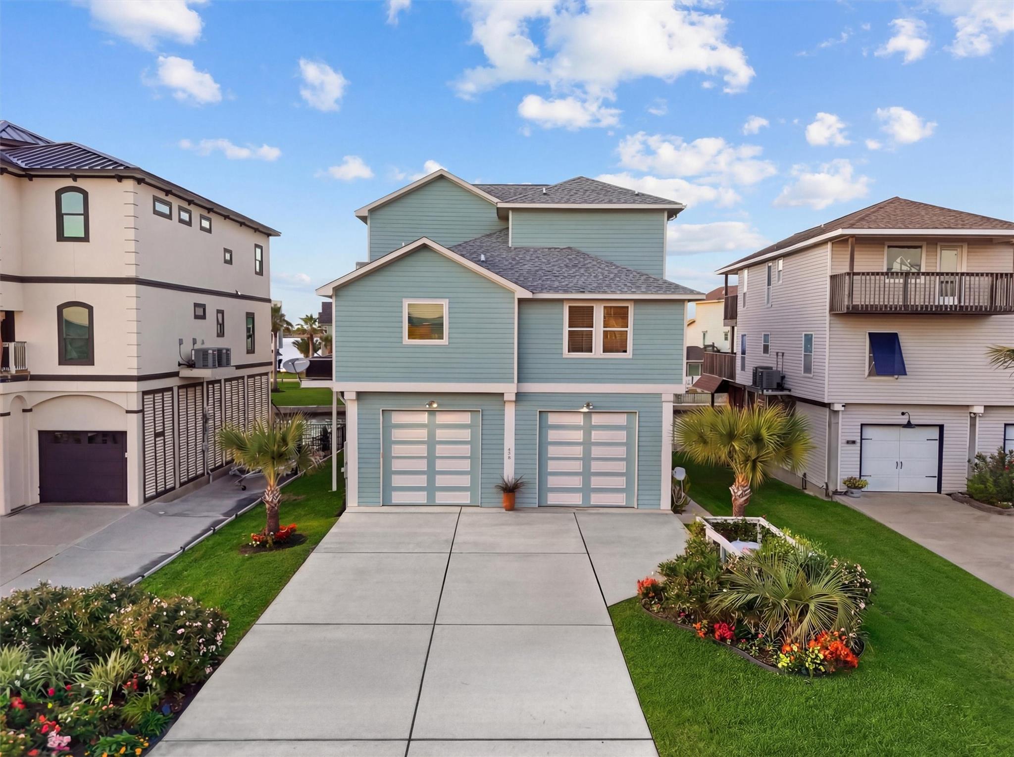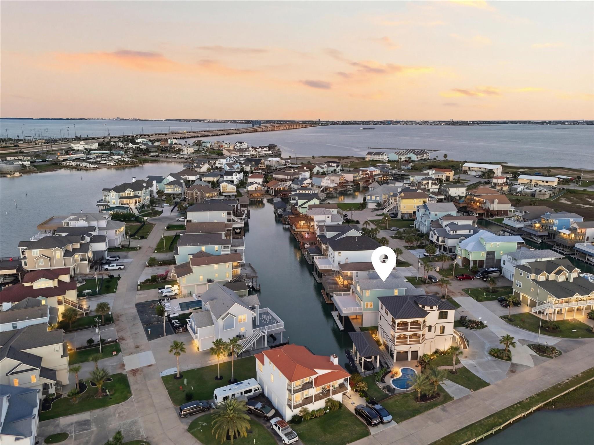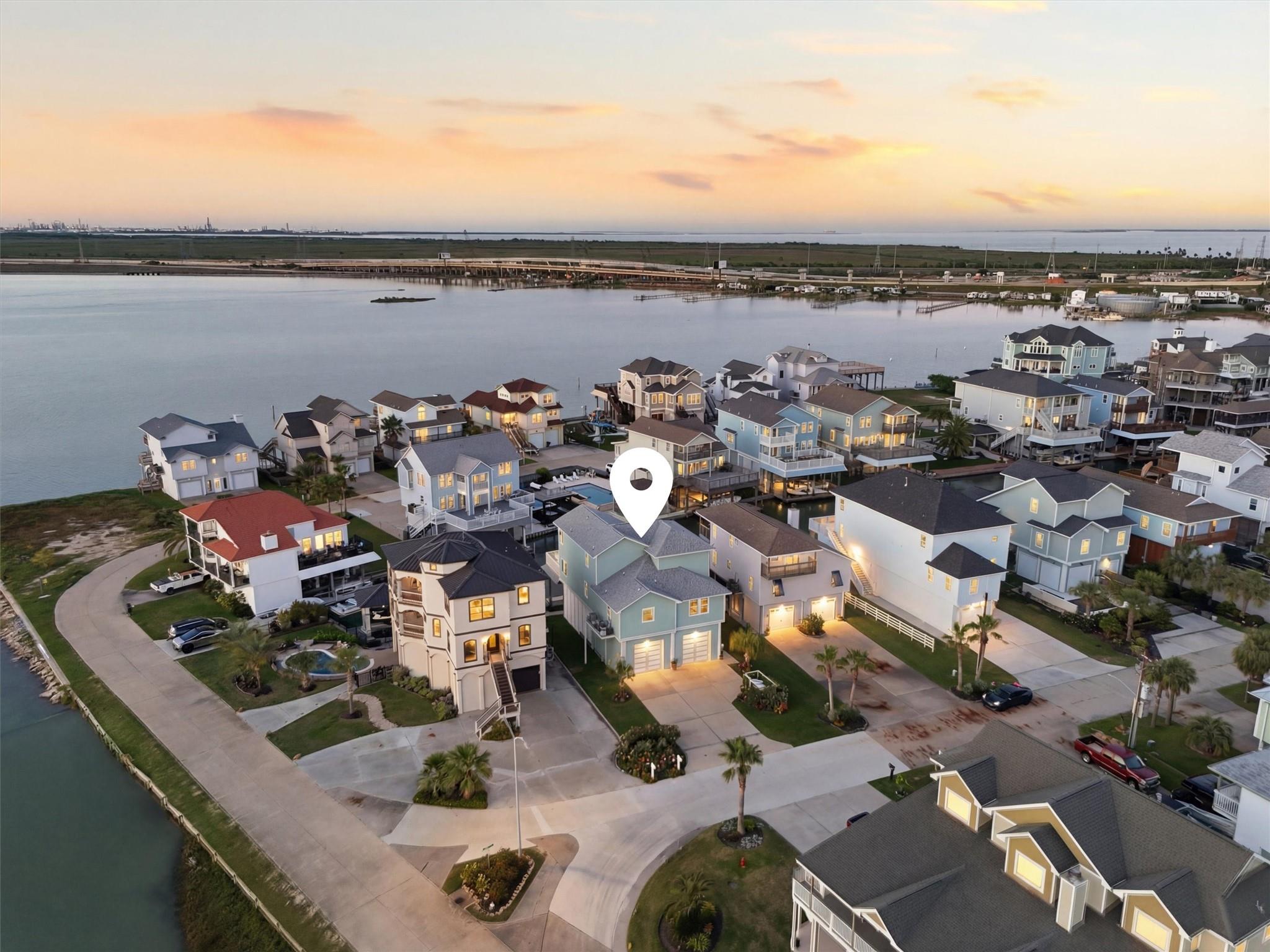 Stunning 2021-built canal-front home on coveted Tiki Island offering direct Jones Bay access and breathtaking sunset views. This impeccably maintained 4-bedroom, 3.5-bath two-story residence features a thoughtfully designed open floor plan with a spacious kitchen island, propane gas range, and stainless steel appliances. The elegant interior showcases an open concept with modern glass fixtures and a striking open-cord stairwell design. The primary suite is conveniently located on the main level, with three bedrooms upstairs. Expansive main level balcony and a ground-level outdoor living area adjacent to the boat dock and slip for seamless waterfront living. The oversized enclosed three-door garage provides exceptional bonus storage or flex entertainment space opening directly onto the boat slip and canal. Whether you're a boating enthusiast or sunset chaser, this waterfront gem delivers luxurious living in one of Galveston coveted communities. NO HOA fee.