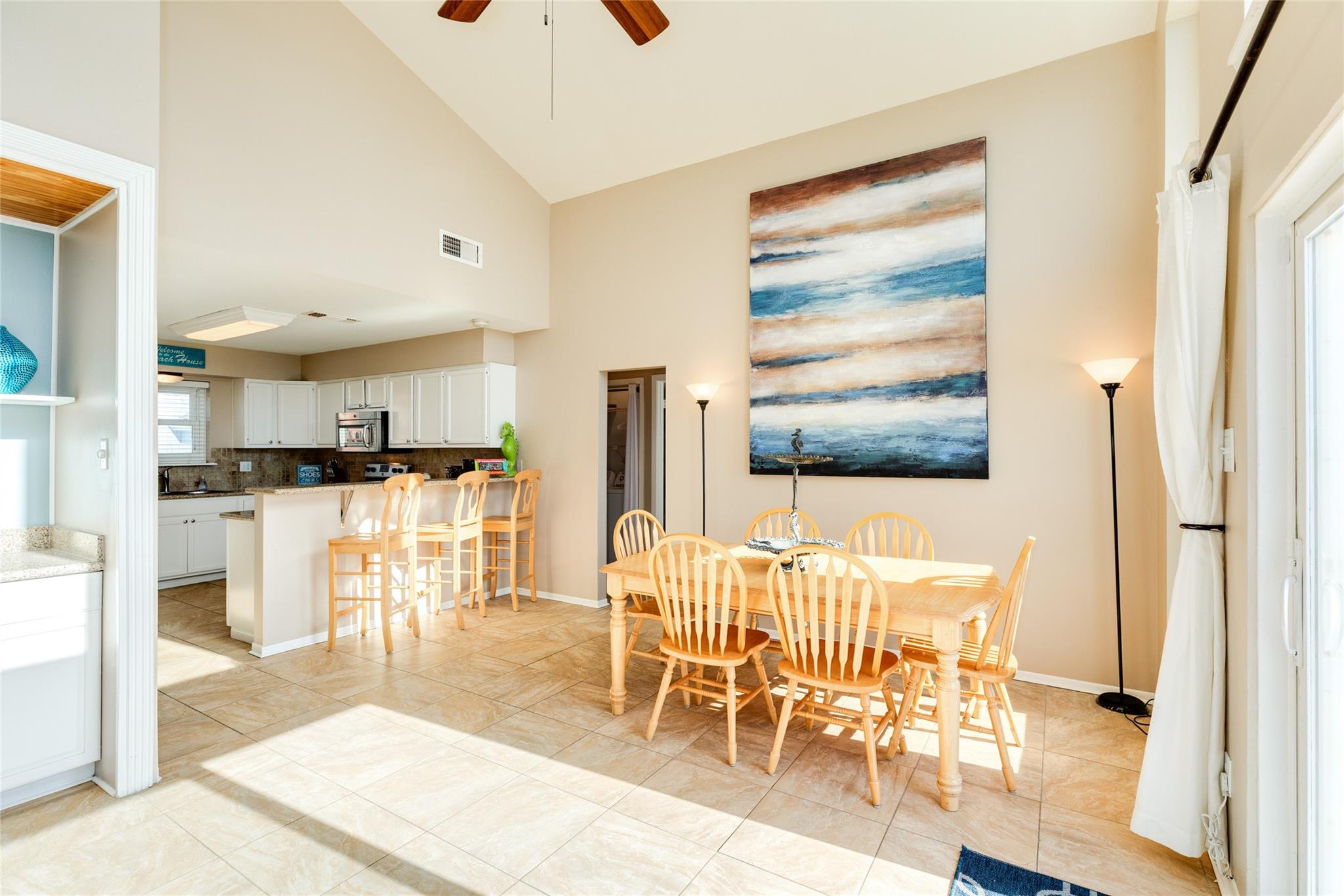InteriorFloors:TileBedroom Desc:Primary Bed - 1st Floor,Sitting Area,Split Plan,Walk-In ClosetKitchen Desc:Breakfast Bar,Island w/o Cooktop,Kitchen open to Family Room,Pantry,Under Cabinet LightingRoom Description:Utility Room in HouseHeating:Central ElectricCooling:Central ElectricConnections:Electric Dryer Connections,Washer ConnectionsDishwasher:YesDisposal:YesMicrowave:YesRange:Electric RangeOven:Electric OvenEnergy Feature:Ceiling Fans,Digital Program ThermostatInterior:Dryer Included,High Ceiling,Refrigerator Included,Washer Included,Window Coverings