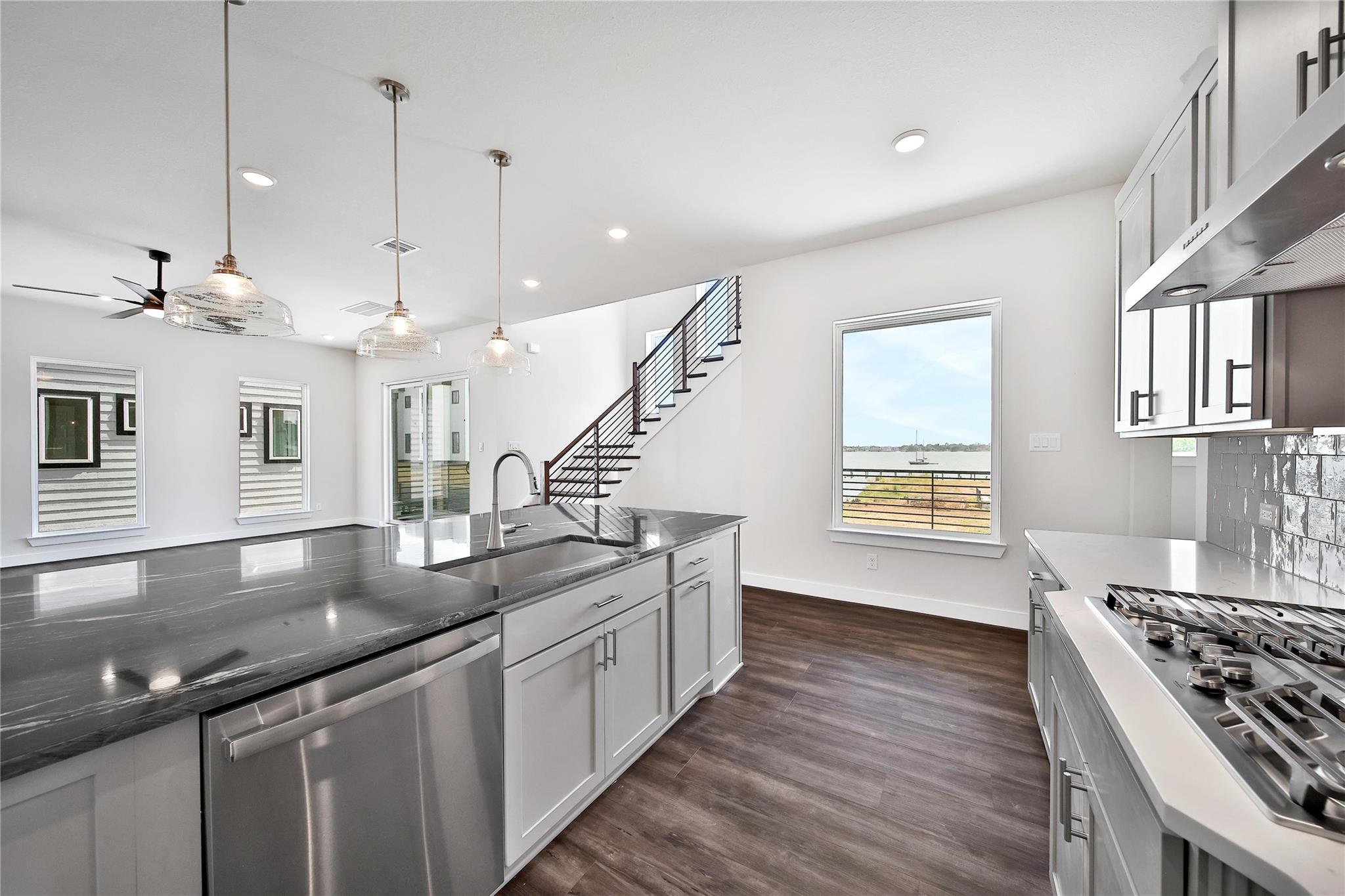 Catch some waves here on the banks of Clear Lake!!! WATERVIEW property located minutes from Kemah Boardwalk and just a boat ride away to Galveston Island. Quick commute to Downtown Houston and local employers such as NASA. This 4 bed, 3.5 bath w/ 4-CAR GARAGE -- Gorgeous EAT-IN kitchen w/ breakfast bar, sleek counter tops, & 42" cabinetry with soft close drawers/cabinets. Kitchen open to living. EVP flooring, smart home package, and many more features. Primary bedroom on 2nd floor featuring large balcony, split vanities, shower, and walk-in closet. Third floor with spacious secondary bedrooms, large GAME ROOM w/ wet bar, and an amazing balcony. This home is perfect for those who like to entertain!! Highly sought after schools and STUNNING WATER VIEWS all YEAR ROUND!! Make the move!! Space for a future boat slip! Home has elevator shaft and is generator ready.