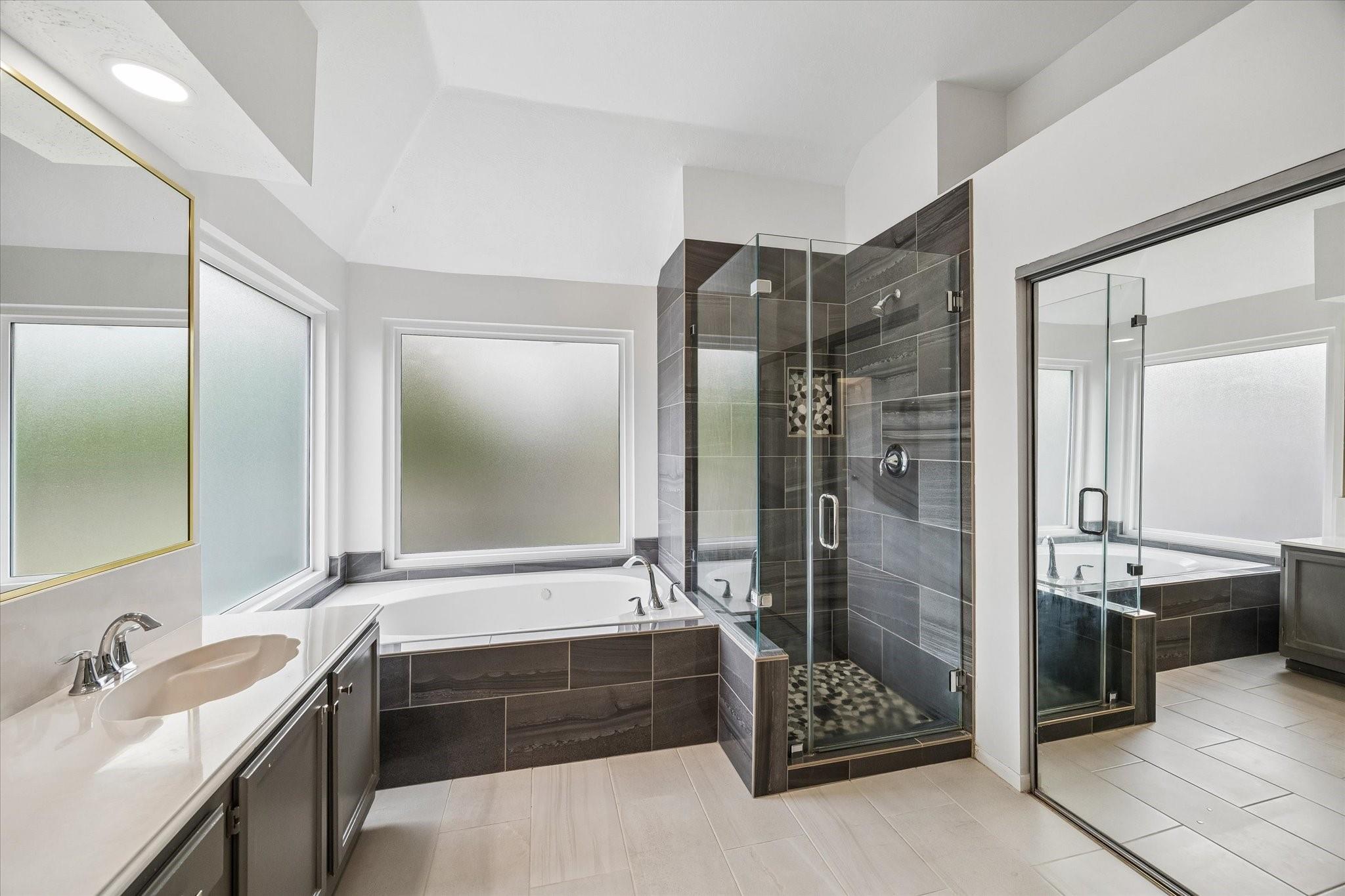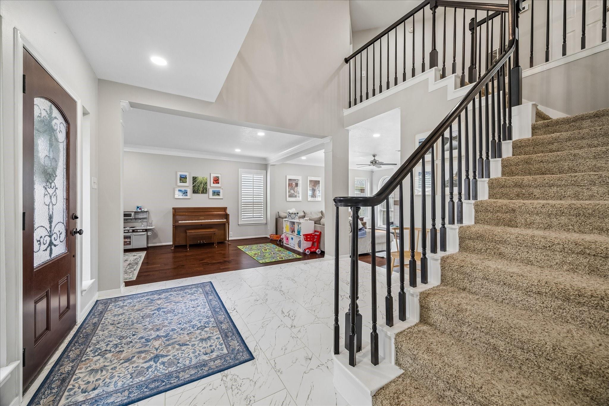 Beautifully updated 4-bedroom, 2.5-bath home blending comfort, style, and functionality. A grand two-story foyer welcomes you into a spacious, light-filled living room with a cozy fireplace. The open-concept kitchen features granite countertops, stainless steel appliances, abundant cabinetry, and a large island—perfect for entertaining. Enjoy both a formal dining room and a bright breakfast area, plus a convenient built-in serving space. Upstairs, the expansive primary suite offers vaulted ceilings and a luxurious bath with dual vanities, soaking tub, and separate shower. Large secondary bedrooms provide flexibility and space. The private, fully fenced backyard includes a generous lawn, play area, and inviting patio. Recent upgrades: One new AC unit (2025), double-pane windows (2022), and fresh exterior paint (2025).