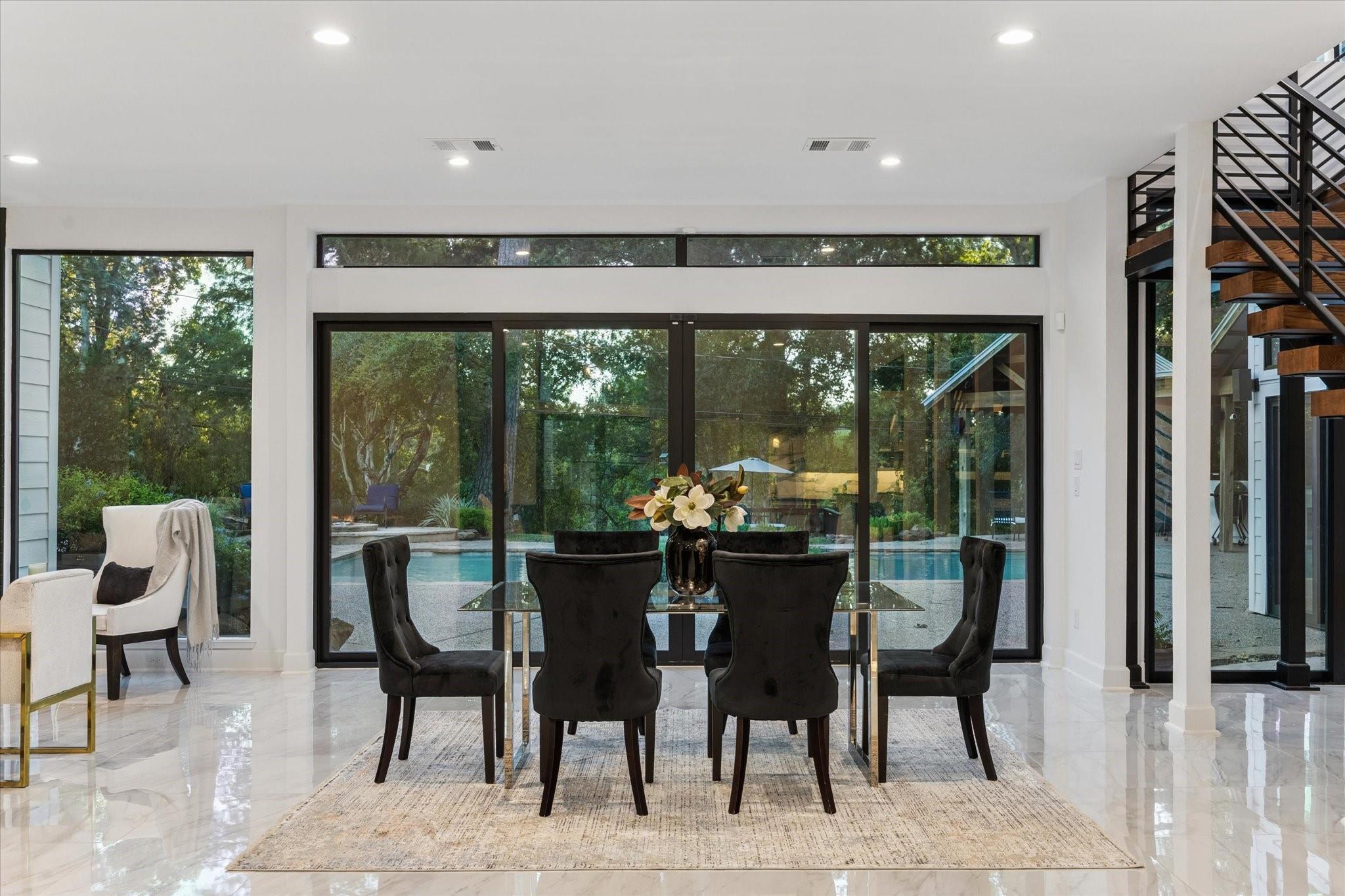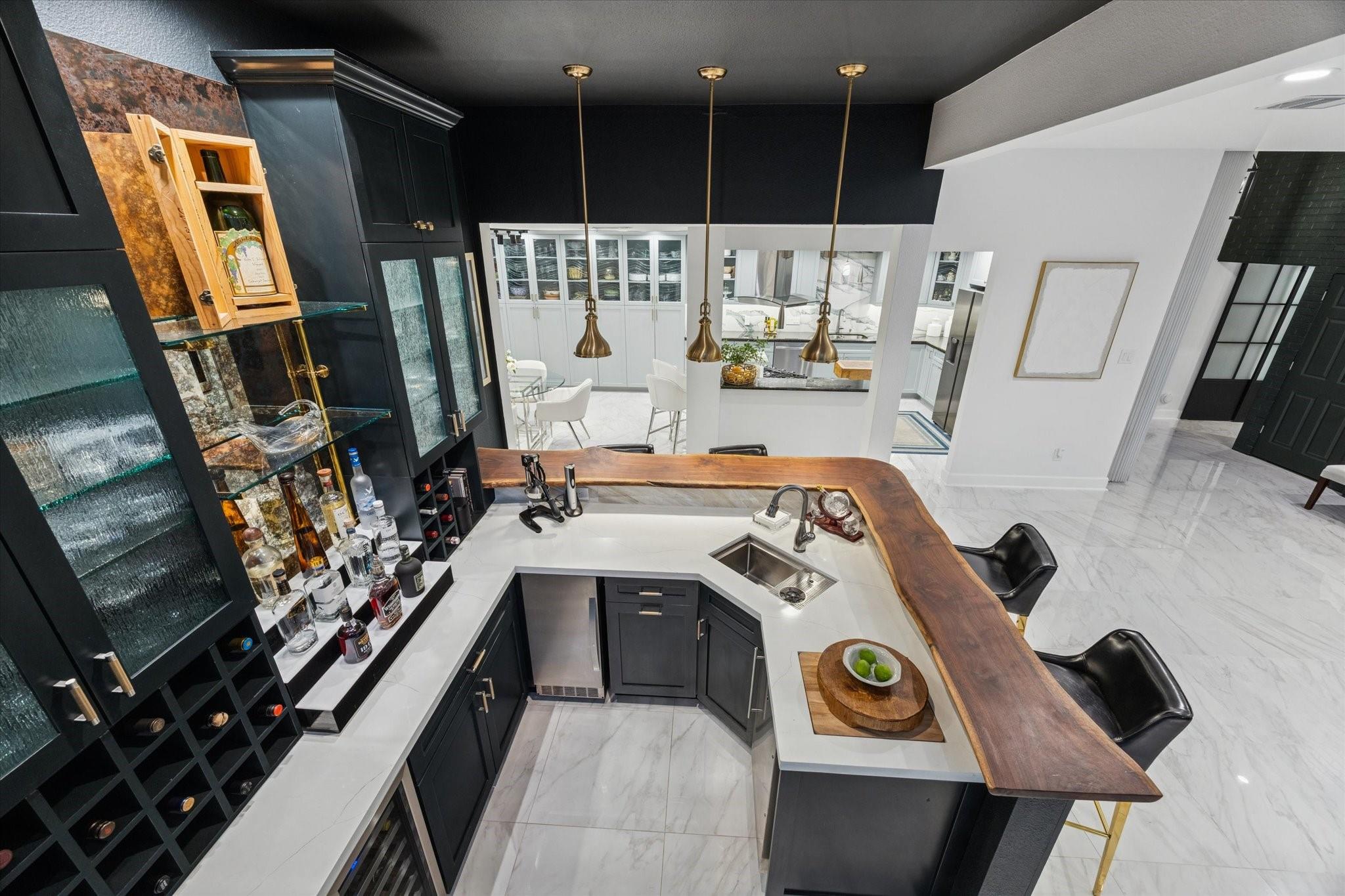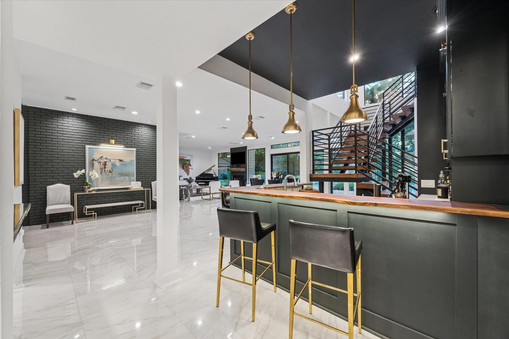 Stunning mid-century modern home positioned on a serene bayou-front lot in coveted Sandalwood. Completely reimagined in 2023, it blends timeless architecture w modern sophistication for effortless indoor-outdoor living. Steel-framed doors open onto expansive backyard featuring pool, spa, outdoor kitchen w breathtaking views. Upon entry, you're flanked by Italian porcelain tile floors, a custom wet bar, formal living area anchored by gas fireplace flowing seamlessly into the dining room w sweeping views & a floating staircase. Upstairs offers a private primary suite w balcony, dual spa-inspired baths & 2 walk-in closets. Downstairs fitted for elevator, 2 private office spaces, 2 secondary bedrooms, 3 full baths, 1 half bath, extra room for additional pantry storage, a secondary primary suite/mother-in-law/guest quarters or au pair suite with a flexible living space/game room with full kitchen & 2nd laundry room. Sandalwood residents enjoy 3 scenic lakes, walking trails & playground.