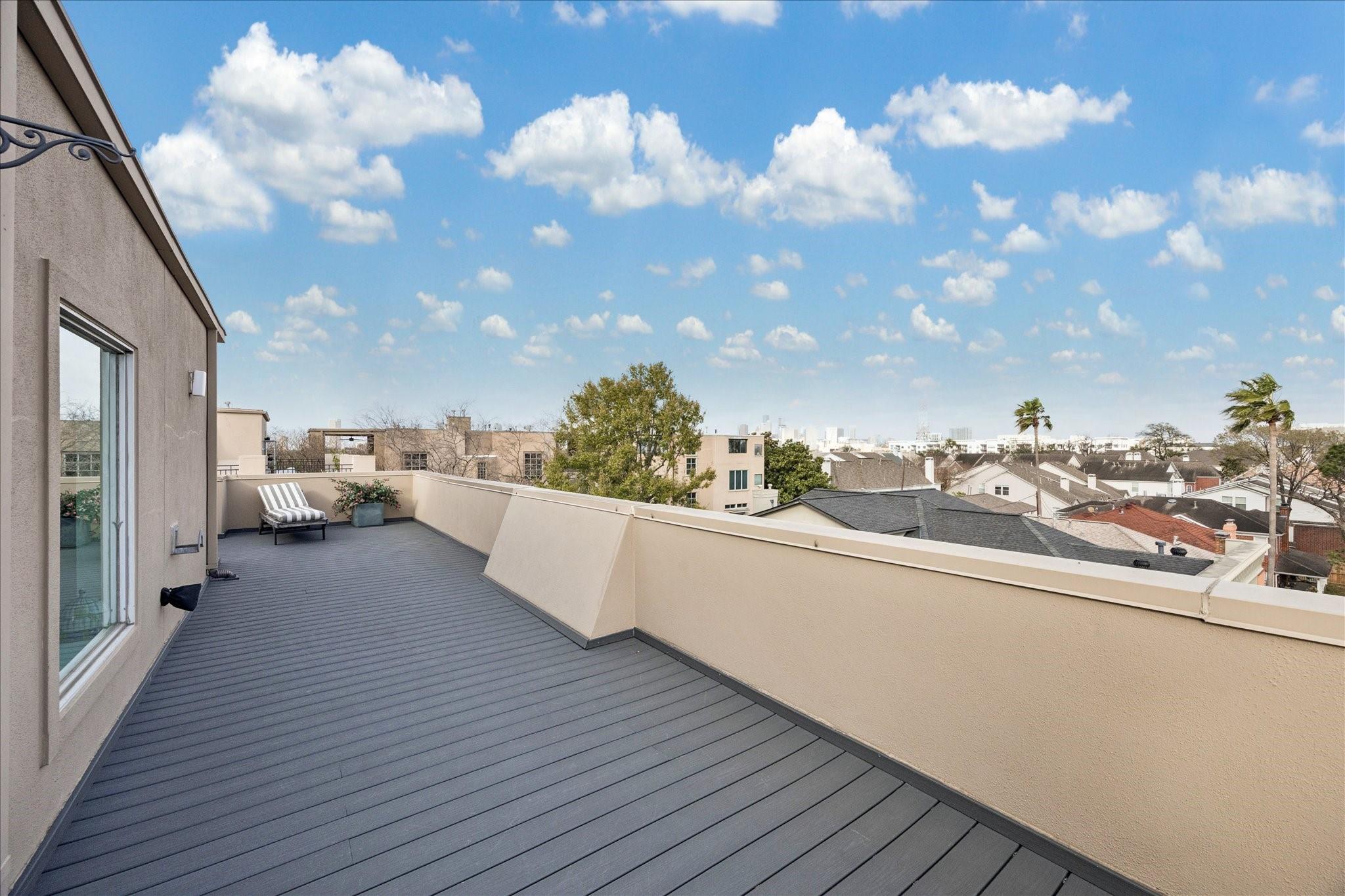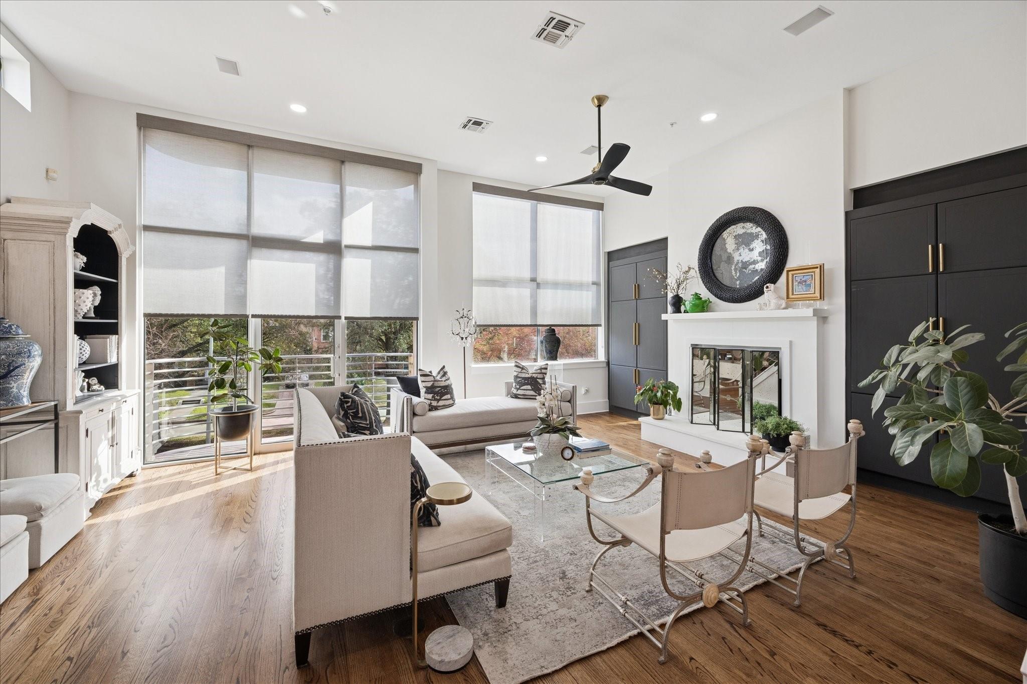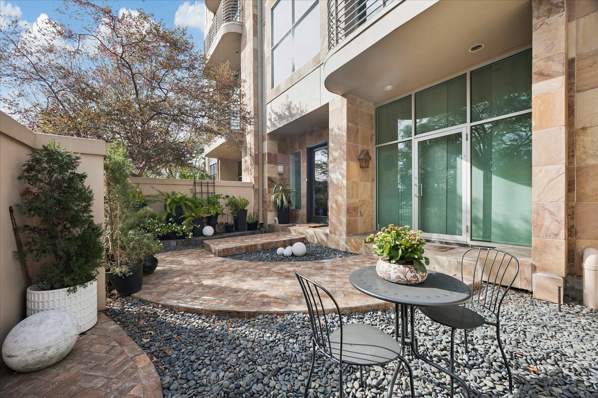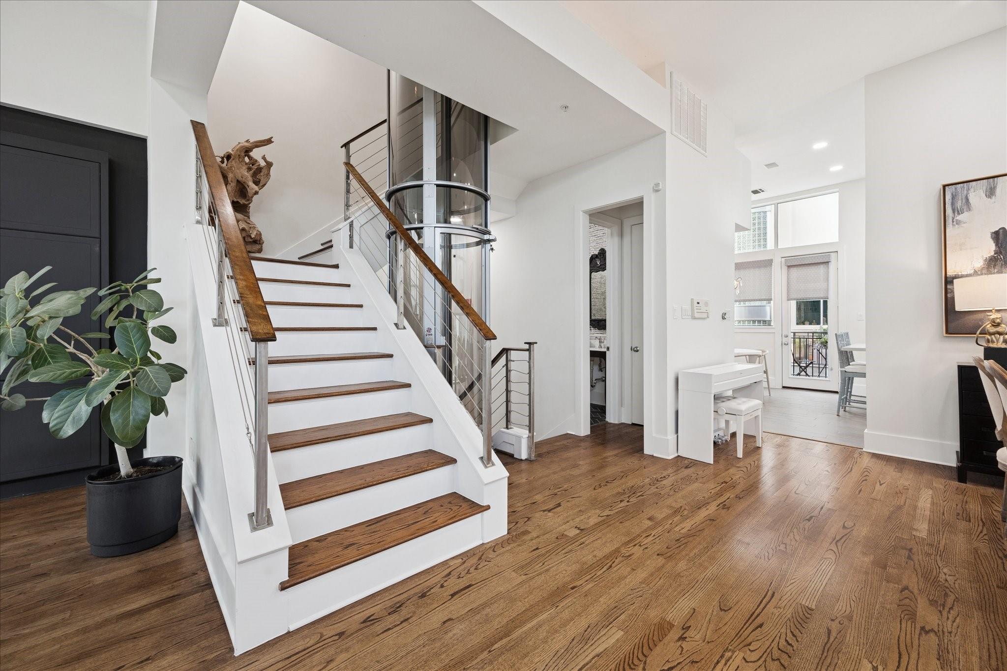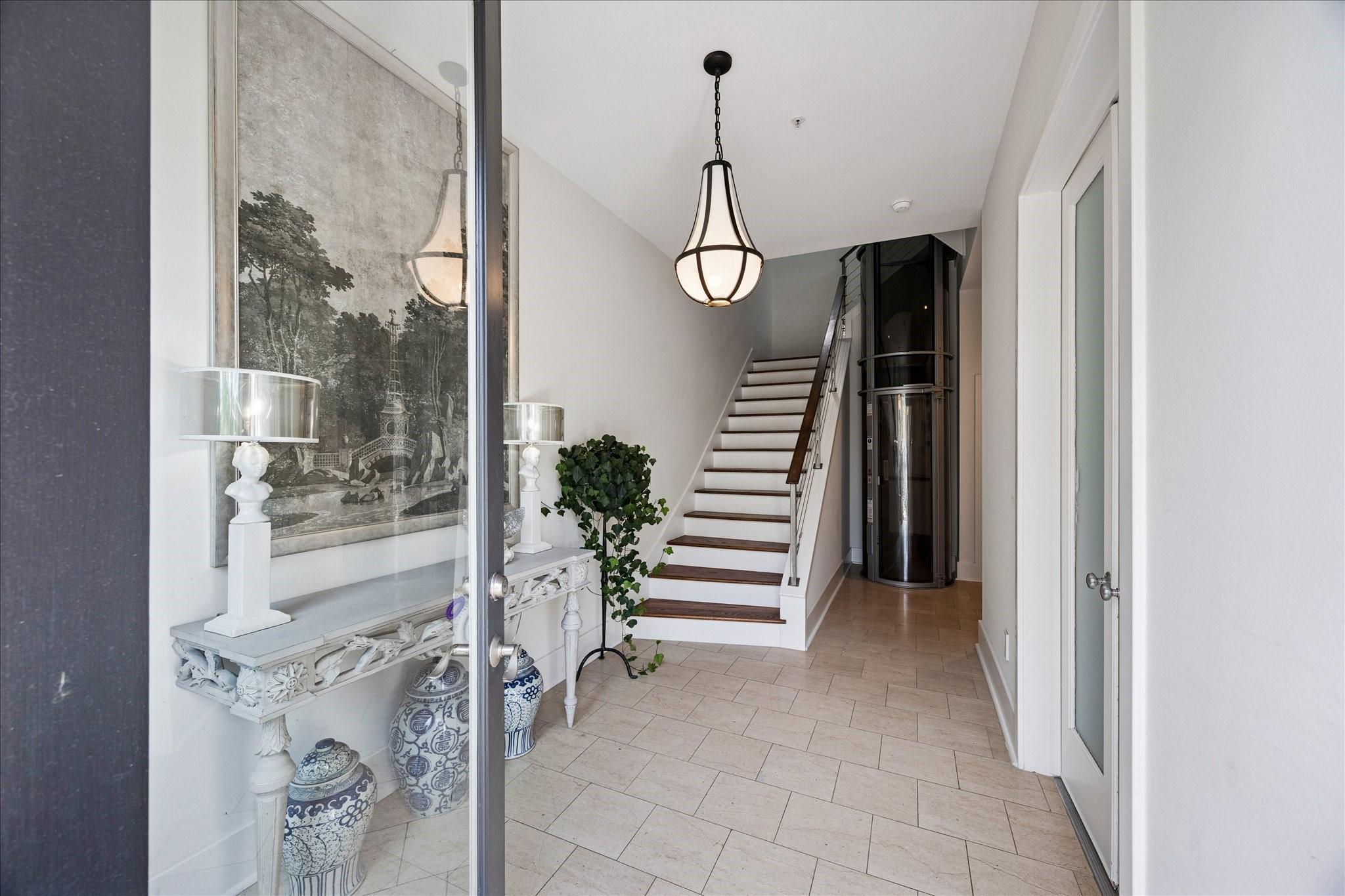 This beautifully renovated modern townhome is a must see! Conveniently situated near Rice U and renowned Texas Medical Center. This home features: a tranquil private courtyard. Enter into an elegant marble foyer to access a guest suite equipped with its own separate entry; including an ensuite bathroom. Observe the custom pneumatic elevator that lifts you to each floor. Gorgeous oak flooring in most spaces, tile or marble in bathrooms. Level 2 offers an entertaining space that is open and inviting with an abundance of natural light shining through the oversized windows; tinting added for energy efficiency, 12' ceilings. A large gourmet island kitchen with quartz counters, lovely backsplash, stainless steel appliances. Level 3 has a walk-in laundry, secondary bedroom, and primary suite with a spa-like ensuite bathroom with soaker tub, separate shower, and water closet. Level 4 has breathtaking views. Relax on the wrap-around deck and lounging space. Close to museums, dining, shopping.