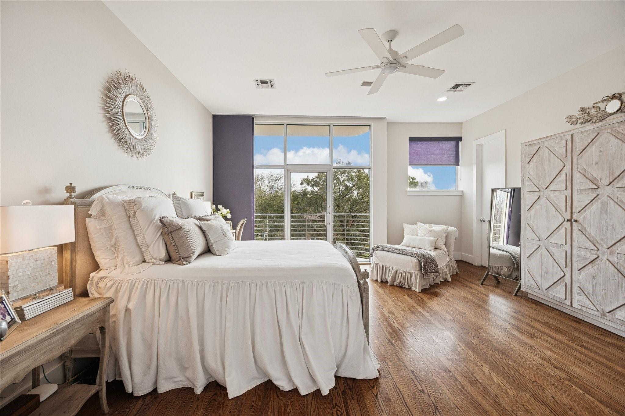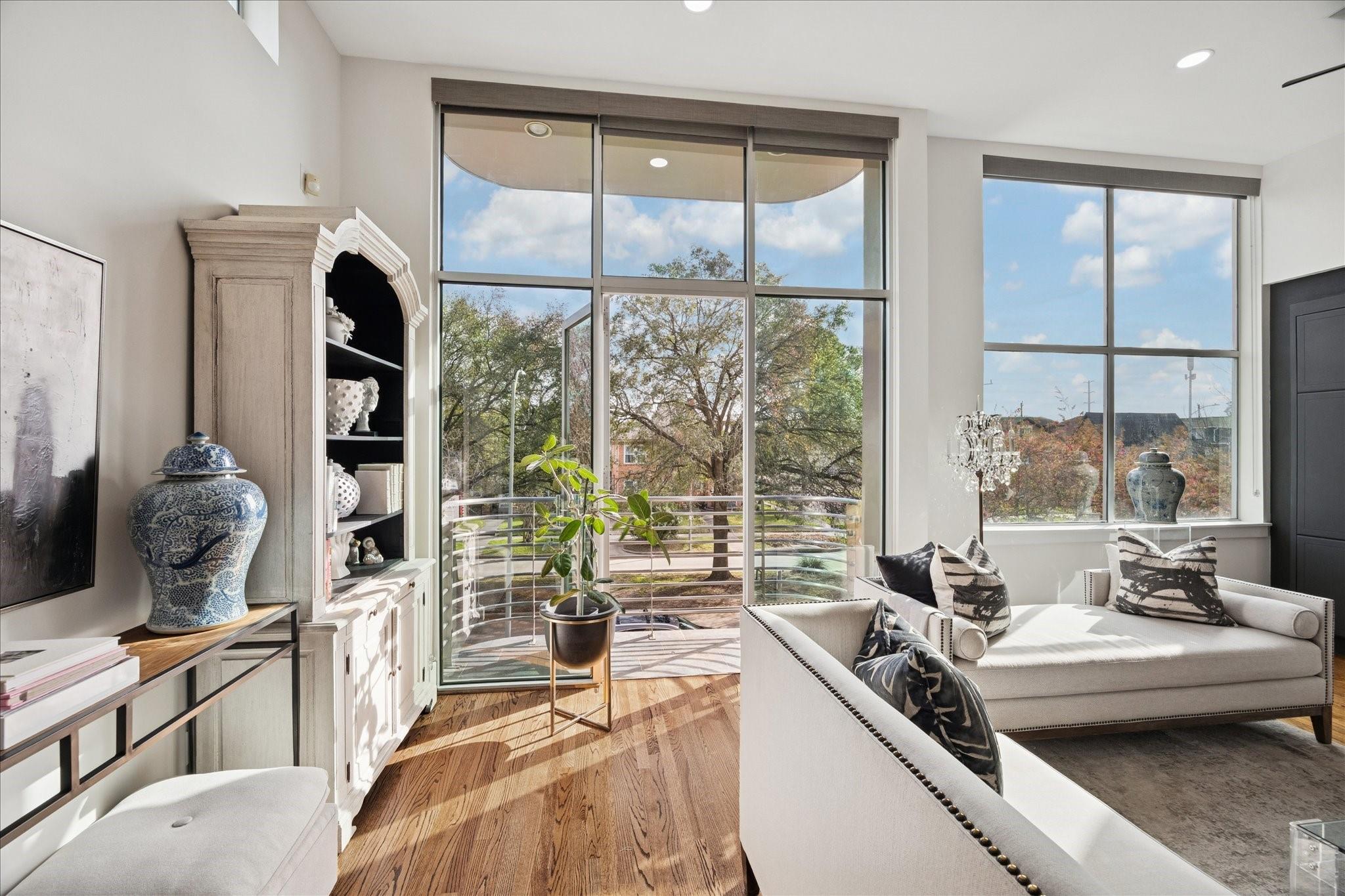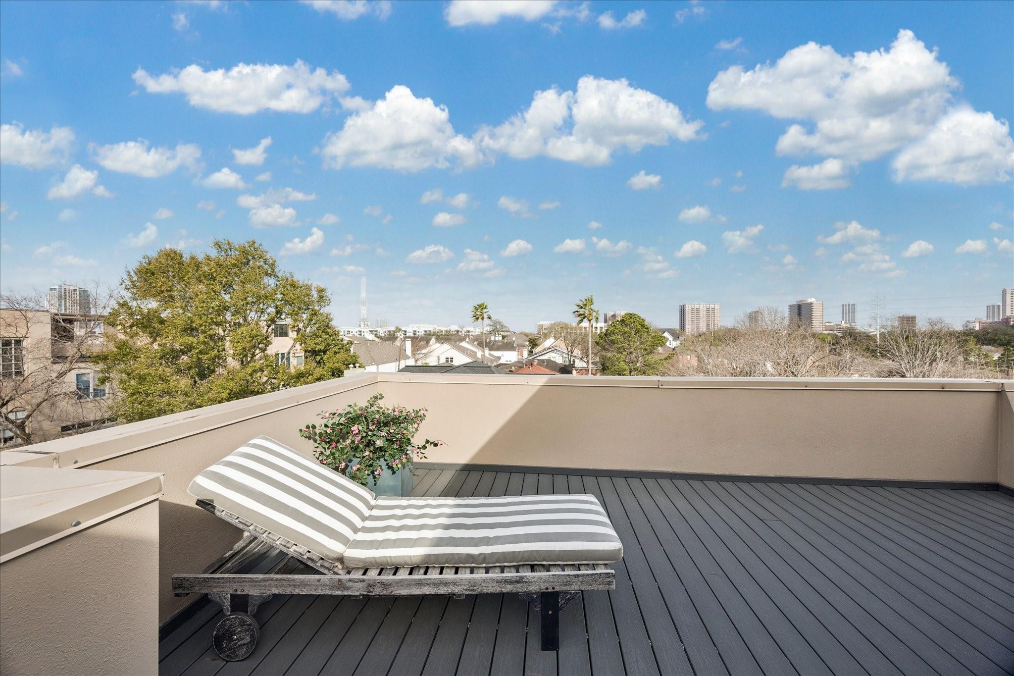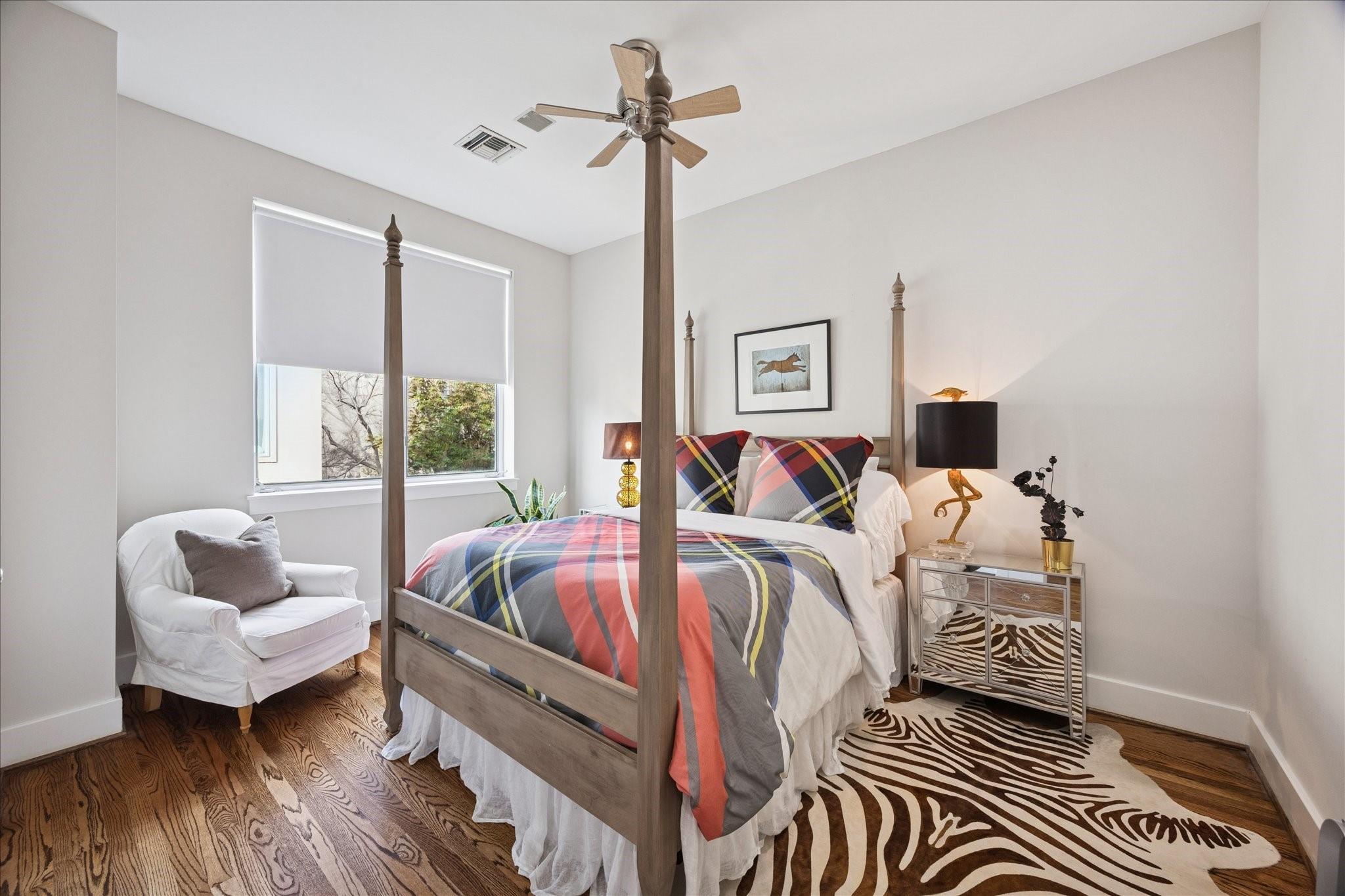 This beautifully renovated modern townhome is a must see! Conveniently situated near Rice U and renowned Texas Medical Center. This home features: a tranquil private courtyard. Enter into an elegant marble foyer to access a guest suite equipped with its own separate entry; including an ensuite bathroom. Observe the custom pneumatic elevator that lifts you to each floor. Gorgeous oak flooring in most spaces, tile or marble in bathrooms. Level 2 offers an entertaining space that is open and inviting with an abundance of natural light shining through the oversized windows; tinting added for energy efficiency, 12' ceilings. A large gourmet island kitchen with quartz counters, lovely backsplash, stainless steel appliances. Level 3 has a walk-in laundry, secondary bedroom, and primary suite with a spa-like ensuite bathroom with soaker tub, separate shower, and water closet. Level 4 has breathtaking views. Relax on the wrap-around deck and lounging space. Close to museums, dining, shopping.