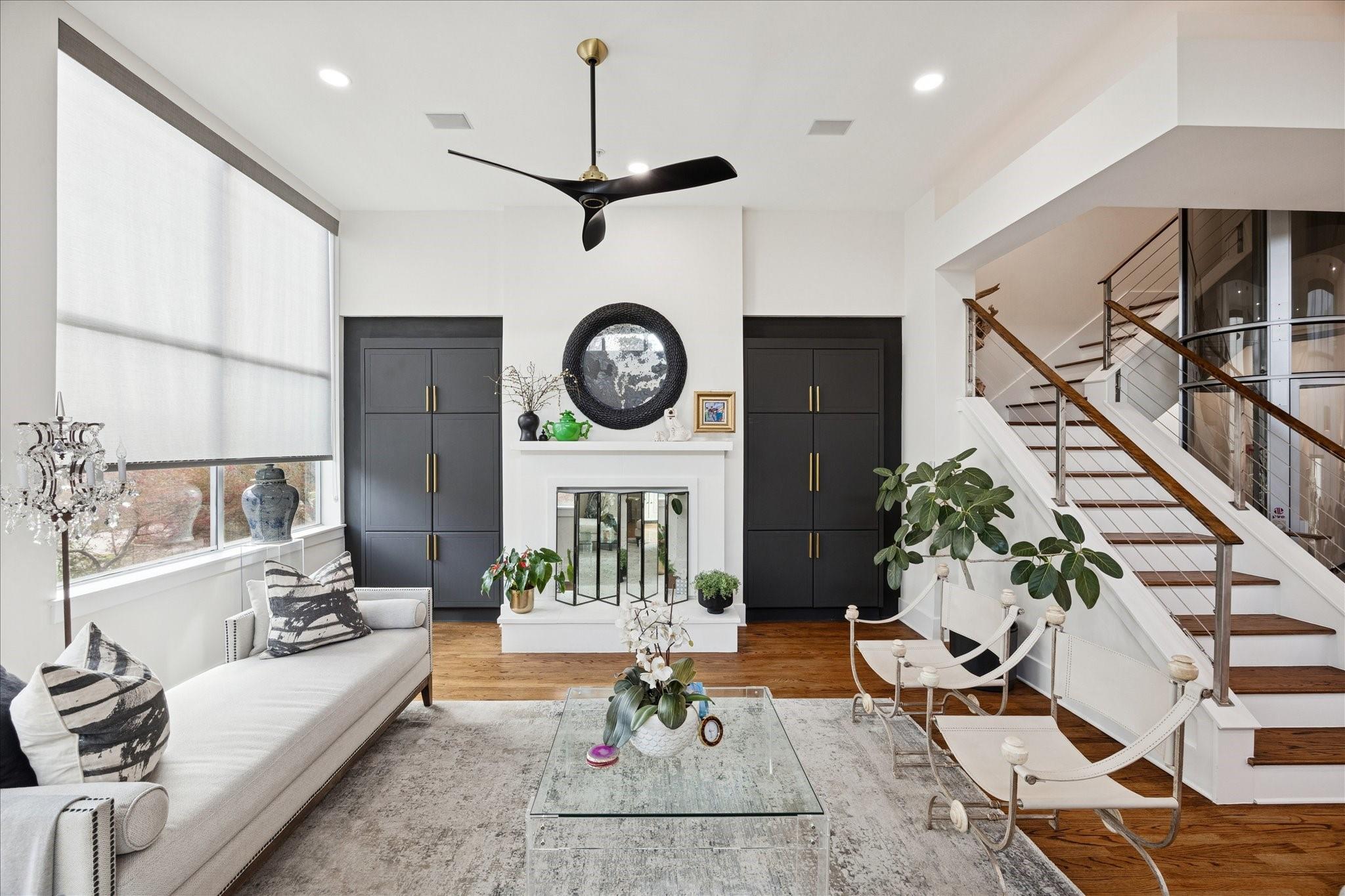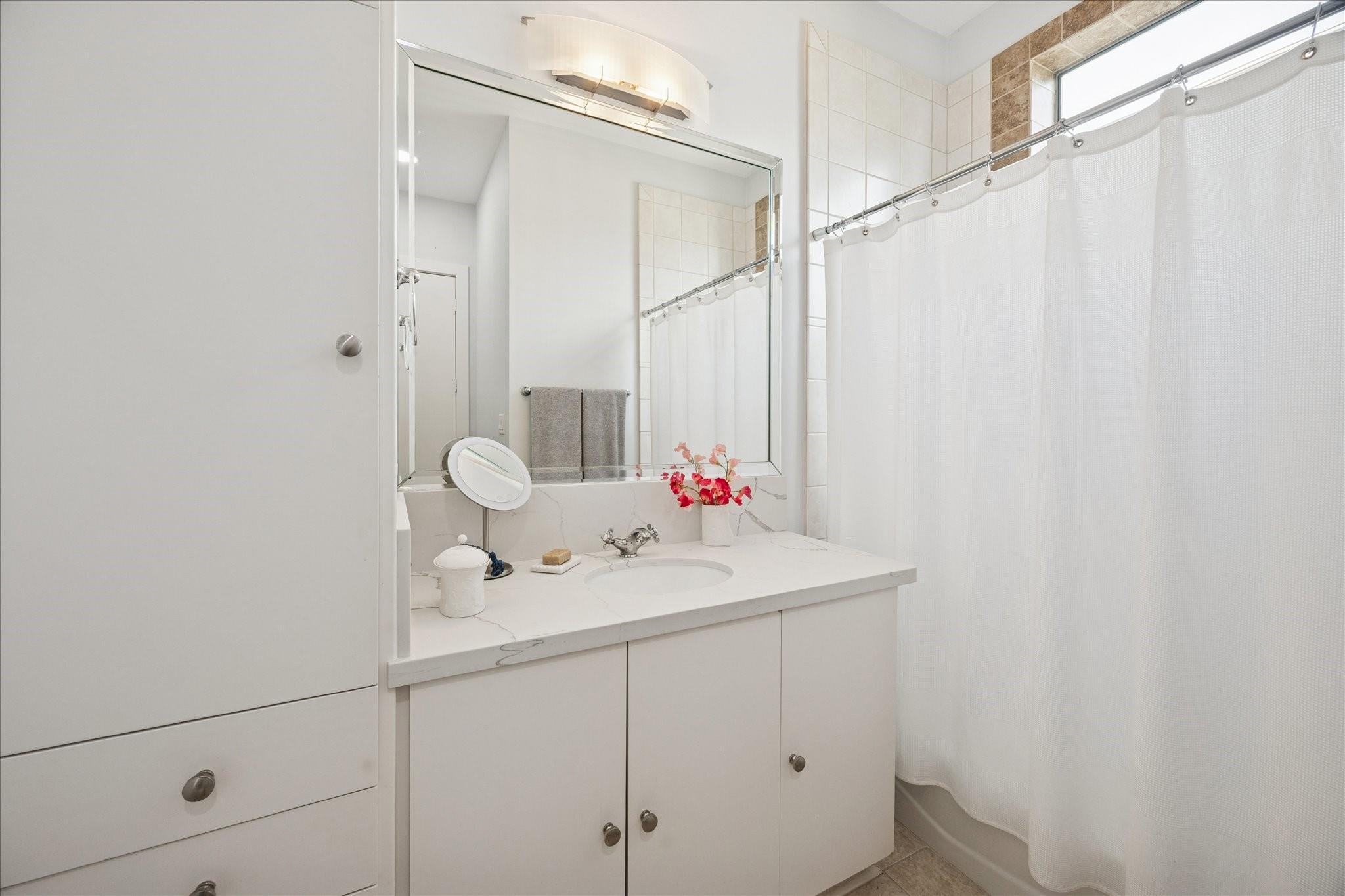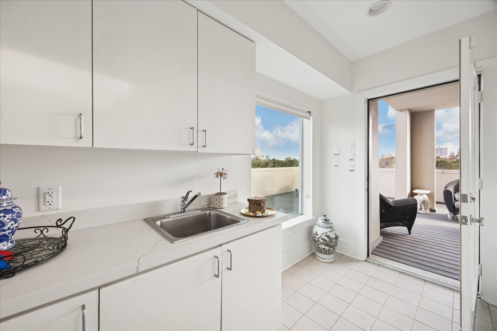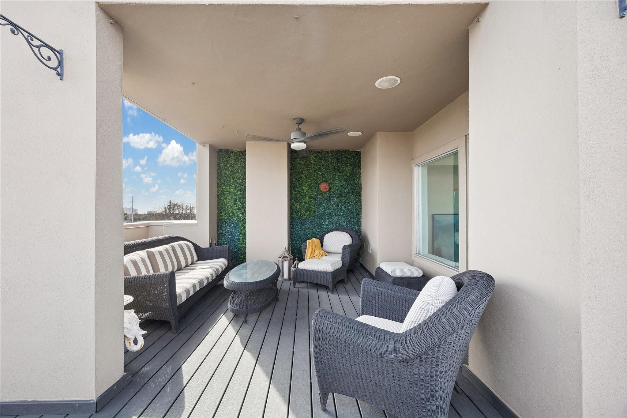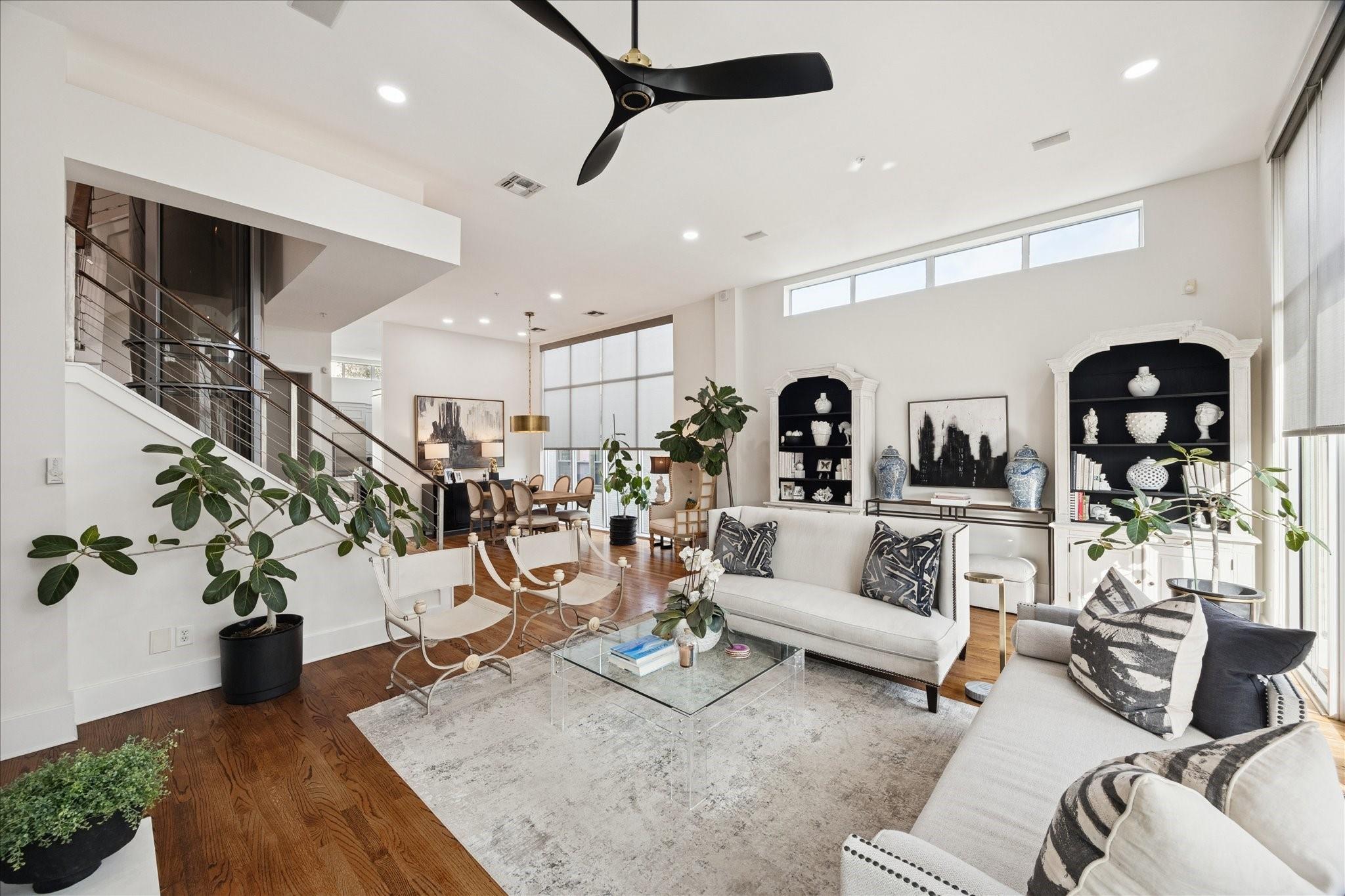 This beautifully renovated modern townhome is a must see! Conveniently situated near Rice U and renowned Texas Medical Center. This home features: a tranquil private courtyard. Enter into an elegant marble foyer to access a guest suite equipped with its own separate entry; including an ensuite bathroom. Observe the custom pneumatic elevator that lifts you to each floor. Gorgeous oak flooring in most spaces, tile or marble in bathrooms. Level 2 offers an entertaining space that is open and inviting with an abundance of natural light shining through the oversized windows; tinting added for energy efficiency, 12' ceilings. A large gourmet island kitchen with quartz counters, lovely backsplash, stainless steel appliances. Level 3 has a walk-in laundry, secondary bedroom, and primary suite with a spa-like ensuite bathroom with soaker tub, separate shower, and water closet. Level 4 has breathtaking views. Relax on the wrap-around deck and lounging space. Close to museums, dining, shopping.