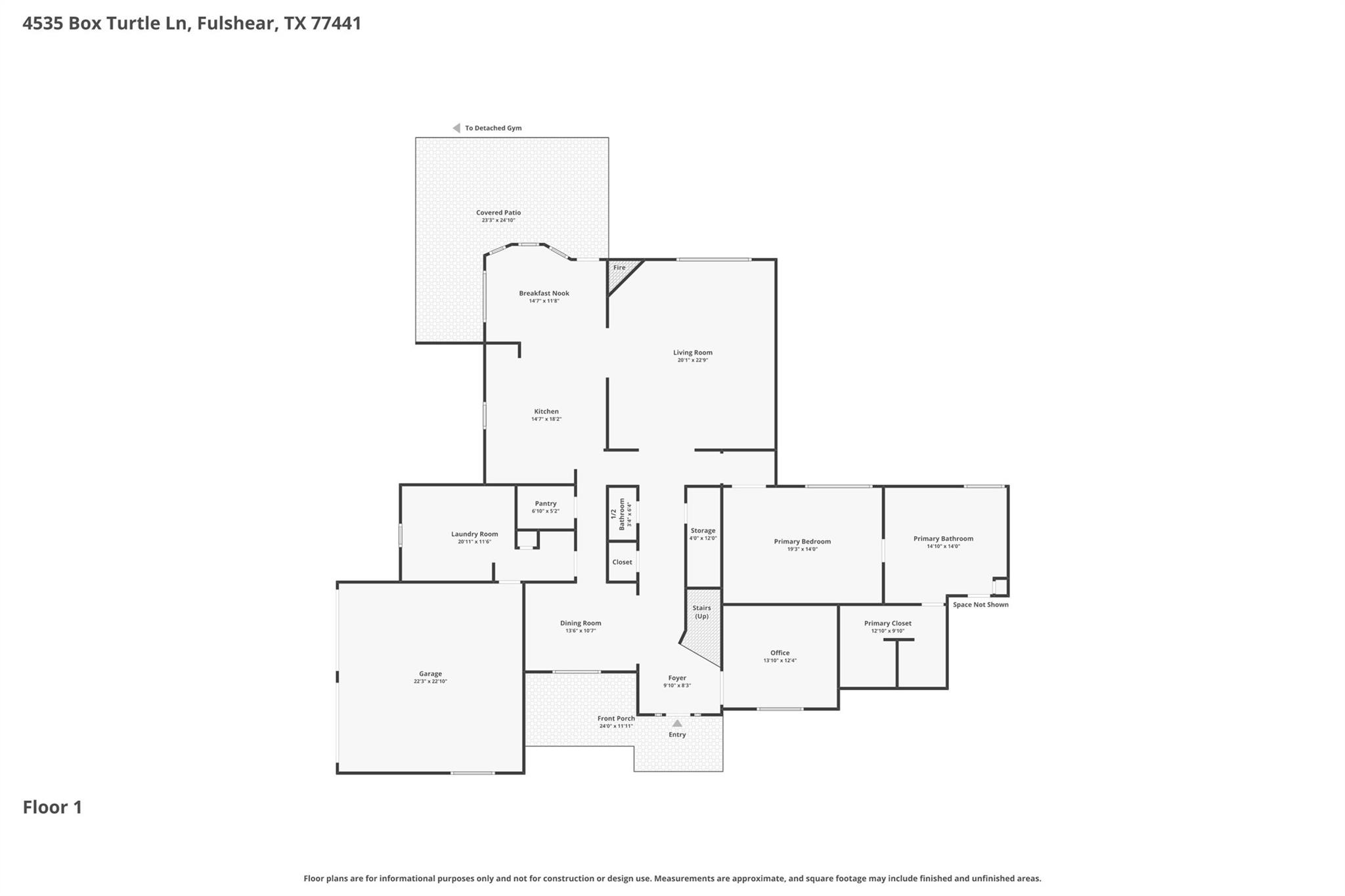 First FloorLiving:23x20Dining:14X11Kitchen:18x15Breakfast:15x12Primary Bedroom:20X14Primary Bath:15x14Home Office/Study:14X12Utility Room:21X12