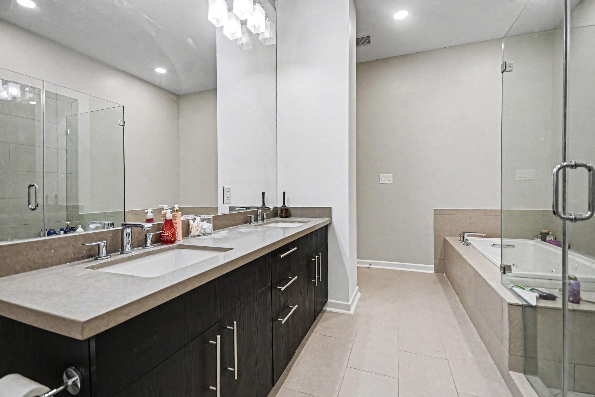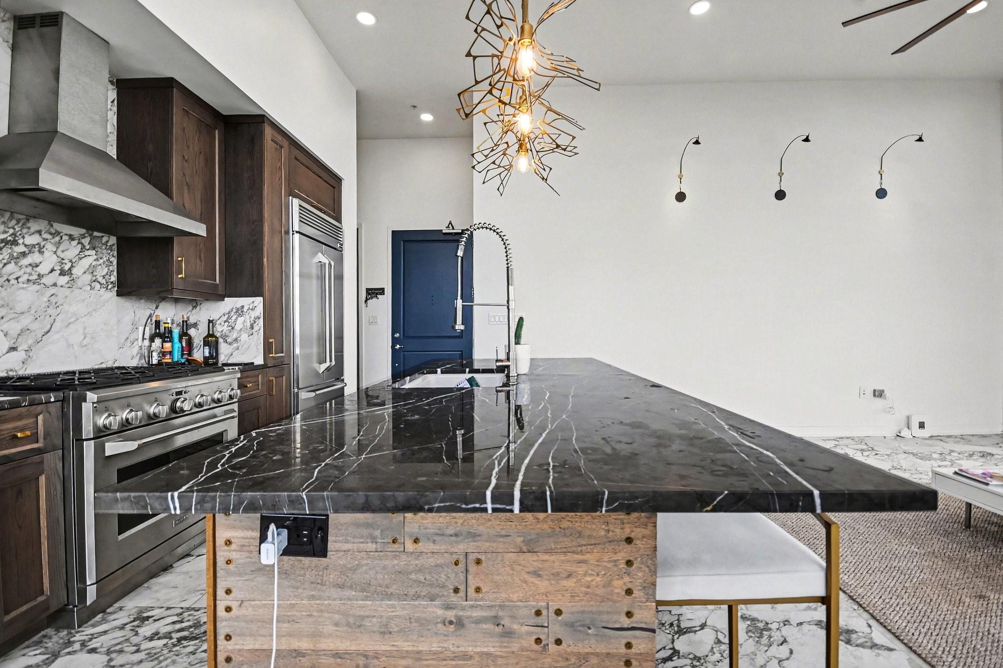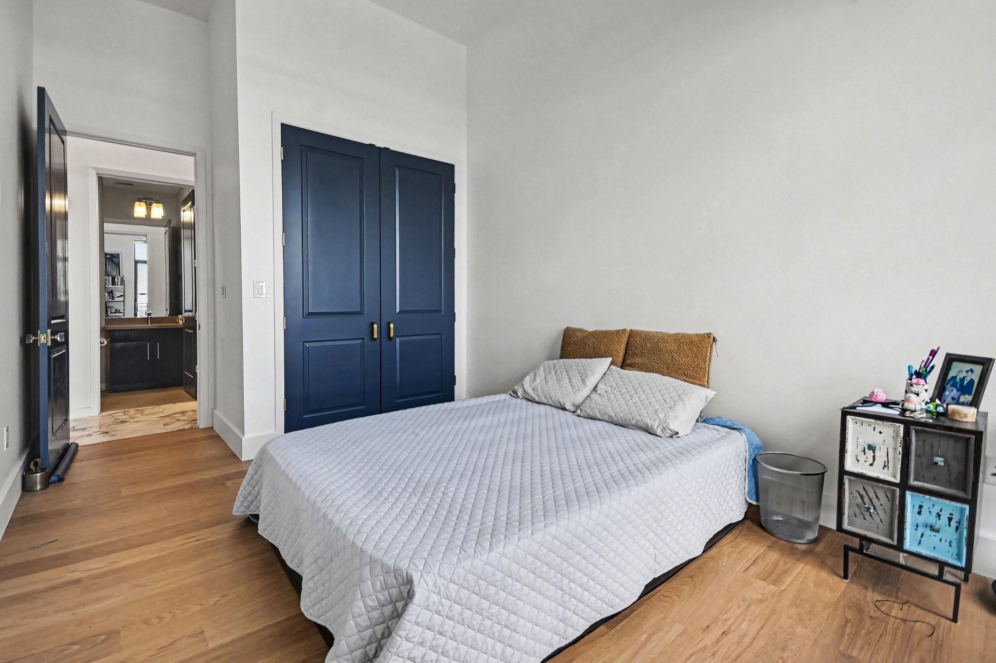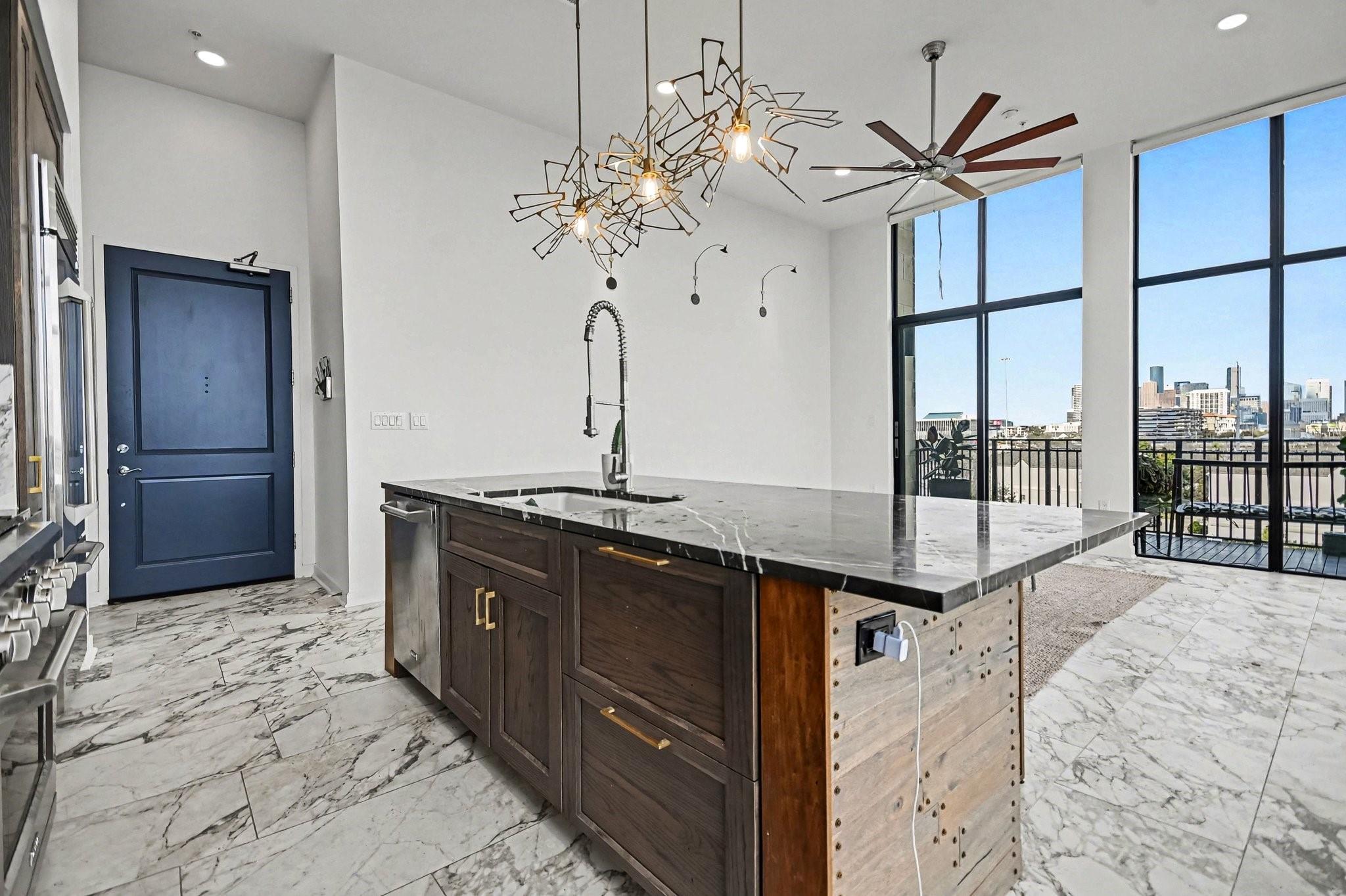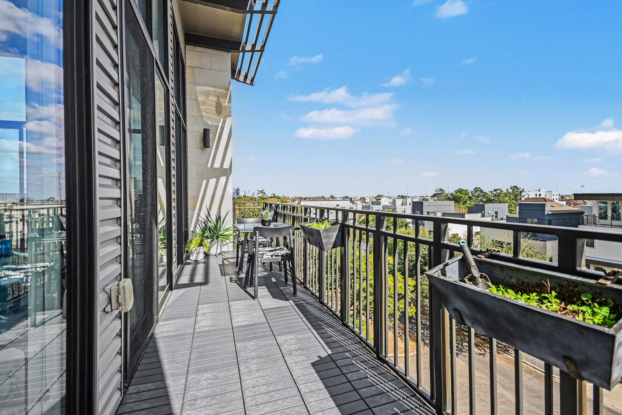 Welcome to this stunning corner, top floor mid-rise residence offering elevated city living with style and comfort. The open concept living area is filled with natural light and opens to two private balconies, one with skyline views and the other overlooking treetops, creating the perfect setting to relax. Soaring 12-foot ceilings enhance the sense of space throughout. The modern kitchen features a large island with bar seating and high end gourmet appliances. The primary suite enjoys the same beautiful views and includes an ensuite bath with dual sinks, a soaking tub, a walk-in shower, and a walk-in closet. A secondary bedroom offers flexibility for guests, a home office, or additional living space. Ideally located just minutes from Hermann Park, the Museum District, the Houston Zoo, and popular dining and coffee spots, with nearby light rail access. Assigned covered parking and easy access to entertainment, shopping, and green spaces complete this exceptional urban home.