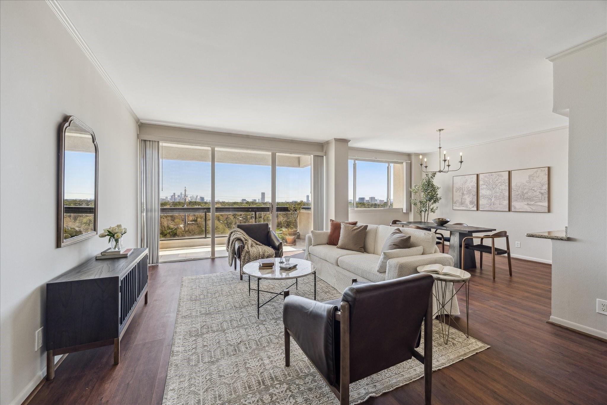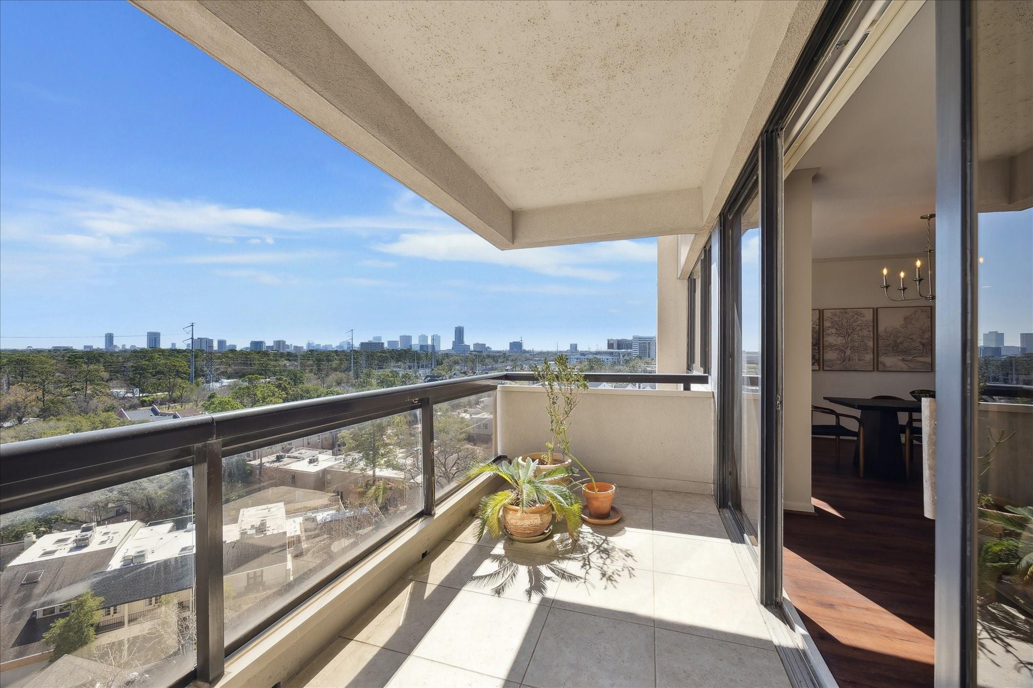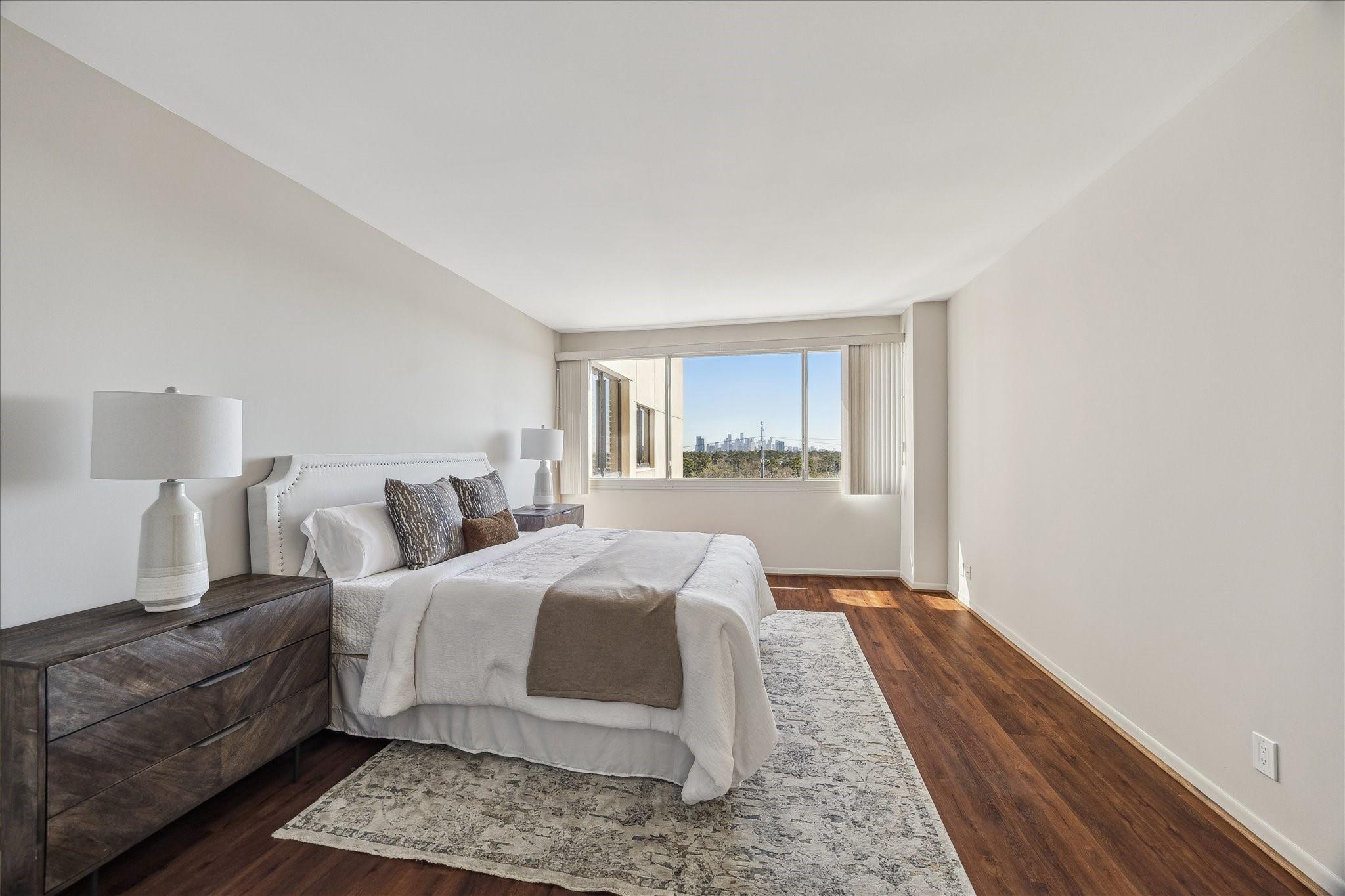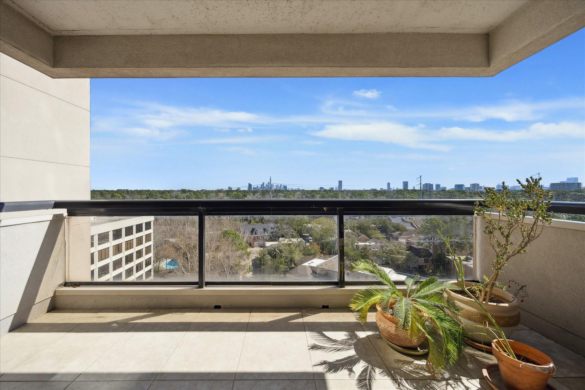 Welcome to one of the best views you could wish for in Houston! This wonderful 10th-floor residence offers gorgeous sunrise views overlooking Memorial Park and downtown Houston daily. Enjoy the magical scenery from your spacious private balcony while sipping on your money coffee. The floor to ceiling windows facing the East, let in plenty of welcoming natural light. Newly Painted, this spacious 1740 sq ft condo has 2 bedrooms, 2 baths, features an open concept living area, updated kitchen and appliances, and wood flooring throughout. There is built in storage cabinets throughout, closets, utility room, and a generously sized primary suite with an ensuite bath and large walk in closet. Bosch HVAC 3 yrs. Frigidaire refrigerator 2 yrs. Dishwasher 3 yrs. Residents enjoy a full-servie lifestyle with 24-hour concierge, security, tennis/pickleball courts, pool, fire pit, dog run, and even a spa, and a party room. Schedule your tour today!