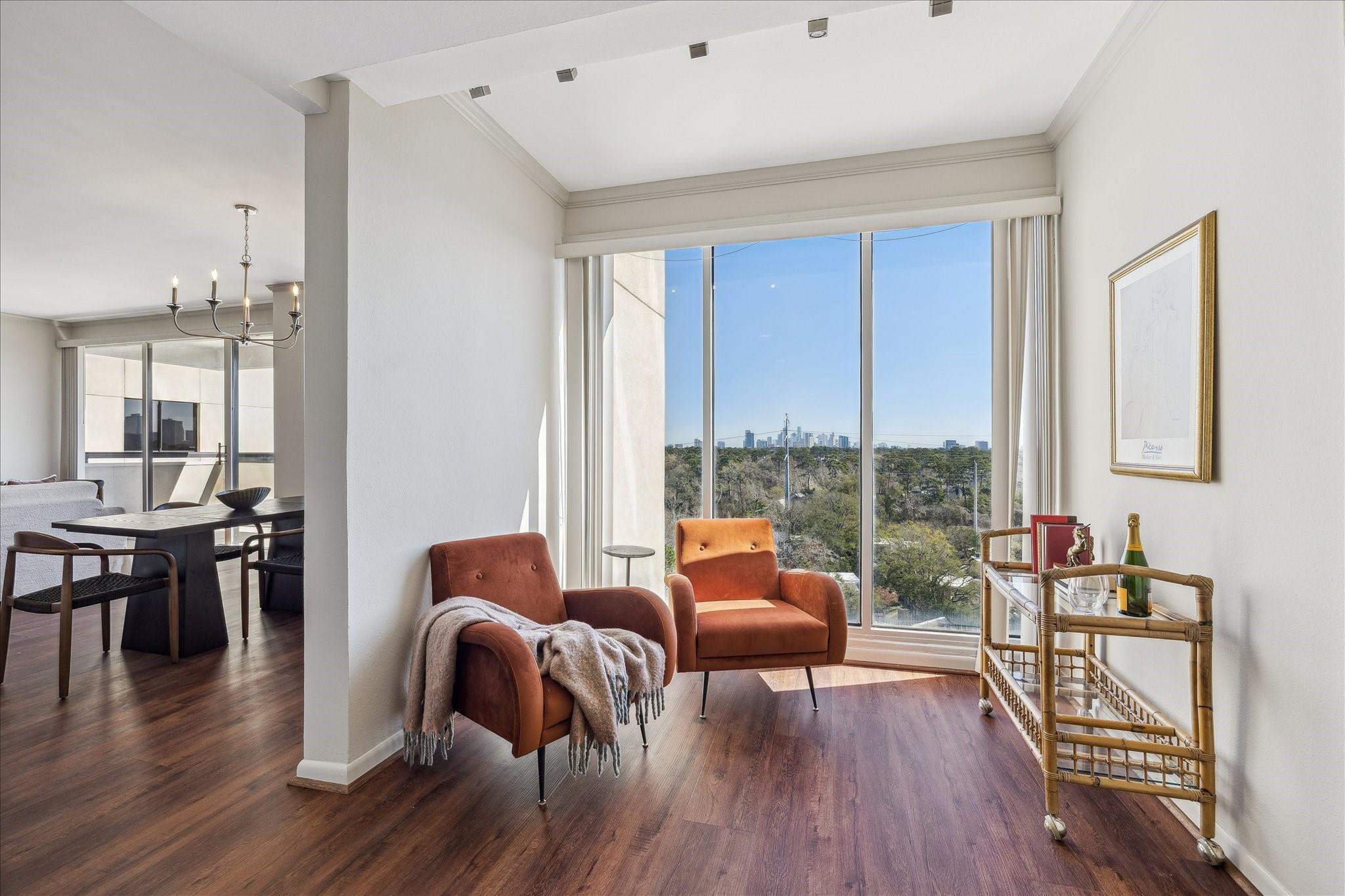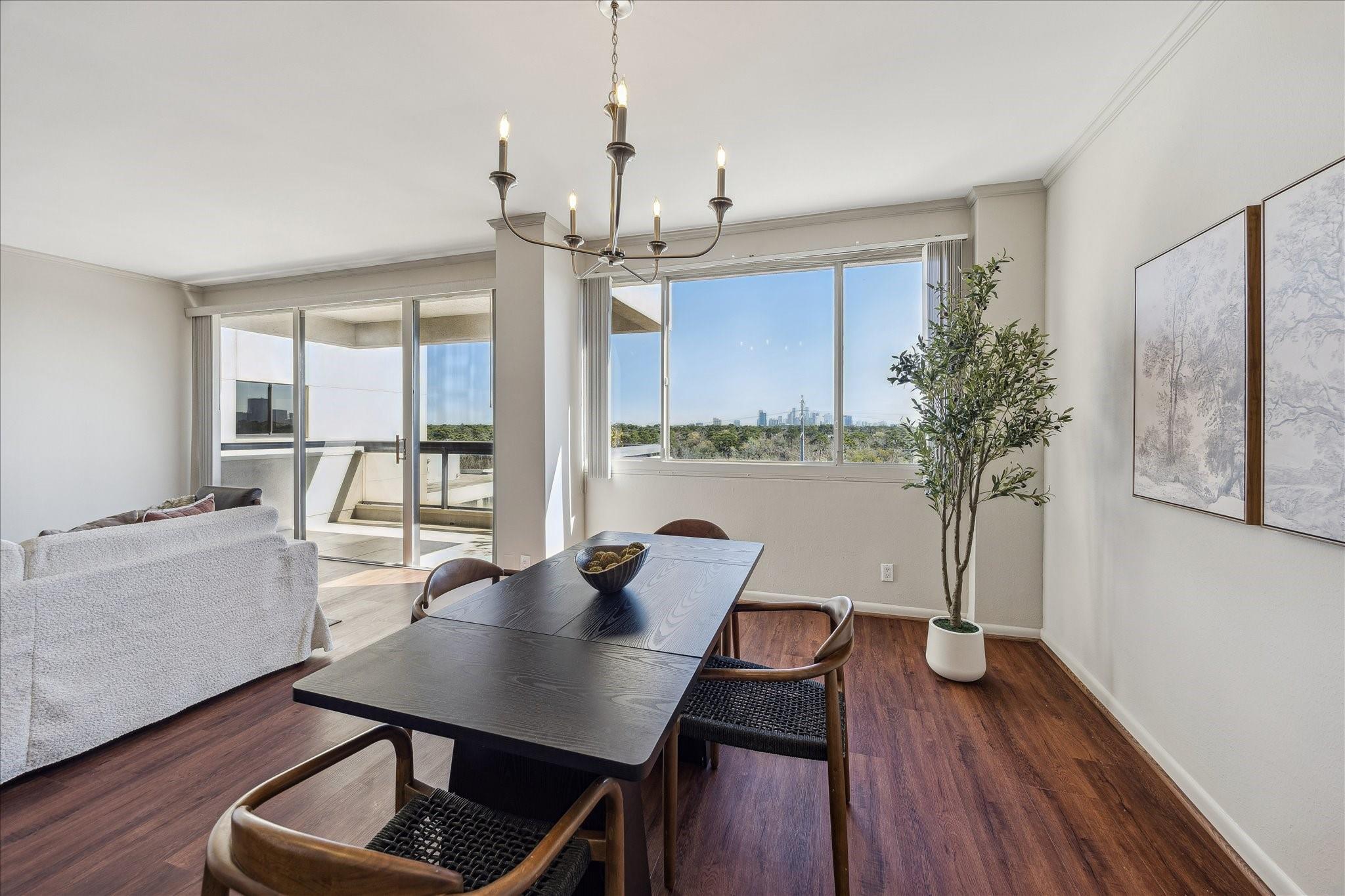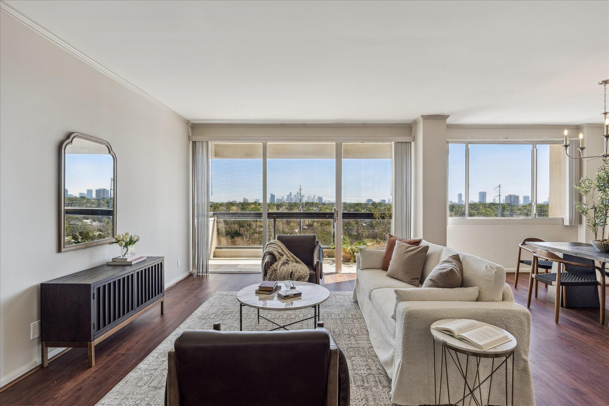 Welcome to one of the best views you could wish for in Houston! This wonderful 10th-floor residence offers gorgeous sunrise views overlooking Memorial Park and downtown Houston daily. Enjoy the magical scenery from your spacious private balcony while sipping on your money coffee. The floor to ceiling windows facing the East, let in plenty of welcoming natural light. Newly Painted, this spacious 1740 sq ft condo has 2 bedrooms, 2 baths, features an open concept living area, updated kitchen and appliances, and wood flooring throughout. There is built in storage cabinets throughout, closets, utility room, and a generously sized primary suite with an ensuite bath and large walk in closet. Bosch HVAC 3 yrs. Frigidaire refrigerator 2 yrs. Dishwasher 3 yrs. Residents enjoy a full-servie lifestyle with 24-hour concierge, security, tennis/pickleball courts, pool, fire pit, dog run, and even a spa, and a party room. Schedule your tour today!