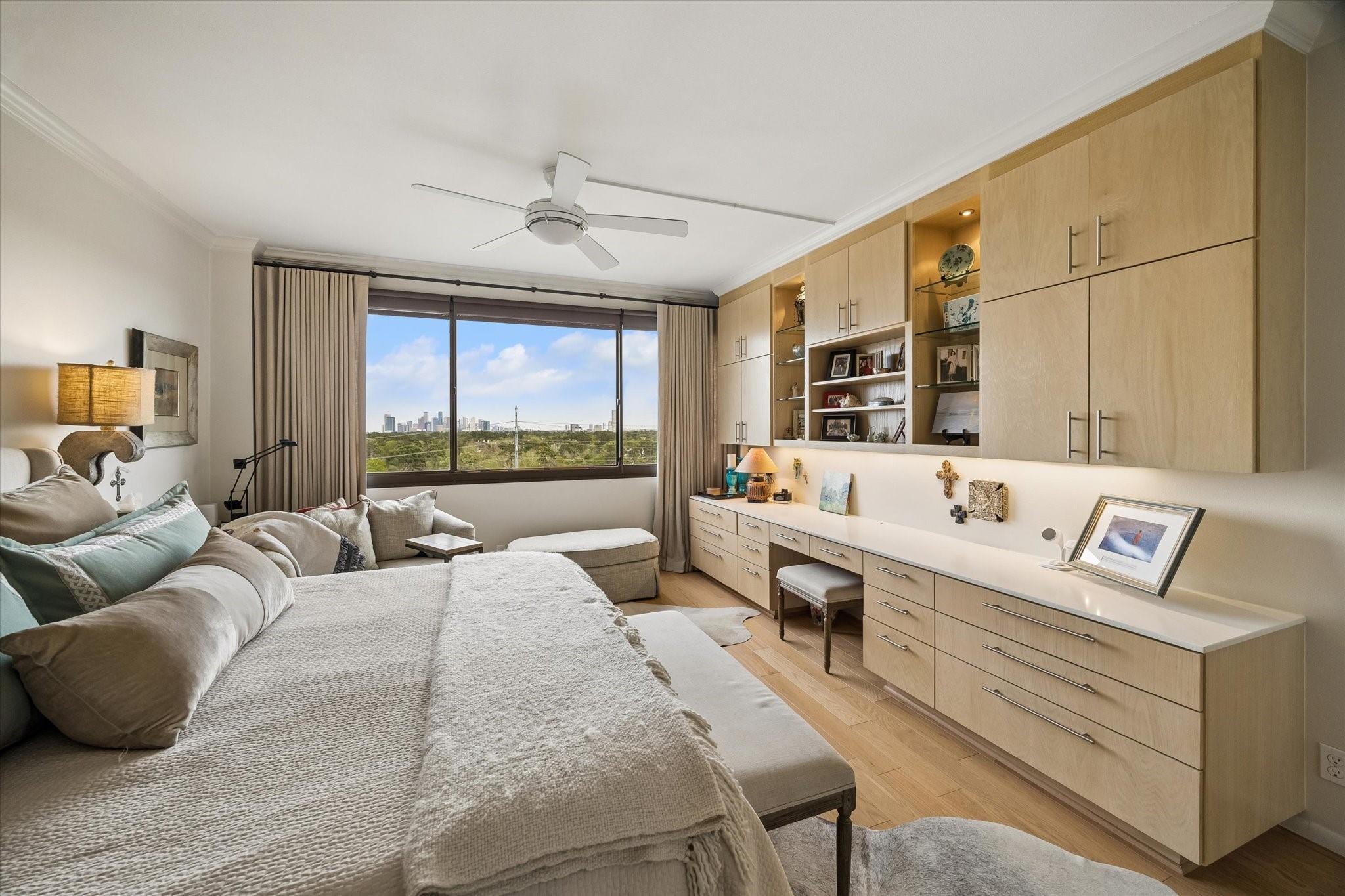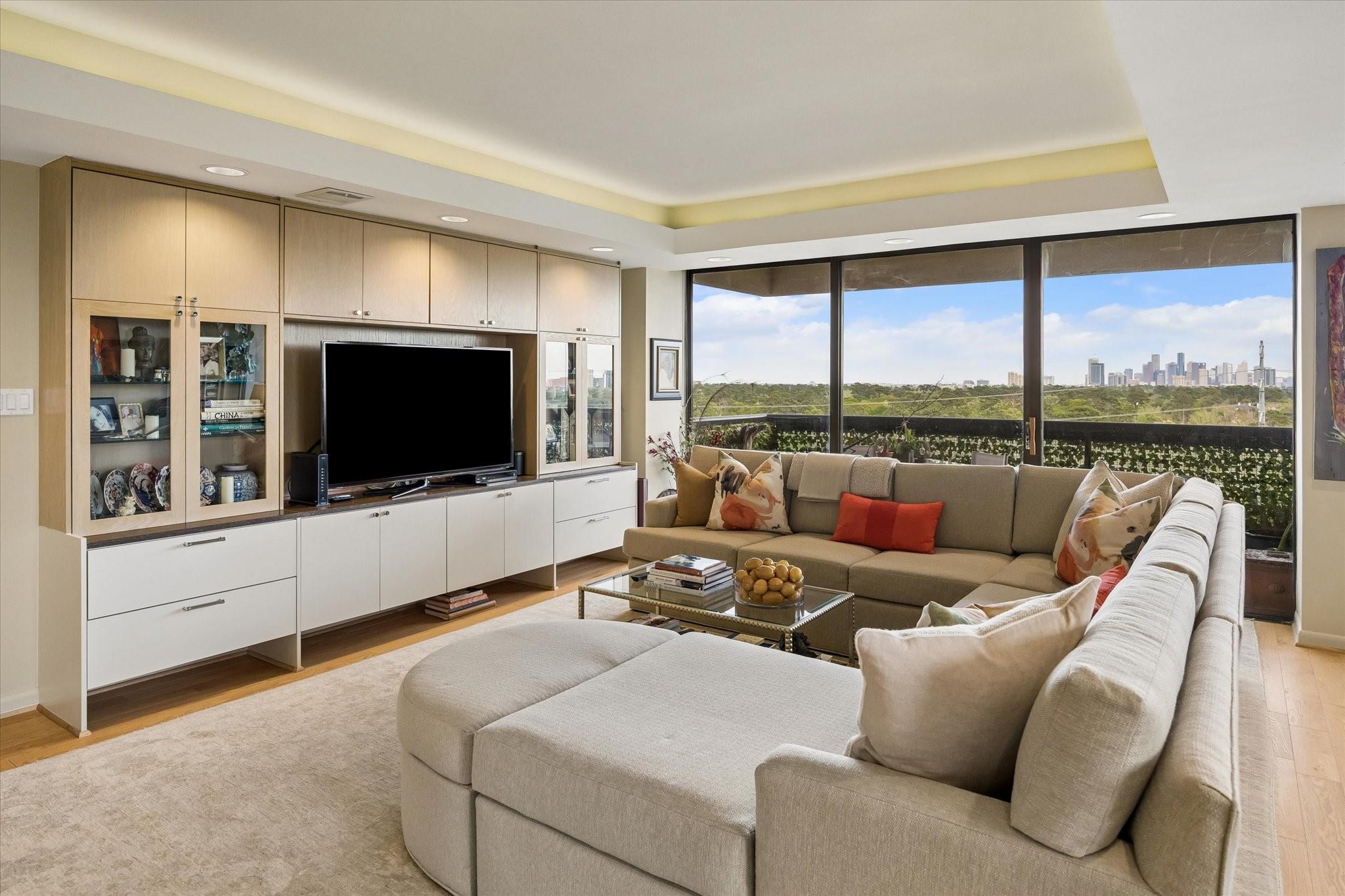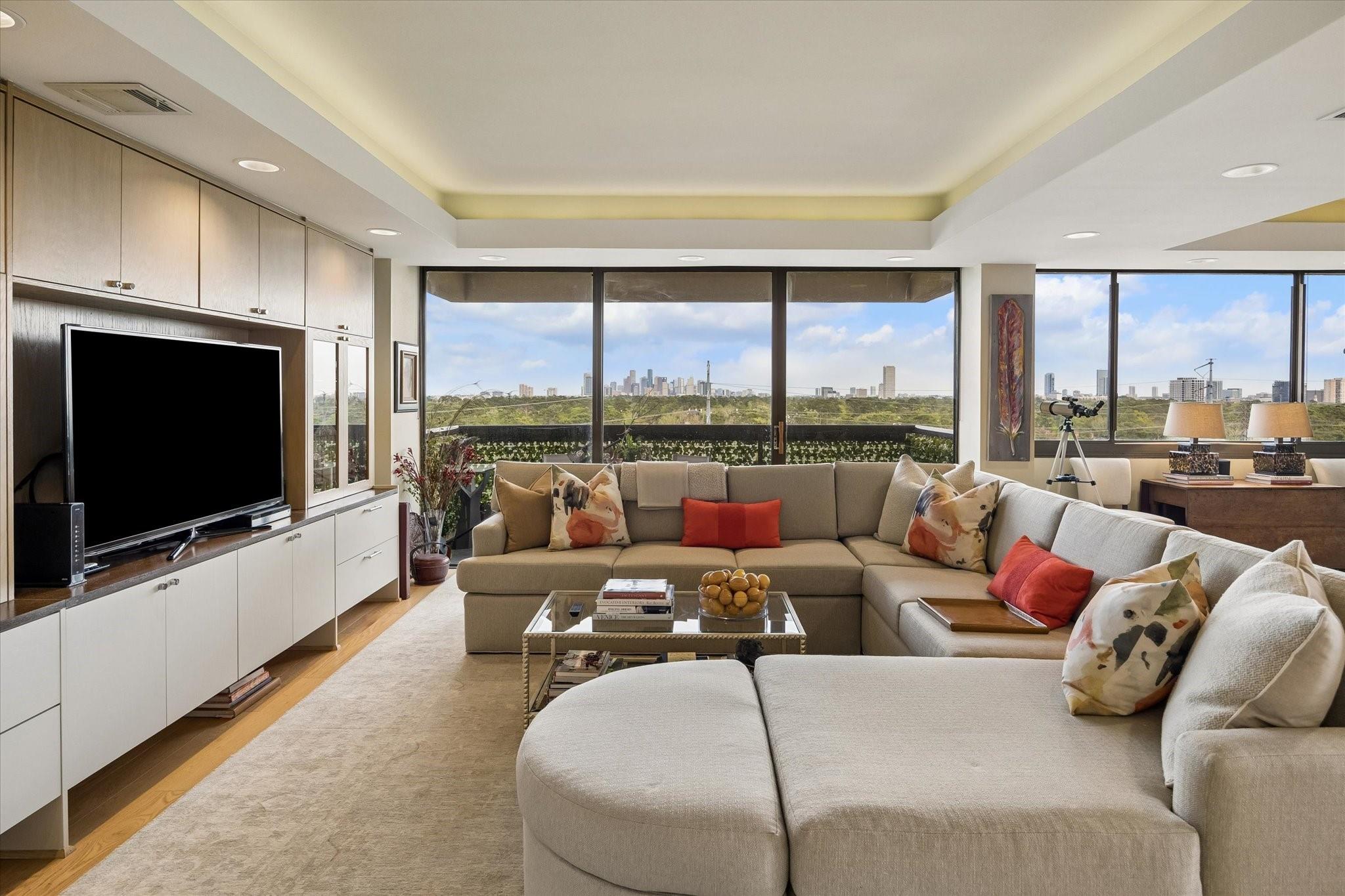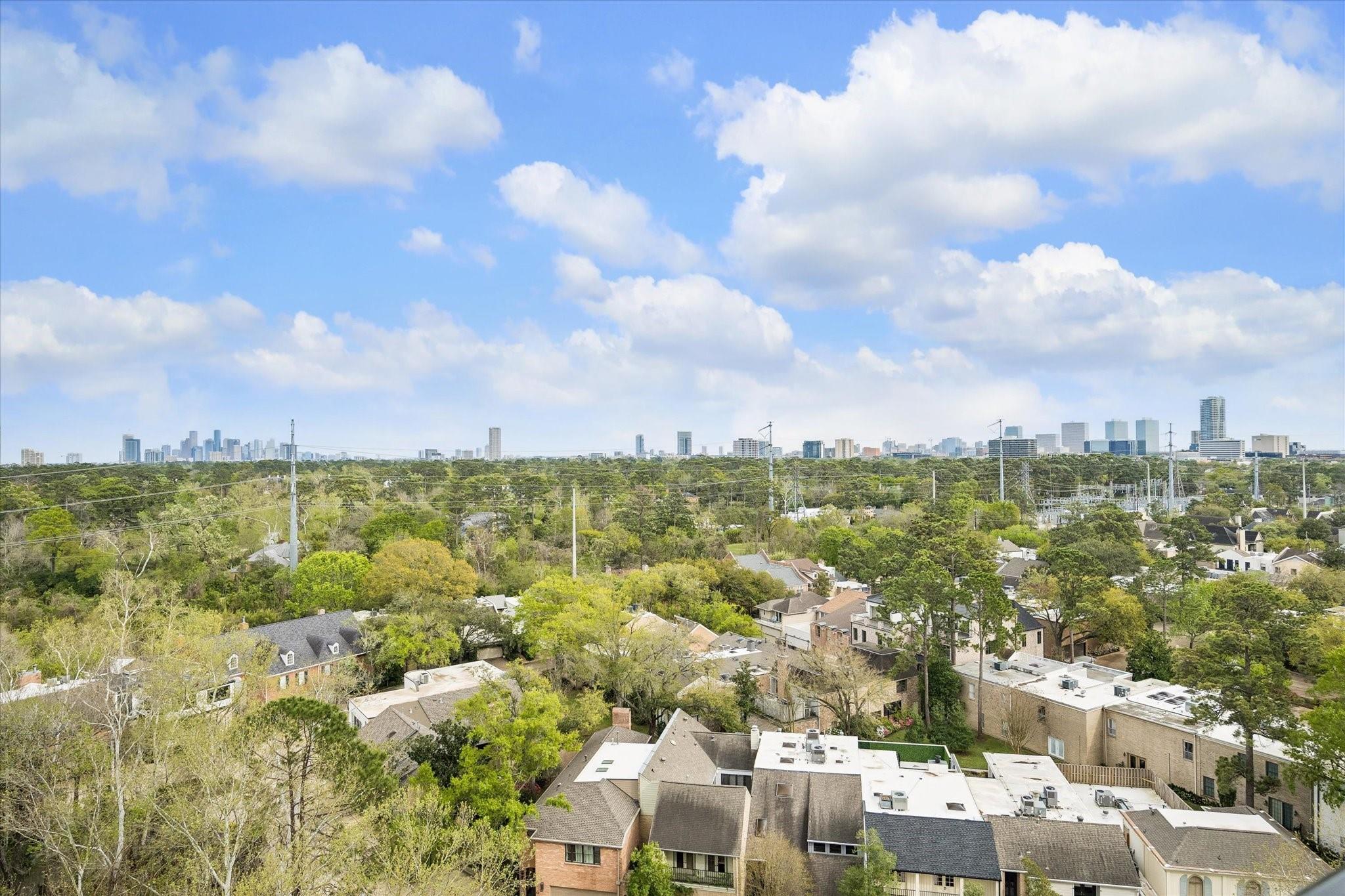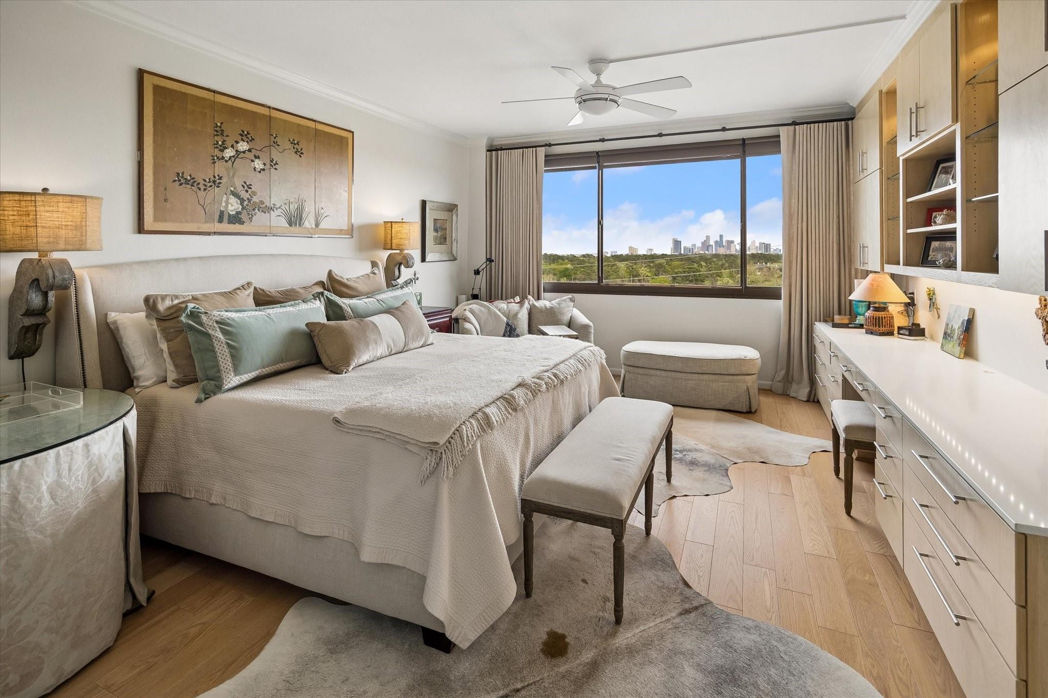 Stunningly renovated 2-bedroom, 2-bath residence, plus study. Expansive Downtown views across Memorial Park and River Oaks, plus additional southern vistas toward Greenway Plaza. Soft neutral tones, handsome stone and hardwood floors create a sophisticated interior. The combined living and dining area features recessed tray ceilings with cove lighting and is open to the kitchen and breakfast area. A large balcony off the living room offers room for entertaining, while a second balcony at the end of the kitchen provides additional outdoor space. Sleek built-ins throughout the unit provide multiple storage opportunities. The primary suite features built-ins, a walk-in closet with custom storage, and a bath with double sinks and separate shower and commode room. Laundry room with sink. Two assigned parking spaces. Guard-gated building with 24-hour security, pool, tennis, pet area, party room, and fitness center in a fantastic Inner Loop location.
