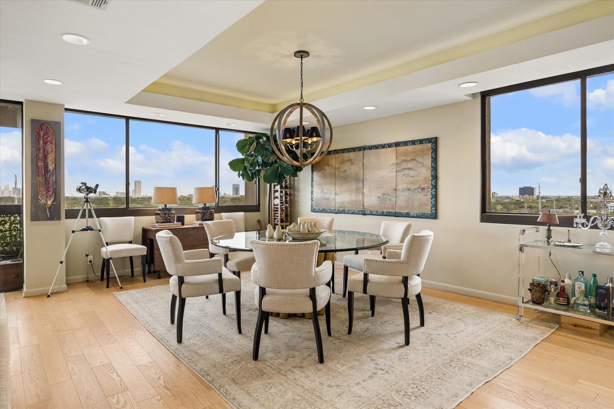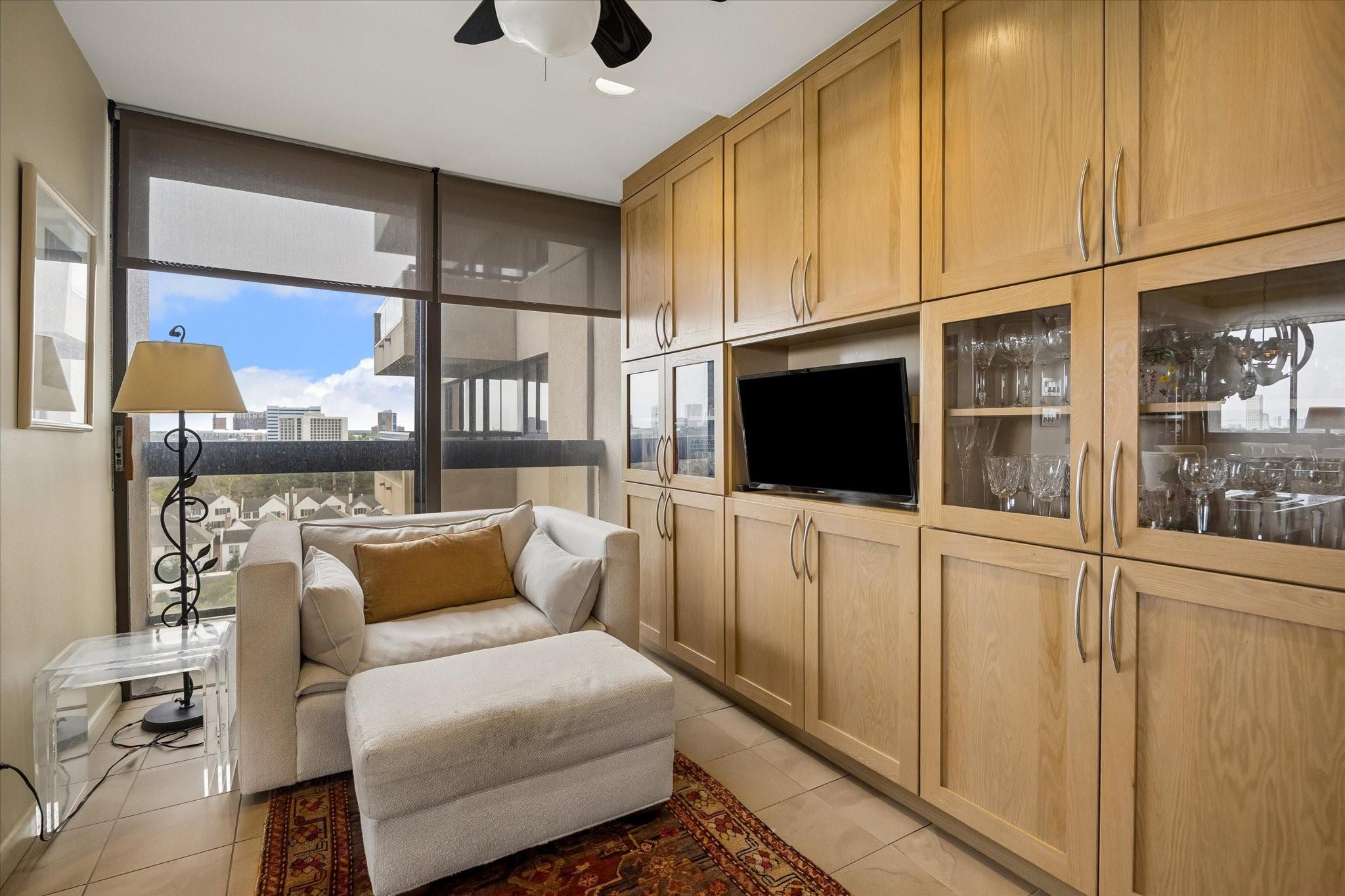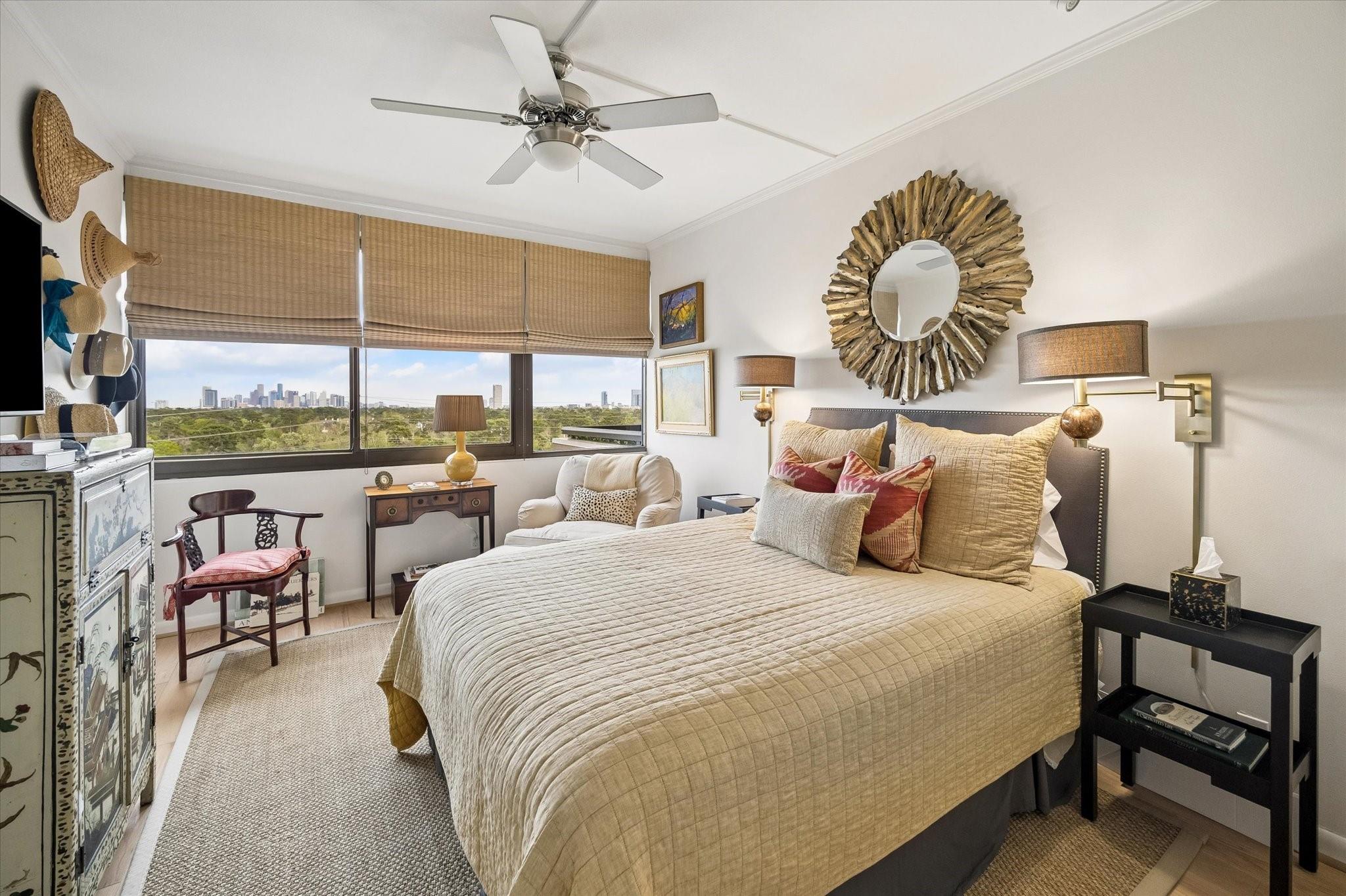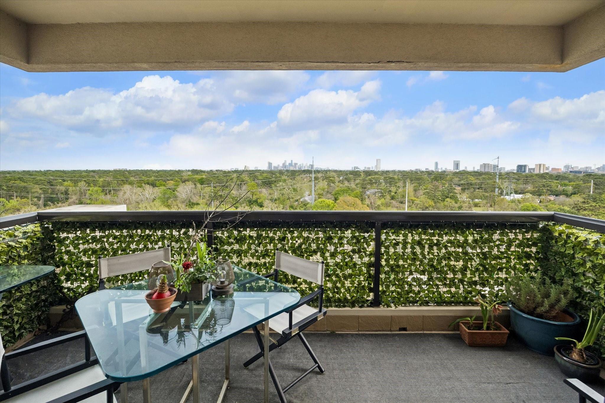Stunningly renovated 2-bedroom, 2-bath residence, plus study. Expansive Downtown views across Memorial Park and River Oaks, plus additional southern vistas toward Greenway Plaza. Soft neutral tones, handsome stone and hardwood floors create a sophisticated interior. The combined living and dining area features recessed tray ceilings with cove lighting and is open to the kitchen and breakfast area. A large balcony off the living room offers room for entertaining, while a second balcony at the end of the kitchen provides additional outdoor space. Sleek built-ins throughout the unit provide multiple storage opportunities. The primary suite features built-ins, a walk-in closet with custom storage, and a bath with double sinks and separate shower and commode room. Laundry room with sink. Two assigned parking spaces. Guard-gated building with 24-hour security, pool, tennis, pet area, party room, and fitness center in a fantastic Inner Loop location.