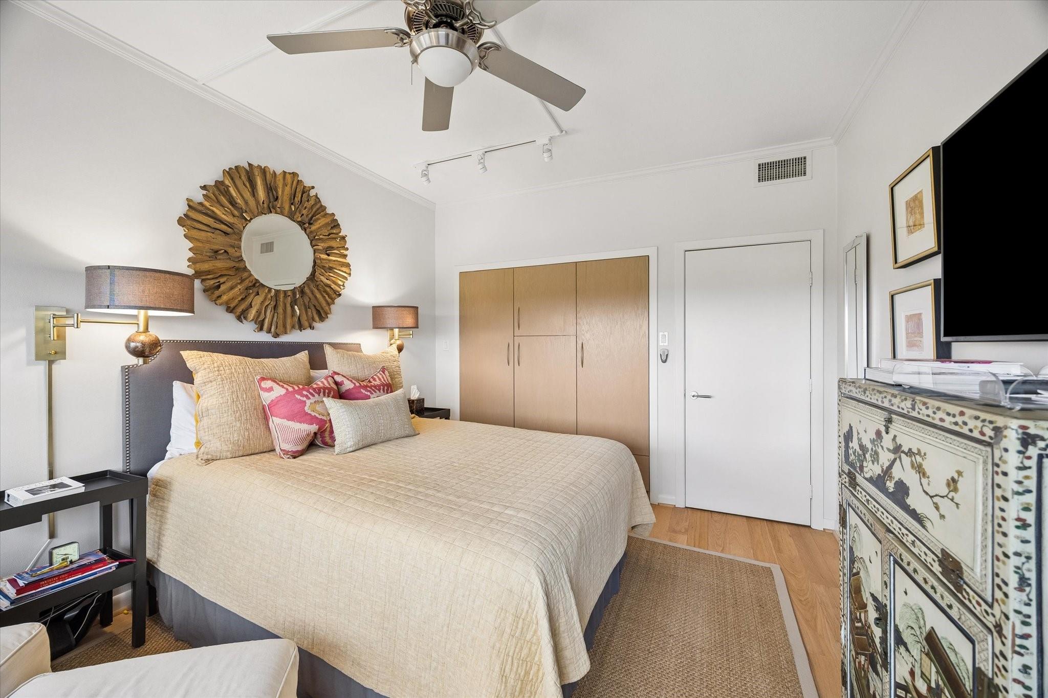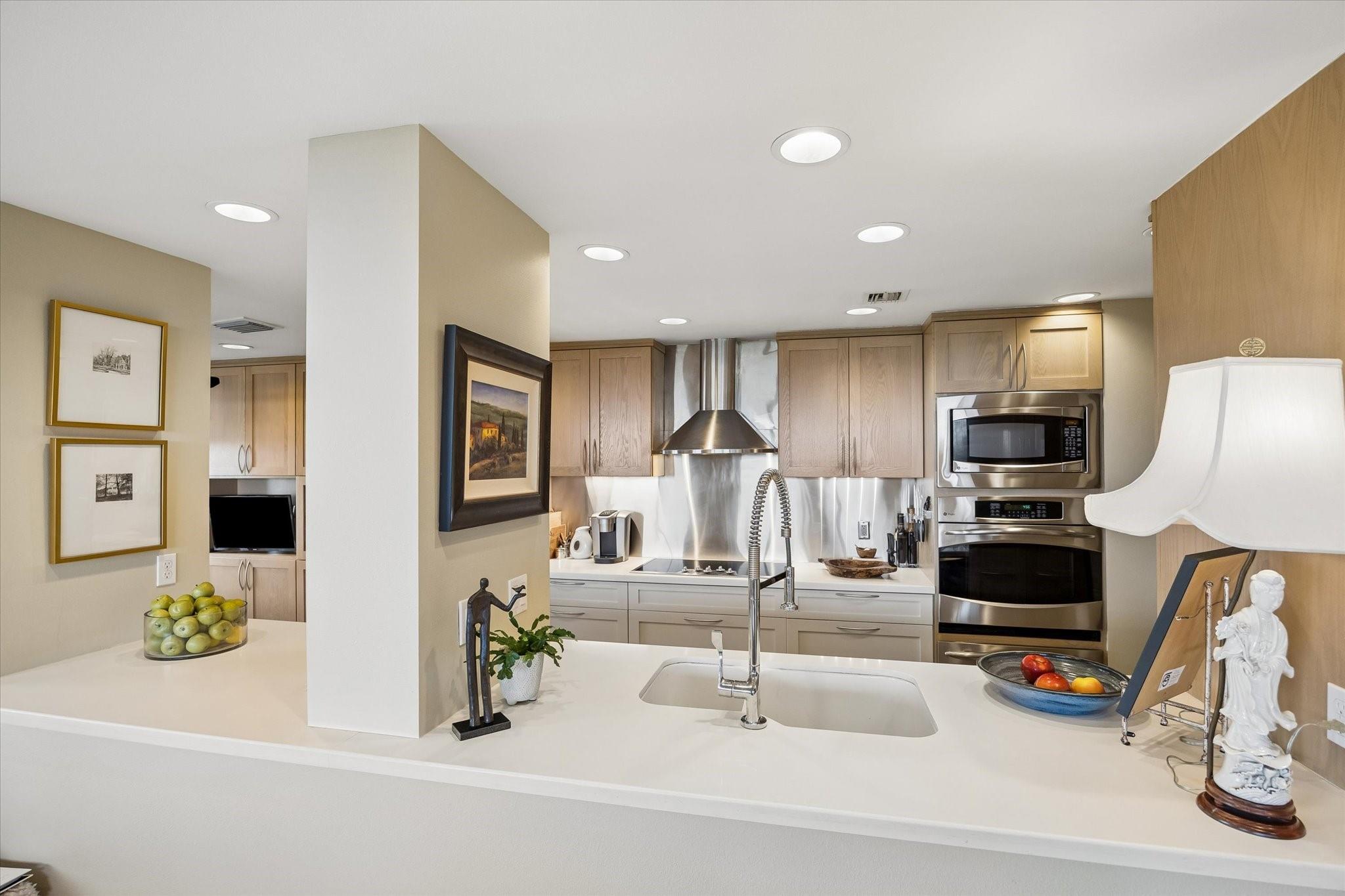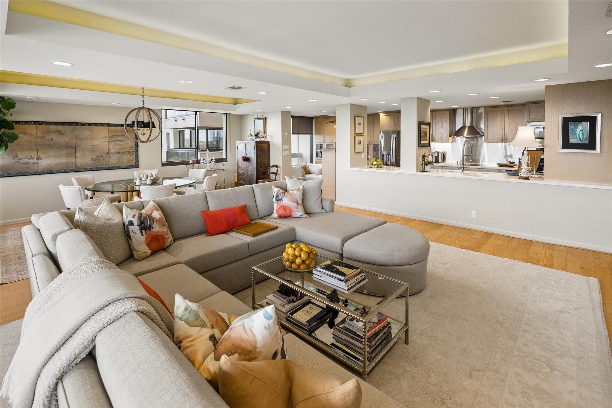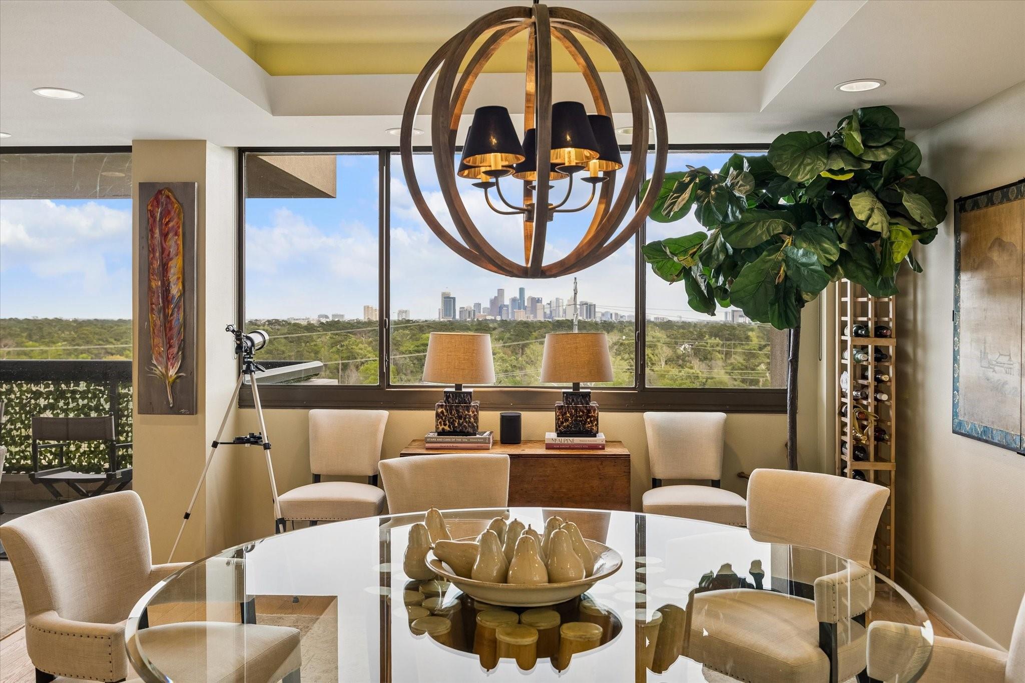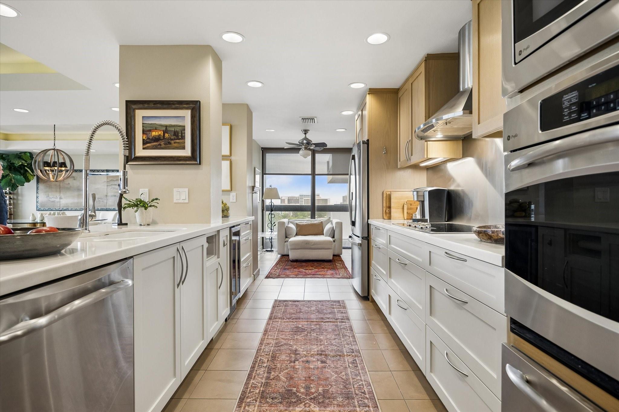 Stunningly renovated 2-bedroom, 2-bath residence, plus study. Expansive Downtown views across Memorial Park and River Oaks, plus additional southern vistas toward Greenway Plaza. Soft neutral tones, handsome stone and hardwood floors create a sophisticated interior. The combined living and dining area features recessed tray ceilings with cove lighting and is open to the kitchen and breakfast area. A large balcony off the living room offers room for entertaining, while a second balcony at the end of the kitchen provides additional outdoor space. Sleek built-ins throughout the unit provide multiple storage opportunities. The primary suite features built-ins, a walk-in closet with custom storage, and a bath with double sinks and separate shower and commode room. Laundry room with sink. Two assigned parking spaces. Guard-gated building with 24-hour security, pool, tennis, pet area, party room, and fitness center in a fantastic Inner Loop location.