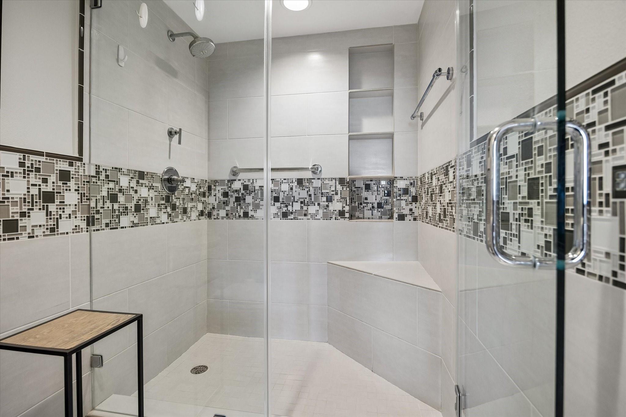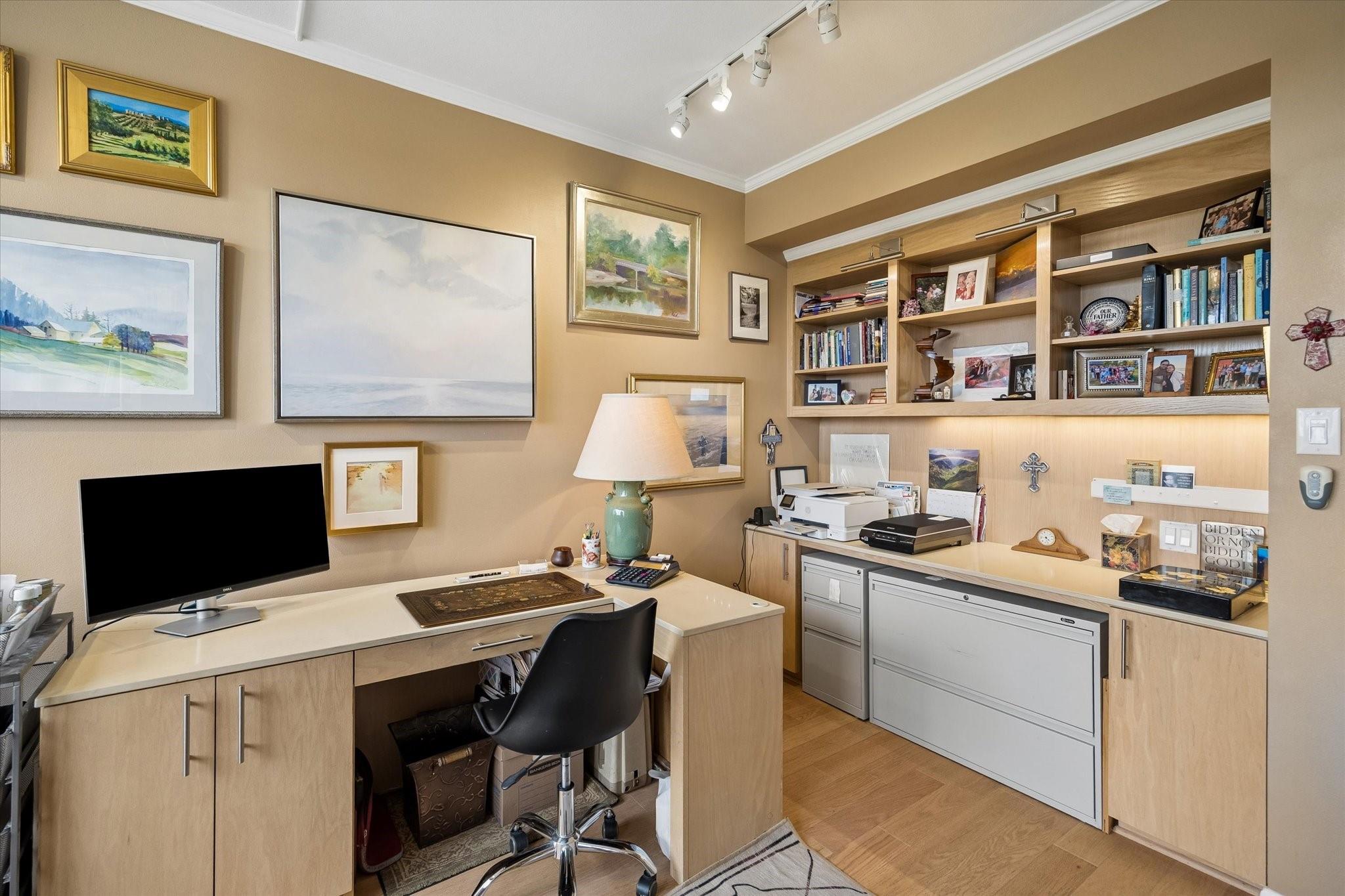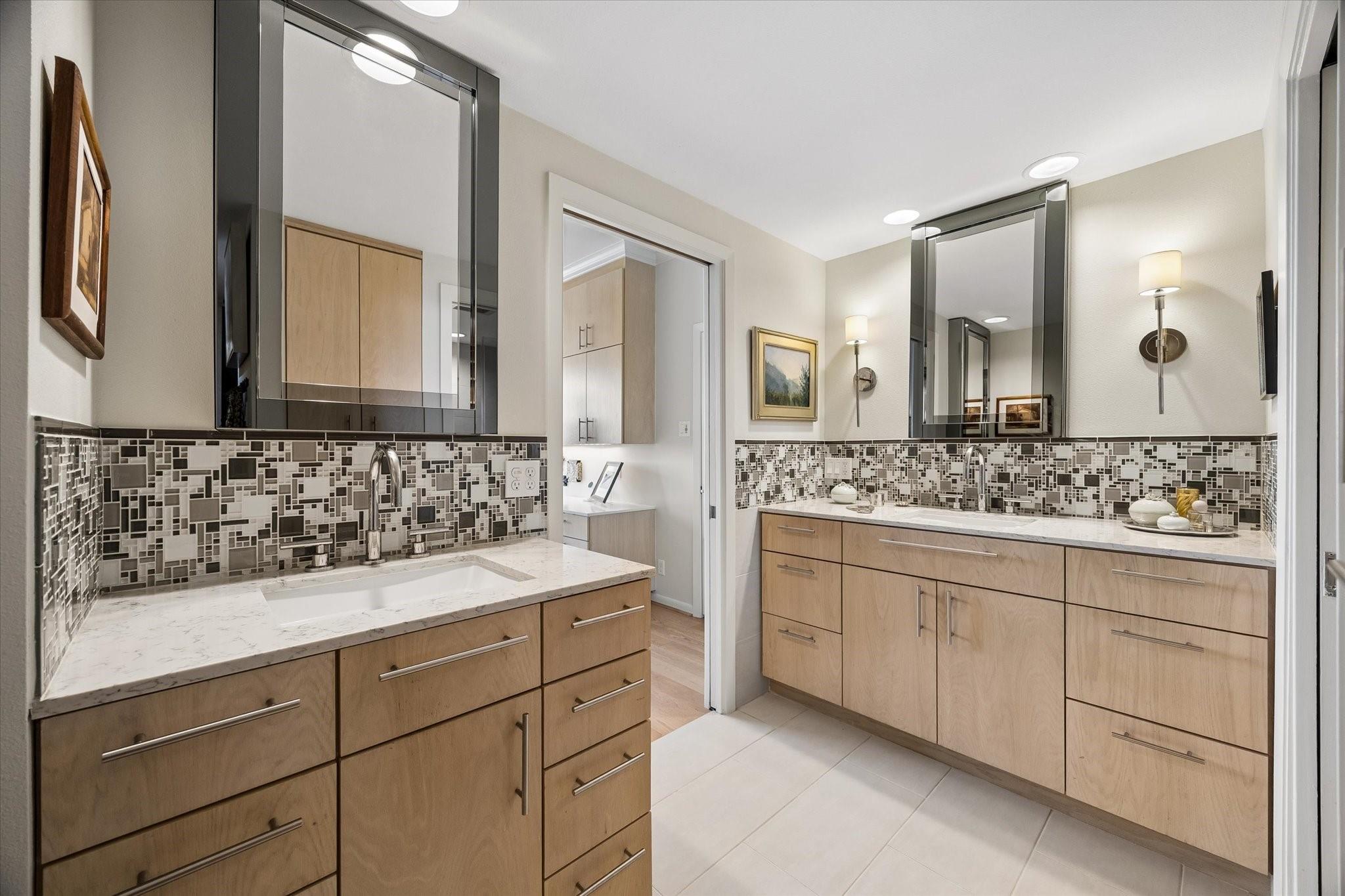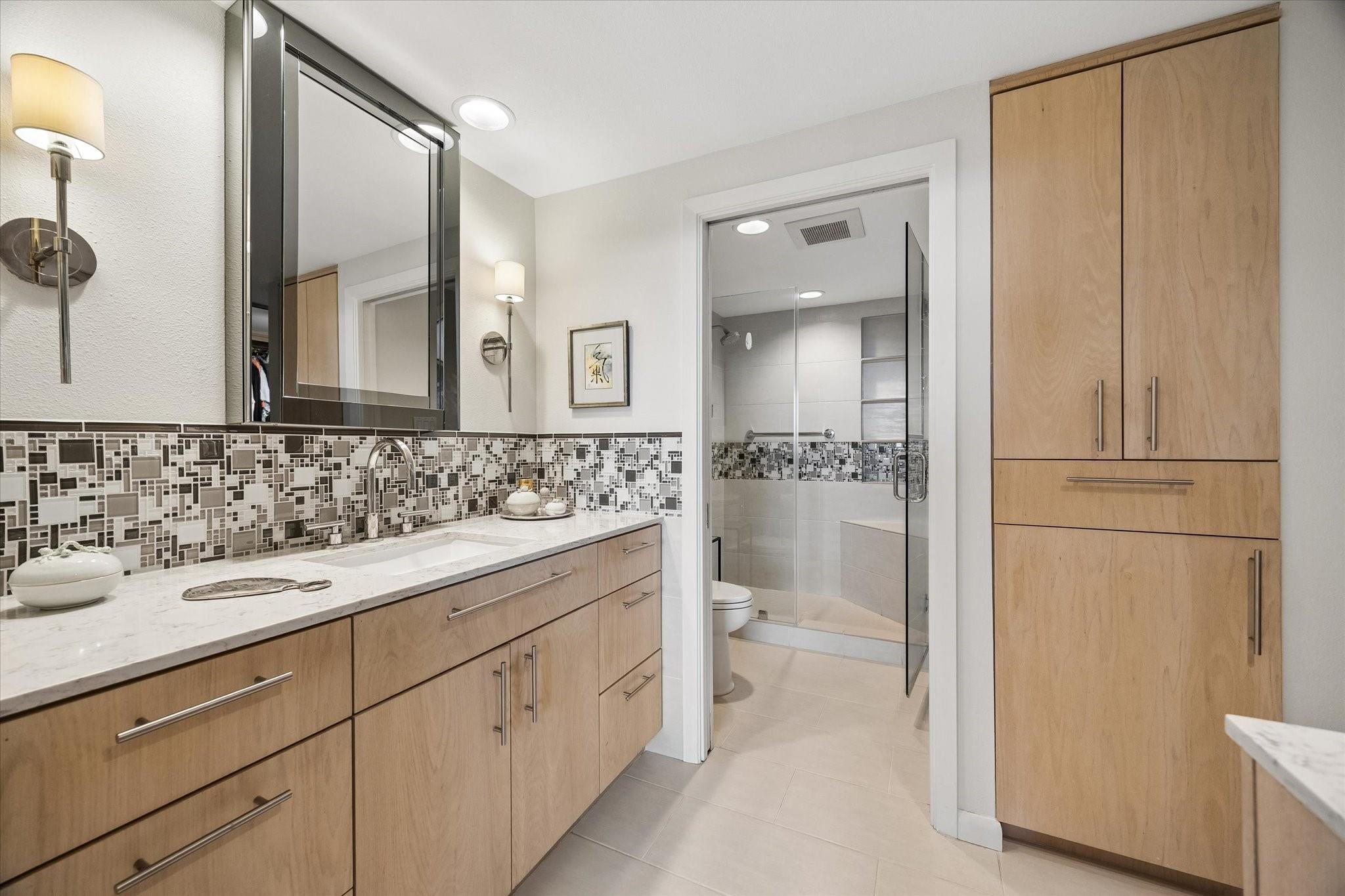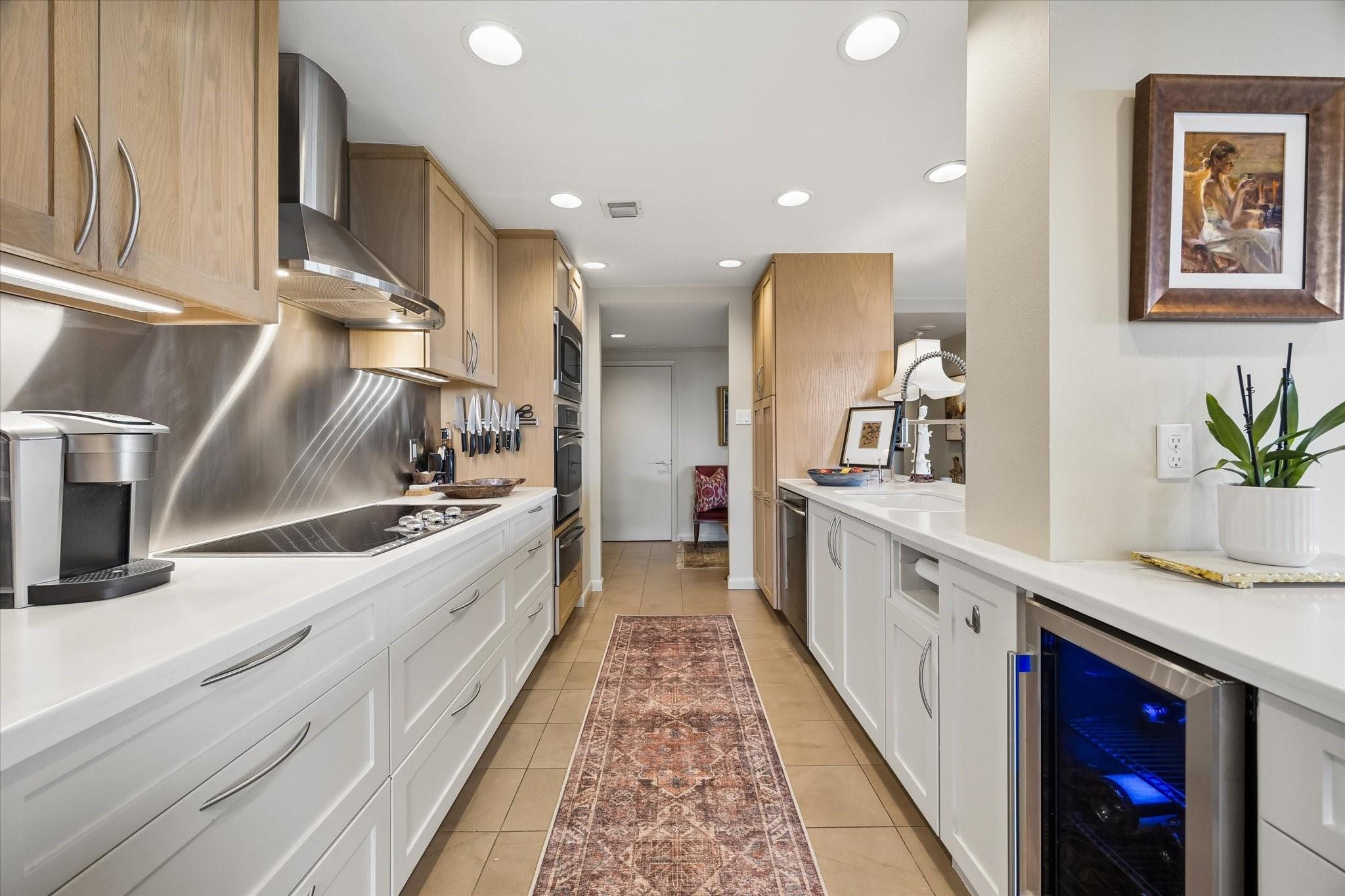 Stunningly renovated 2-bedroom, 2-bath residence, plus study. Expansive Downtown views across Memorial Park and River Oaks, plus additional southern vistas toward Greenway Plaza. Soft neutral tones, handsome stone and hardwood floors create a sophisticated interior. The combined living and dining area features recessed tray ceilings with cove lighting and is open to the kitchen and breakfast area. A large balcony off the living room offers room for entertaining, while a second balcony at the end of the kitchen provides additional outdoor space. Sleek built-ins throughout the unit provide multiple storage opportunities. The primary suite features built-ins, a walk-in closet with custom storage, and a bath with double sinks and separate shower and commode room. Laundry room with sink. Two assigned parking spaces. Guard-gated building with 24-hour security, pool, tennis, pet area, party room, and fitness center in a fantastic Inner Loop location.